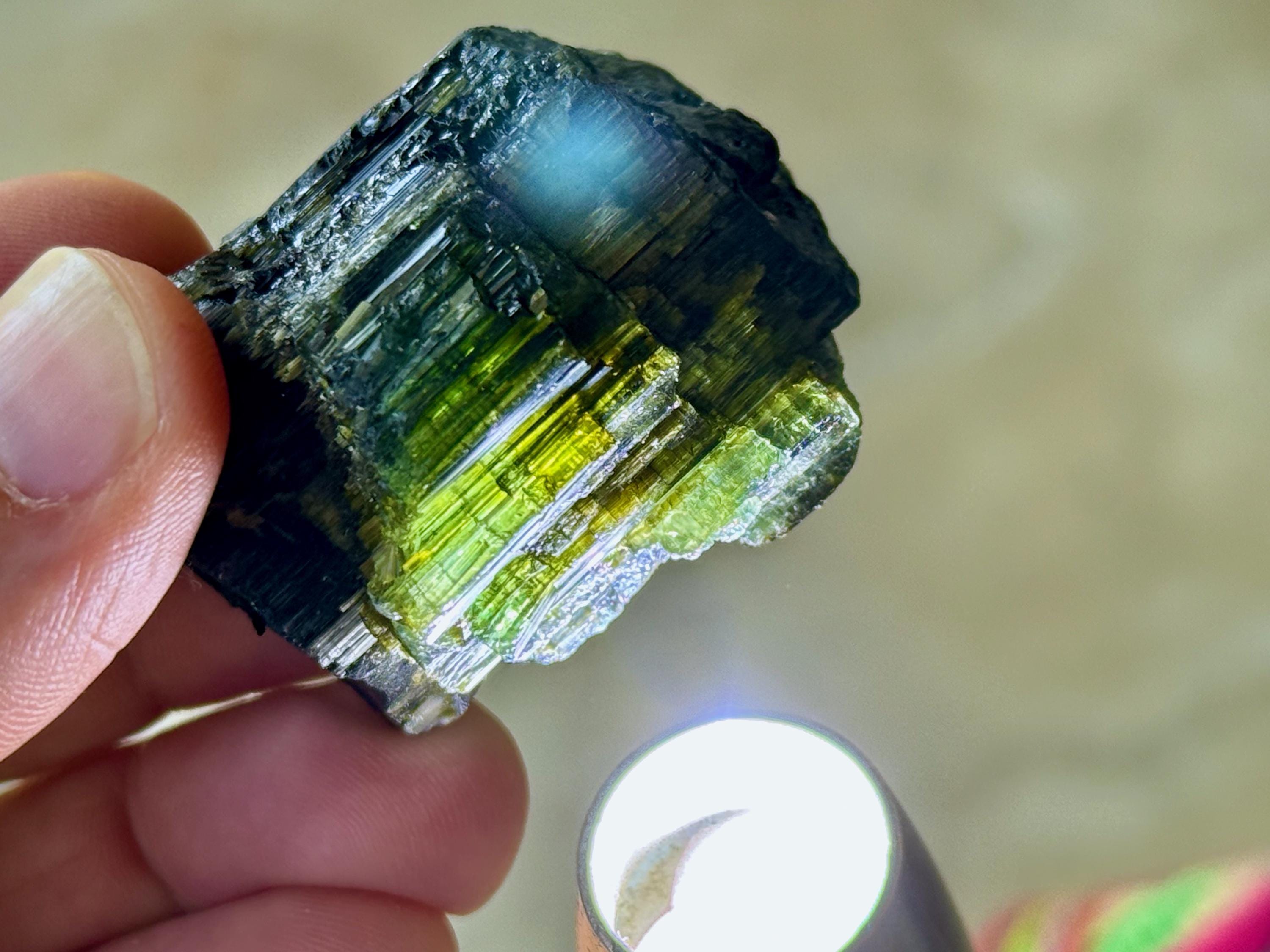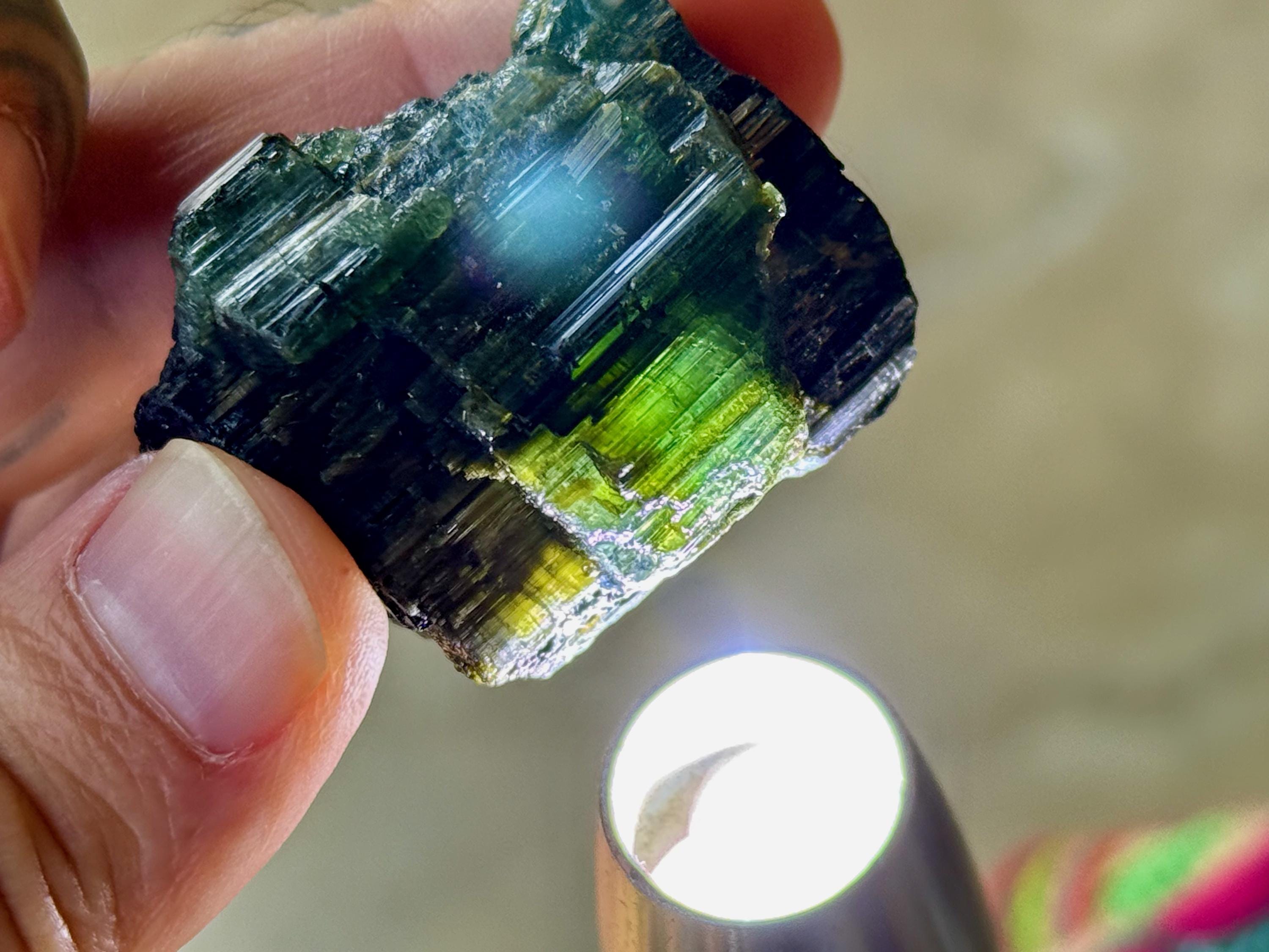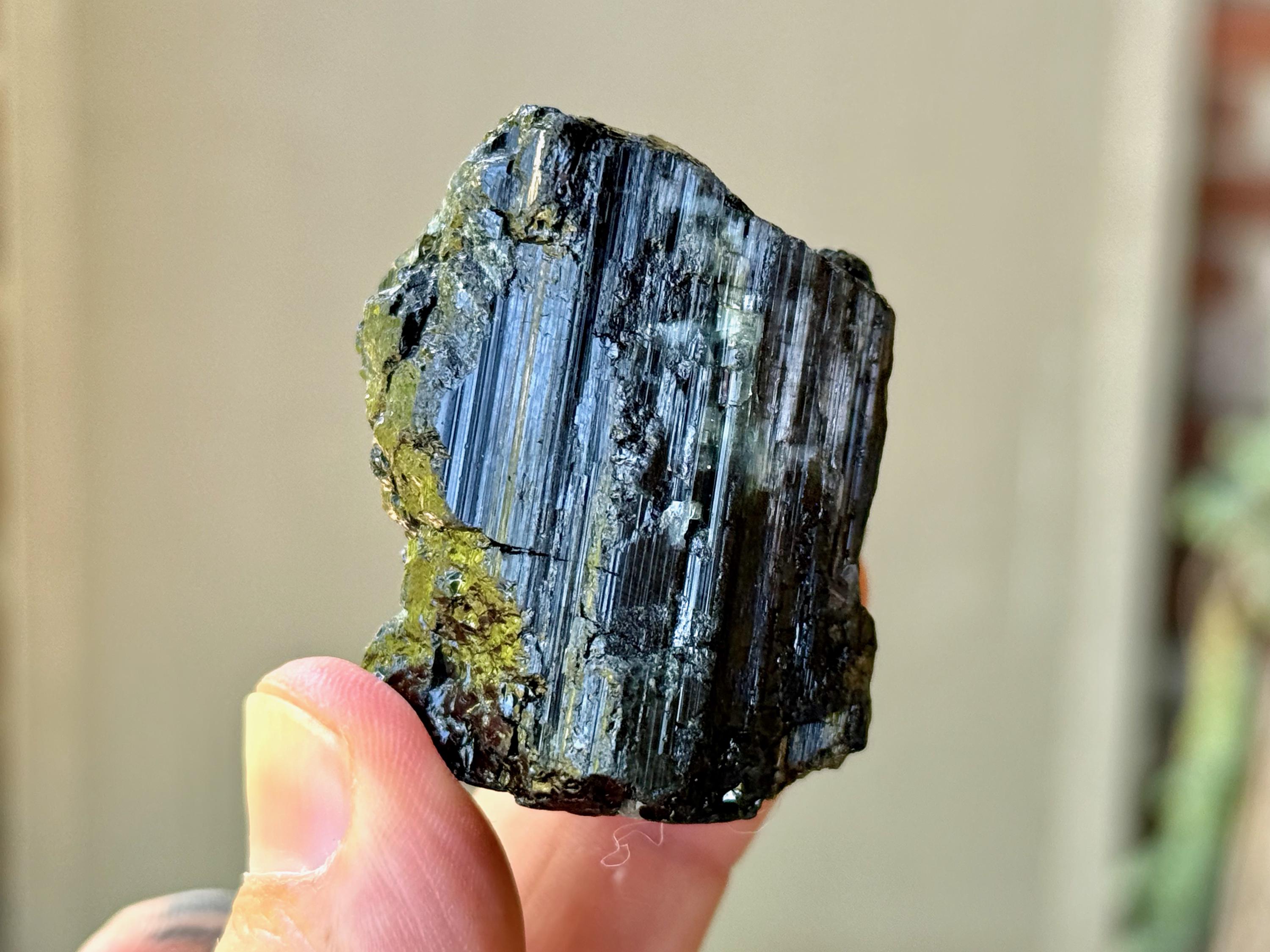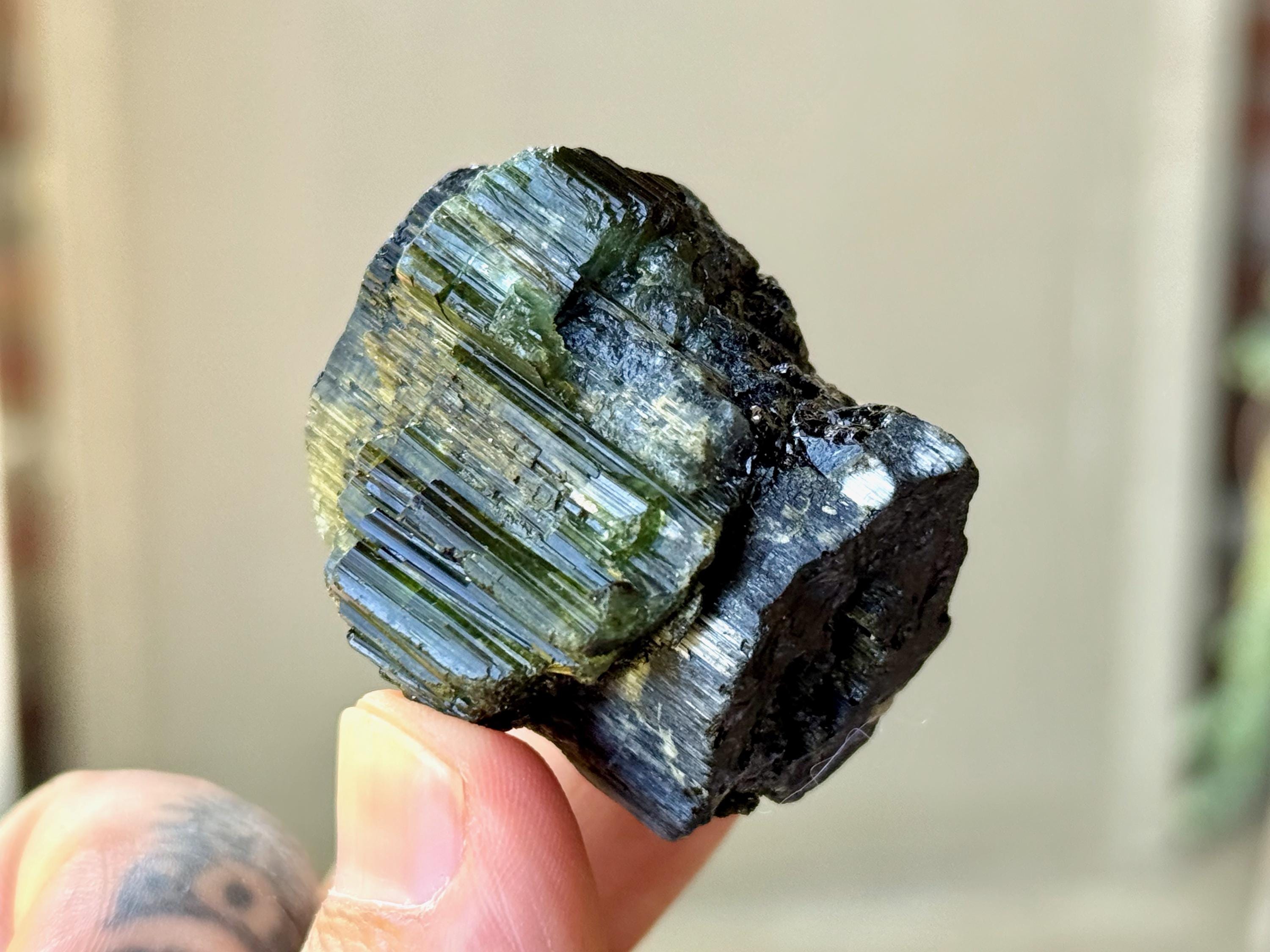 Cat's Eye Tourmaline gets its name for its iridescent quality, and the crystals from this find are bicolor with Green and Black hues. Green Tourmaline purifies and strengthens the nervous system, allowing it to carry greater amounts of Life Force (Prana Energy). As more energy is carried within the physical body, higher degrees of consciousness can be maintained.