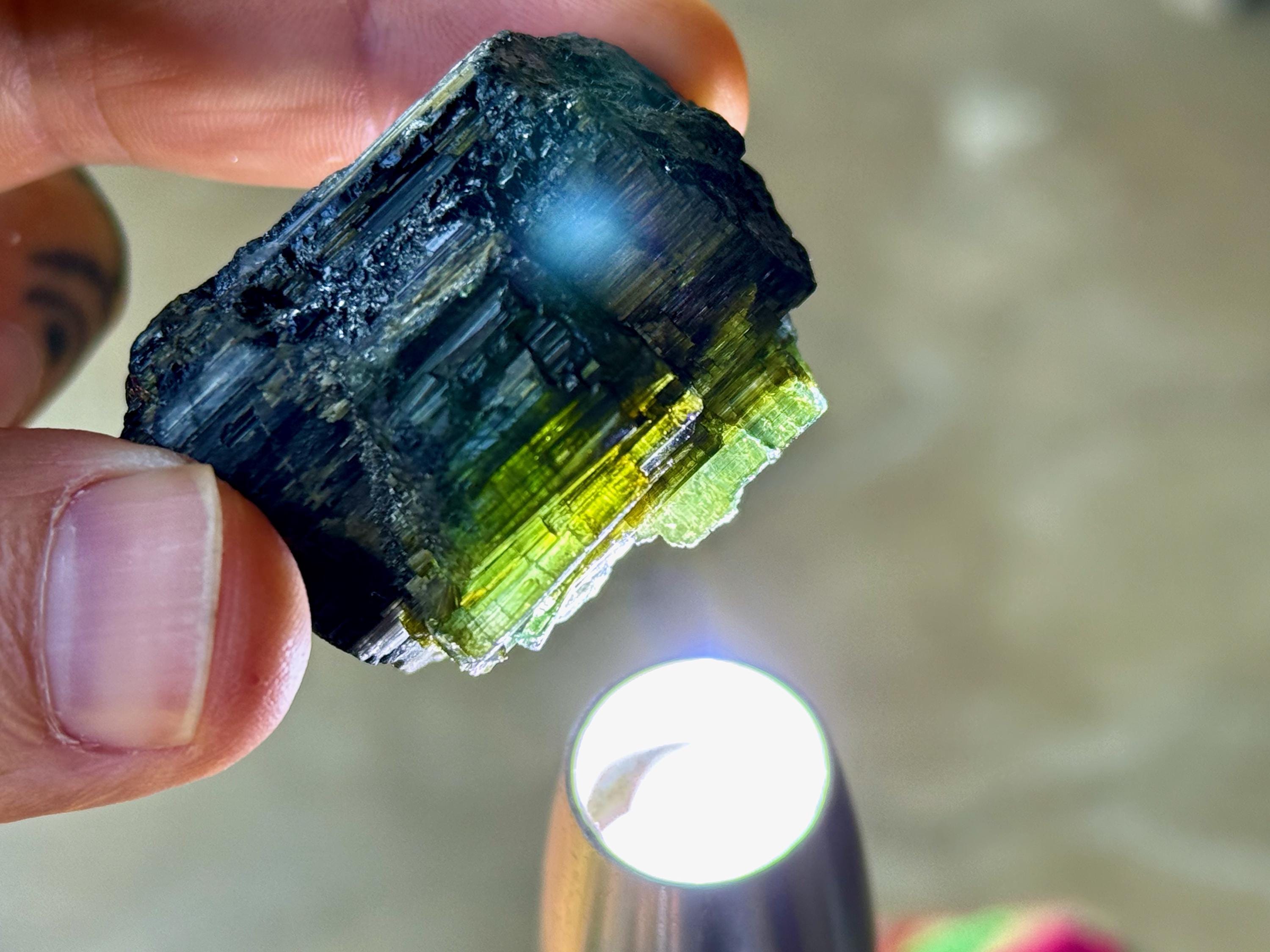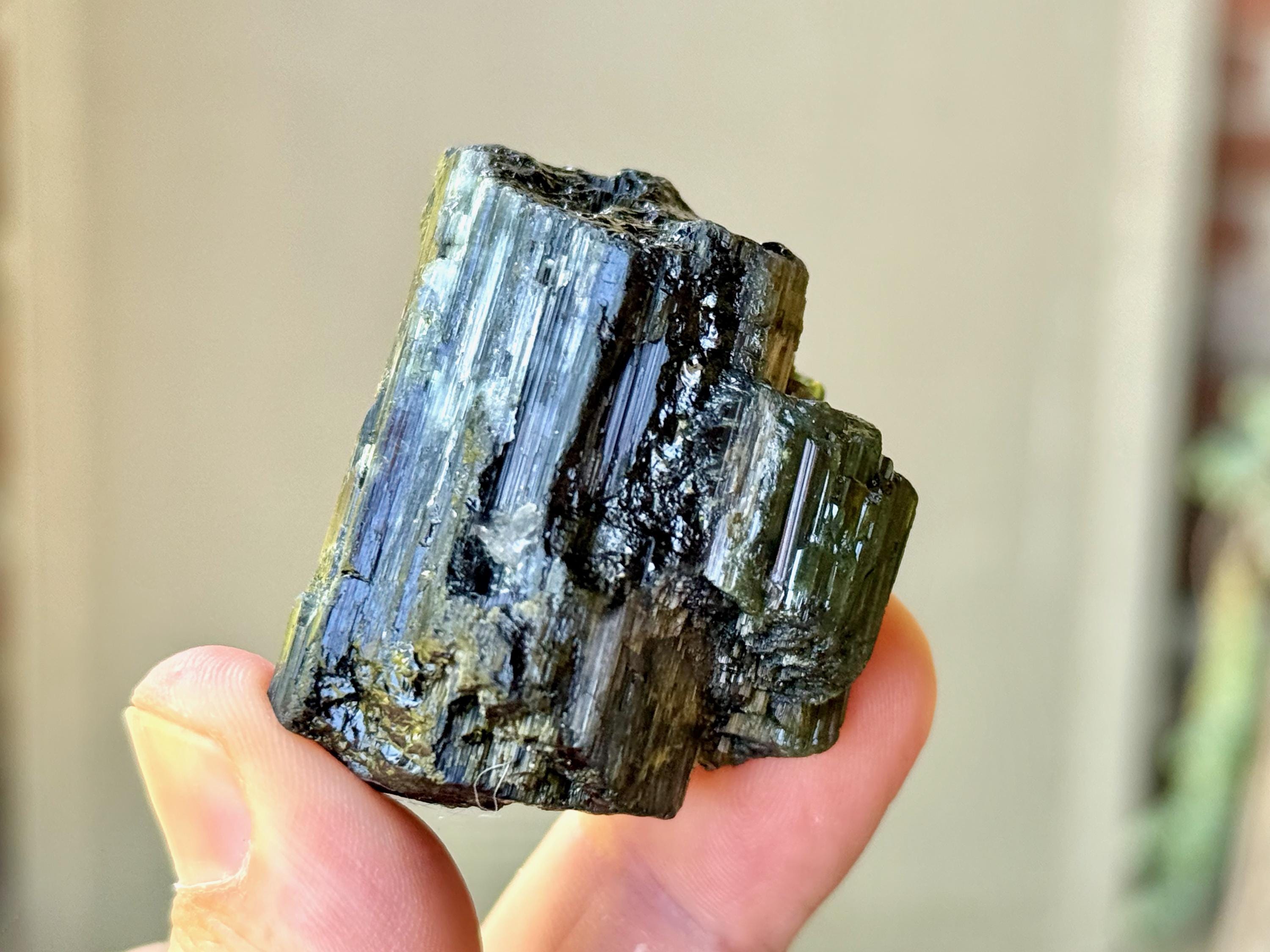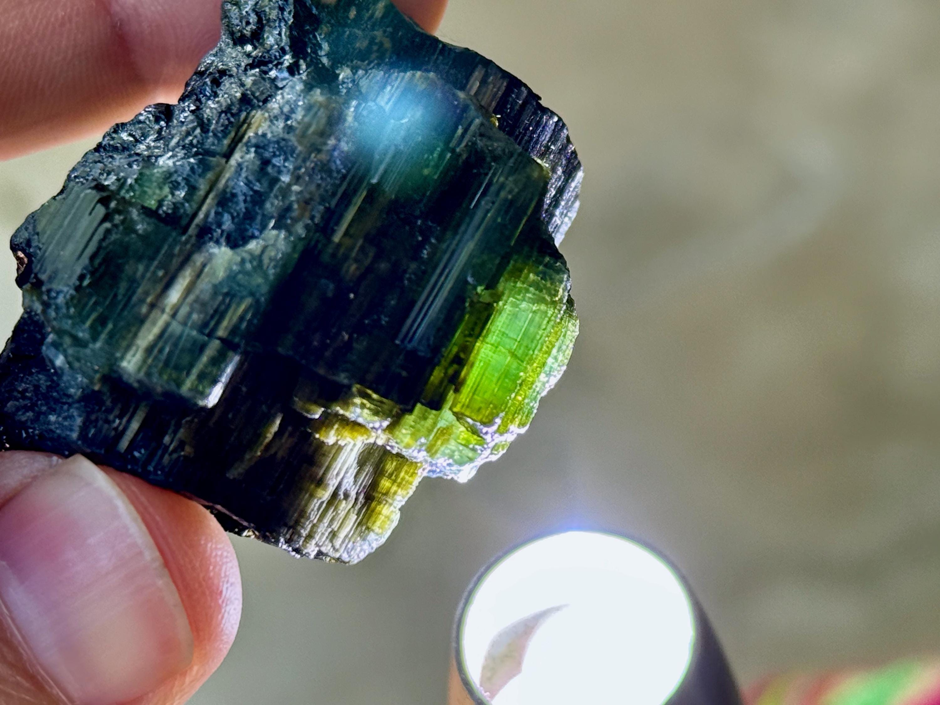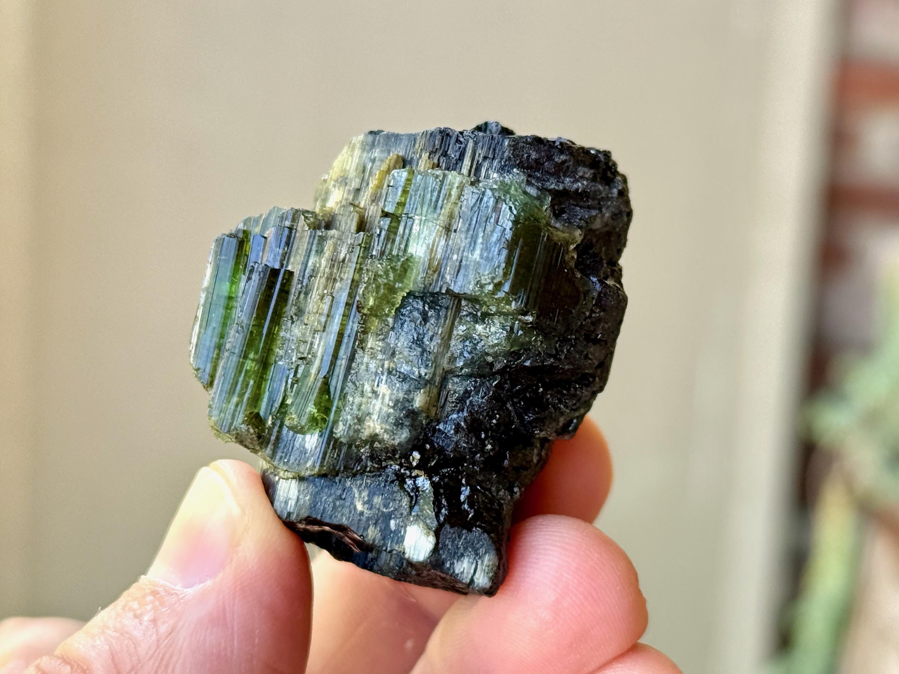Cat's Eye Tourmaline gets its name for its iridescent quality, and the crystals from this find are bicolor with Green and Black hues. Green Tourmaline purifies and strengthens the nervous system, allowing it to carry greater amounts of Life Force (Prana Energy). As more energy is carried within the physical body, higher degrees of consciousness can be maintained.