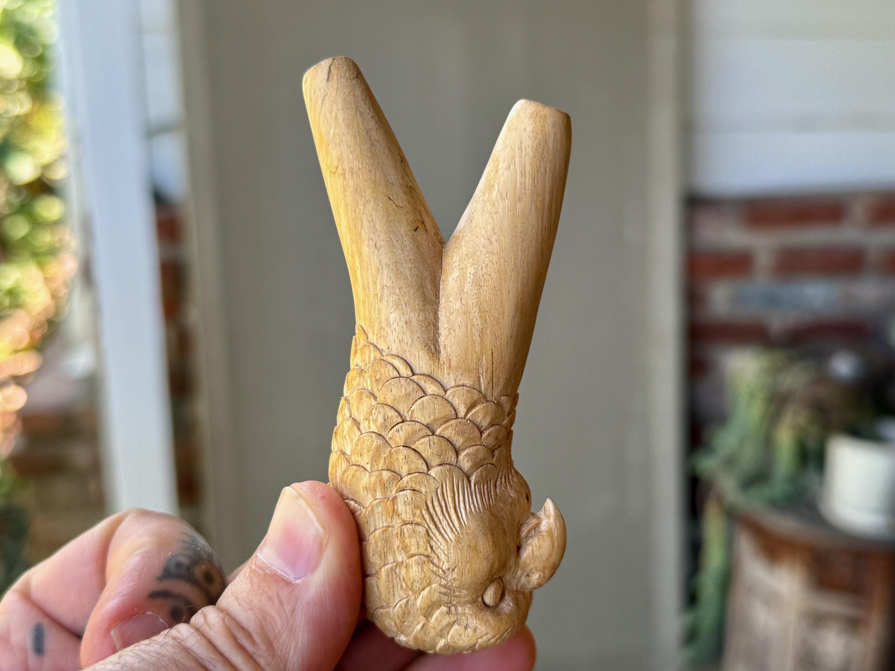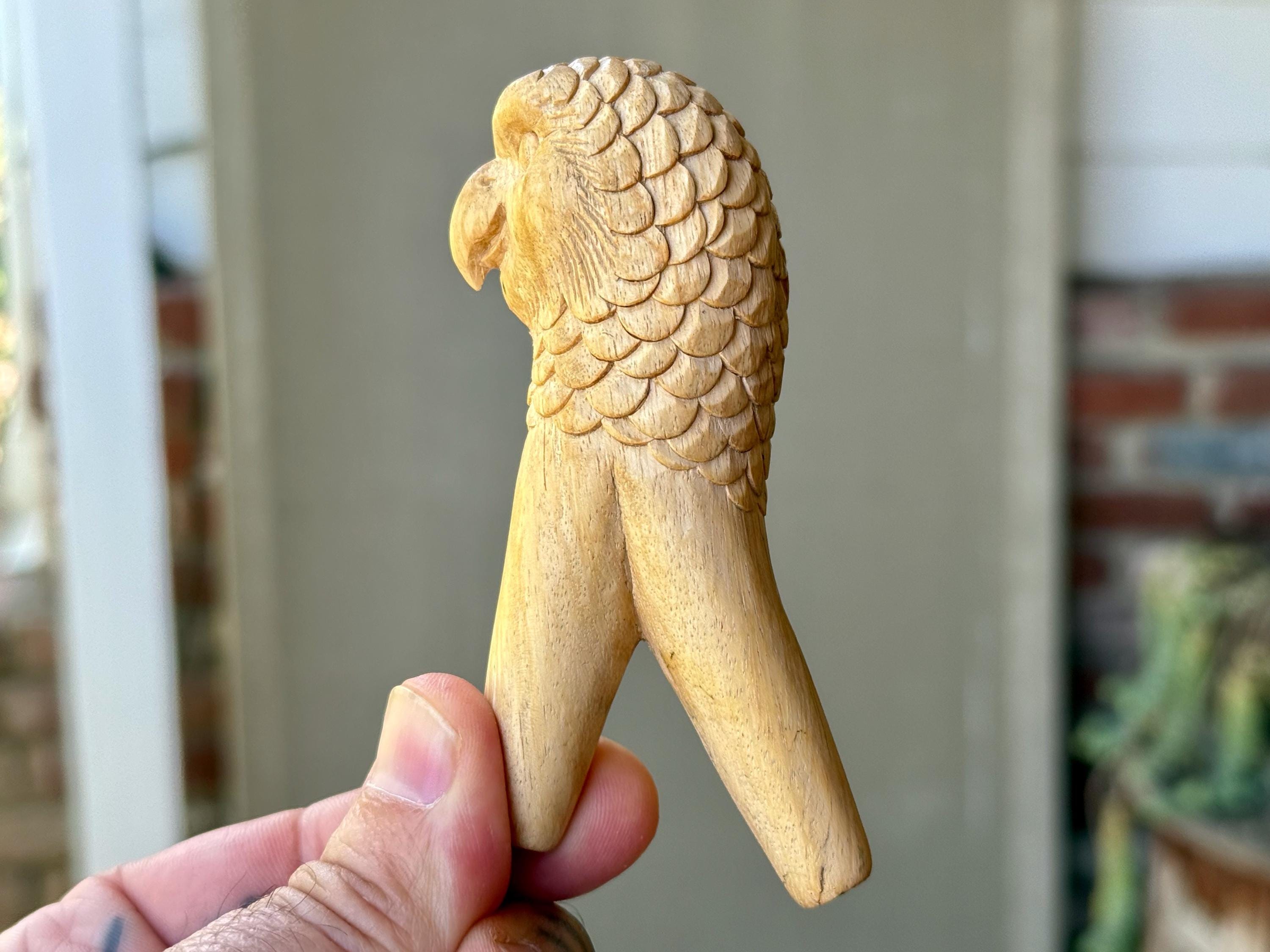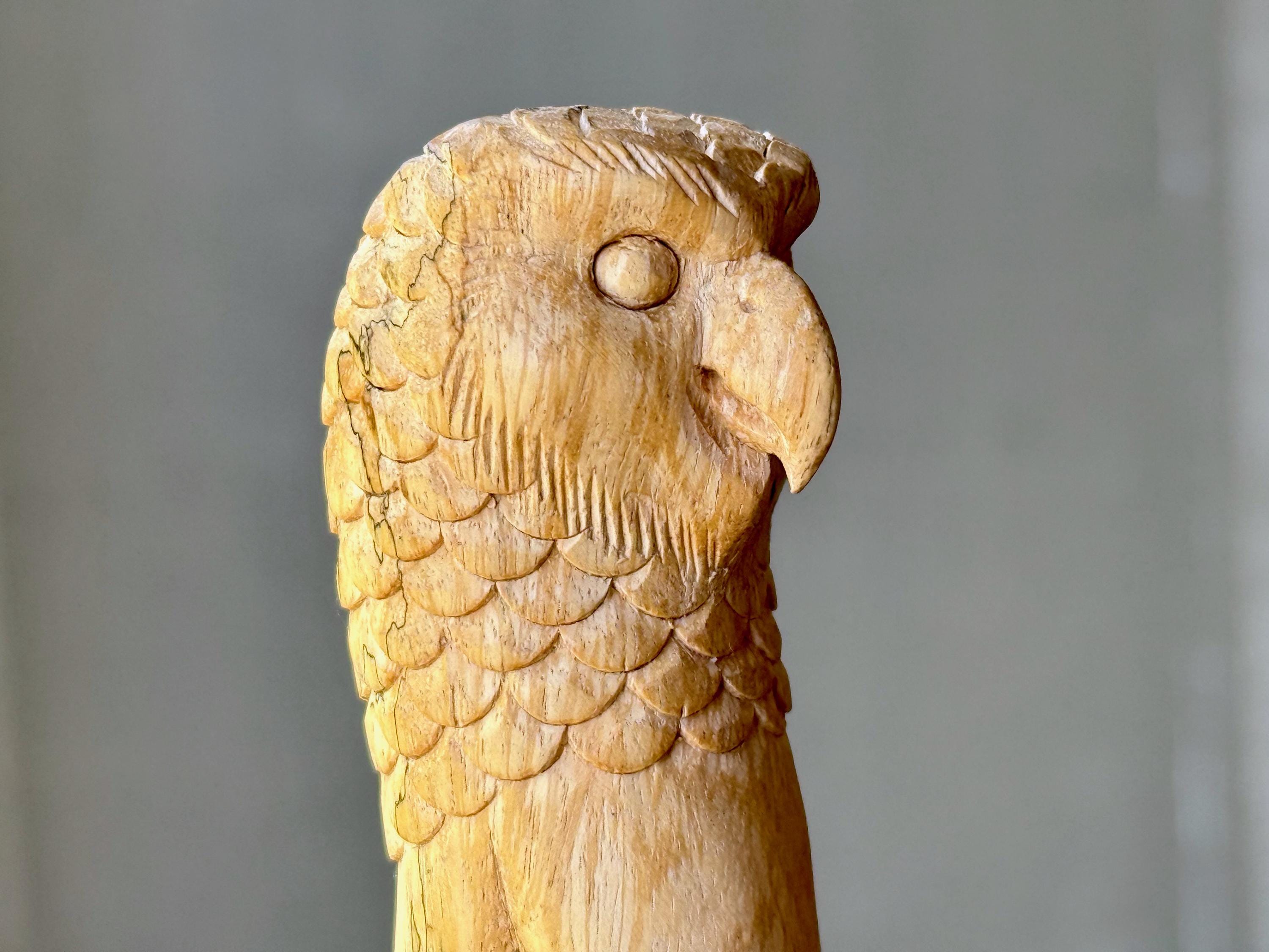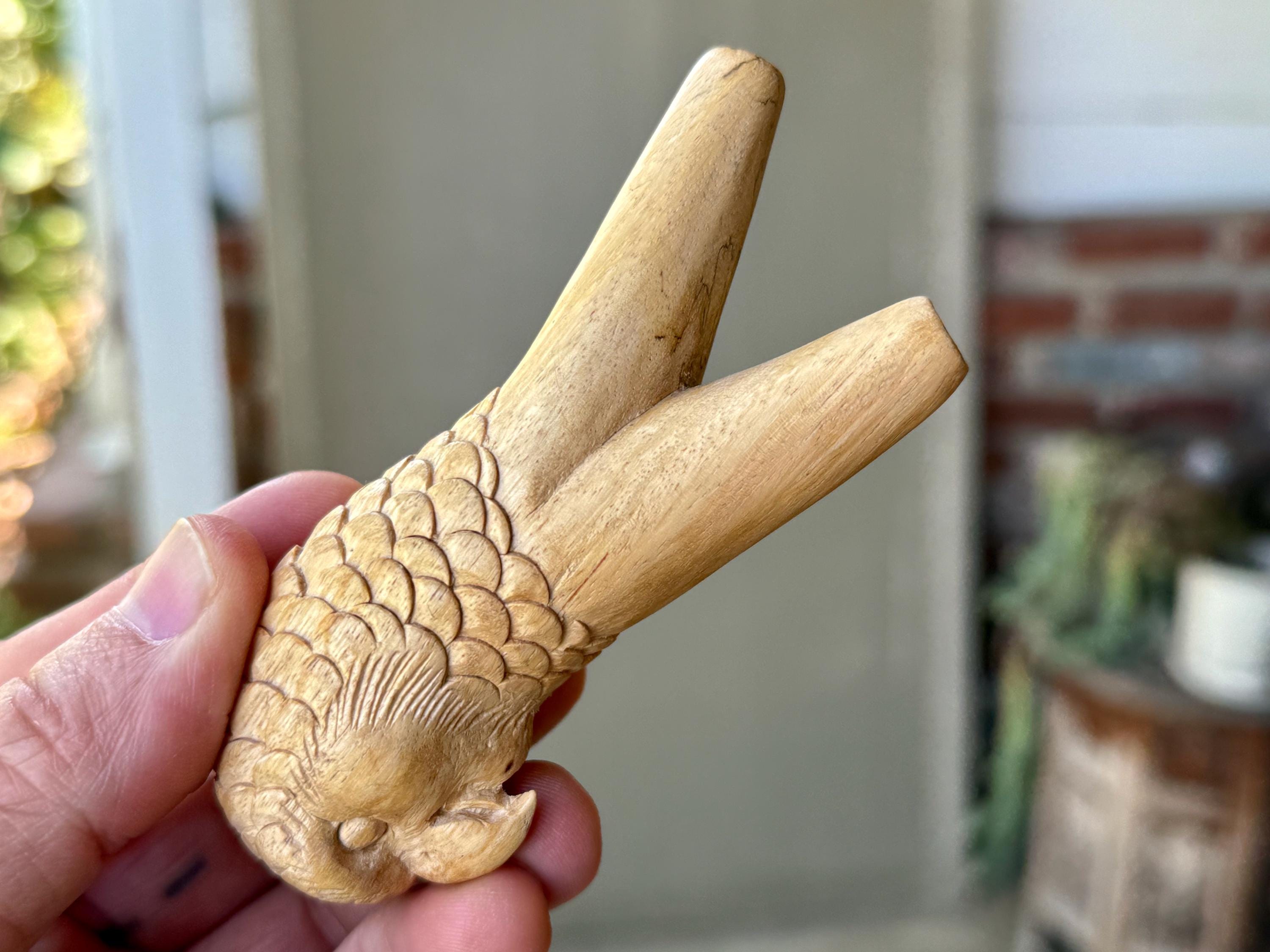 A handsome, wise and fierce expression to this charming Owl carved into the base of this solid wood kuripe. Each feather was carved by hand! A true work of art and wonderful functionality as well!