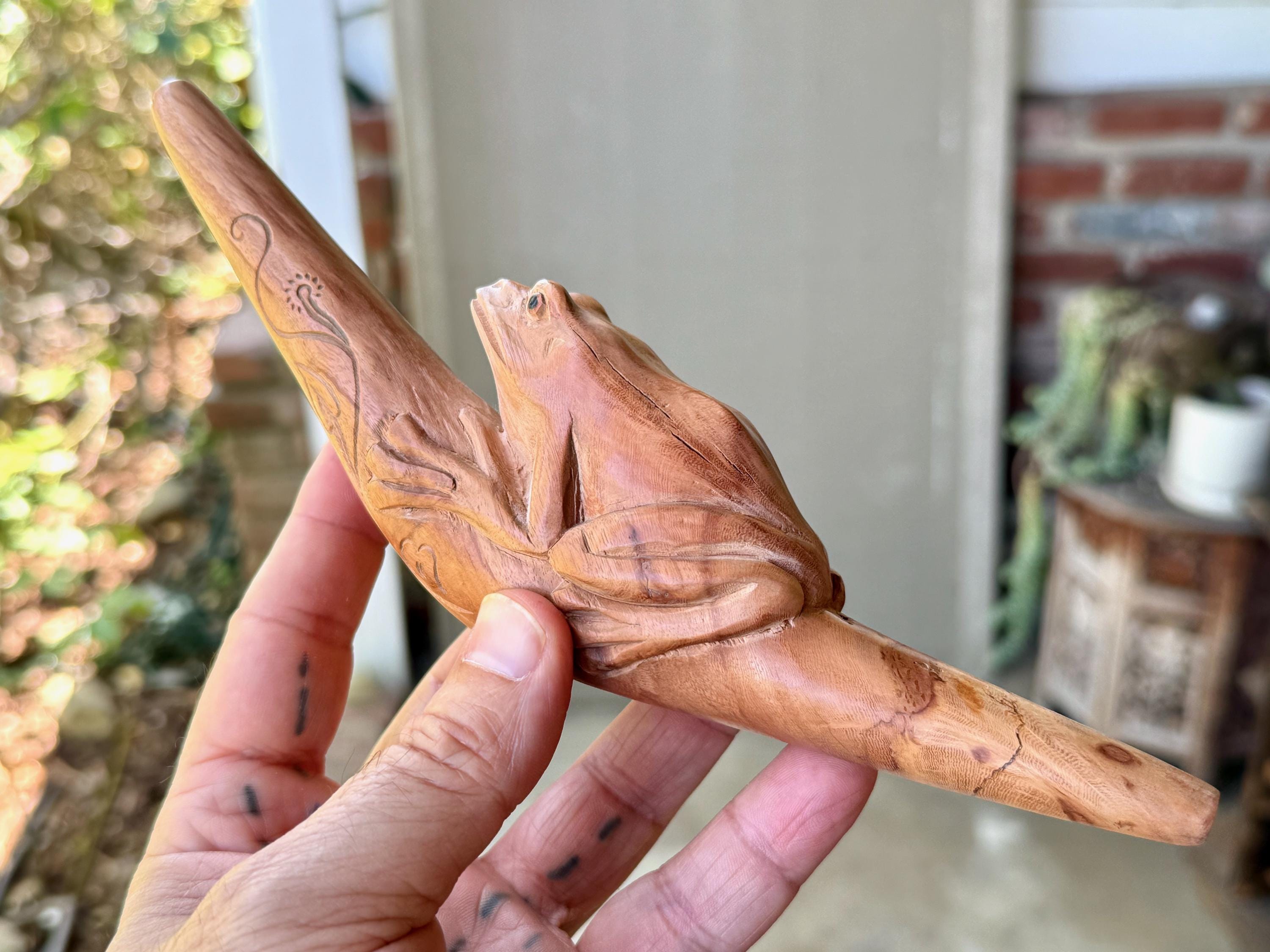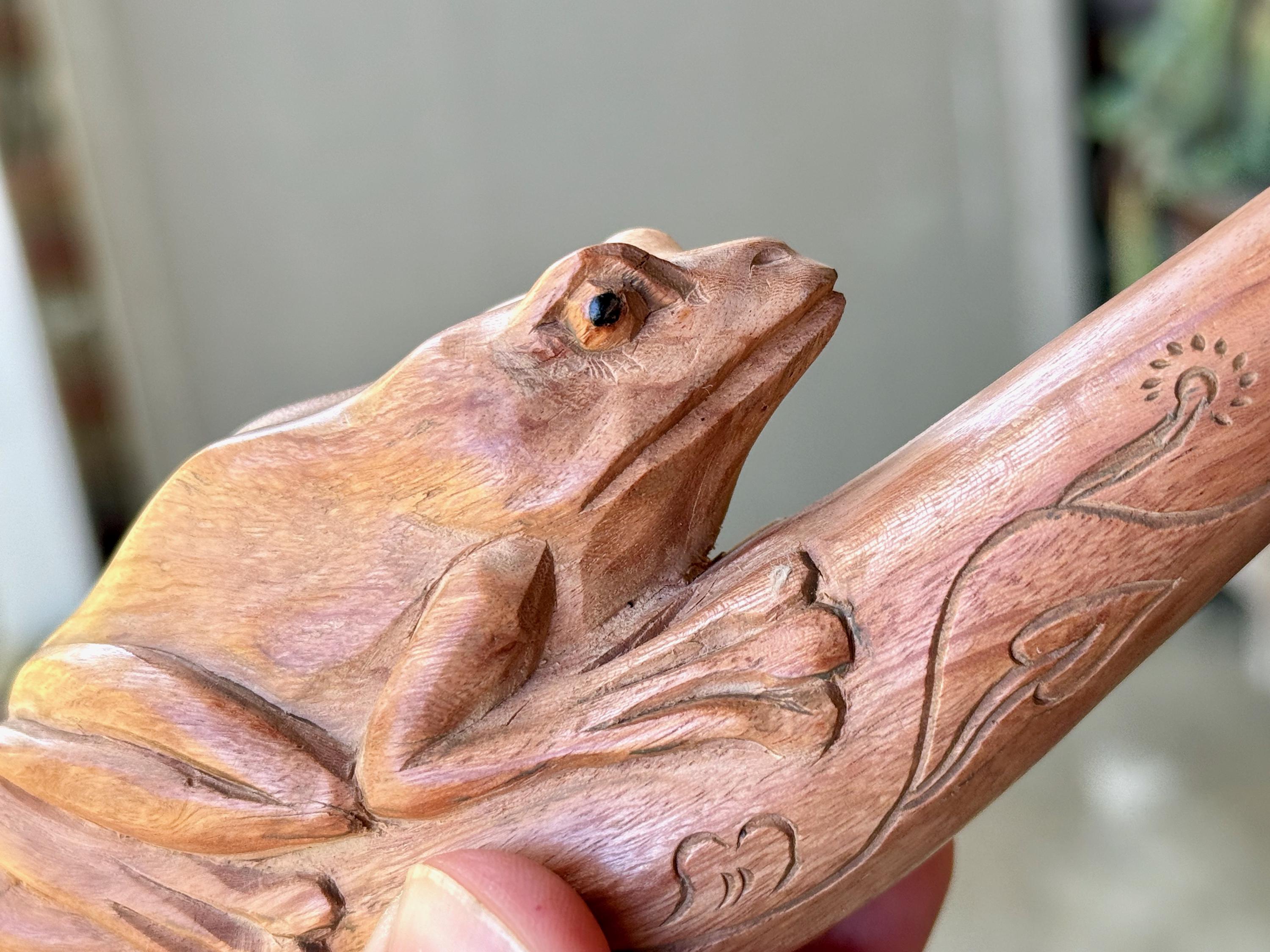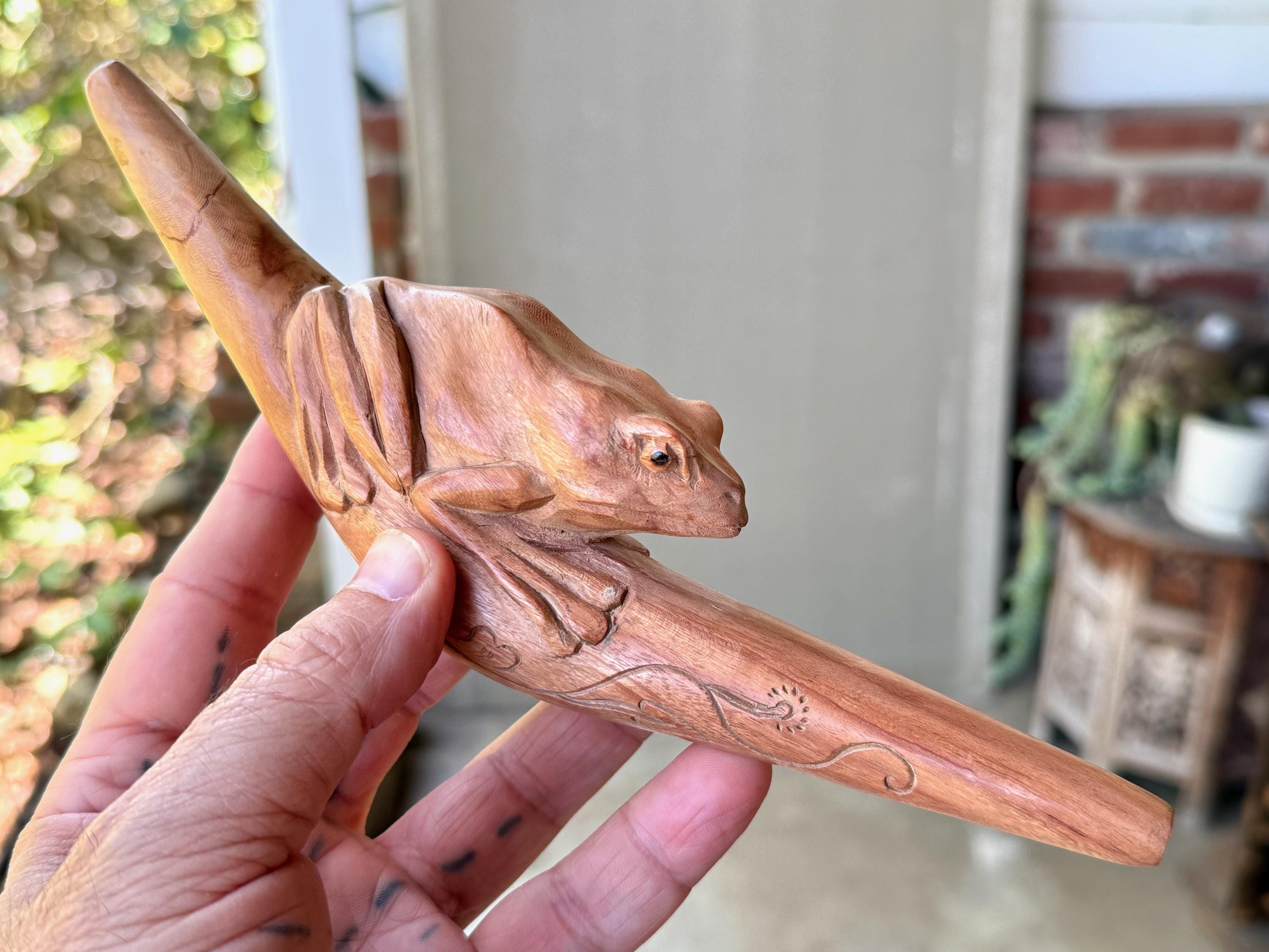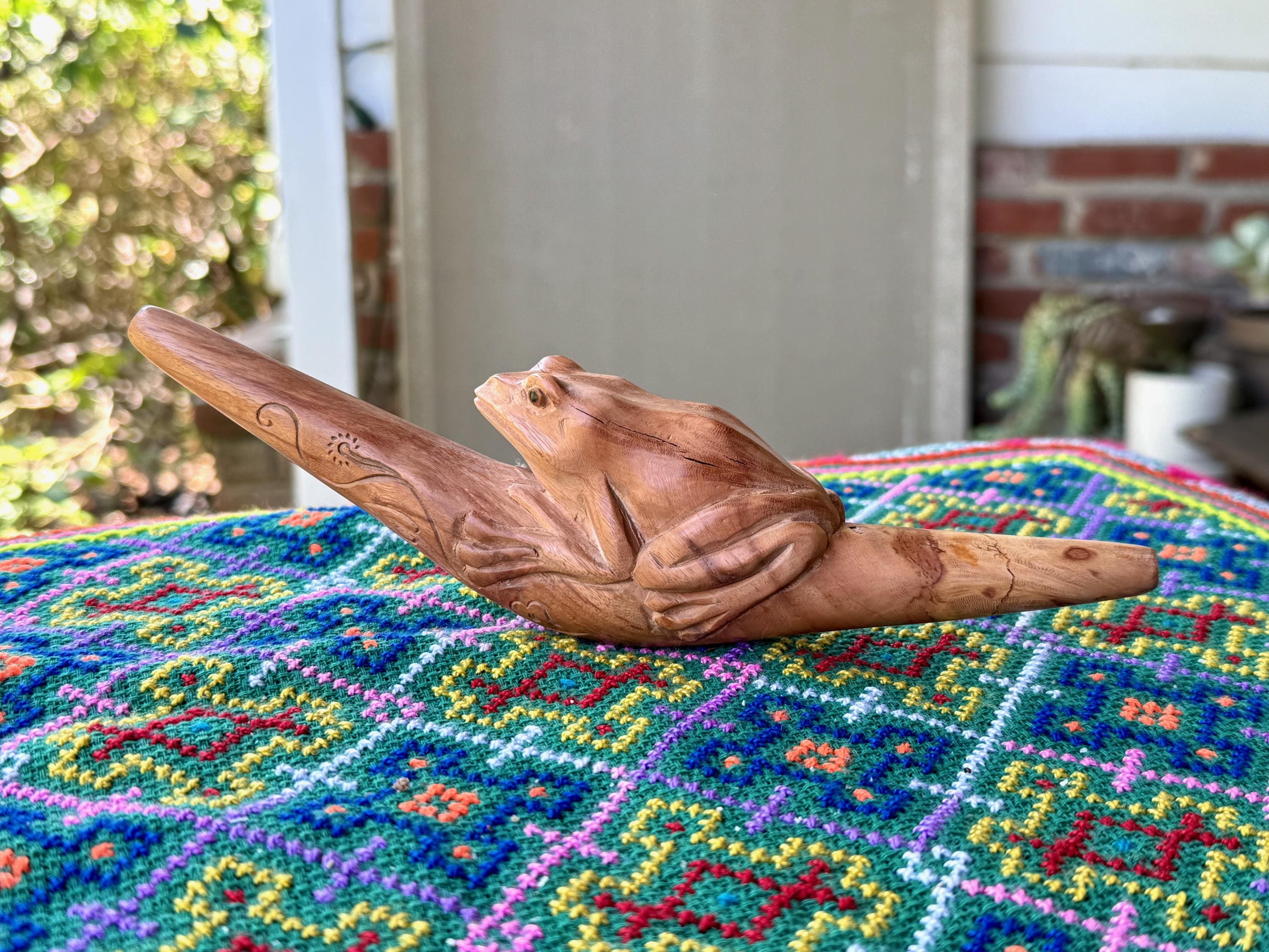 This handsome Frog Tepi Pipe — for administering hapé — was hand carved from natural, tropical Sawo Wood.