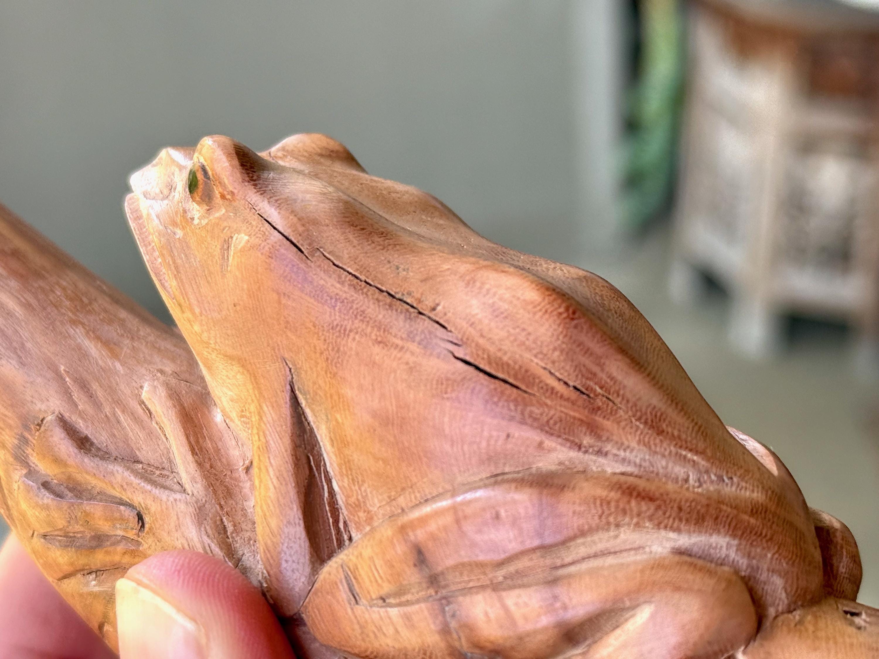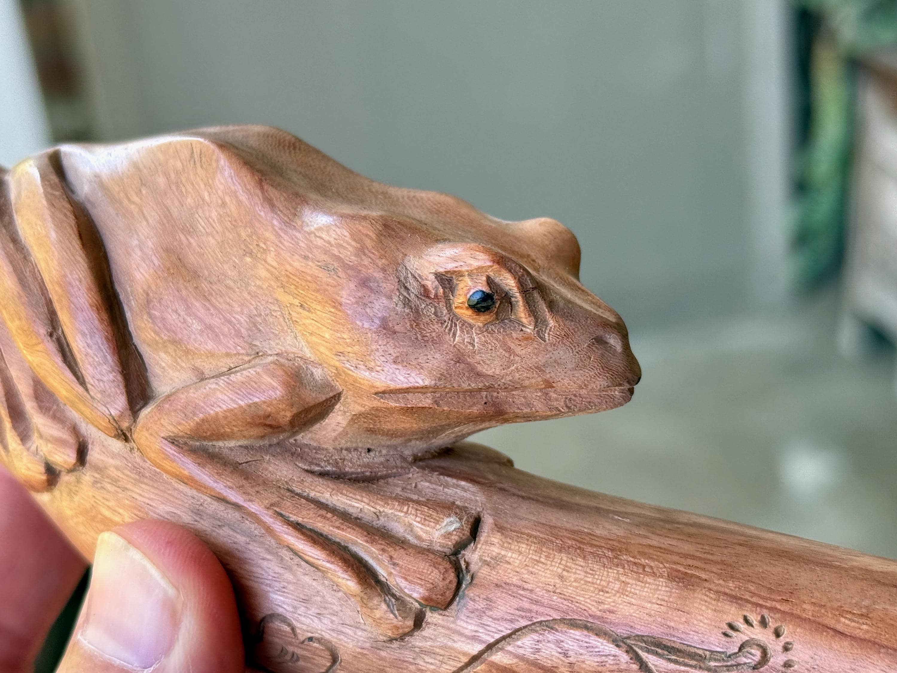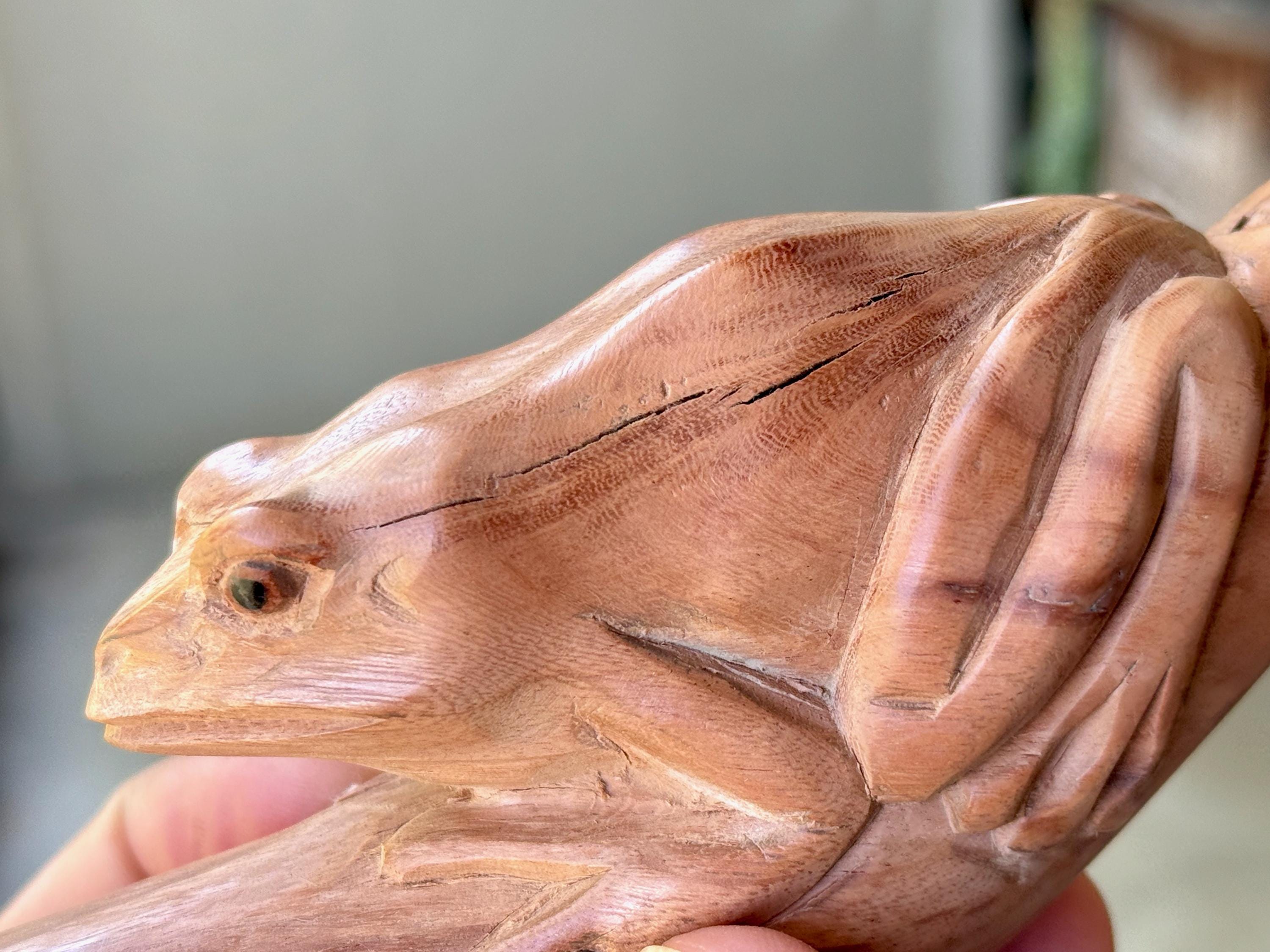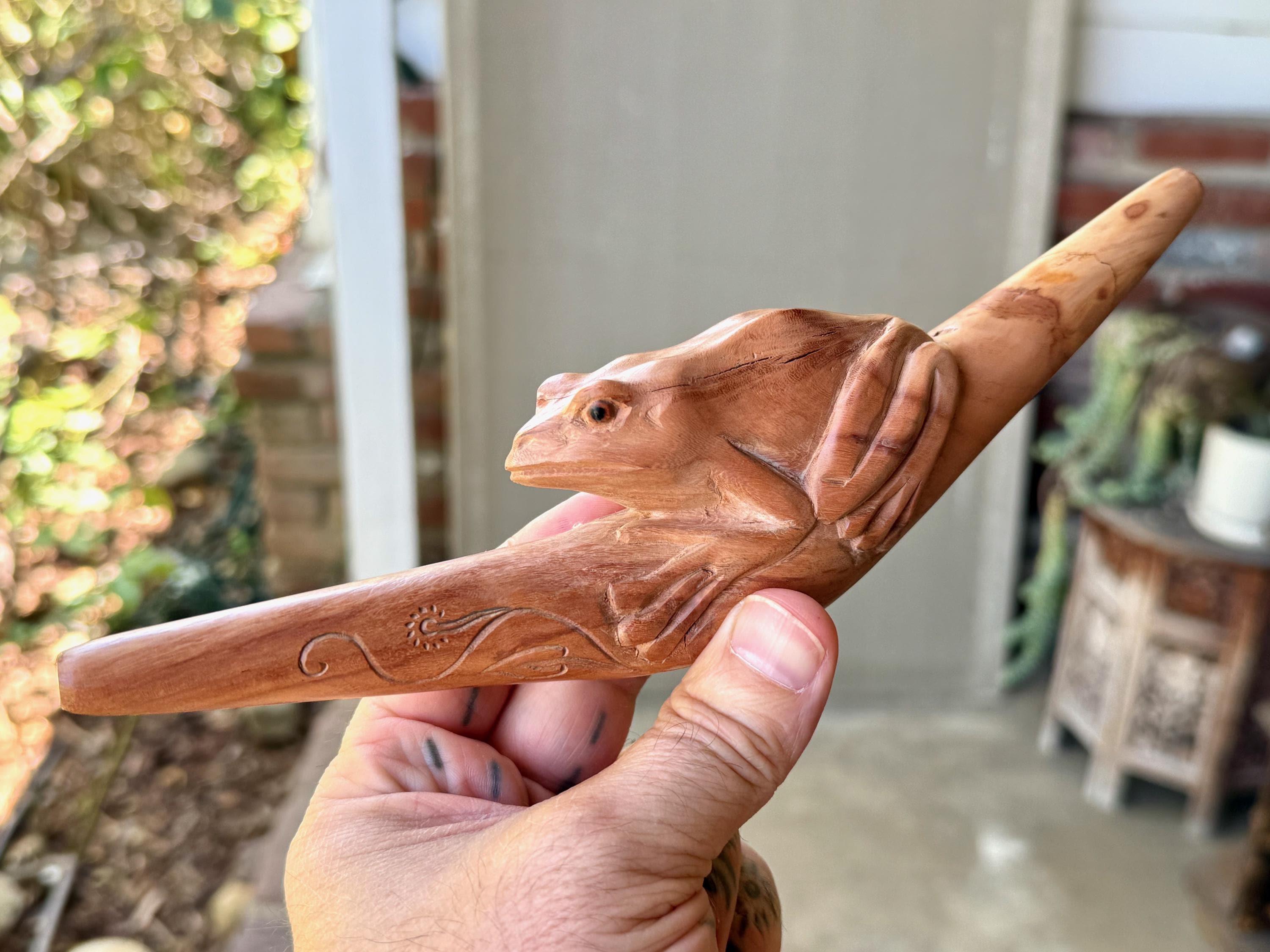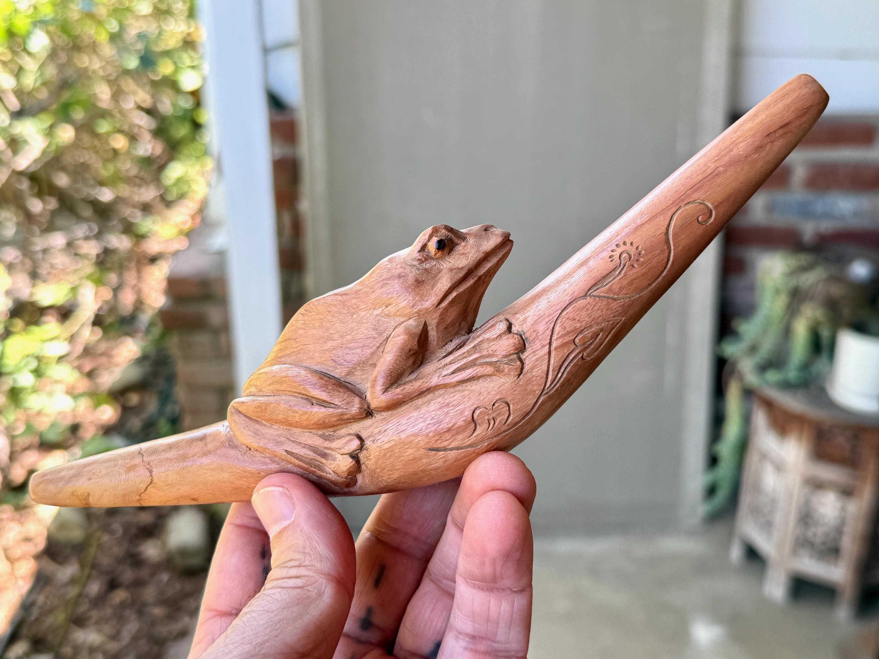 This handsome Frog Tepi Pipe — for administering hapé — was hand carved from natural, tropical Sawo Wood.