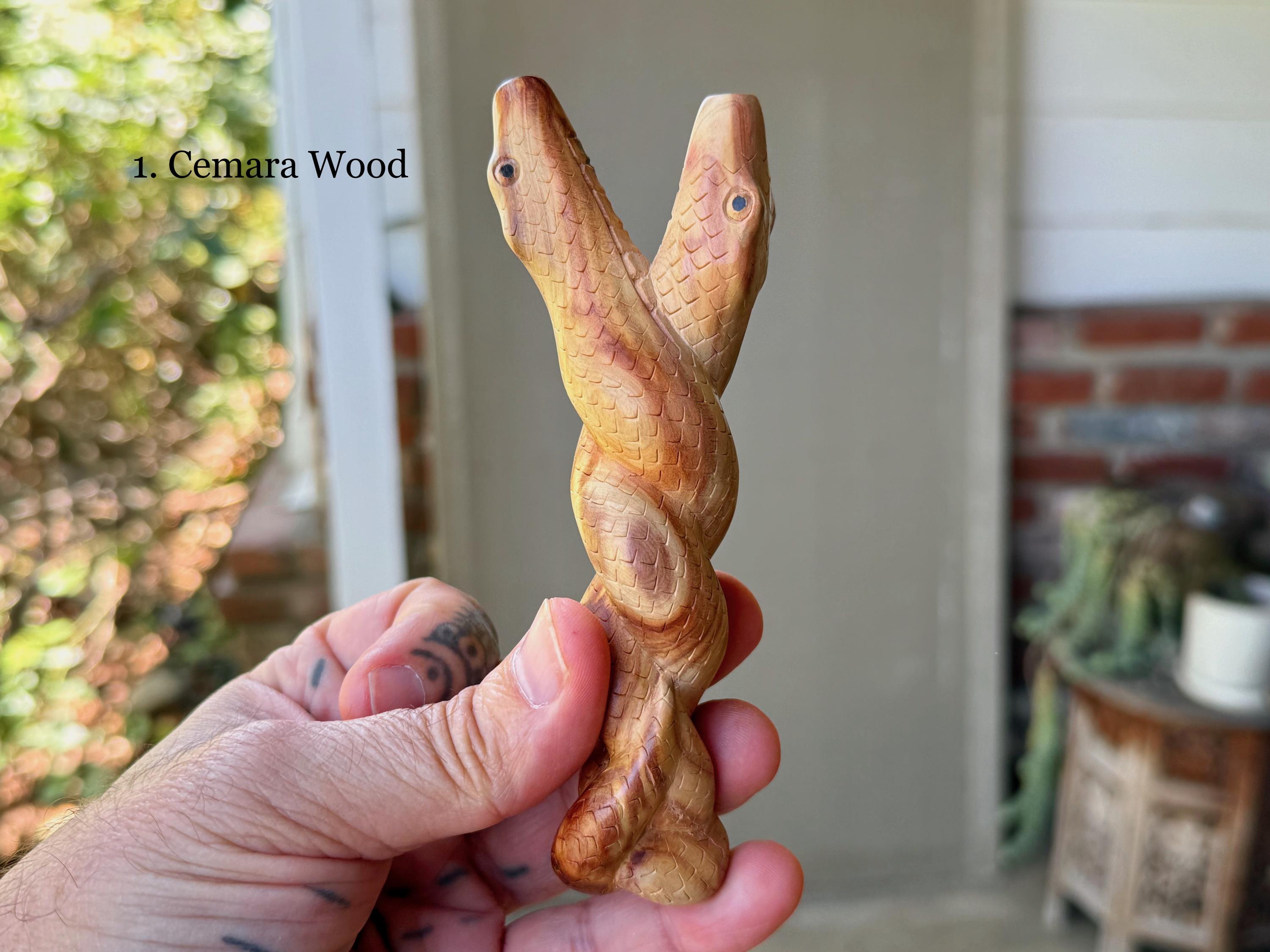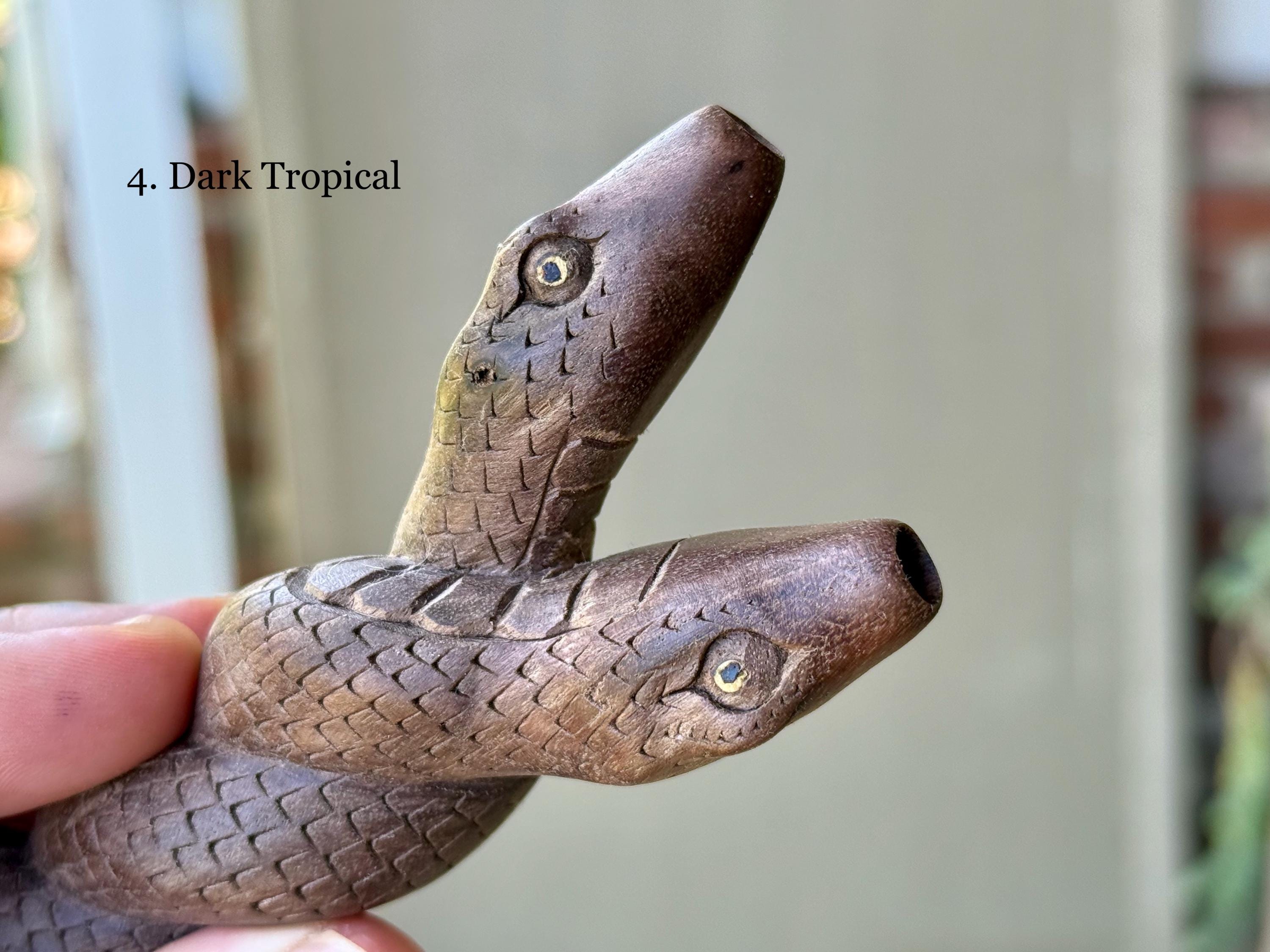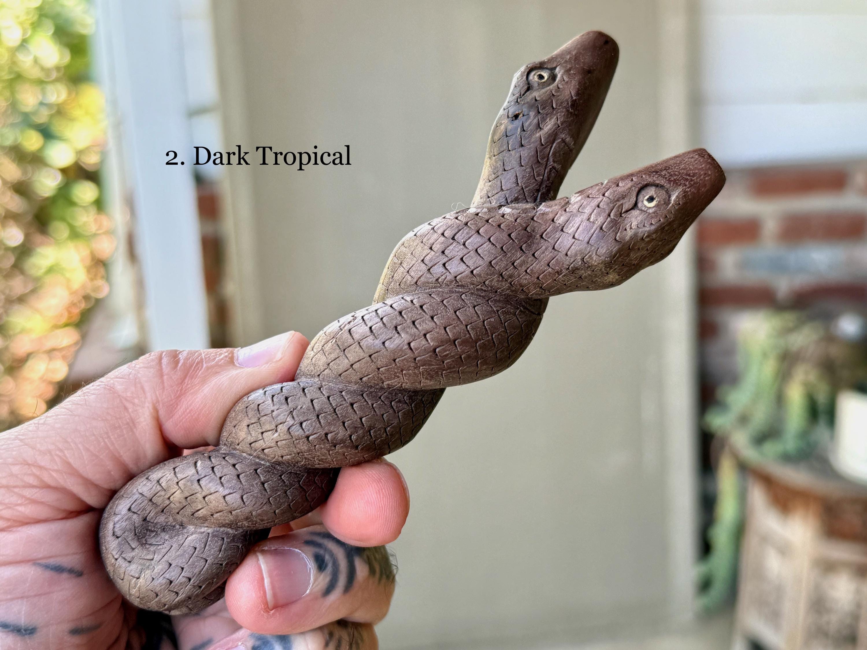 These Snake Kuripes — for self-administering hapé — were hand carved from native, tropical hardwoods. There are two styles available, simply select your preference from the dropdown menu.