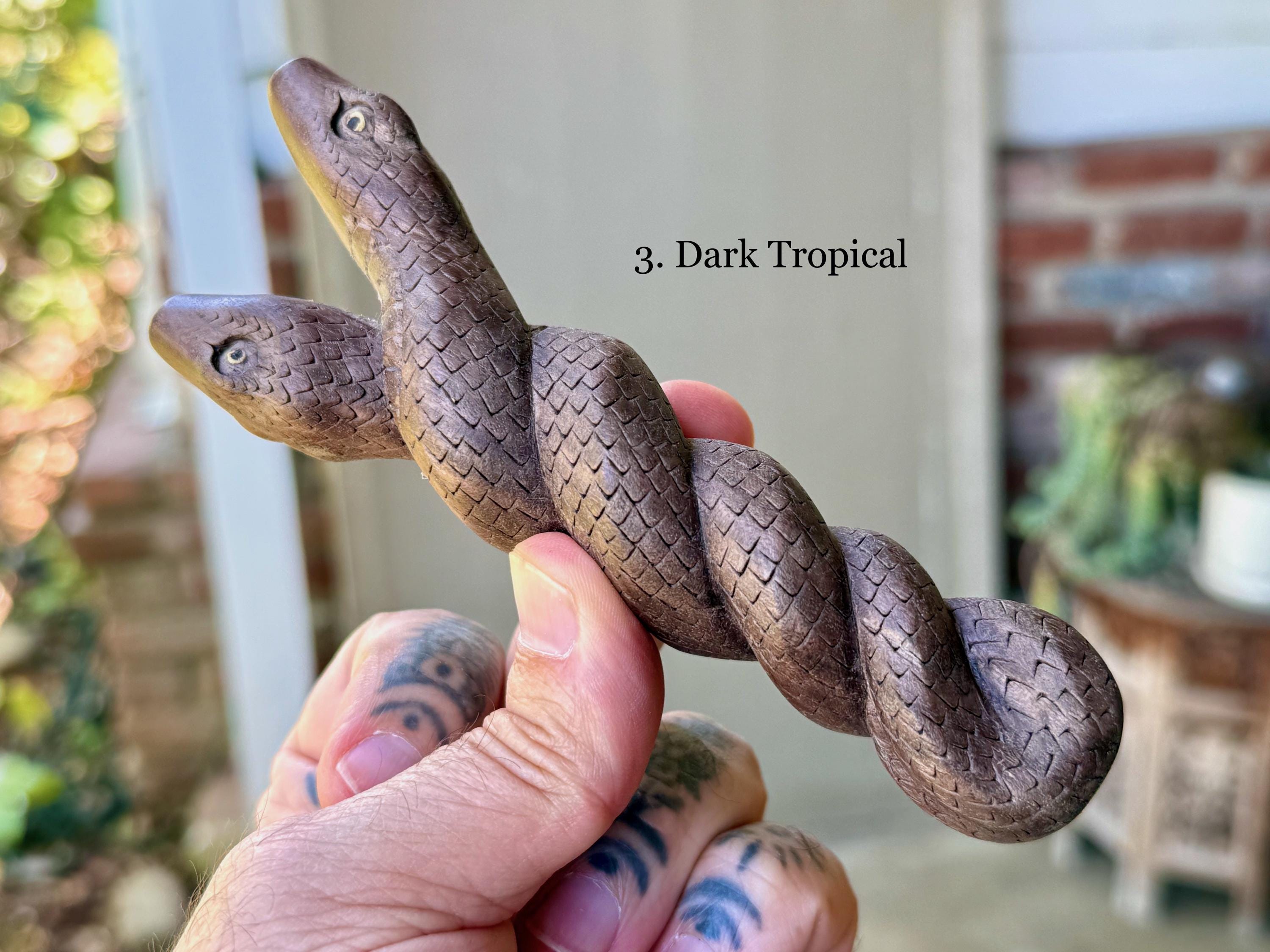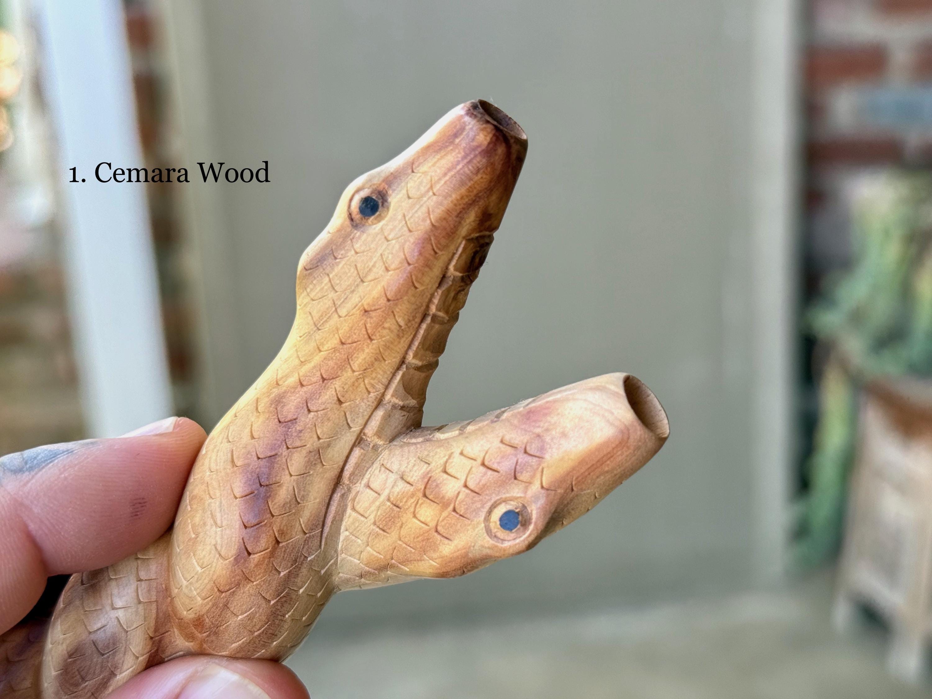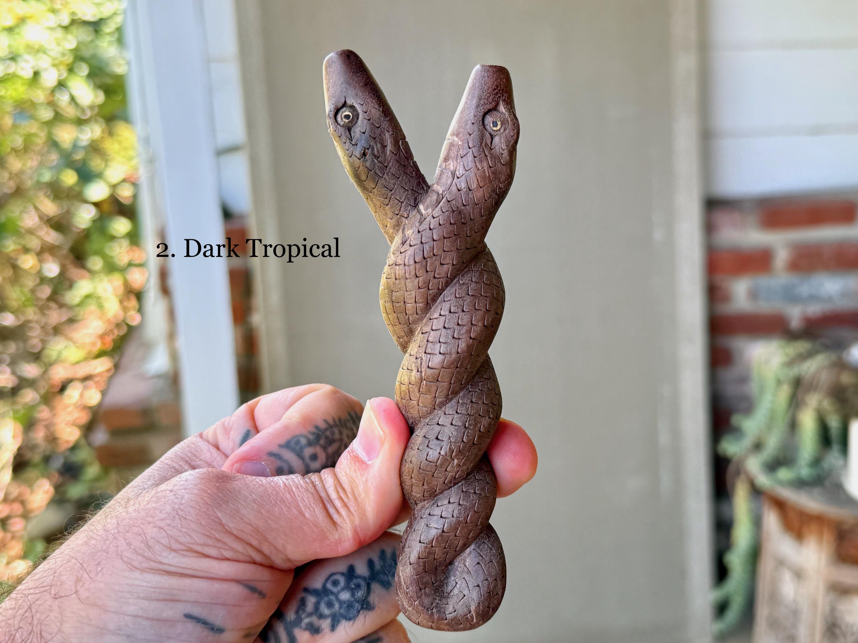 These Snake Kuripes — for self-administering hapé — were hand carved from native, tropical hardwoods. There are two styles available, simply select your preference from the dropdown menu.