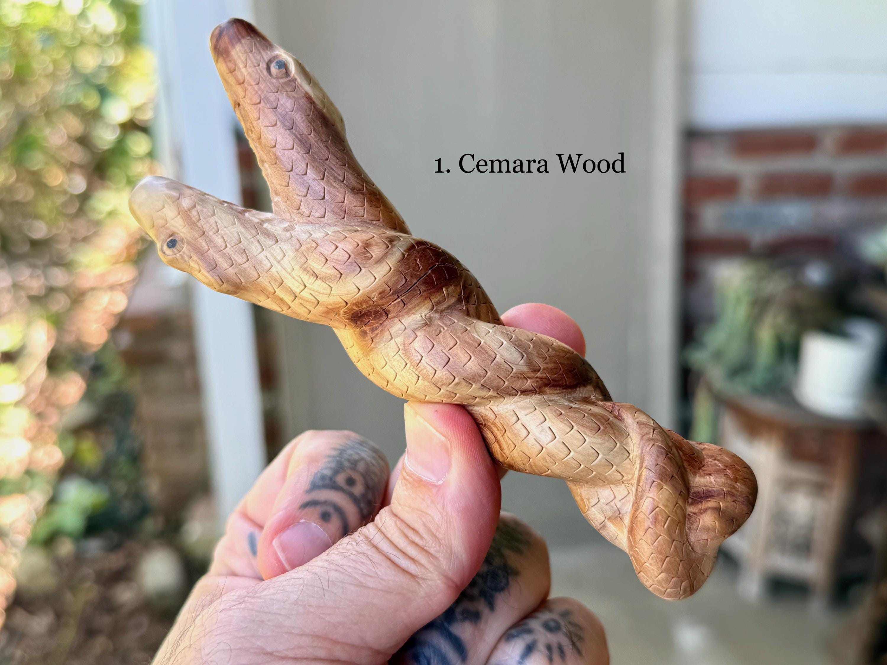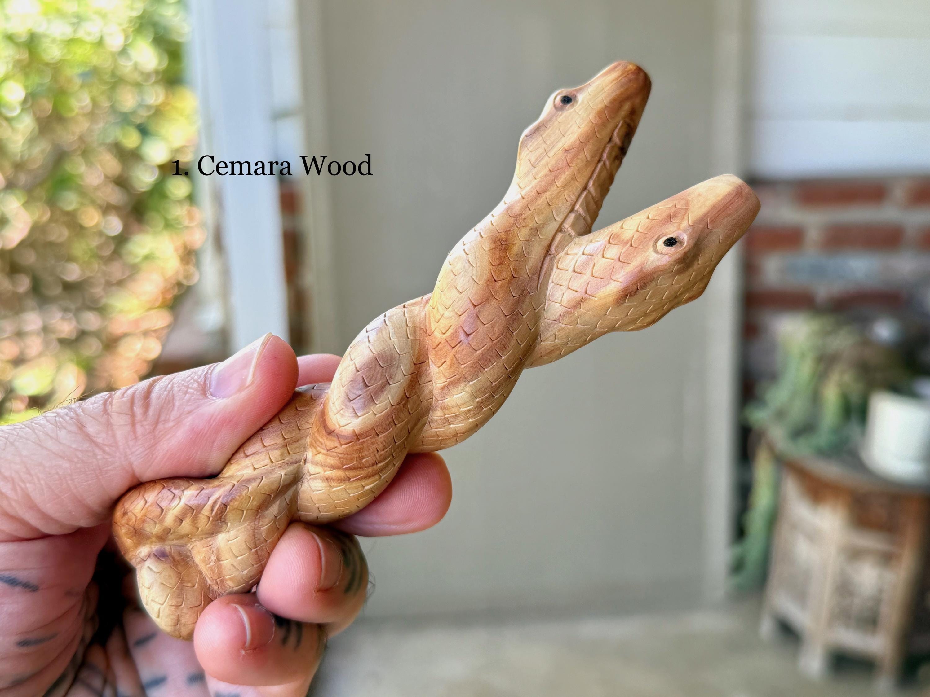 A variation on one of our most popular designs, these Entwined Snake Kuripes are wonderful examples of the kind of functional works of art our artisans have perfected! Masterful carving and elegant lines along with the natural wood grains really bring these kuripes to life.