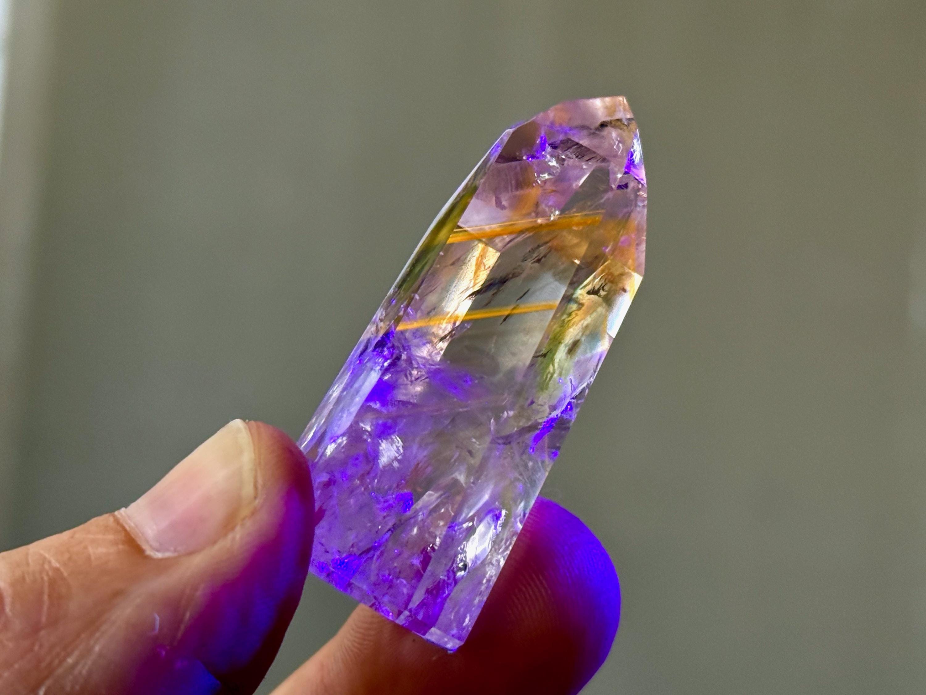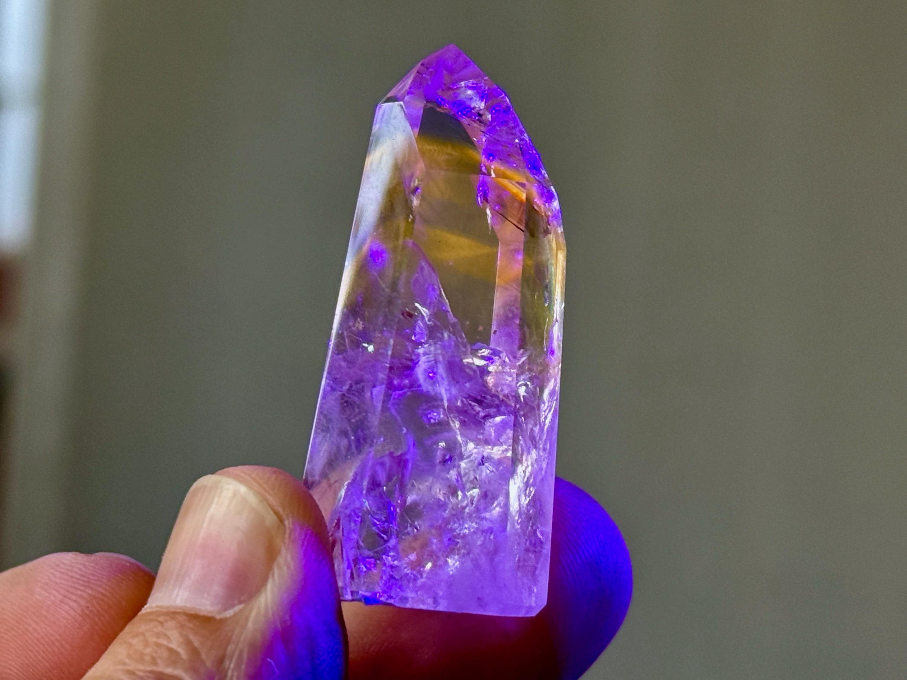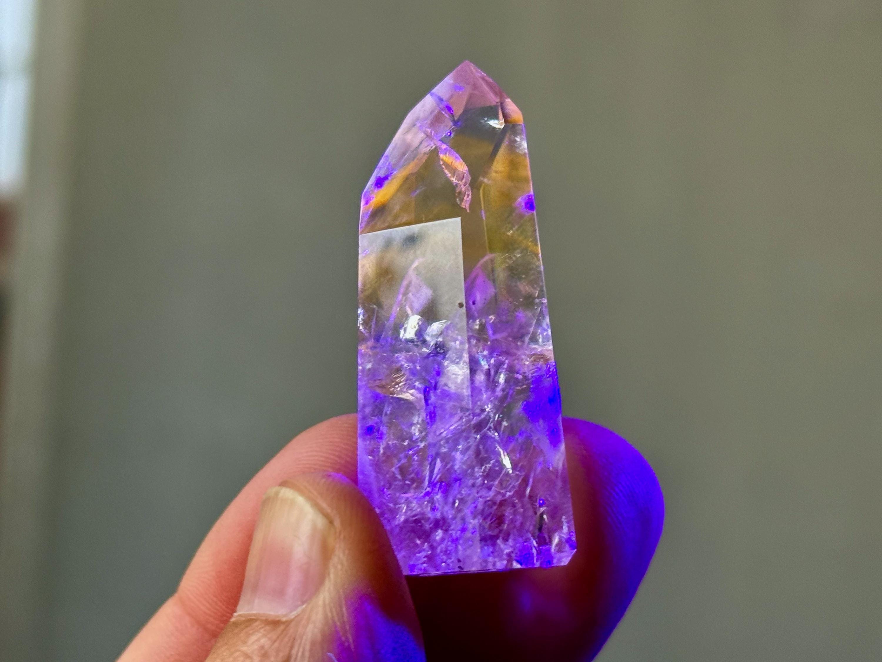 **Please note, the inclusions in this crystal are all natural/untreated, but the exterior is polished and the base is cut to allow for self-standing. A UV light is necessary to see the phantoms glow, and they can be found affordably at Amazon or any other online outlet. Also, please note that the dark purple hues in the UV-lit photos are a result of the UV light itself and not the color of the crystal. The natural color is shown in the natural-light photos included in this listing.