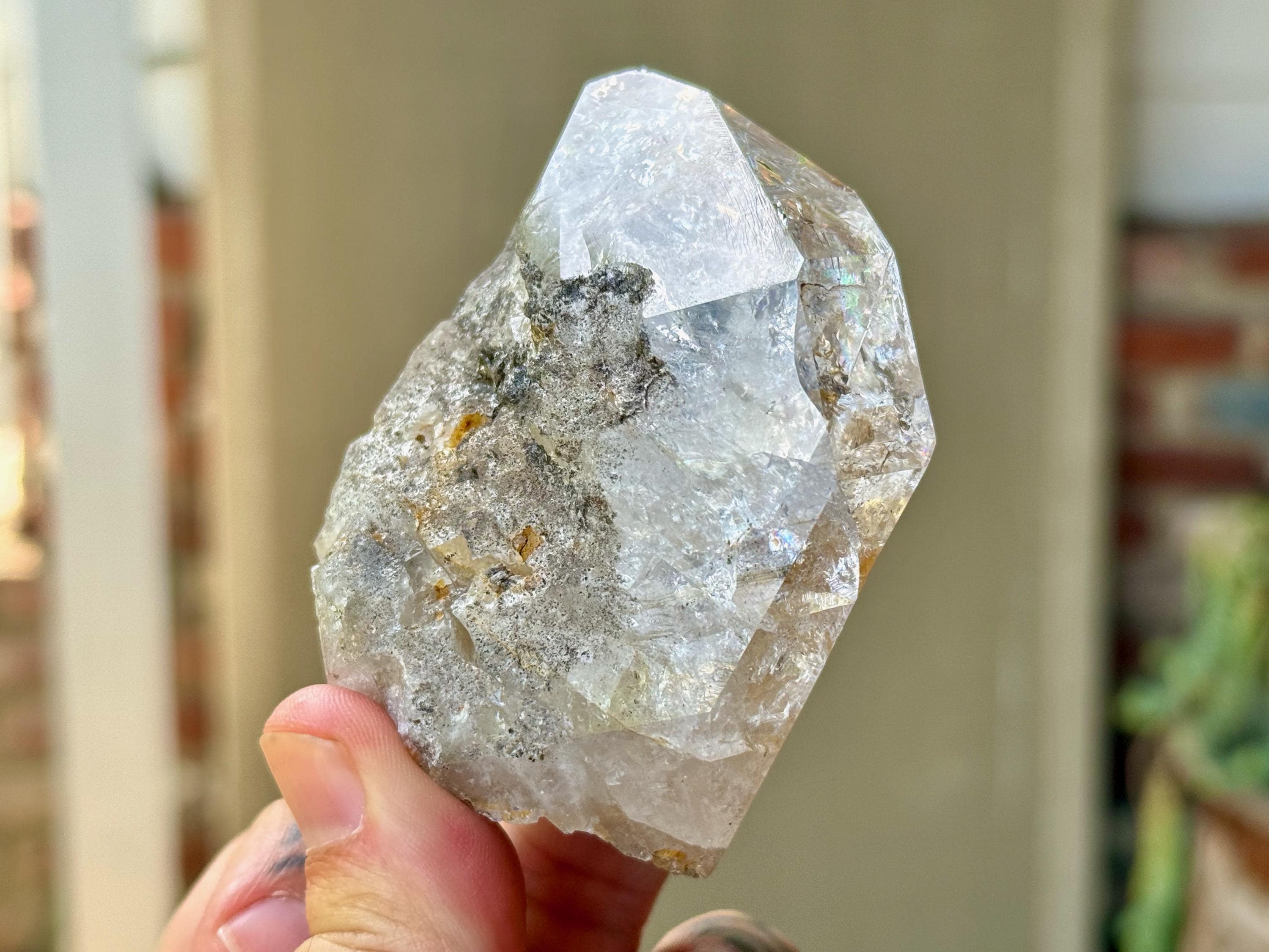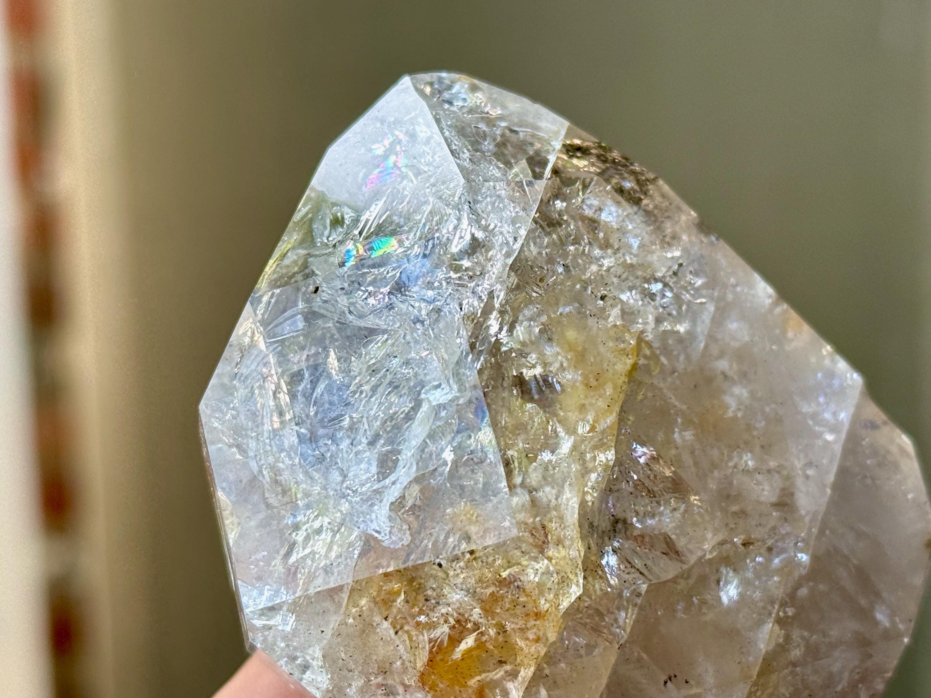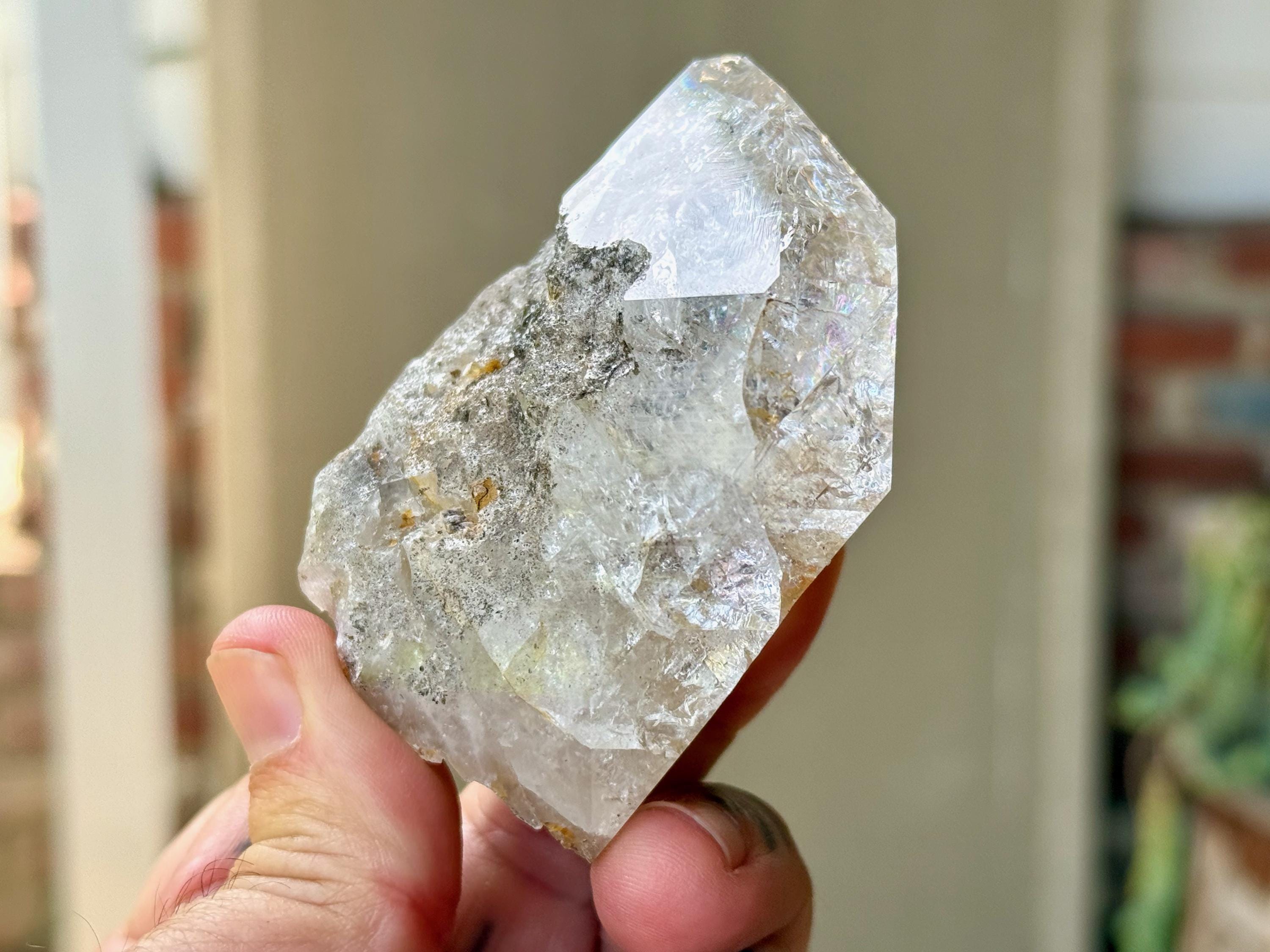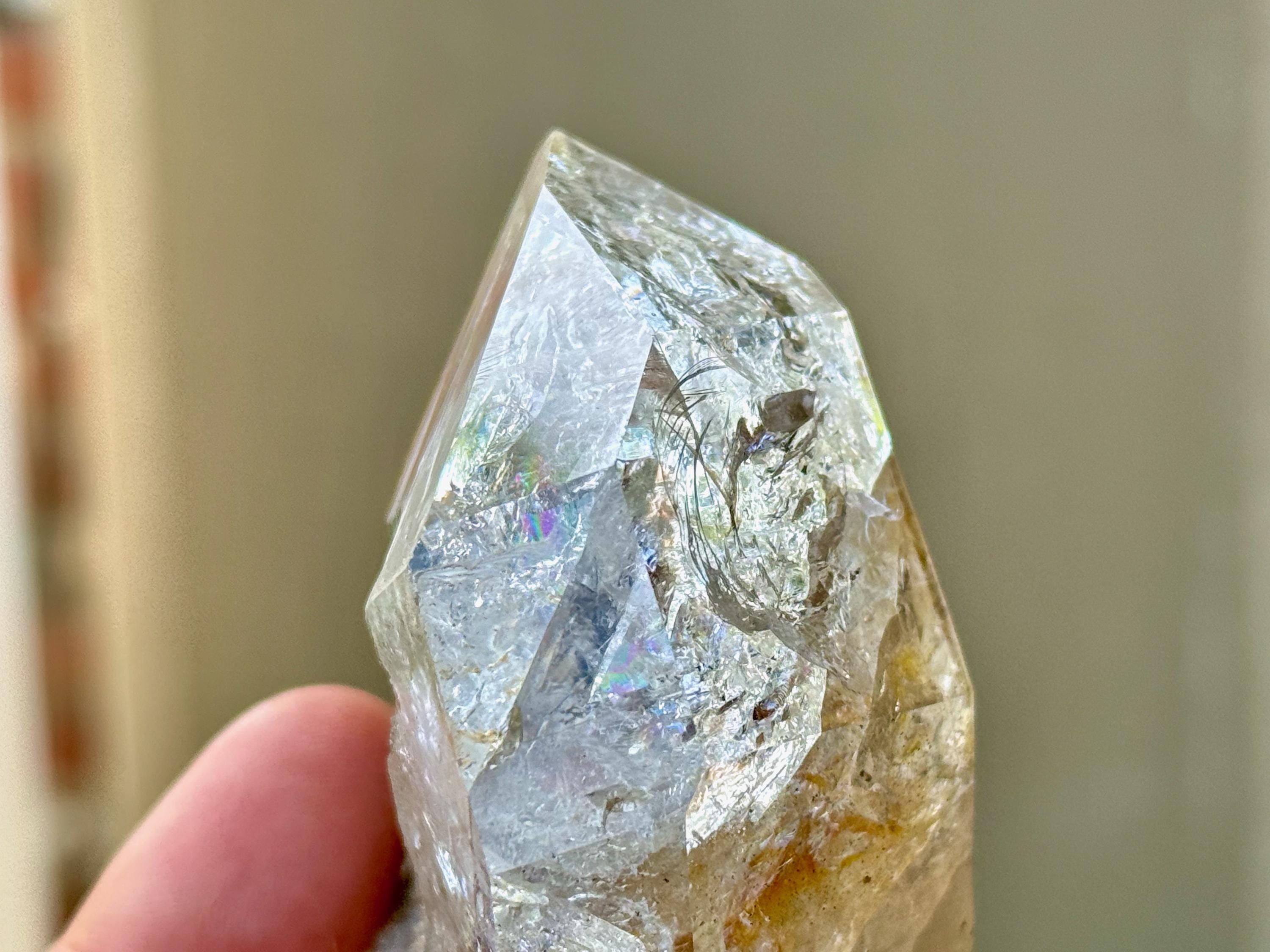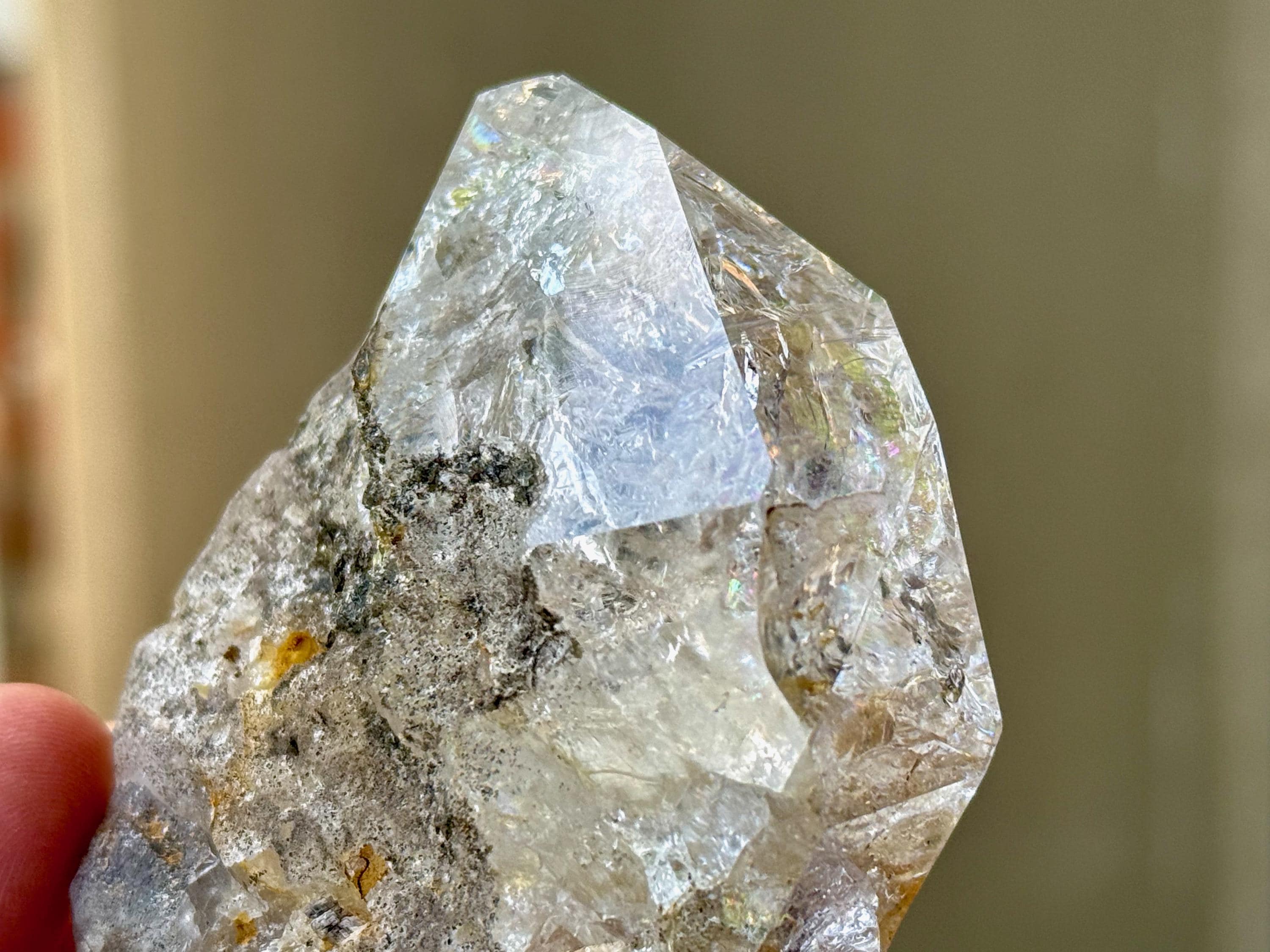 This crystal exhibits a classic Herkimer "diamond" formation that is also broad and slightly flattened. The clarity allows us to peer inside and enjoy all the crystalline formations within, including a number of vibrant rainbows.
