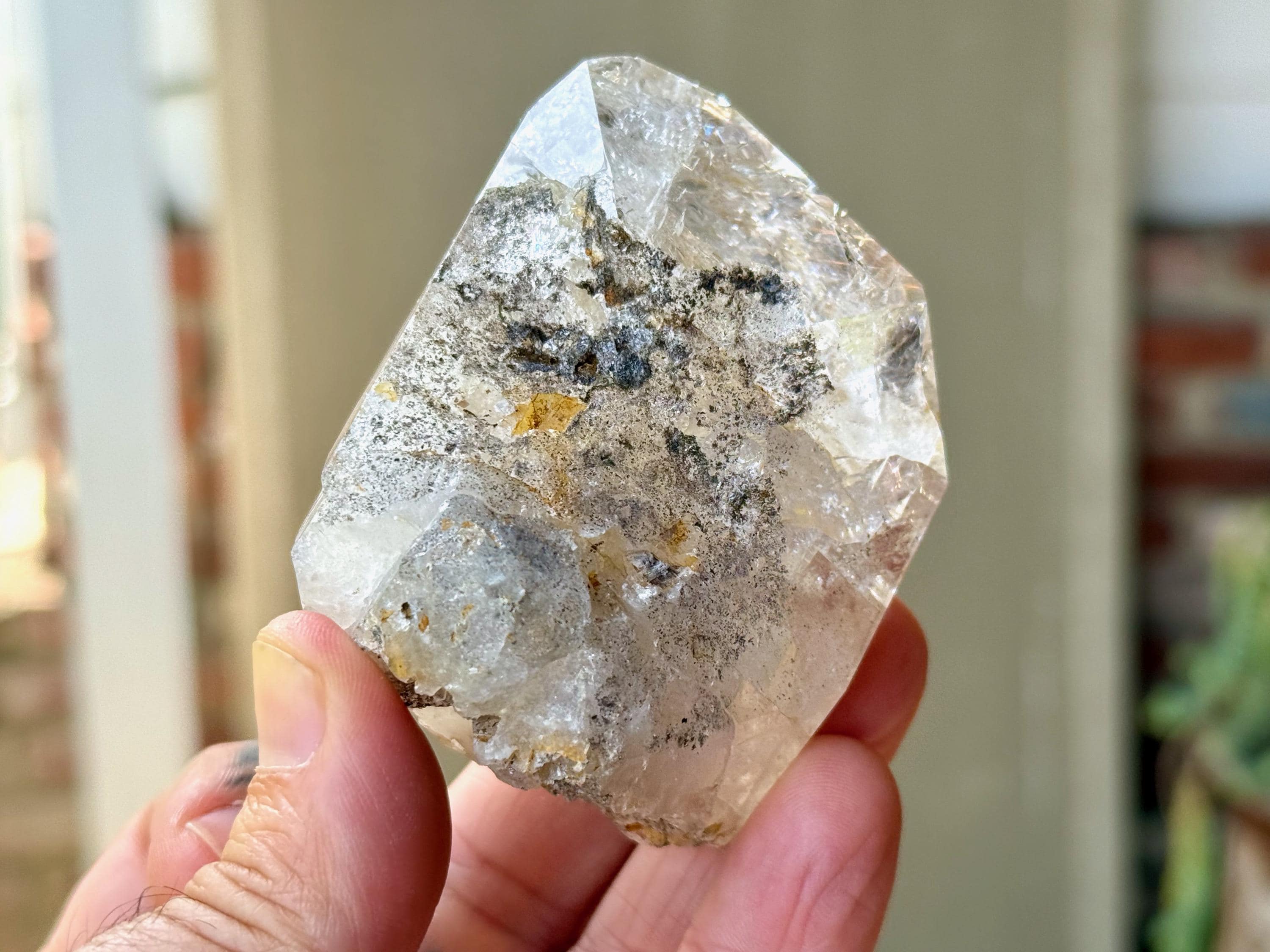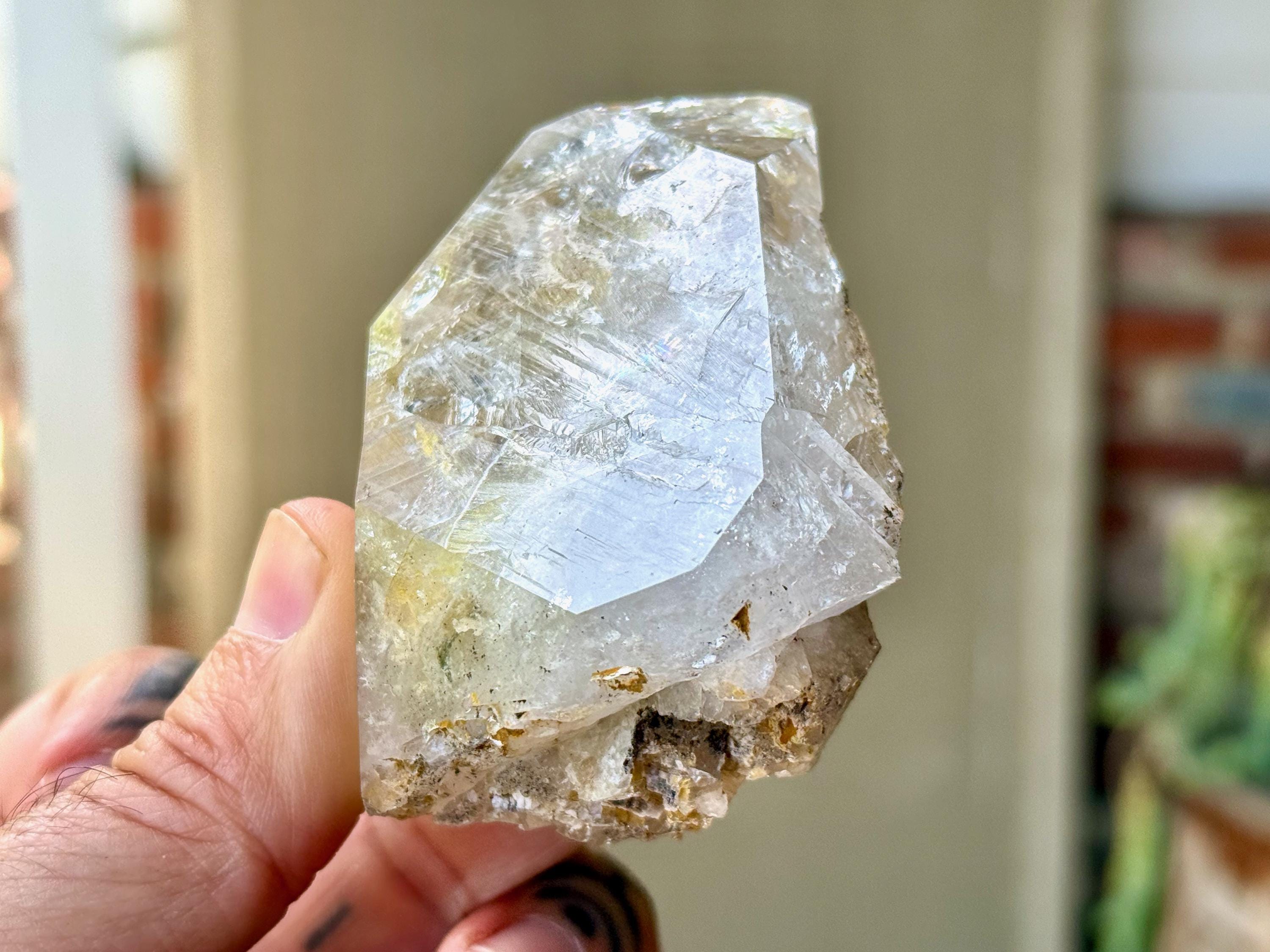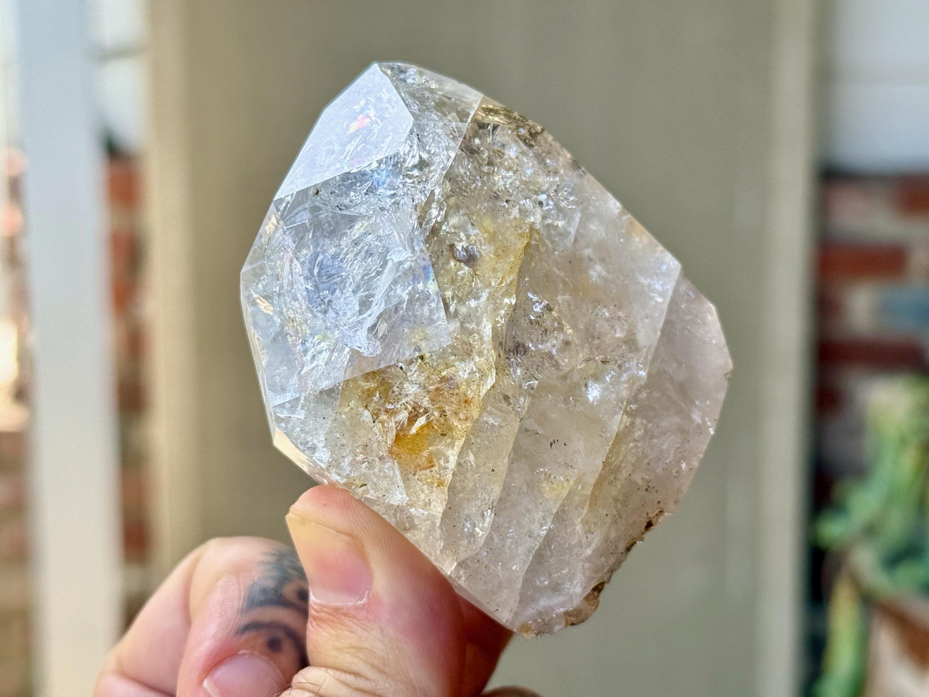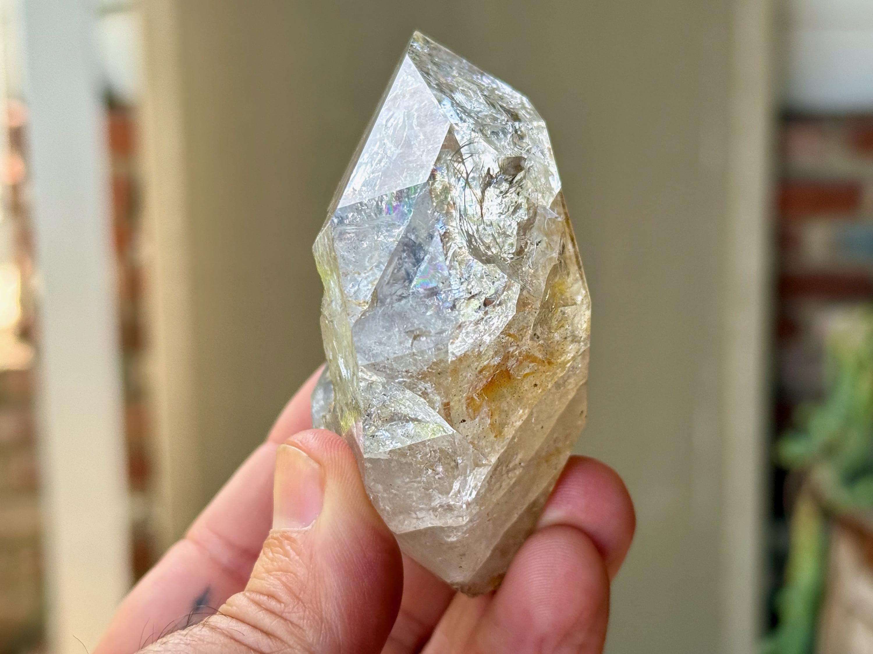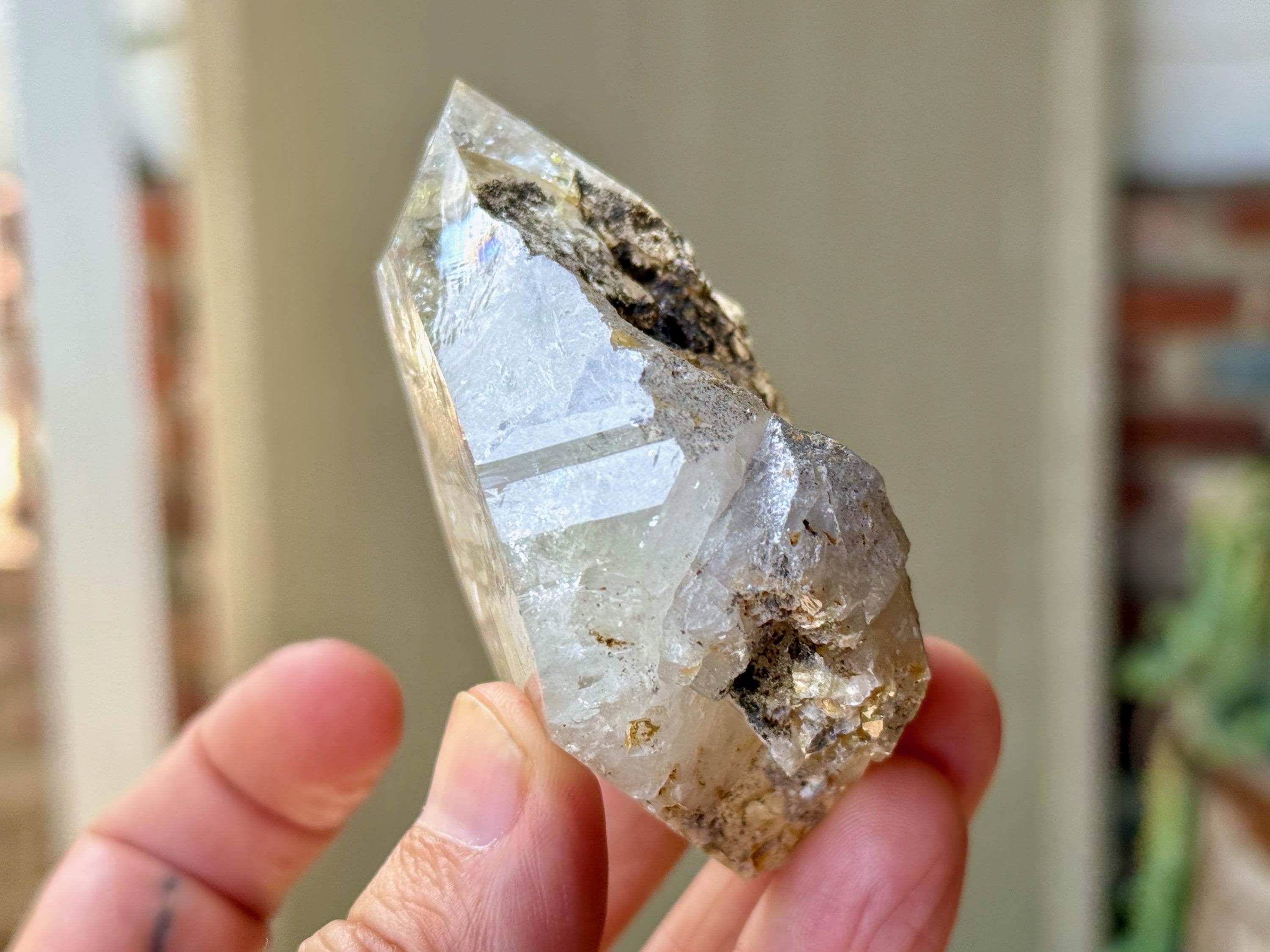 This crystal exhibits a classic Herkimer "diamond" formation that is also broad and slightly flattened. The clarity allows us to peer inside and enjoy all the crystalline formations within, including a number of vibrant rainbows.