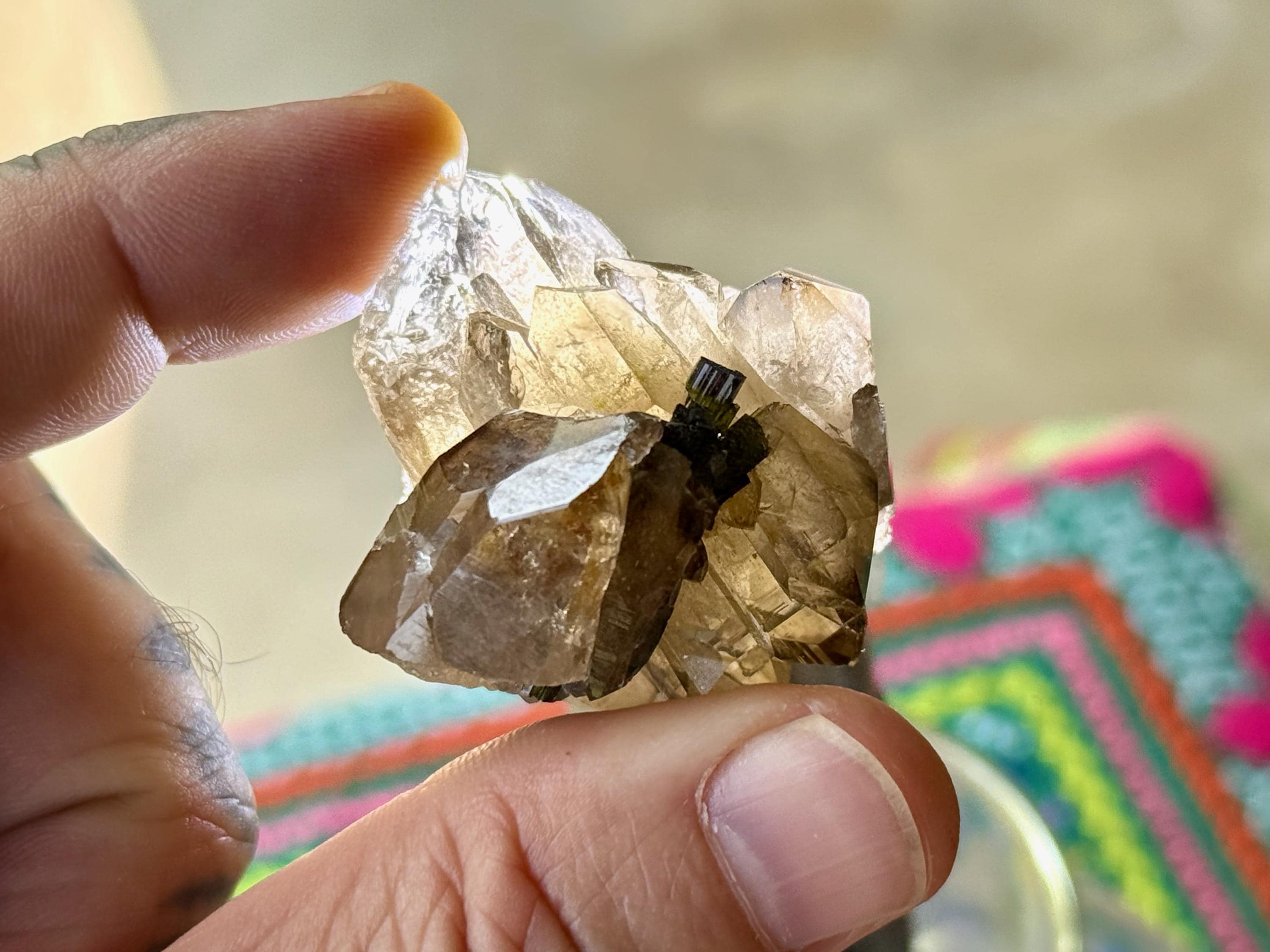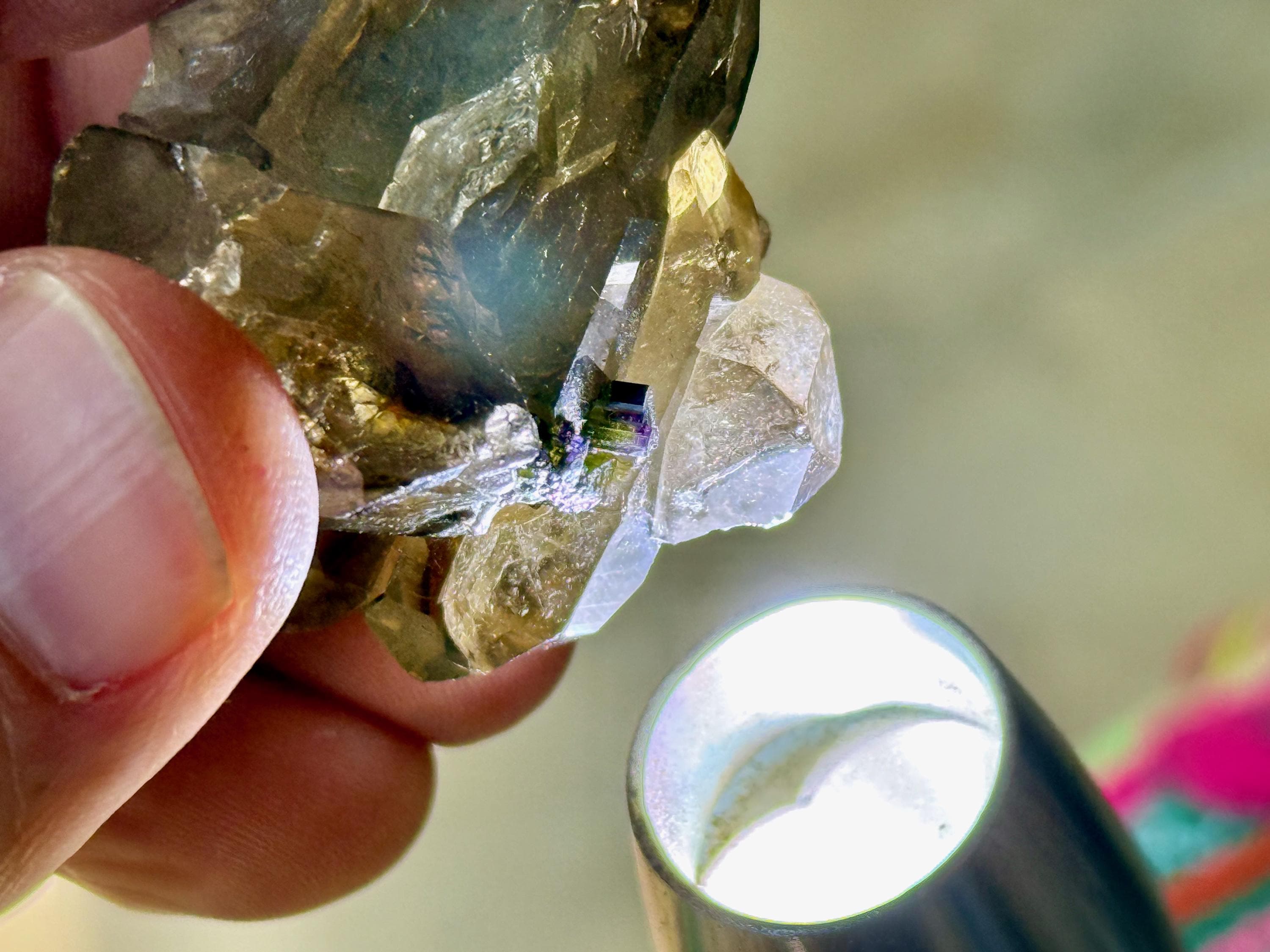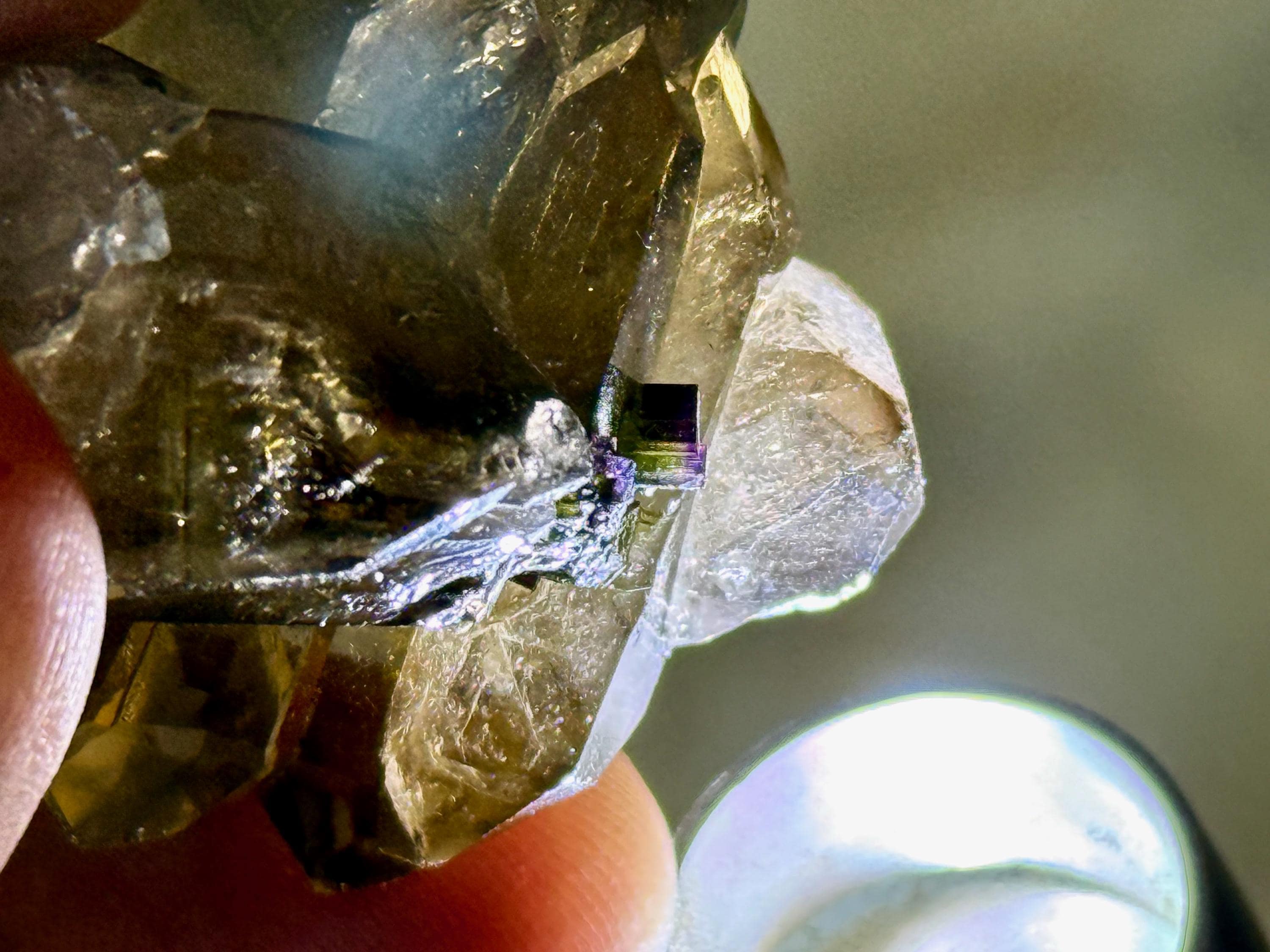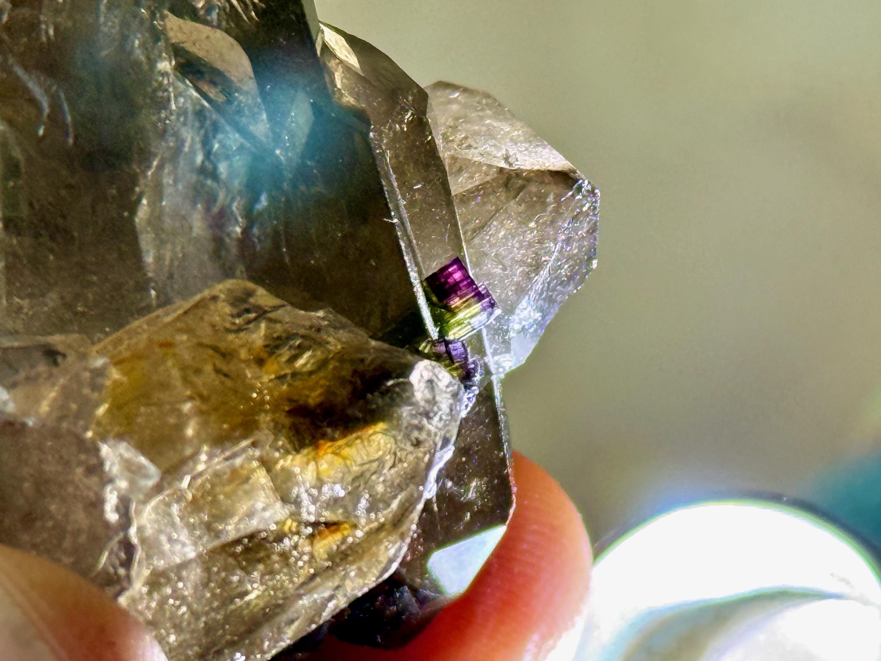 In natural light these small Tourmalines appear black, but light them up and we see that they are a vibrant combination of Green, Purple and dark Pink! (Photos 3-6).