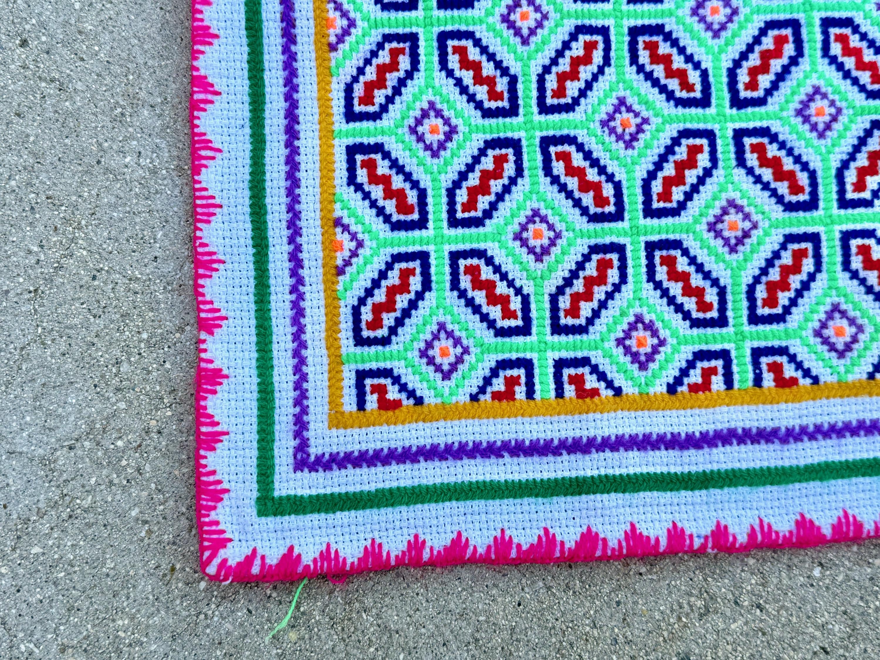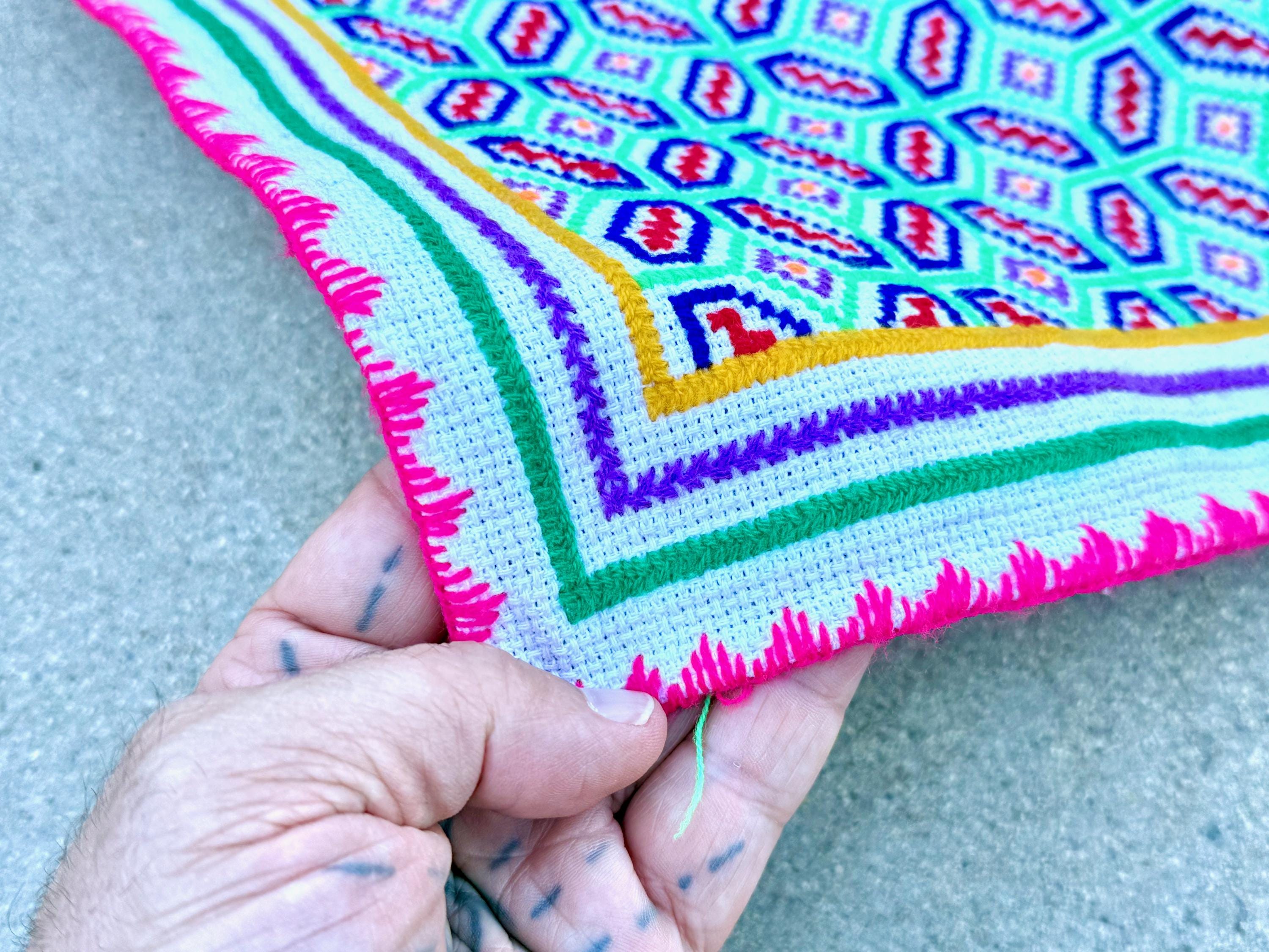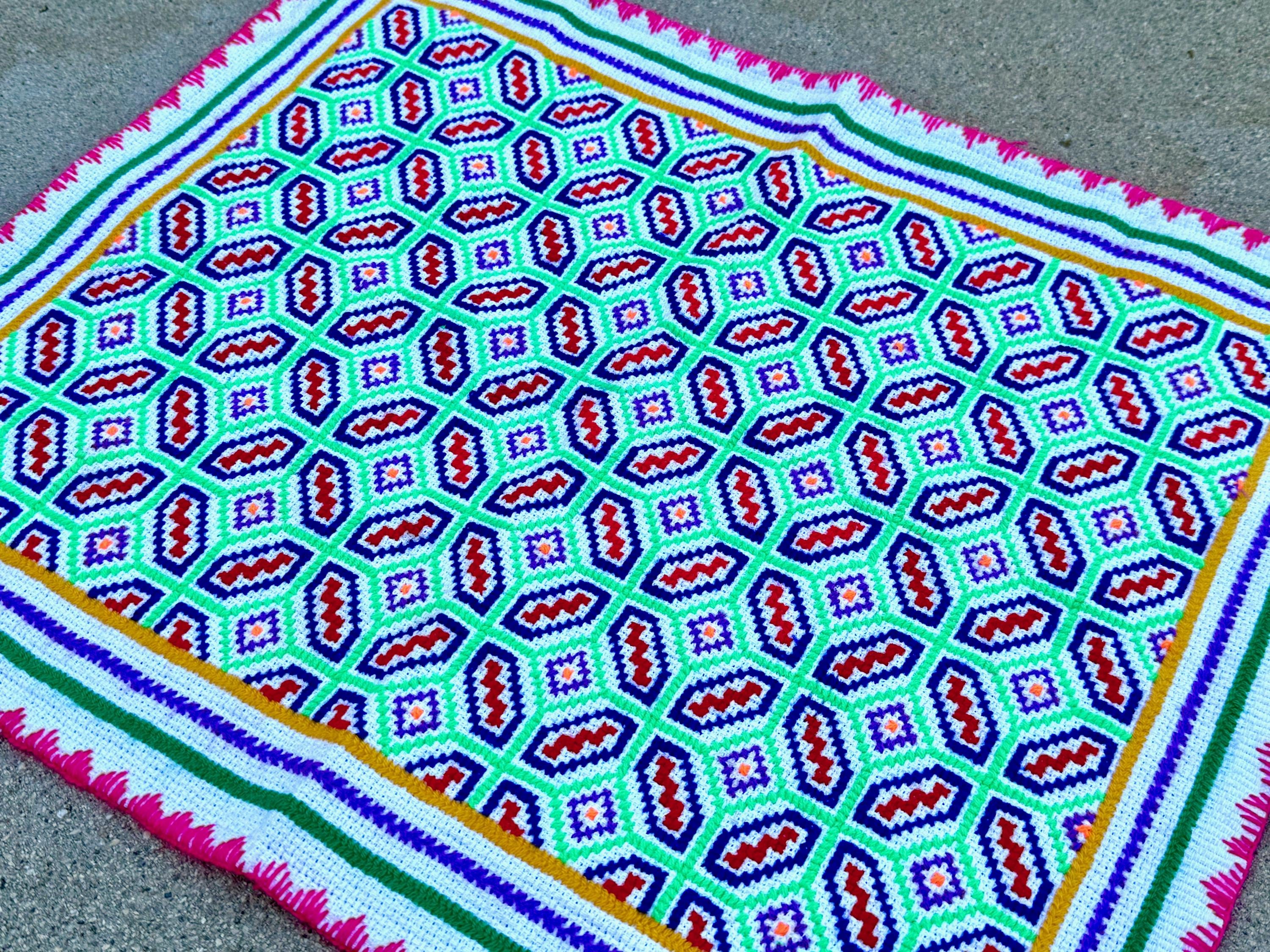 This Shipibo Manta Cloth — representing an Icaro (medicine song) for the medicine plant Catahua — was handmade by Maestra Juanita in Iquitos, Peru.