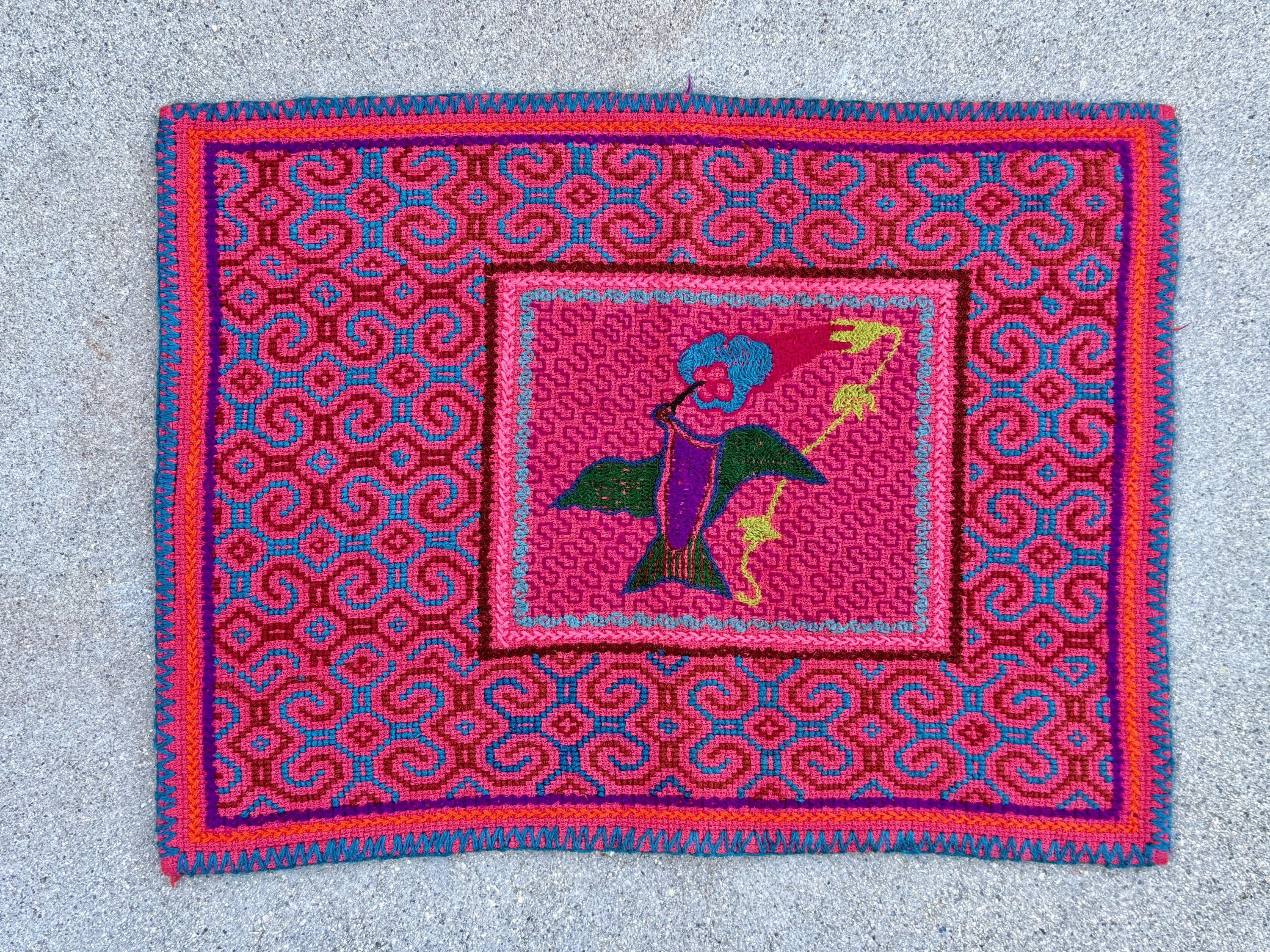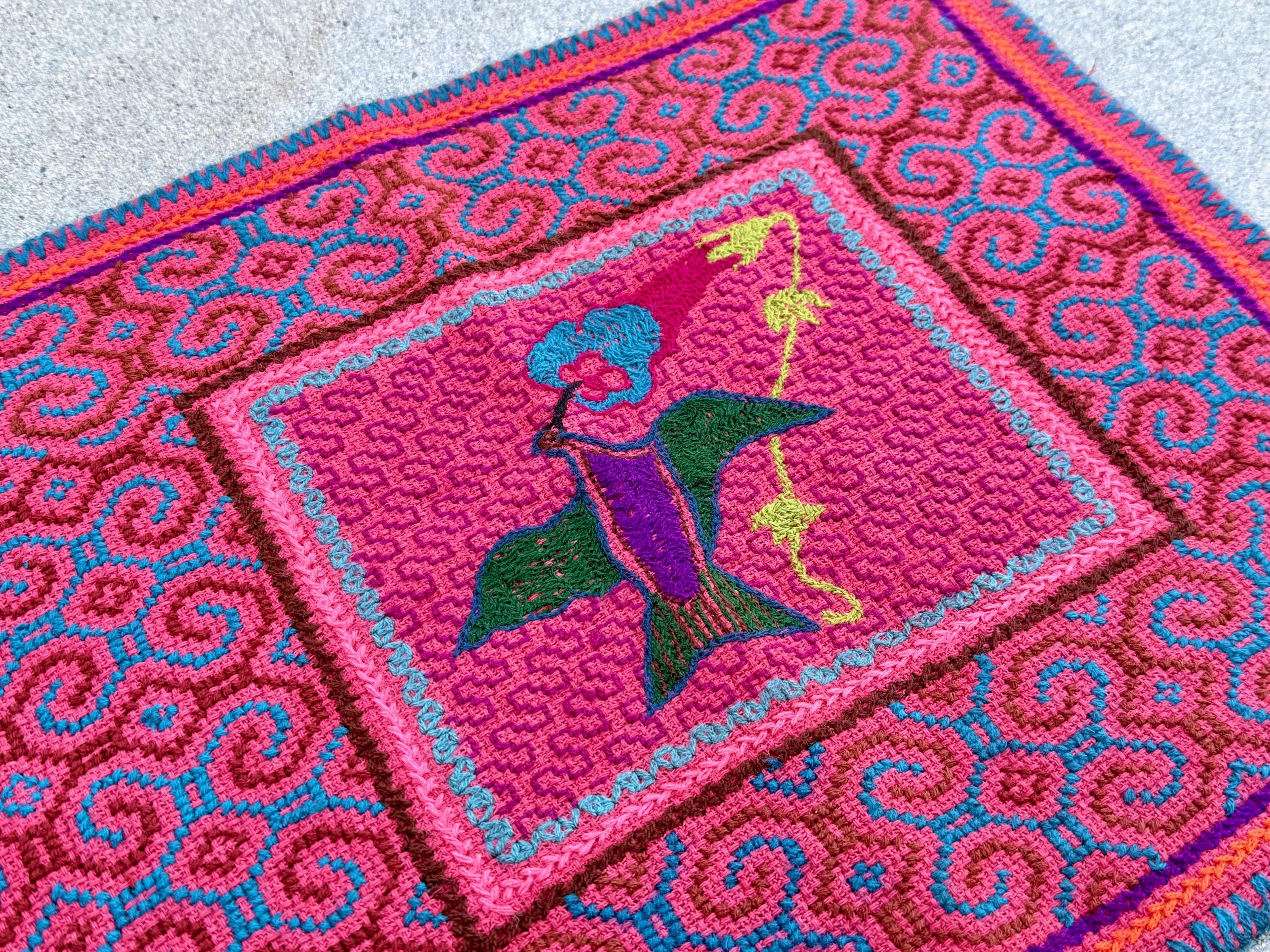 This vibrant Shipibo Manta Cloth with Hummingbird was hand-embroidered by the talented Peruvian artisan Laura Rengifo in Pucallpa, Peru.