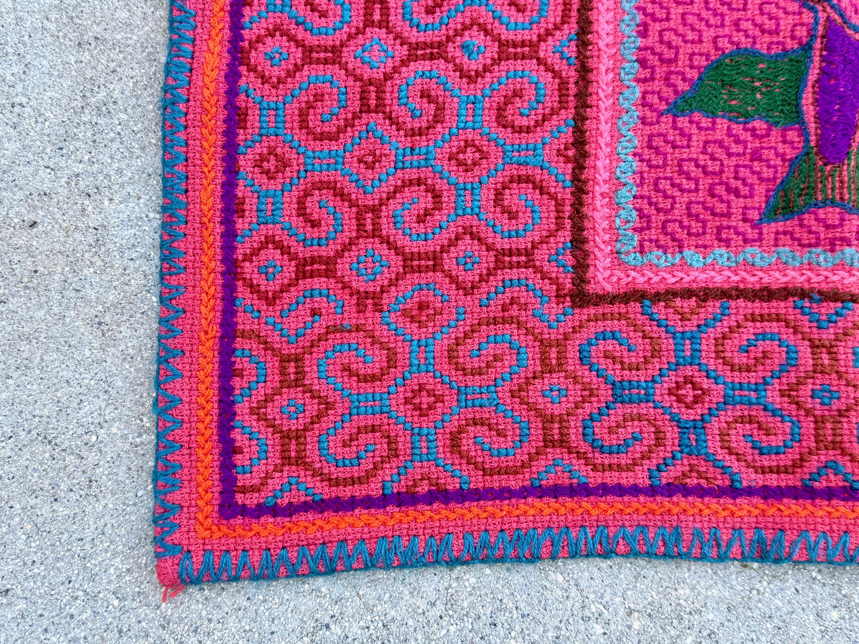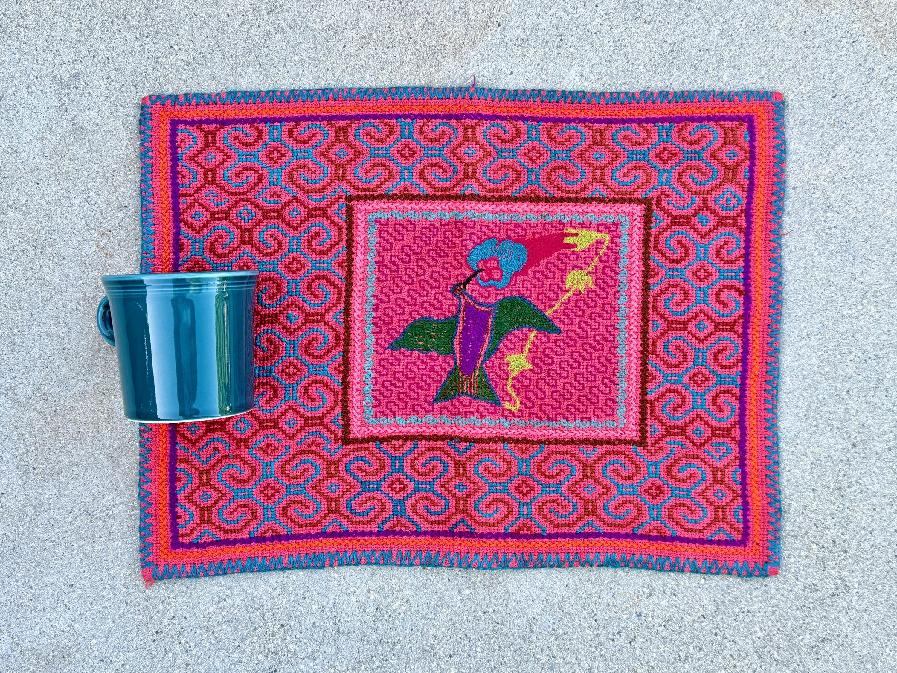 The cloth itself is a rather thick cotton base, unlike some of the thinner synthetic base cloths sometimes utilized for these cloths. It's a perfect smaller size for plant medicine ceremony or home mesa/altar.