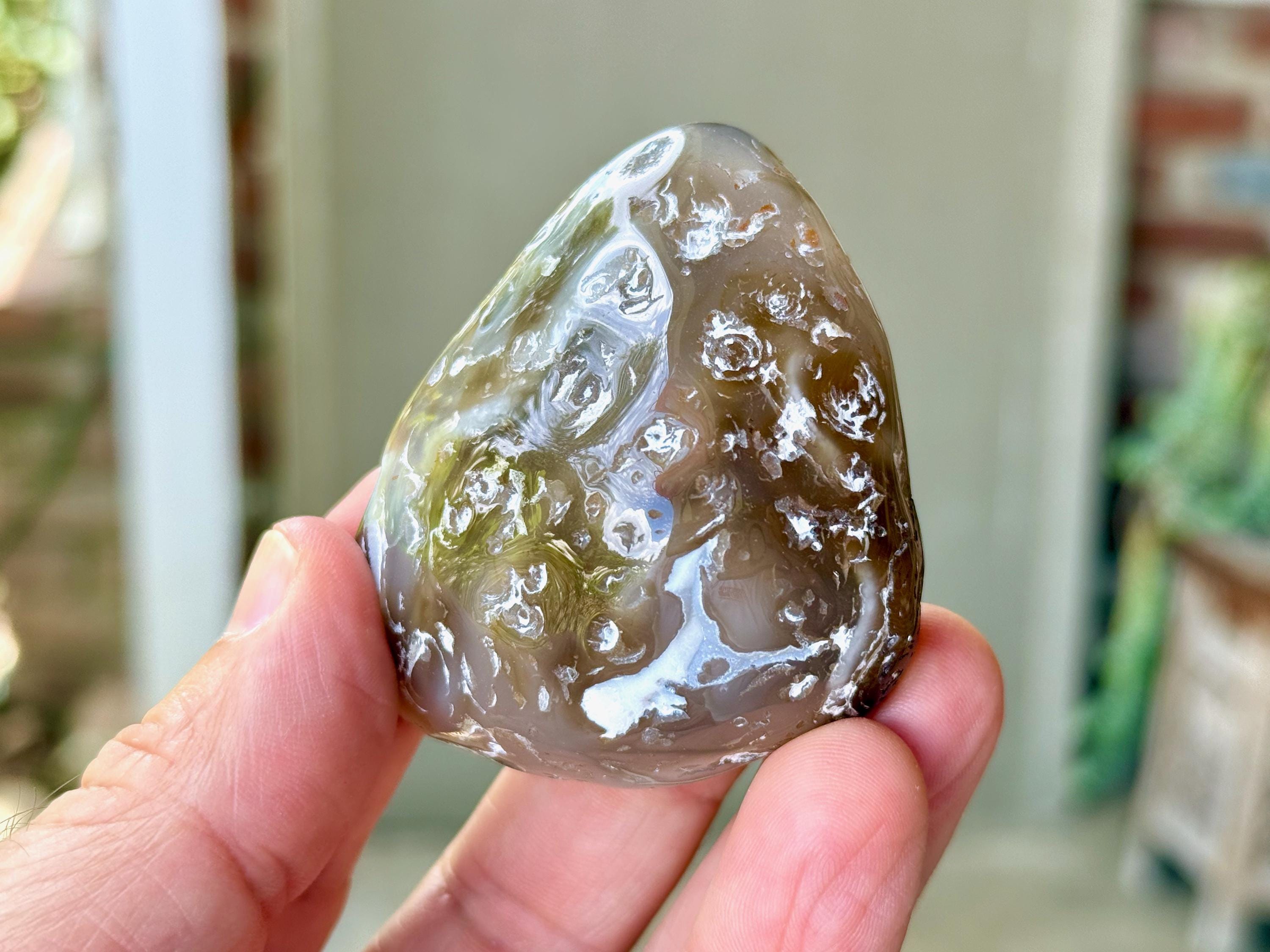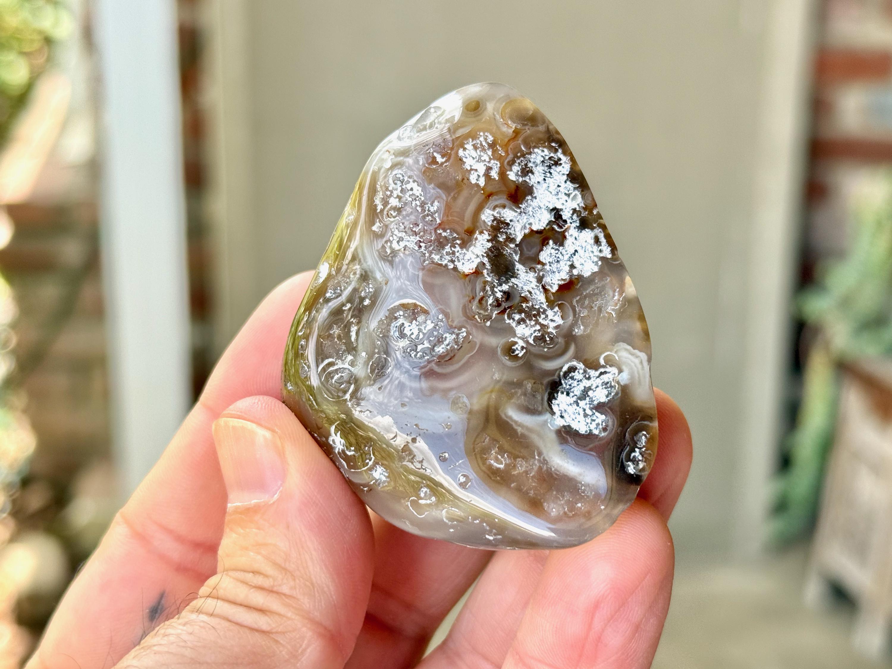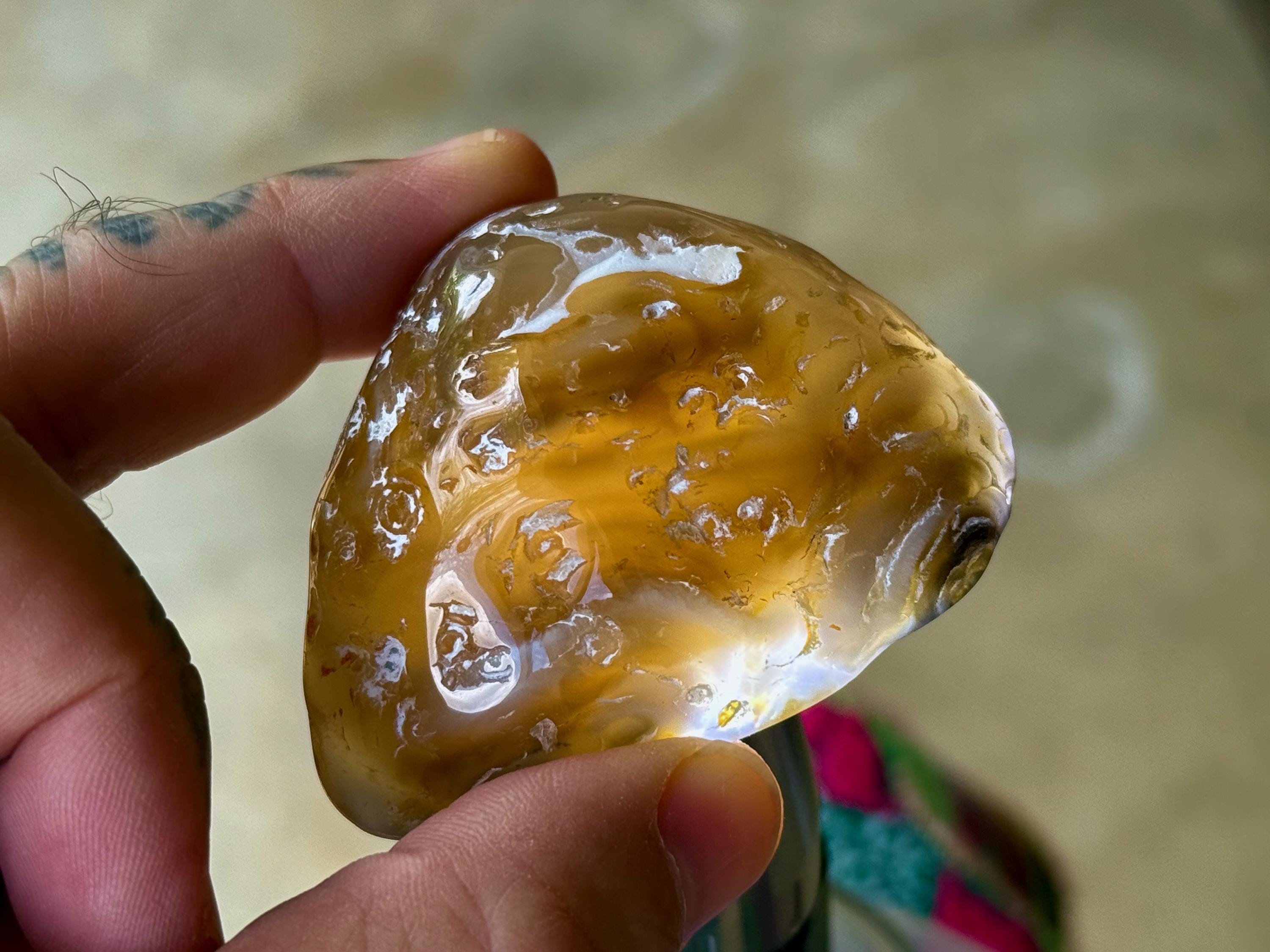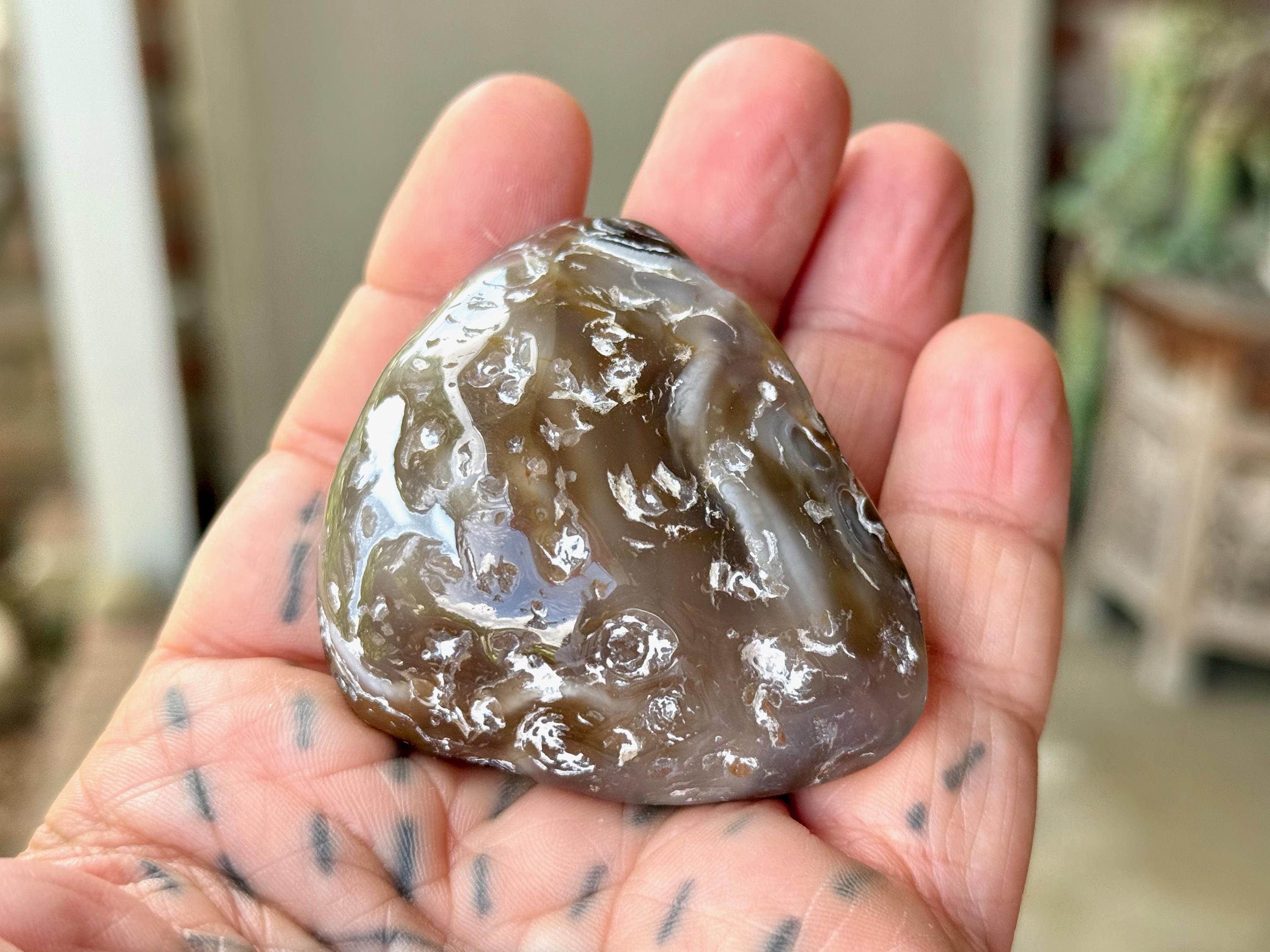 This aquatic Agate has marvelous transparency when backlit, and this allows us to see the moving water within. The video shows this and it will be much more evident in person. We recommend using a strong light (like an iPhone flashlight) to backlight and doing so in a darkened room to fully appreciate the water within. We've also included photos of this piece with backlighting (Photos 1, 3).