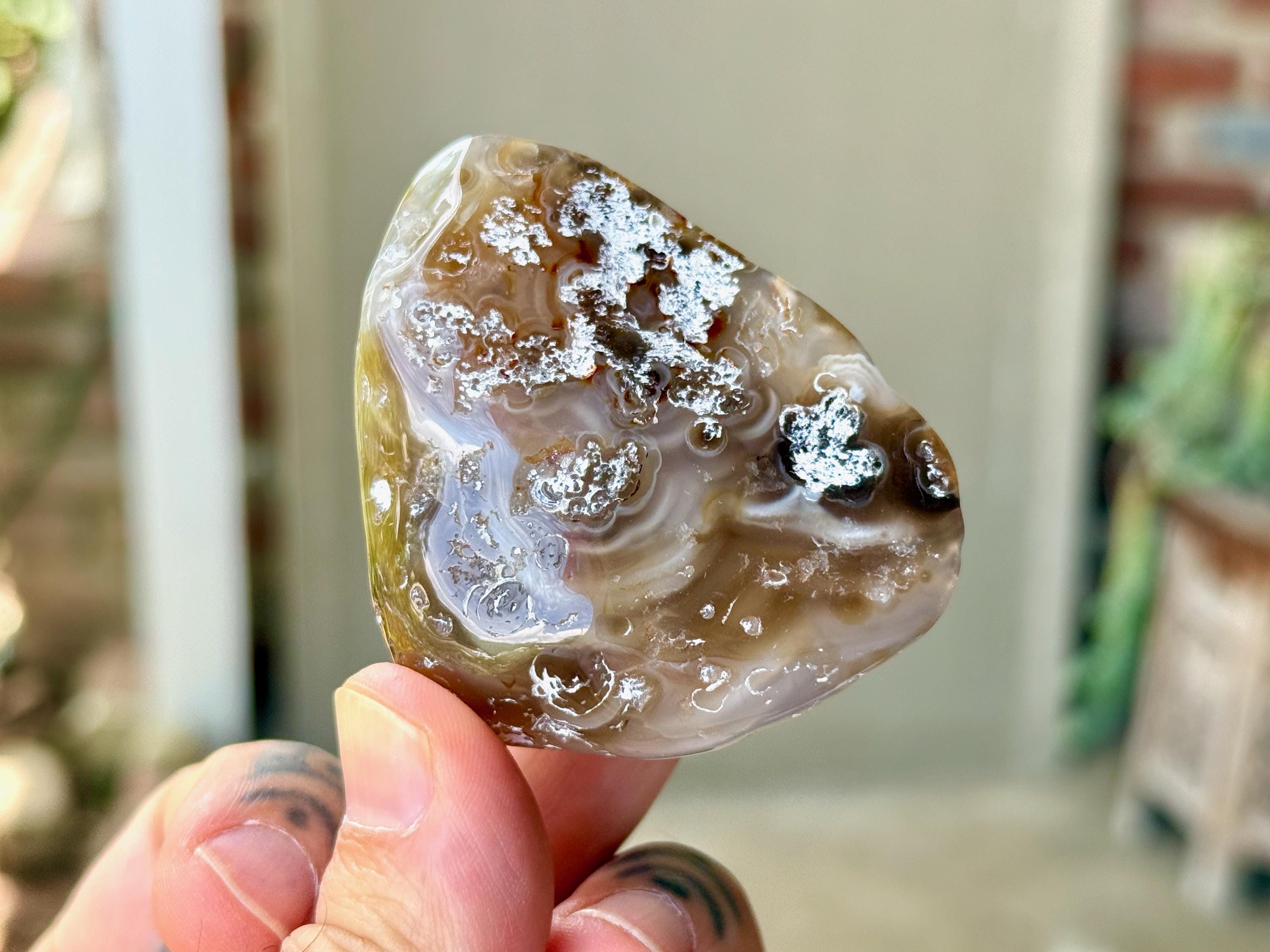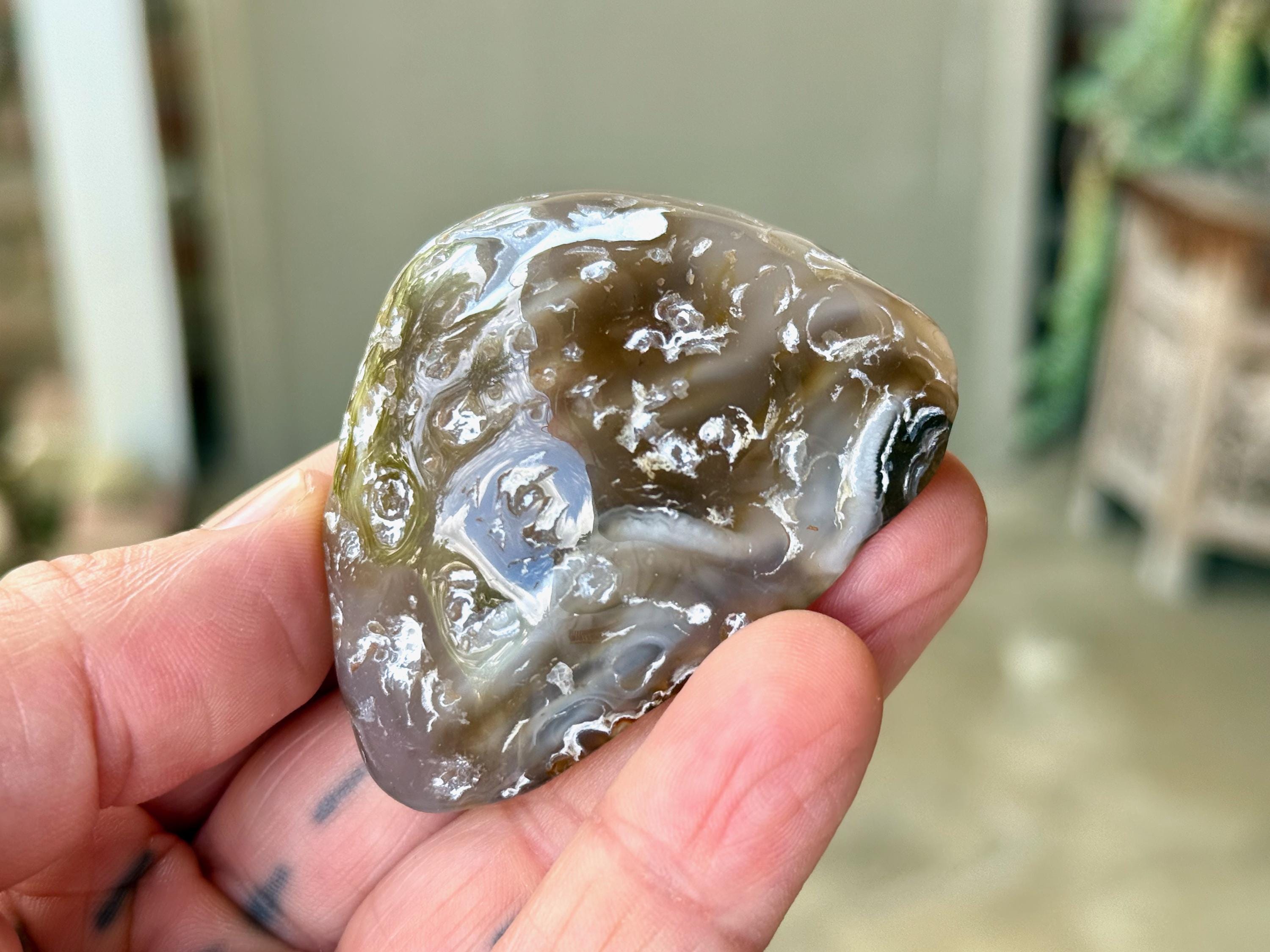 This superb Enhydro Ocean Agate comes from a 2018 find in Rio Grande do Sul, Brazil. While it is absolutely beautiful to look at from a glance, it has a secret within that makes it incredibly special and rare: it contains quite a large amount of water inside!