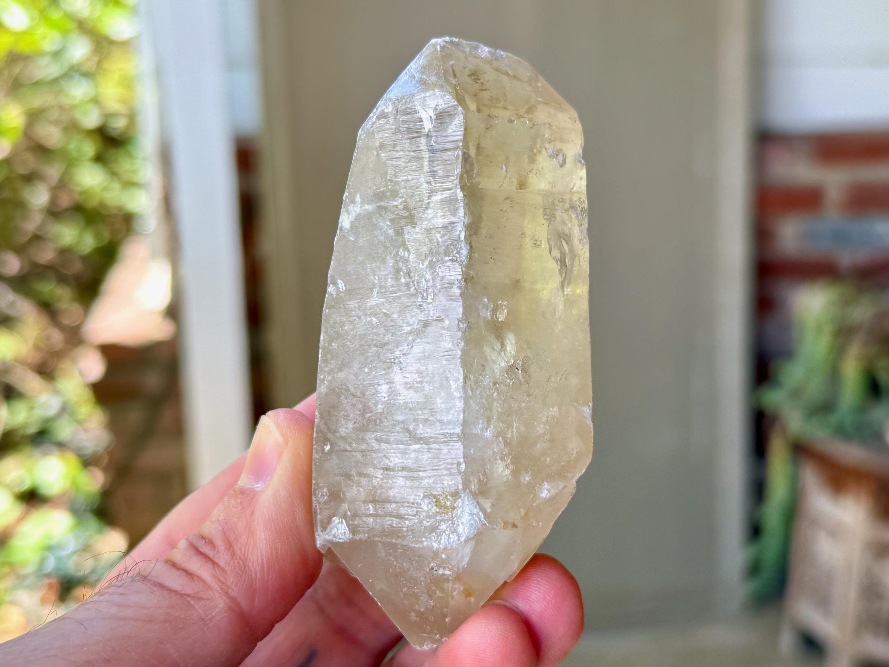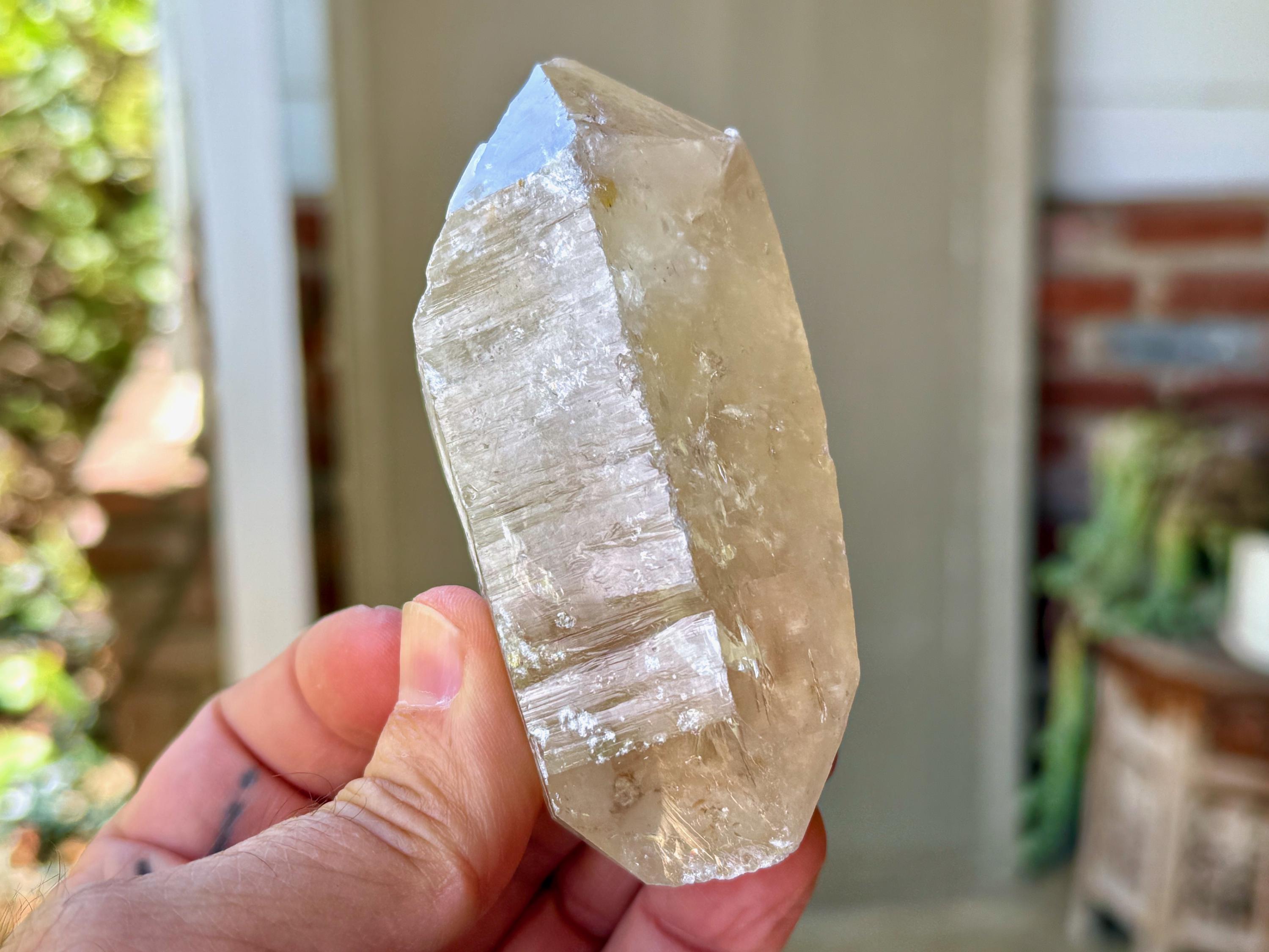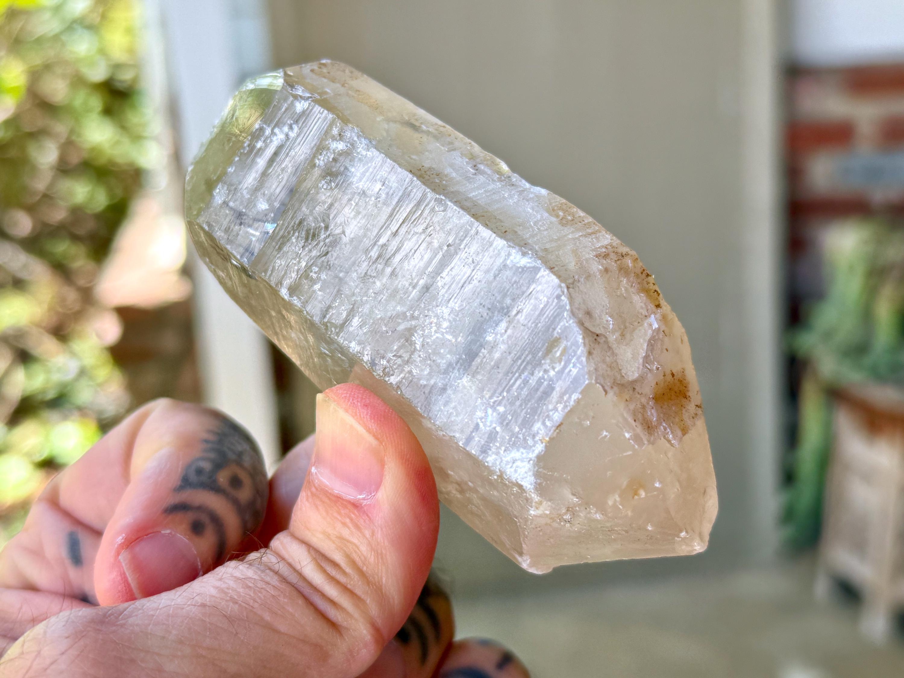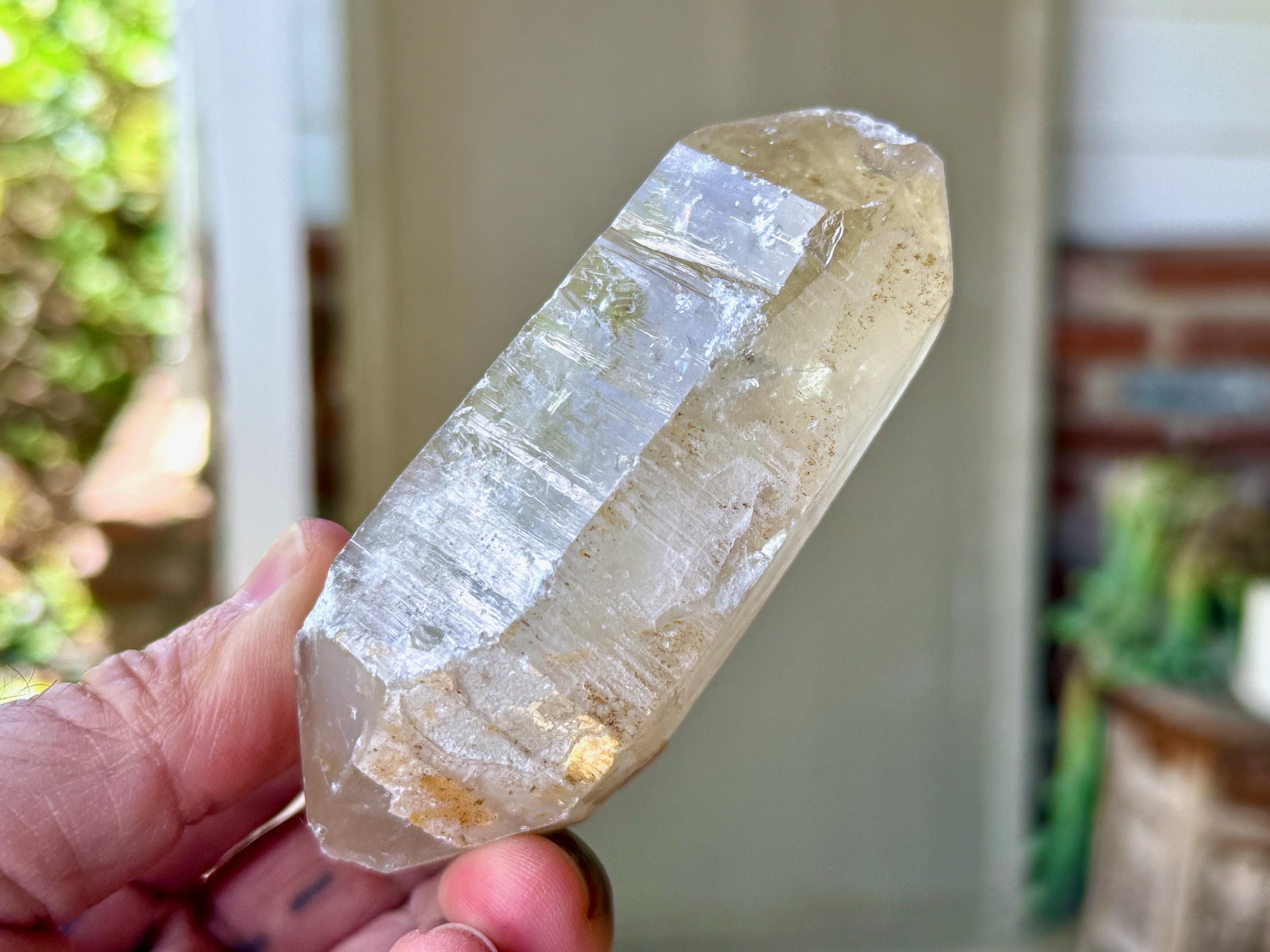 Brilliant luster to this Sacred Scribe Lemurian Quartz with a mild golden tinge and finely etched striations on its front and sides. This crystal exhibits an elongated formation with a glassy front side and a mildly white "frosted" backside.