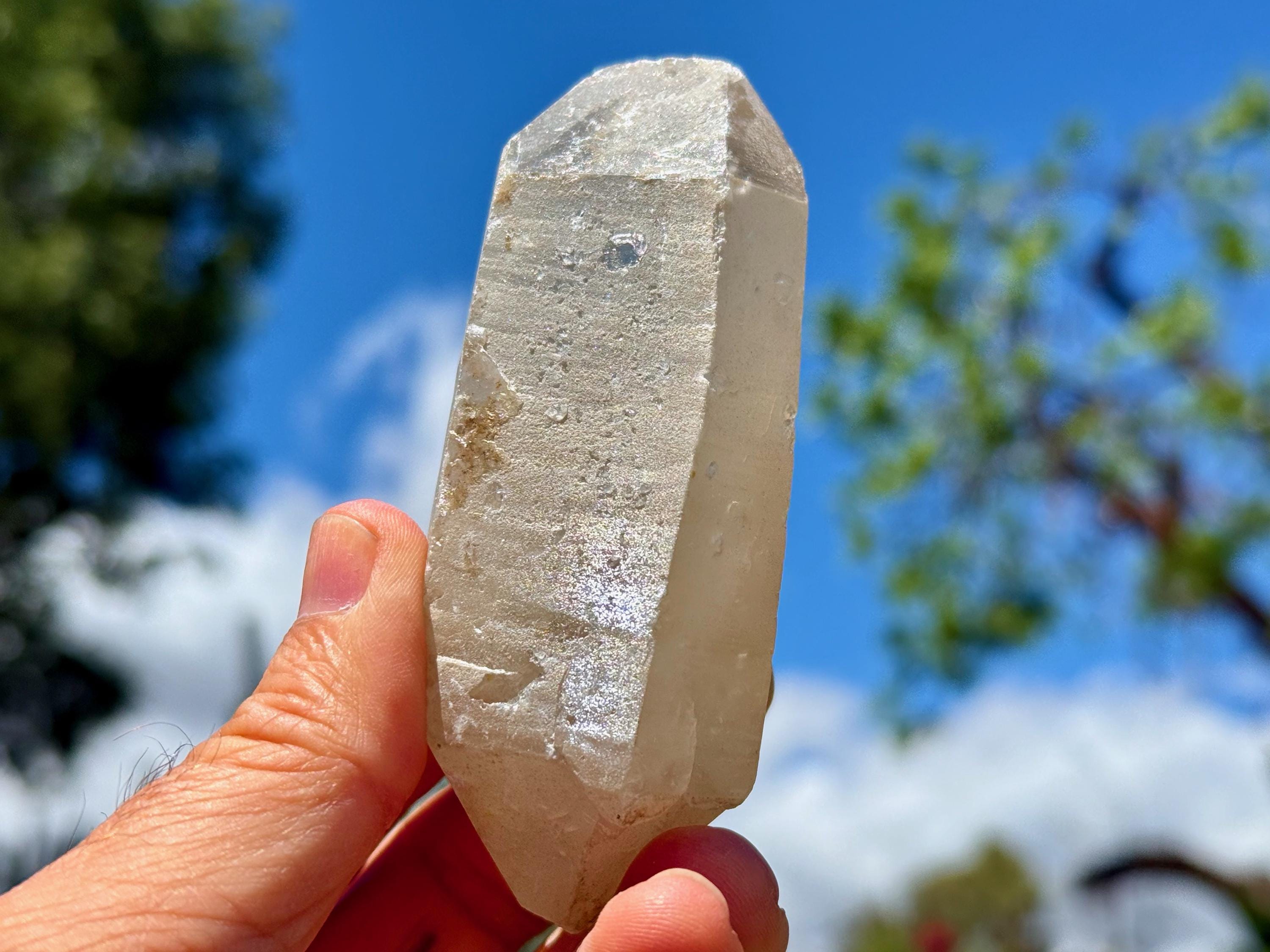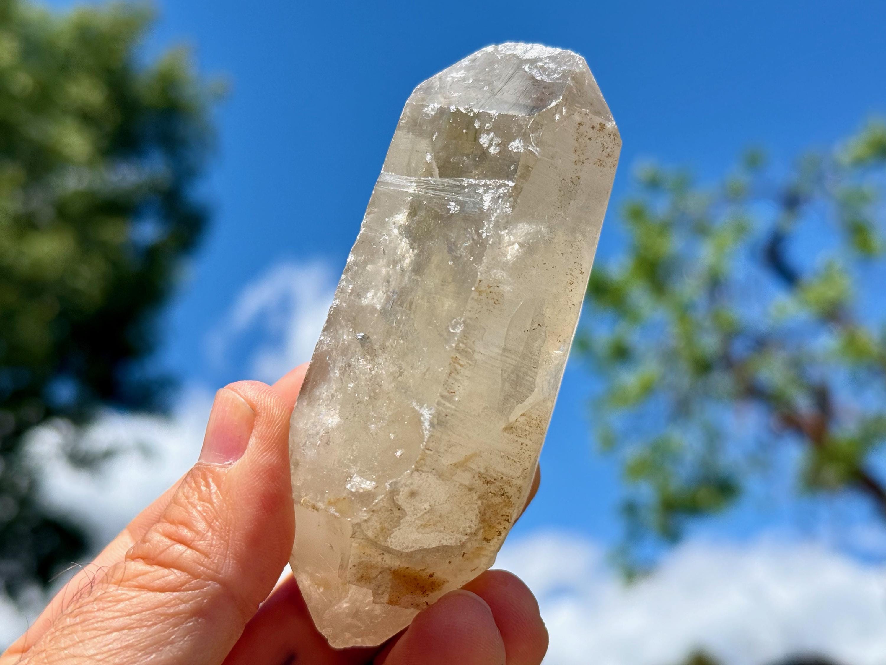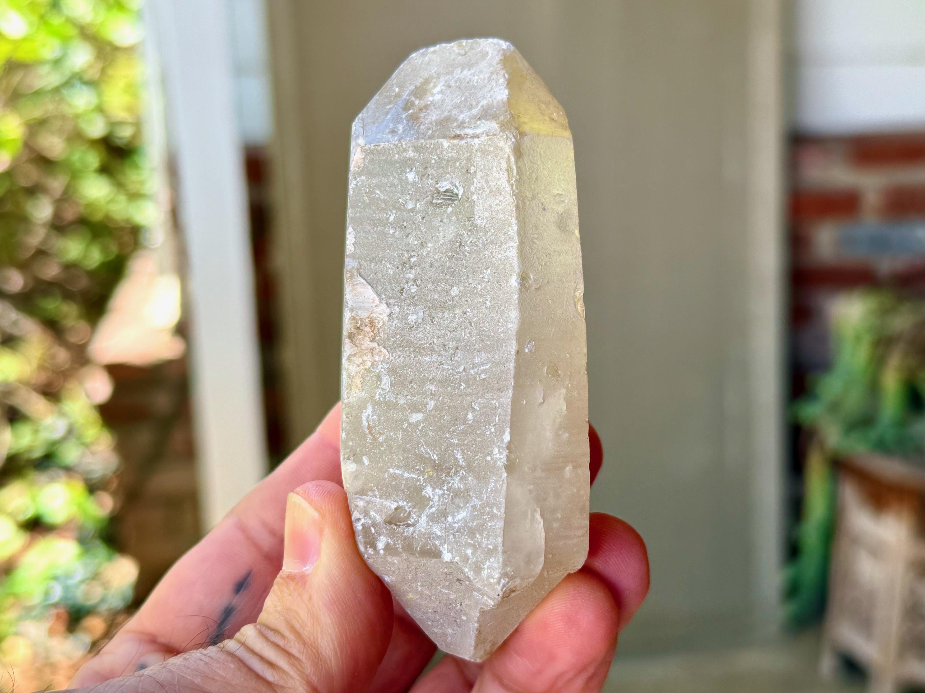 Brilliant luster to this Sacred Scribe Lemurian Quartz with a mild golden tinge and finely etched striations on its front and sides. This crystal exhibits an elongated formation with a glassy front side and a mildly white "frosted" backside.
