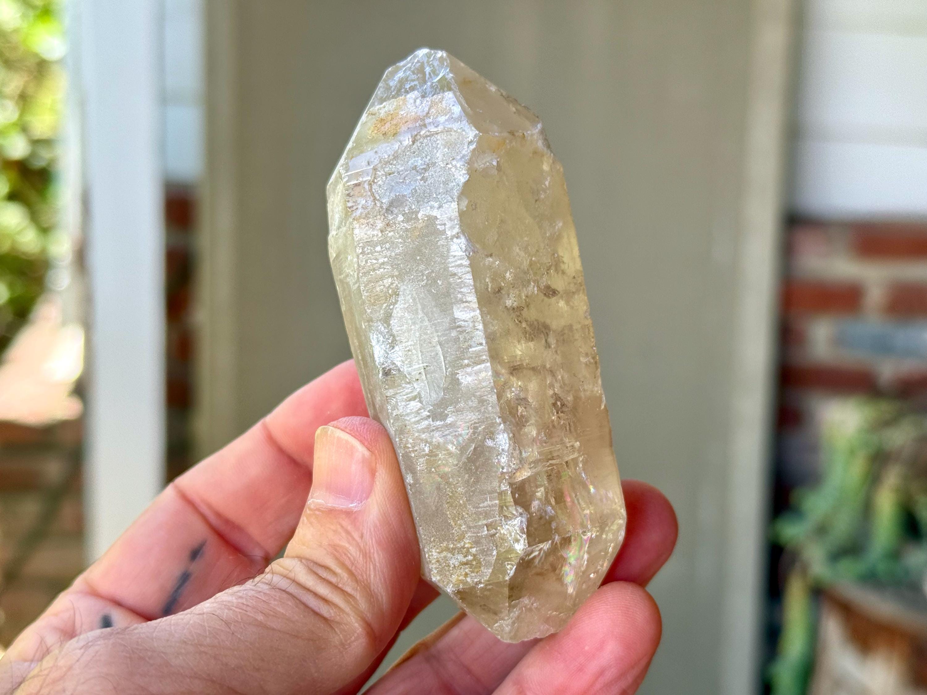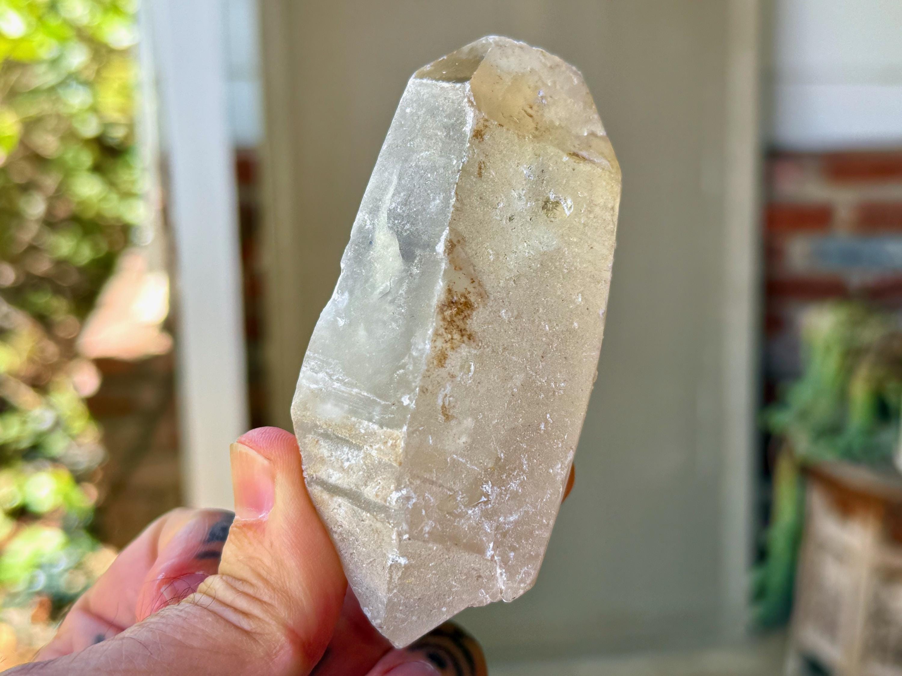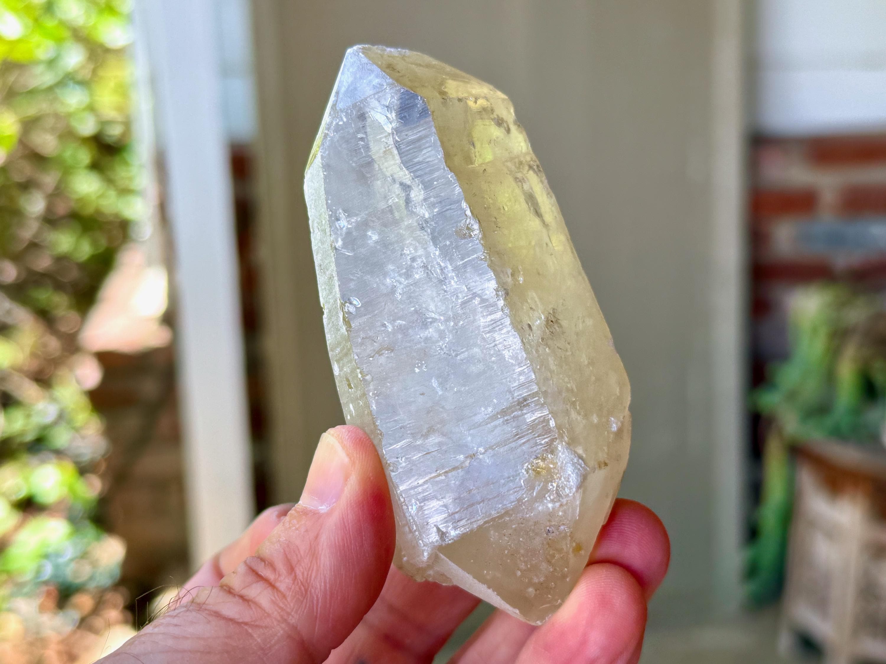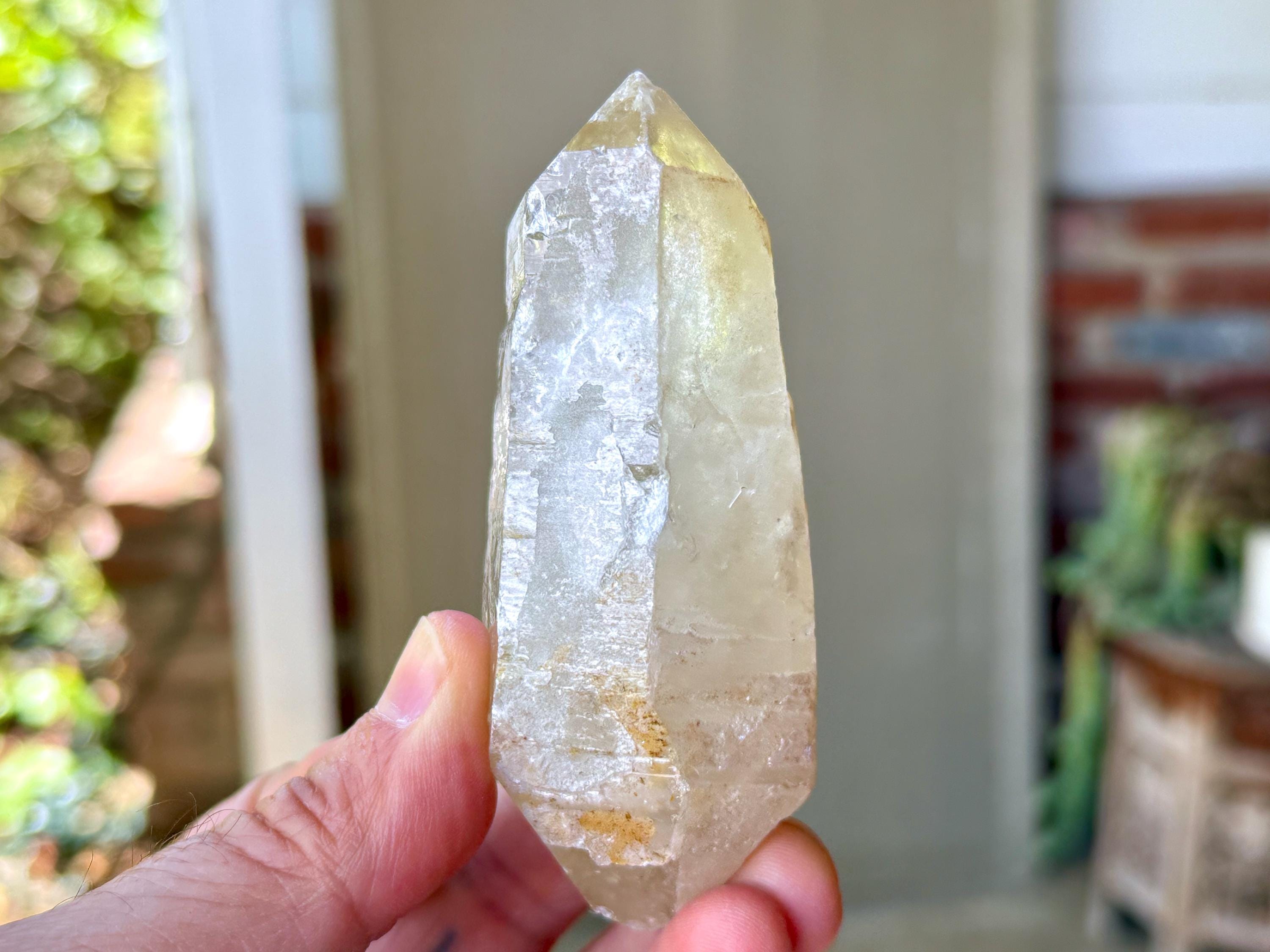 Brilliant luster to this Sacred Scribe Lemurian Quartz with a mild golden tinge and finely etched striations on its front and sides. This crystal exhibits an elongated formation with a glassy front side and a mildly white "frosted" backside.