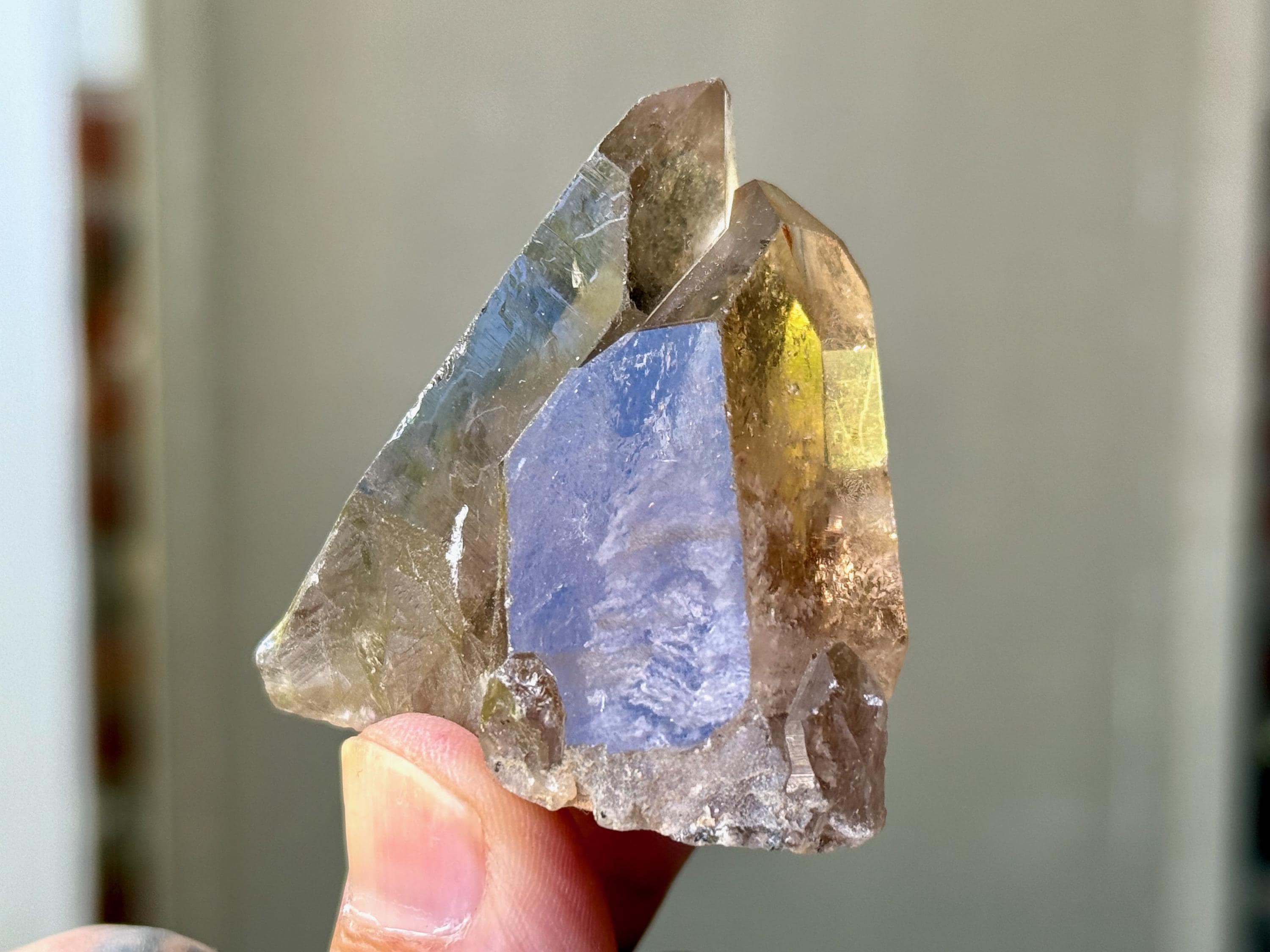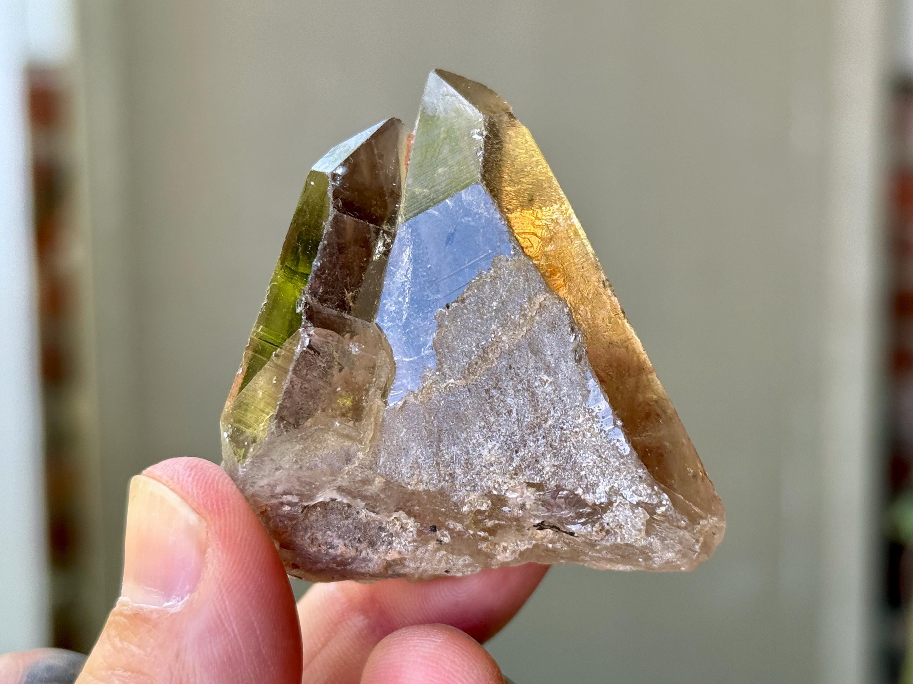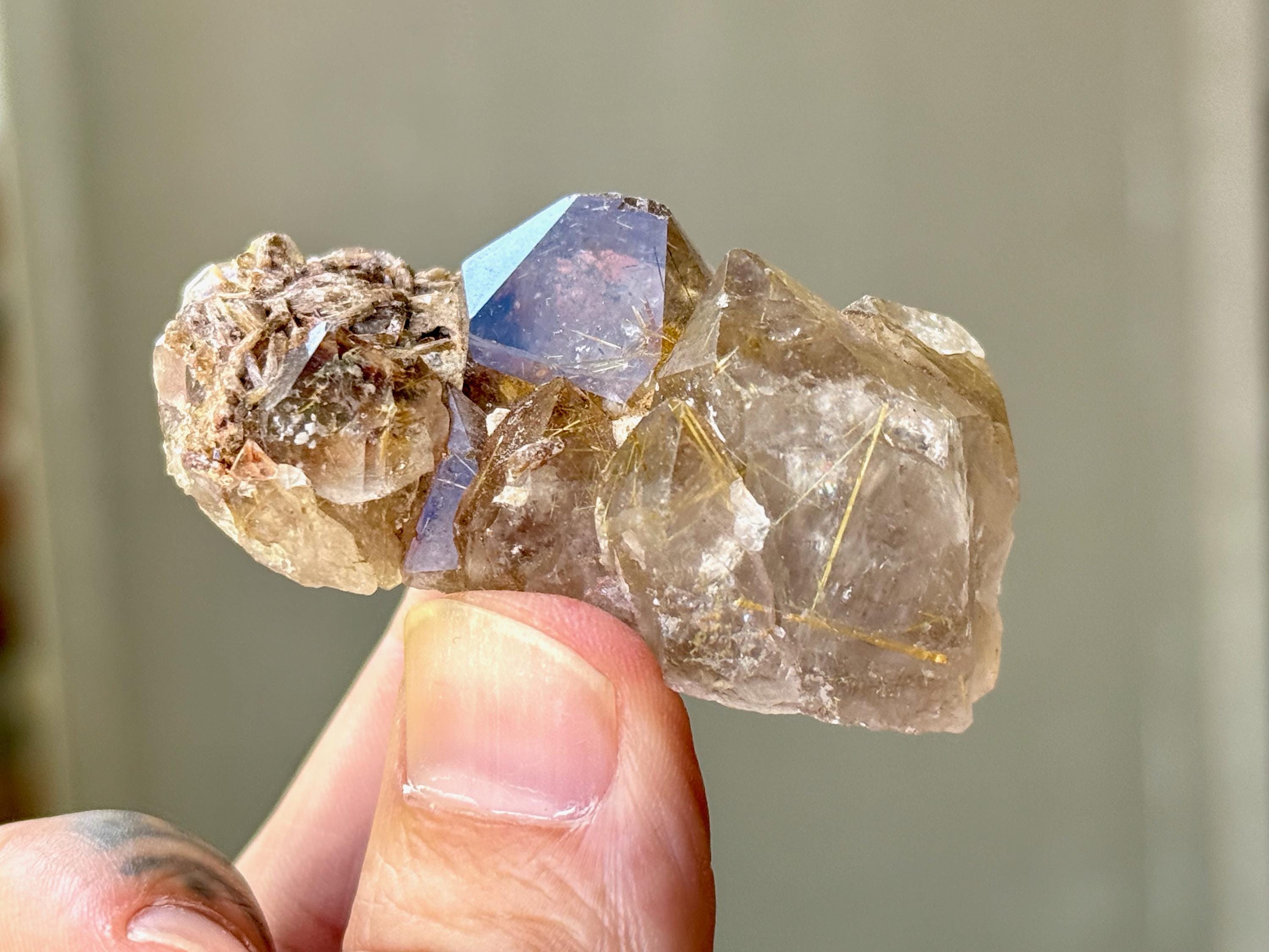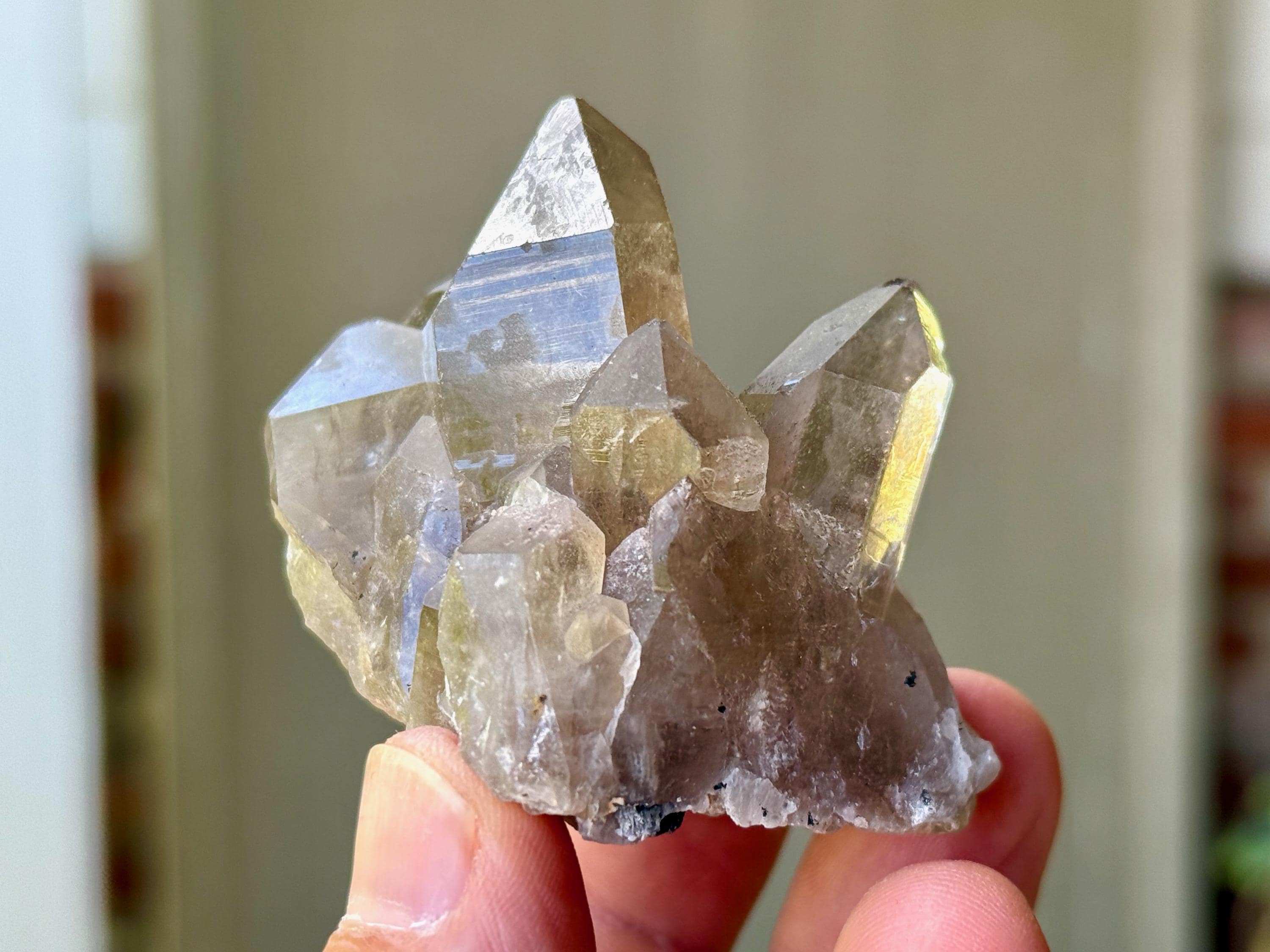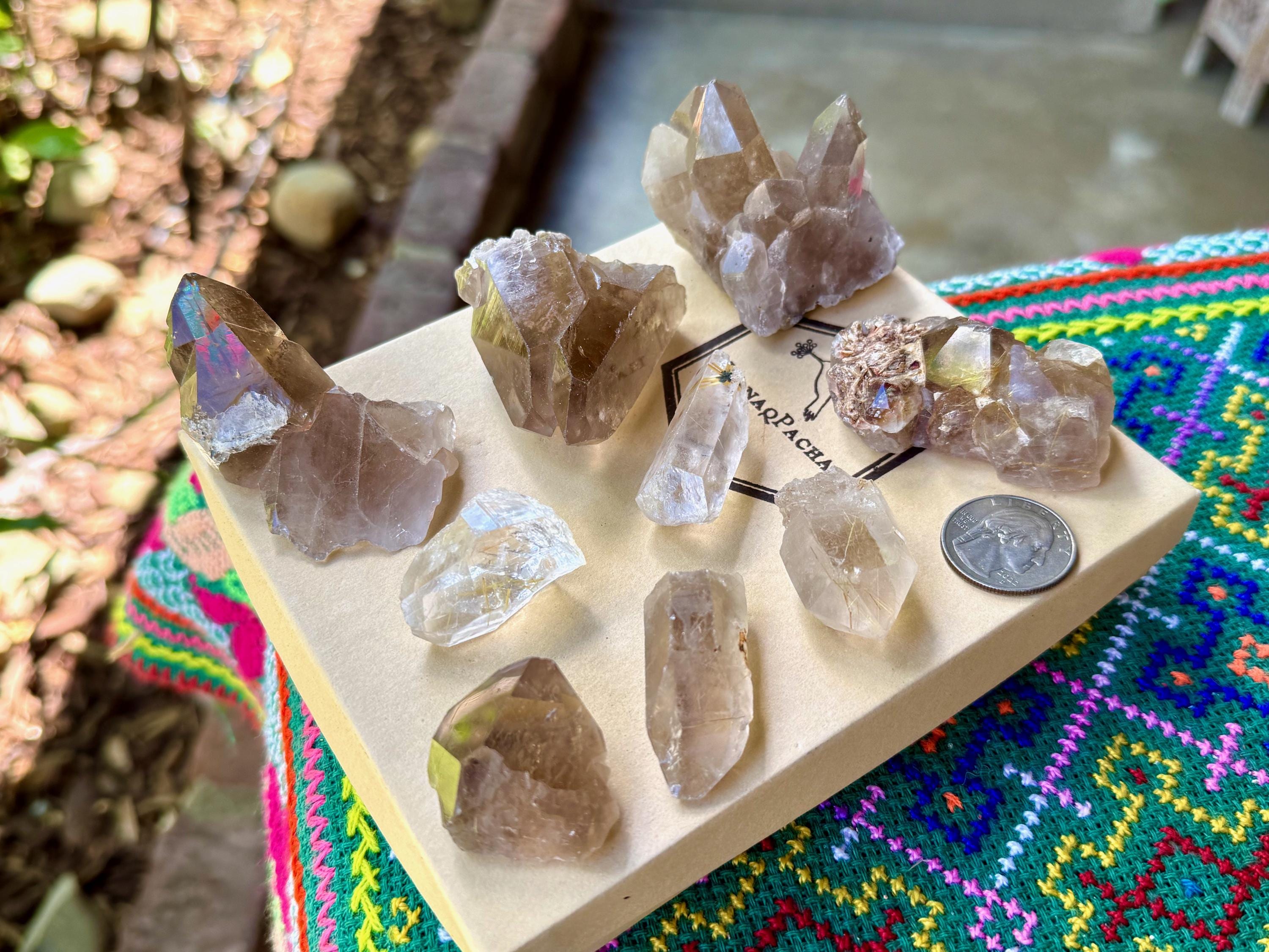 Unique formations, wonderful clarity and brilliant luster to these Quartz crystals with inclusions of Golden Rutile within. These crystals possess various hues of smokiness and clarity, and each possesses some Golden Rutile, from mild to more ample. In the natural sunlight, these inclusions become much more visible with lots of sparkle.