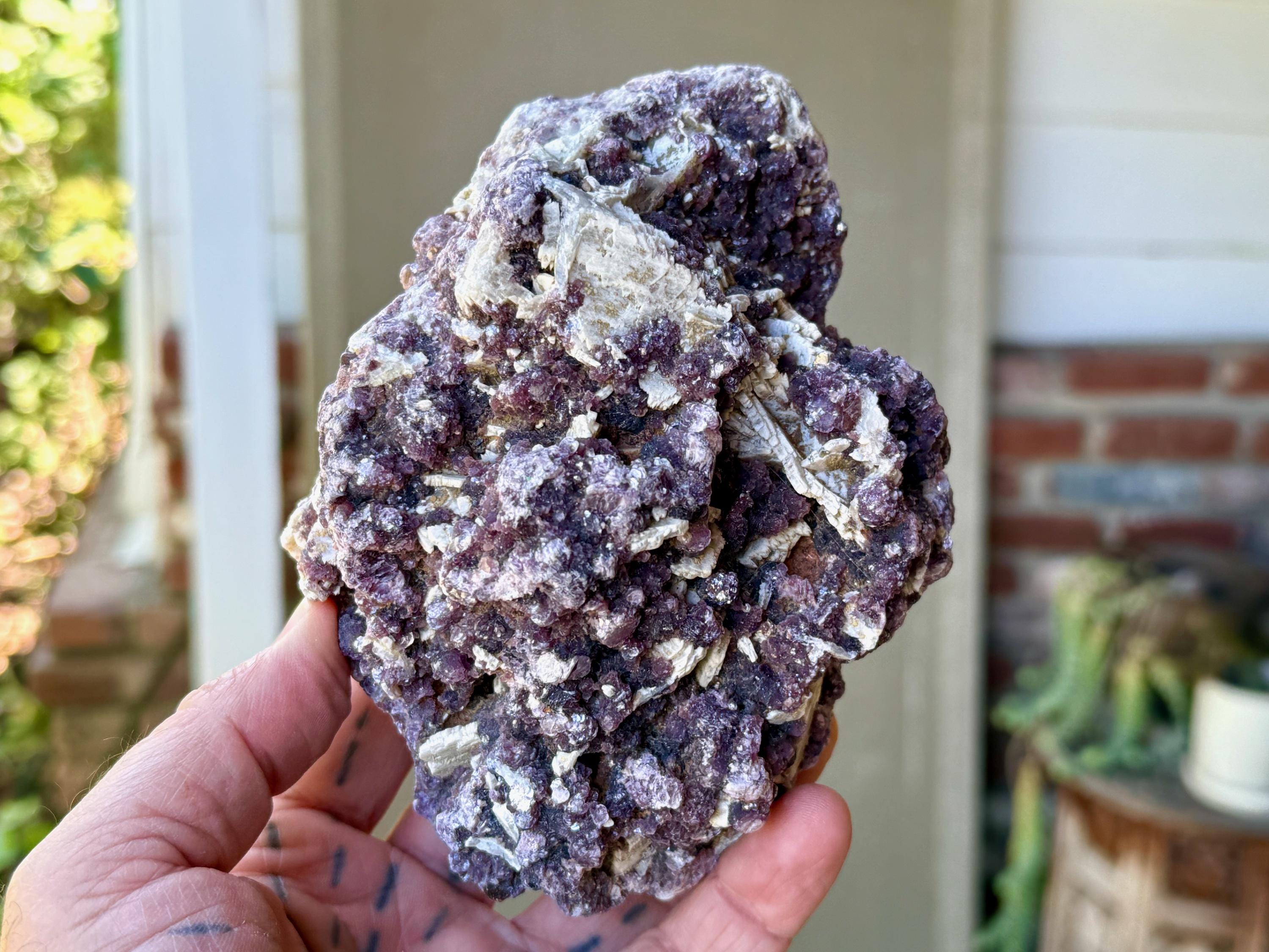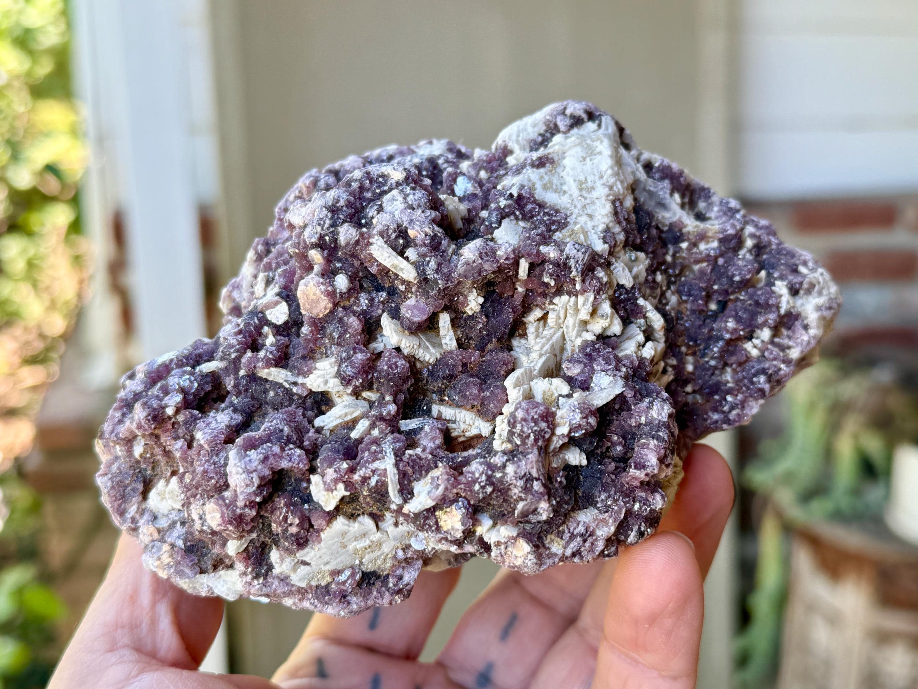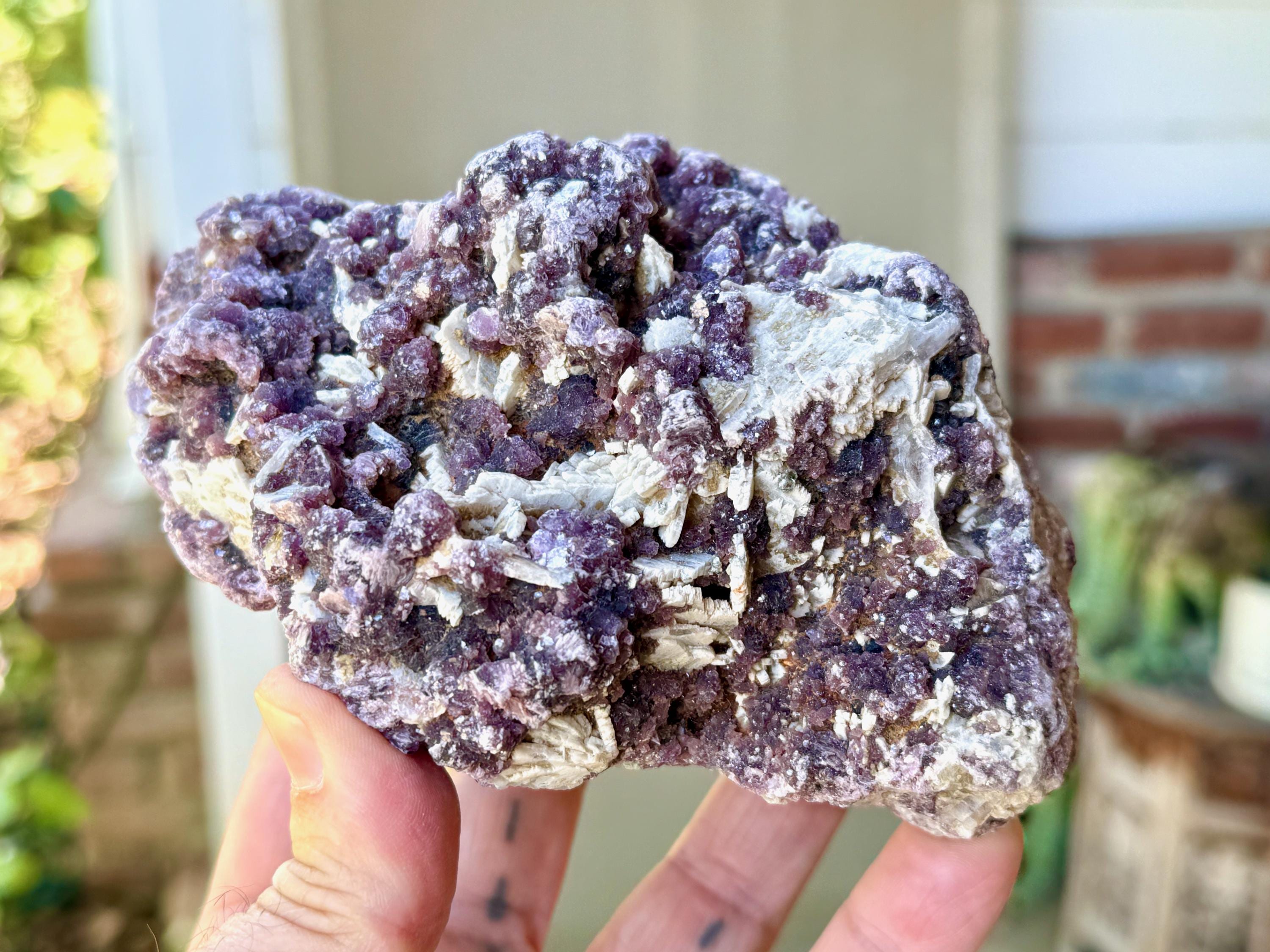 A magnificent Purple Lepidolite crystal, embedded with an array of white Orthoclase Feldspar inclusions! This is an aesthetically and energetically beautiful piece with vibrant colors and naturally flat base that allows it to sit nicely for display.