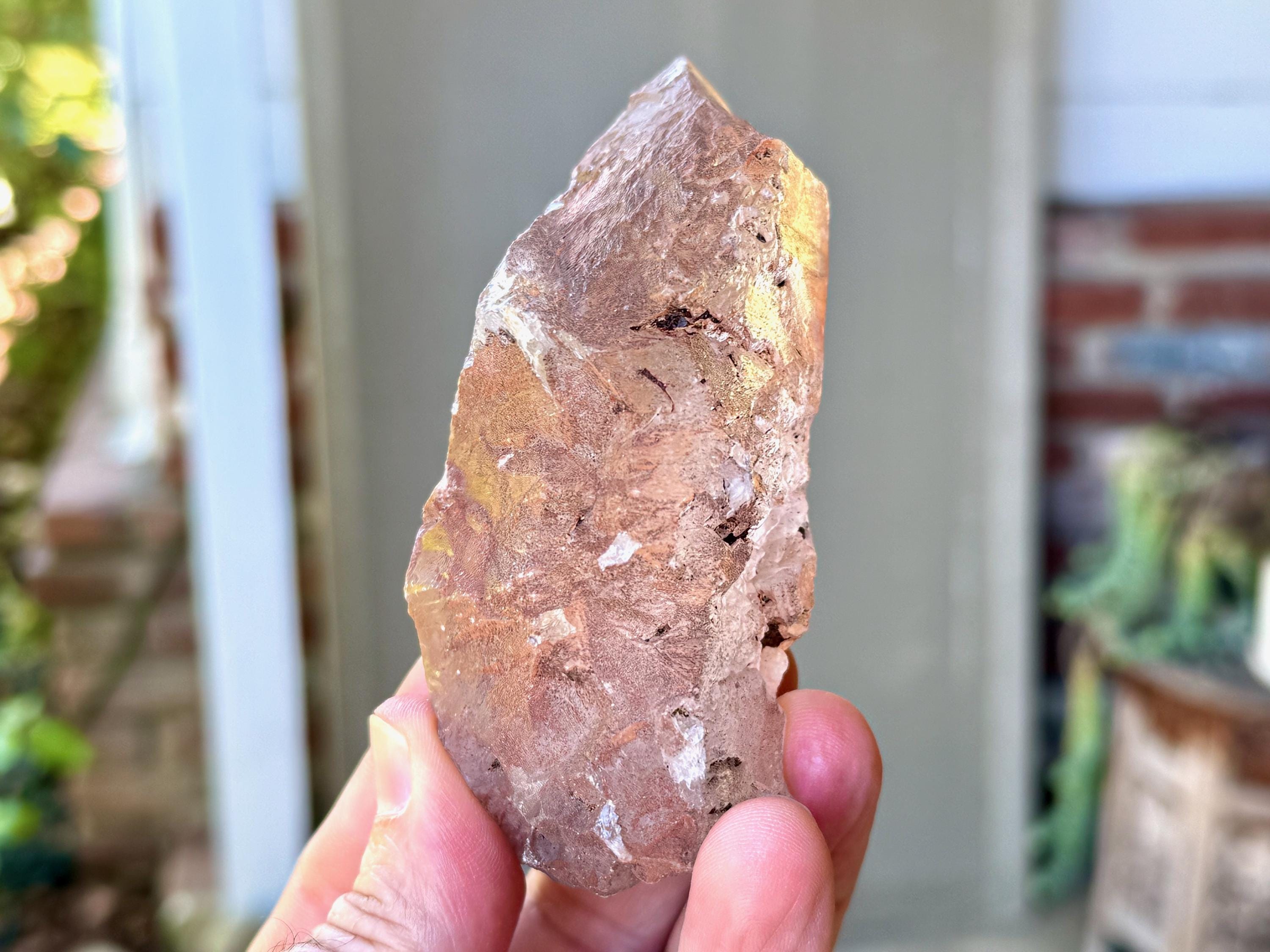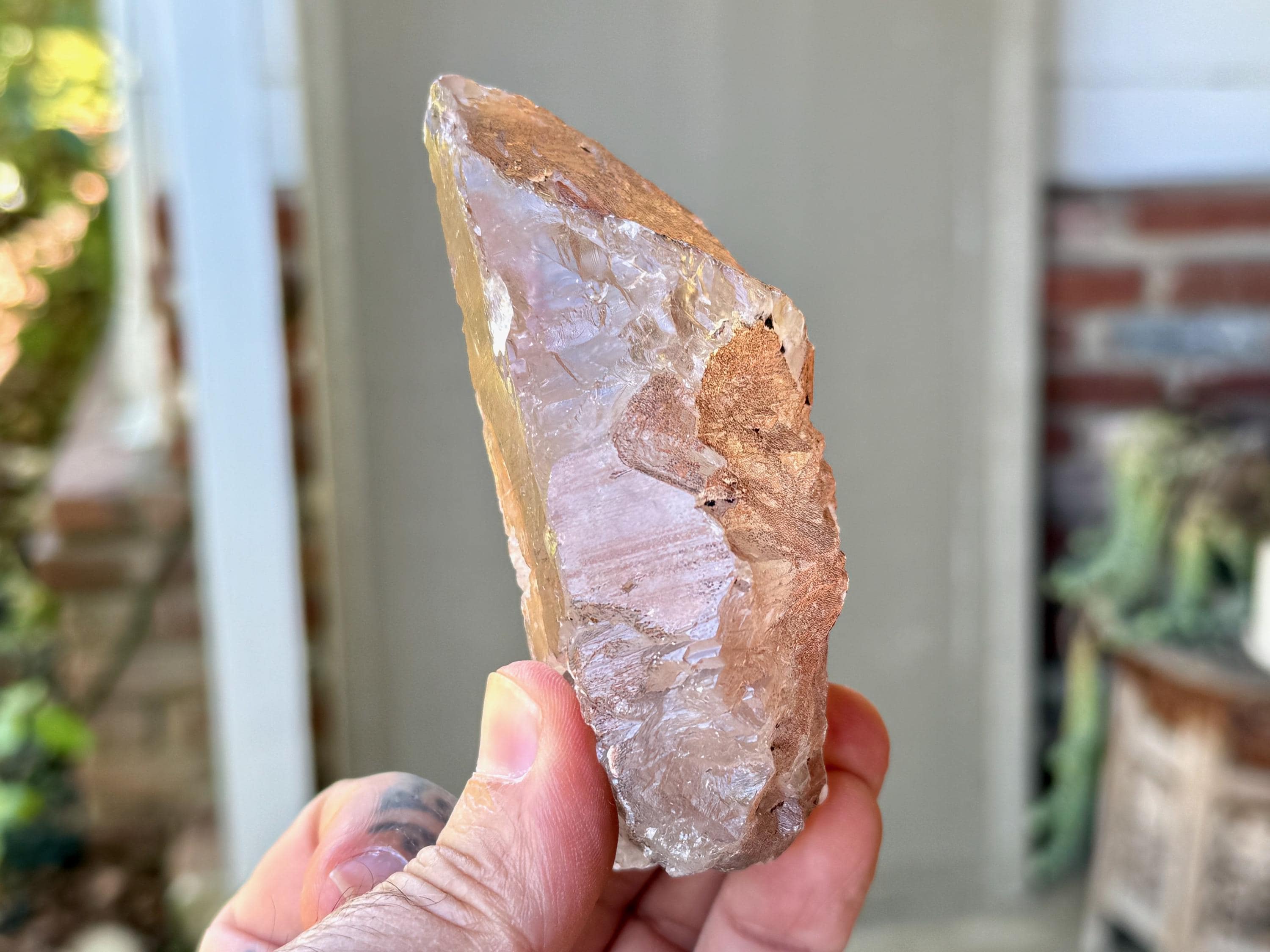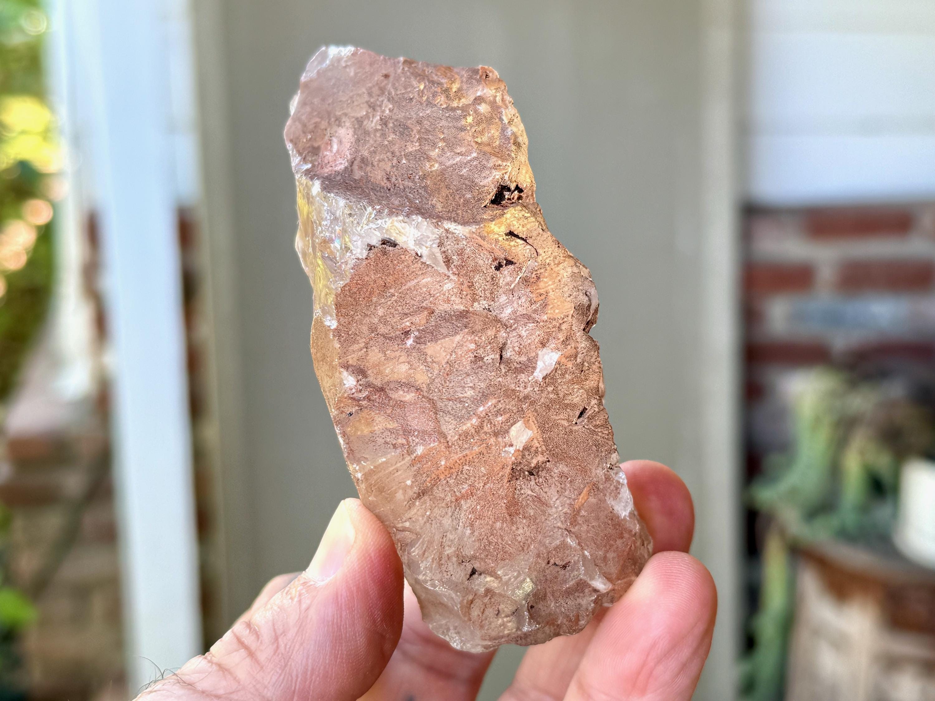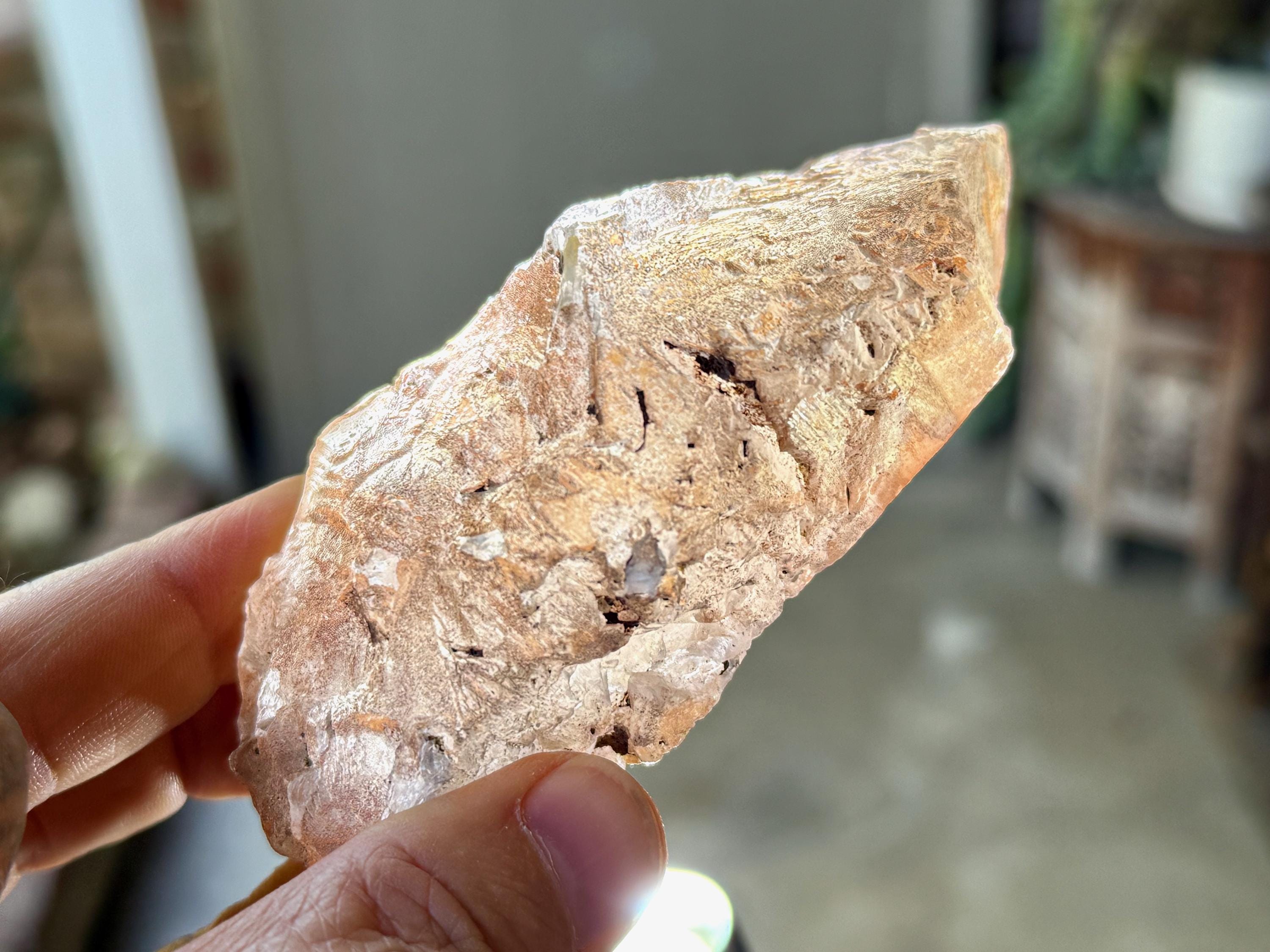 This natural Ancient Sage Tangerine Dissolution Quartz comes from an old 2018 find in Para State, Brazil. The pinkish-orange hue comes from Hematite inclusion.