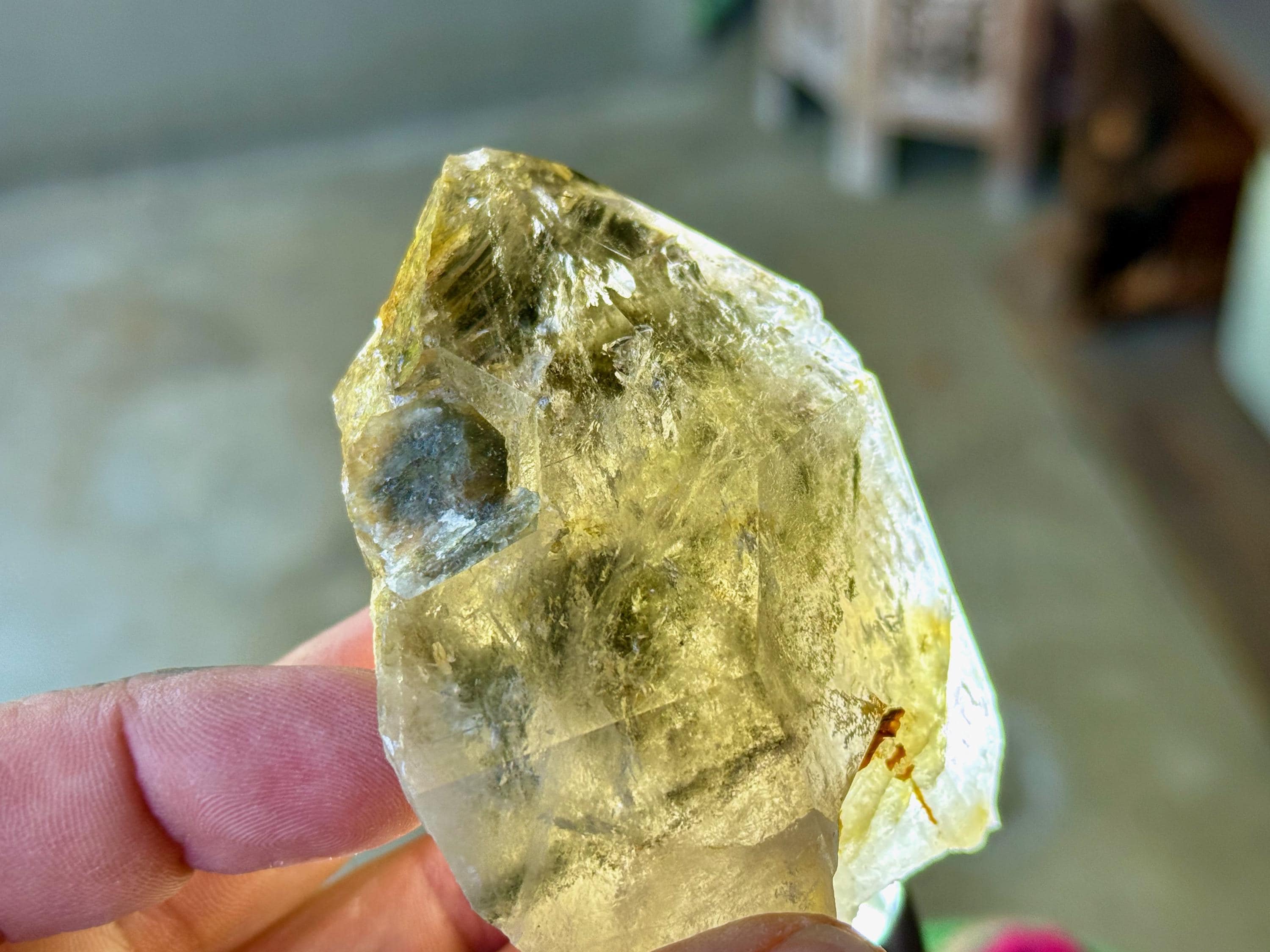 An array of magnificent, mossy inclusions within this lustrous Lodolite Quartz! These inclusions look almost black, but they are actually very dark Green Chlorite, mixed with some golden yellow Hematite. The main facet is broad and water-clear so we can really see these garden inclusions very well. When backlit, as in Photos 6-8, we can see just how brilliantly it lights up.