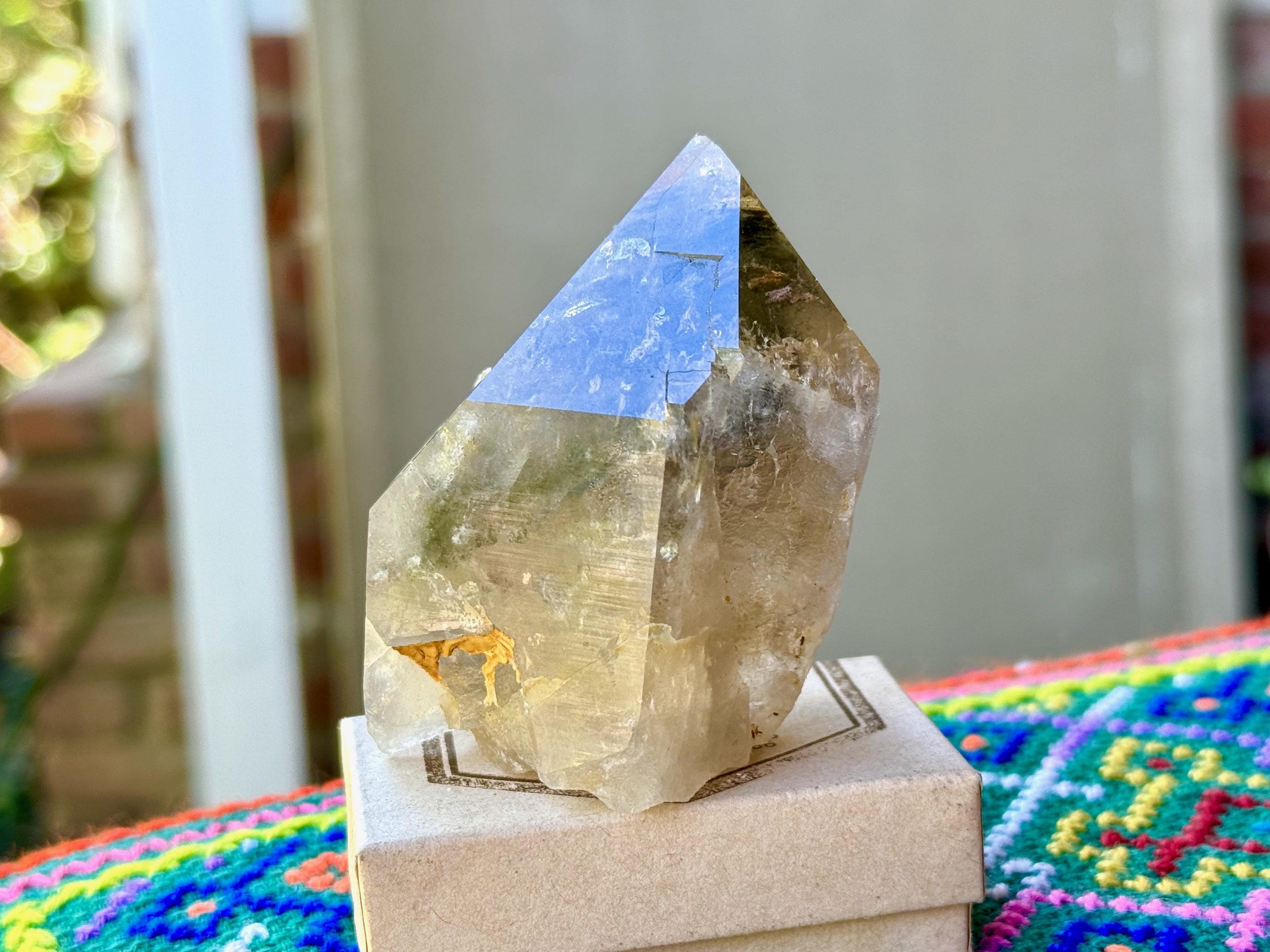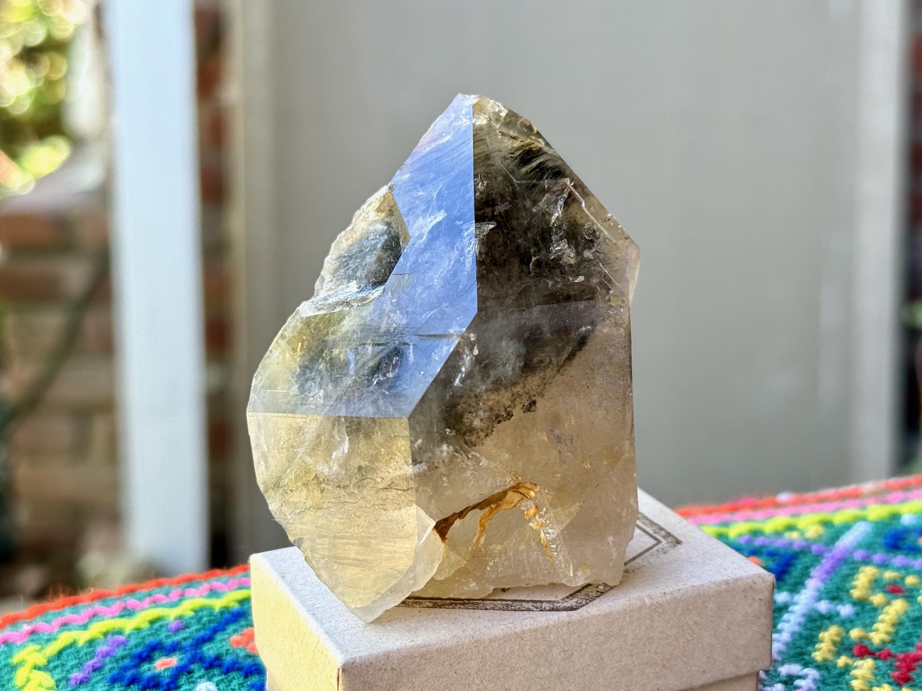On the upper left portion of the main facet you'll notice a deeply imprinted hexagonal "key" (see more on this below). The left side of this piece is a naturally self-healed contact area. This piece sits upright on its own due to its naturally flat base and possesses an excellent termination.