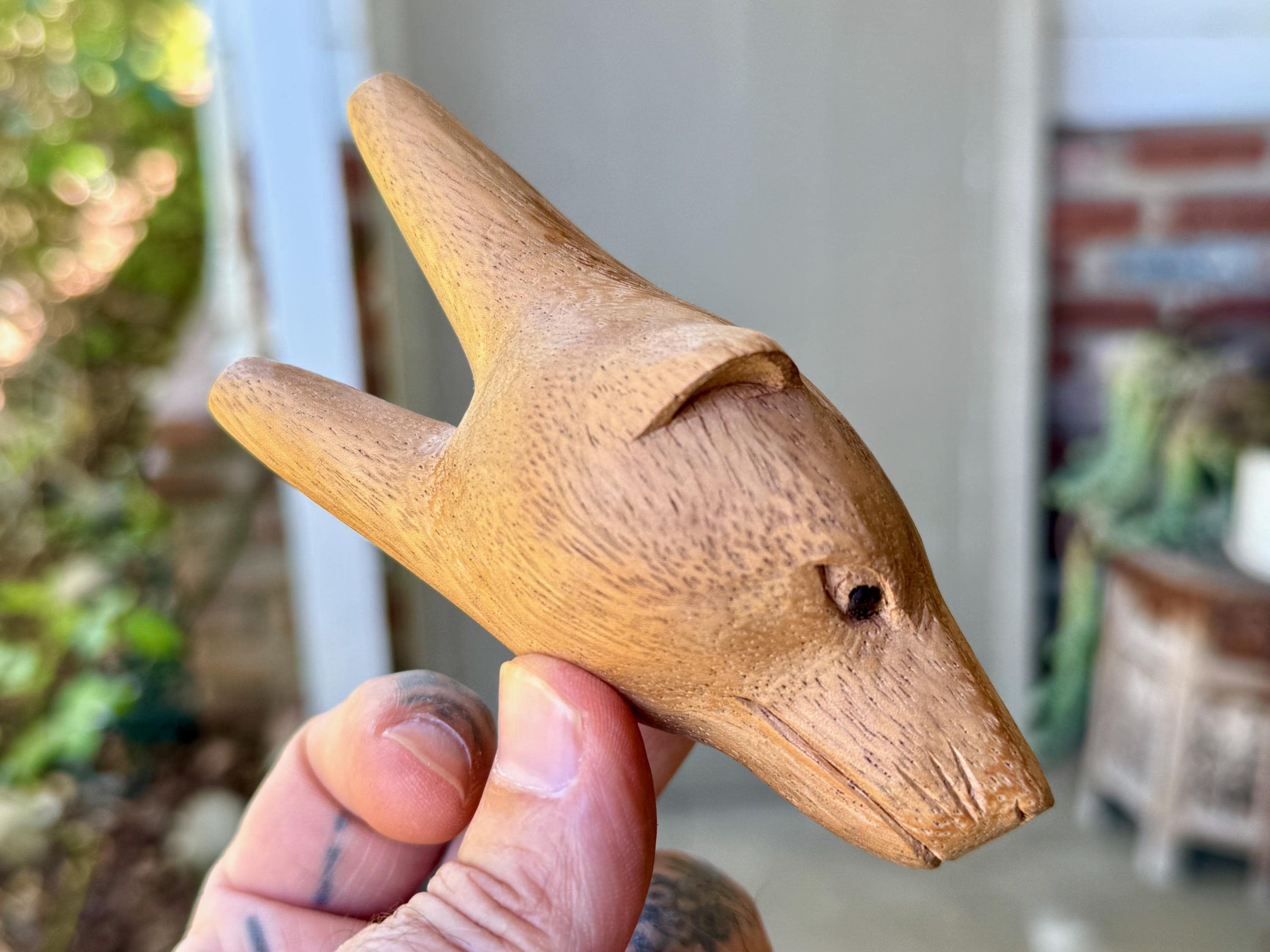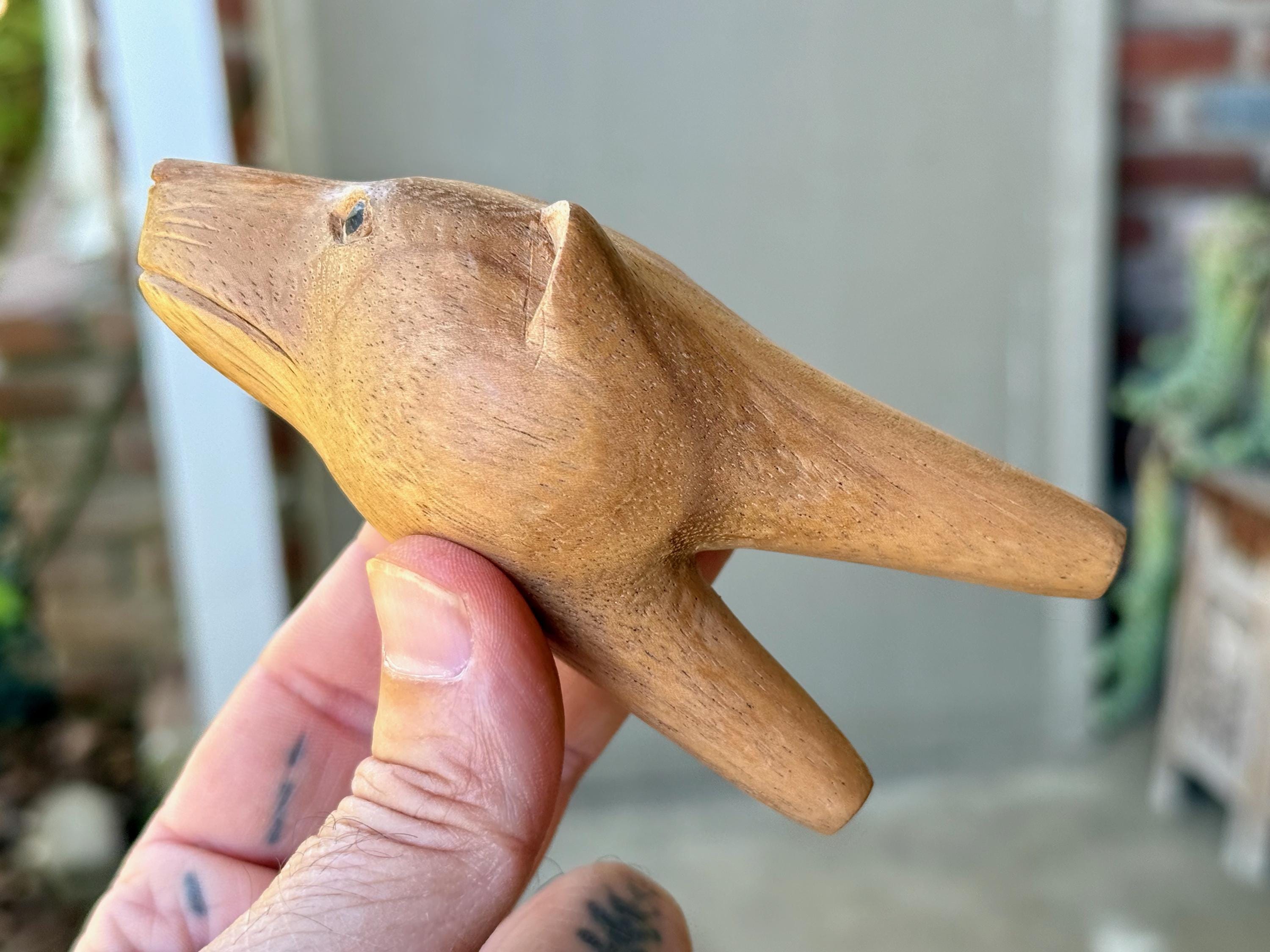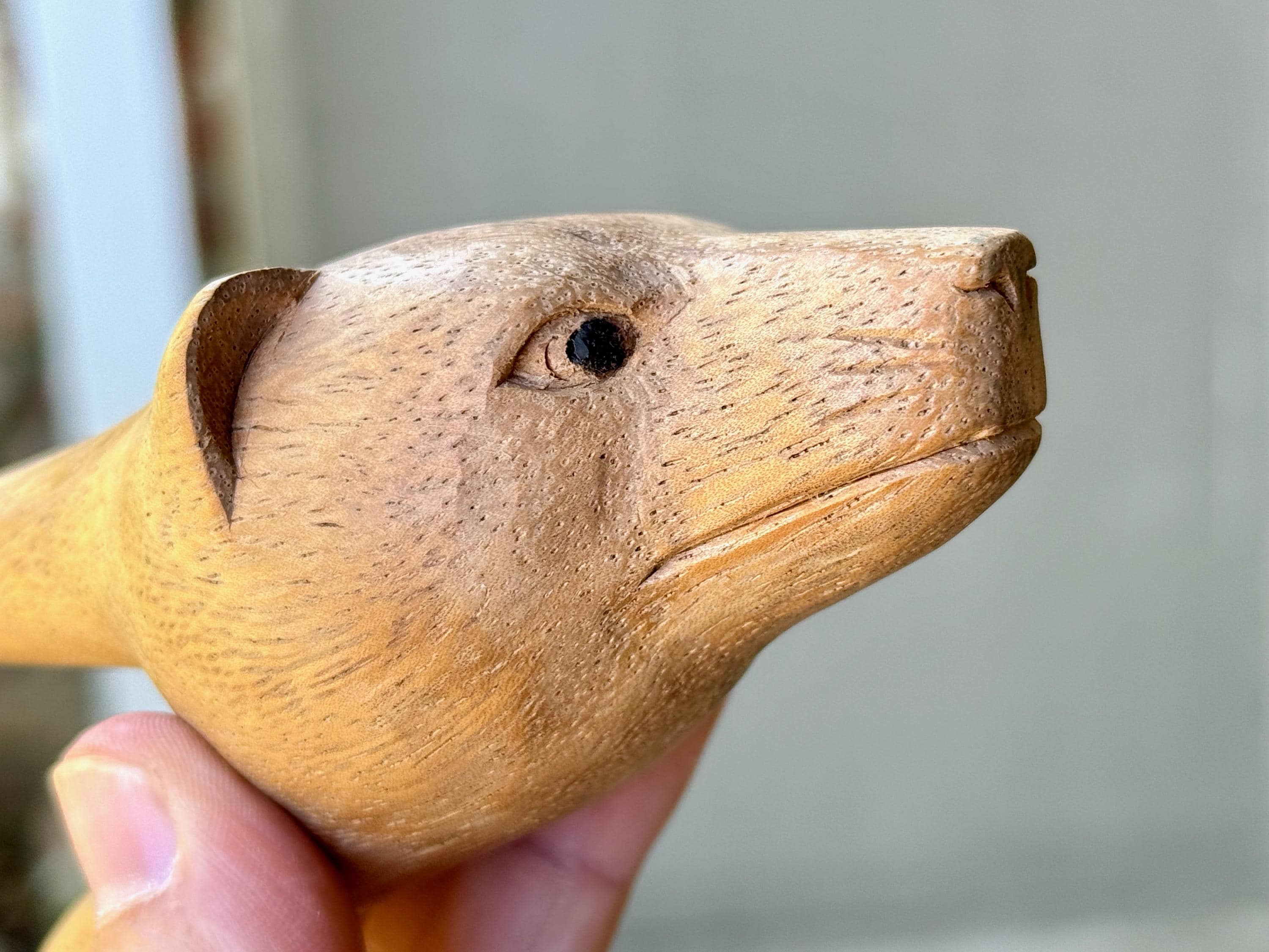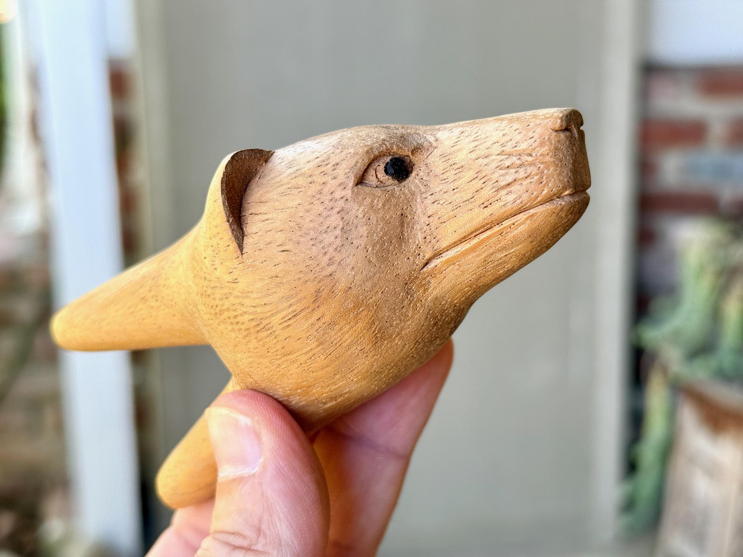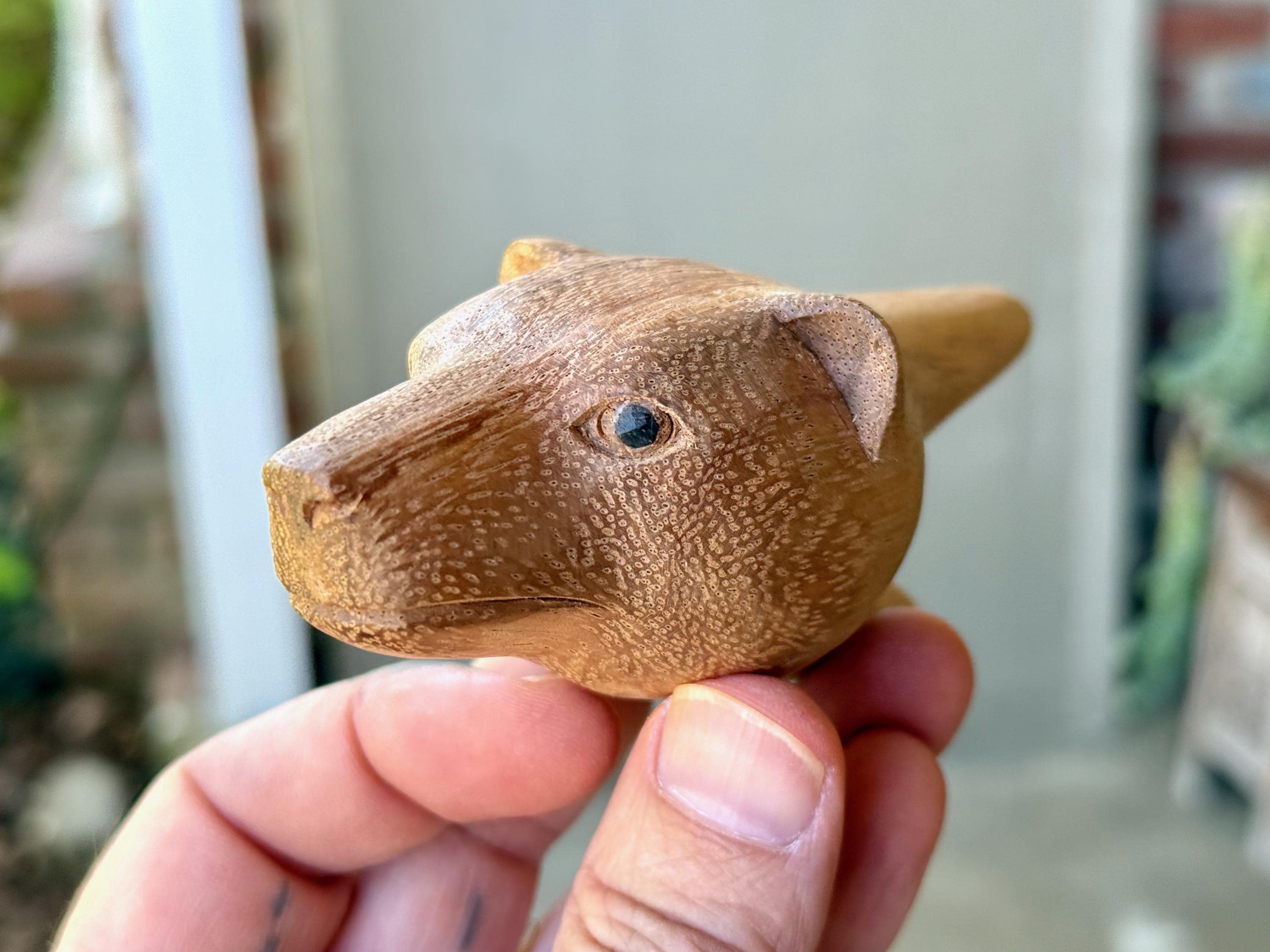 A peaceful demeanor to this handsome Bear Kuripe with his soft features. We love the basic design to this one and the warm hue of the wood. A beautiful and functional work of art!