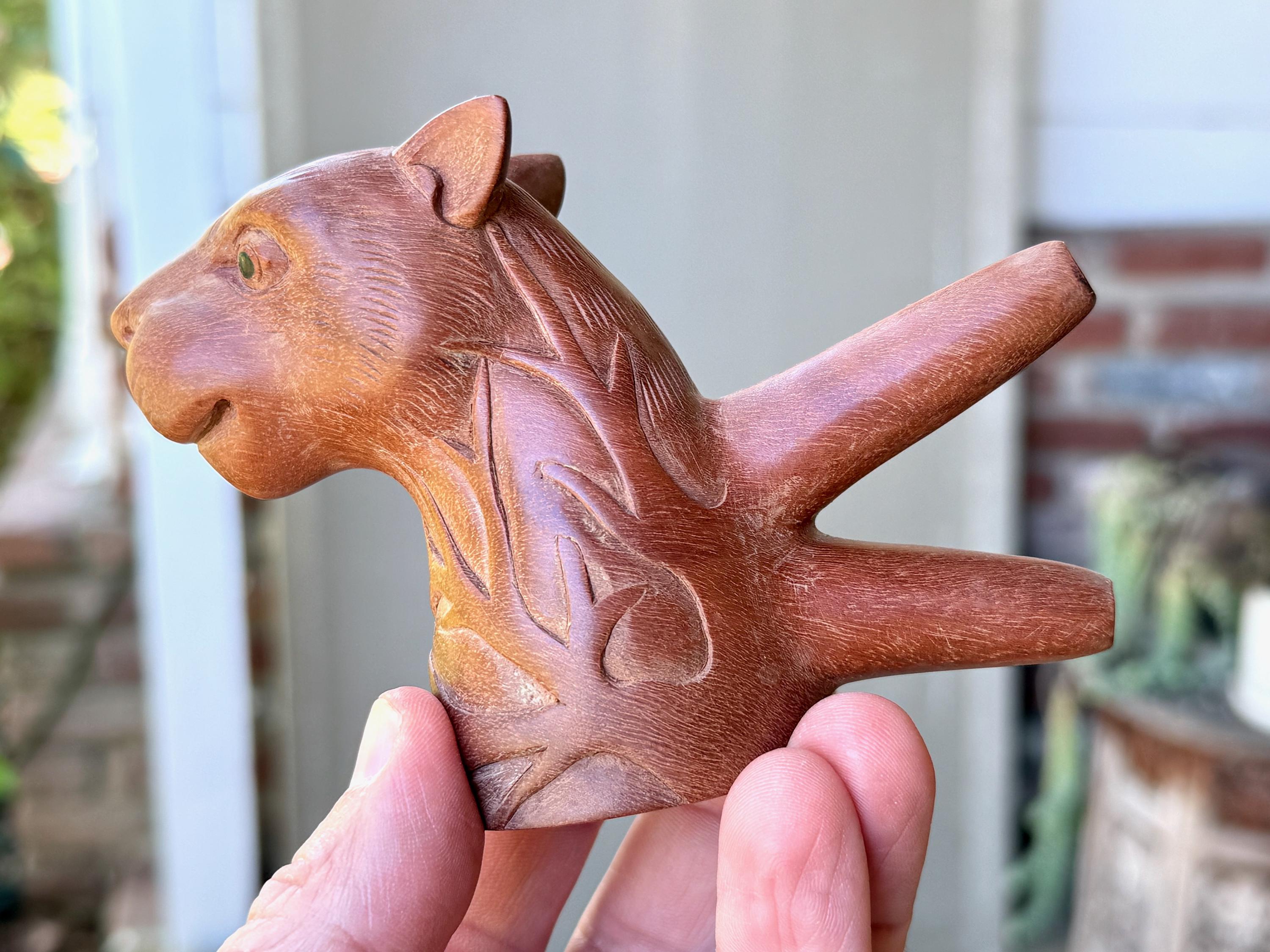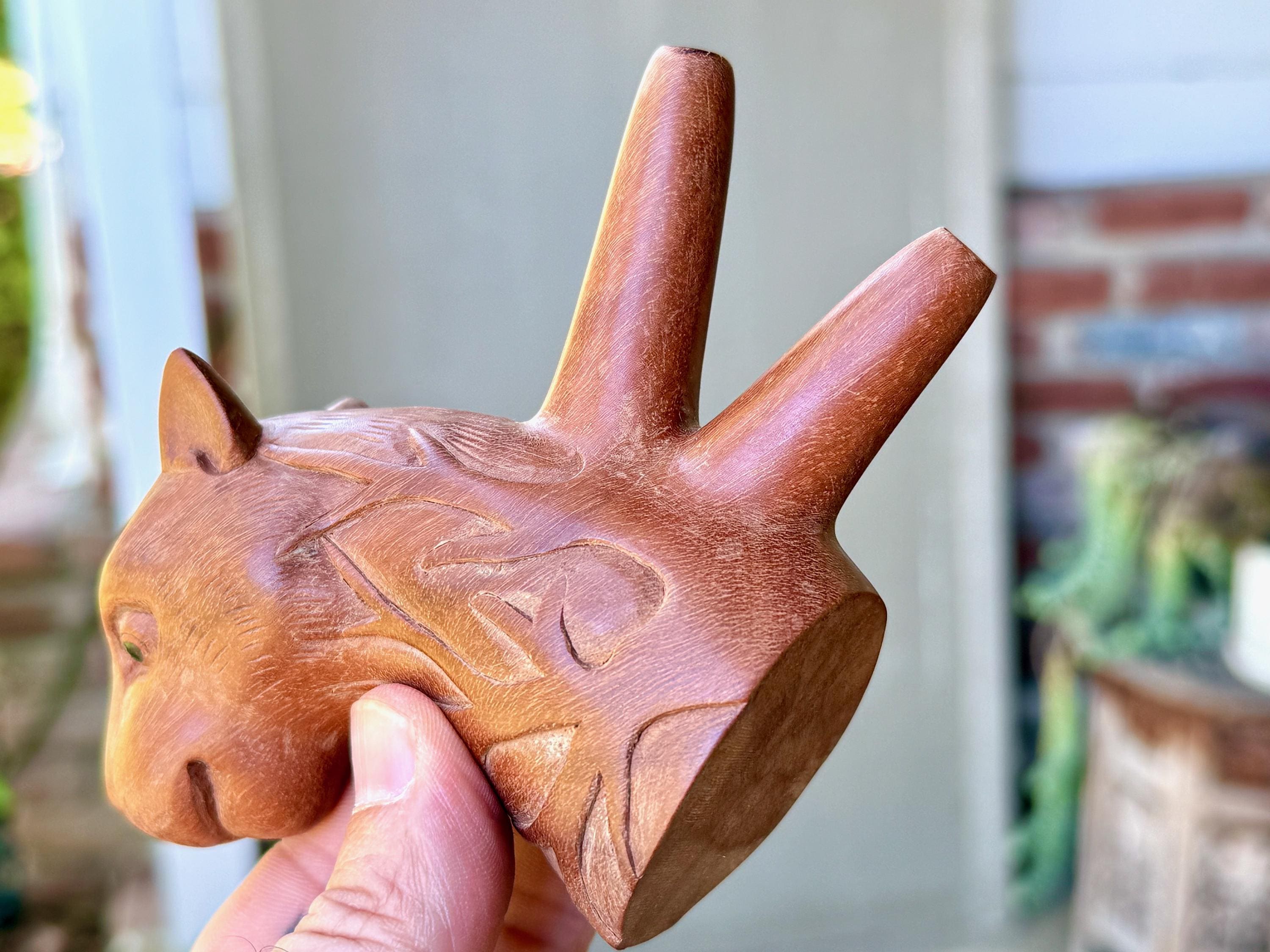 This handsome Jaguar Kuripe — for self-administering hapé — was hand carved from solid, natural Sawo Wood.