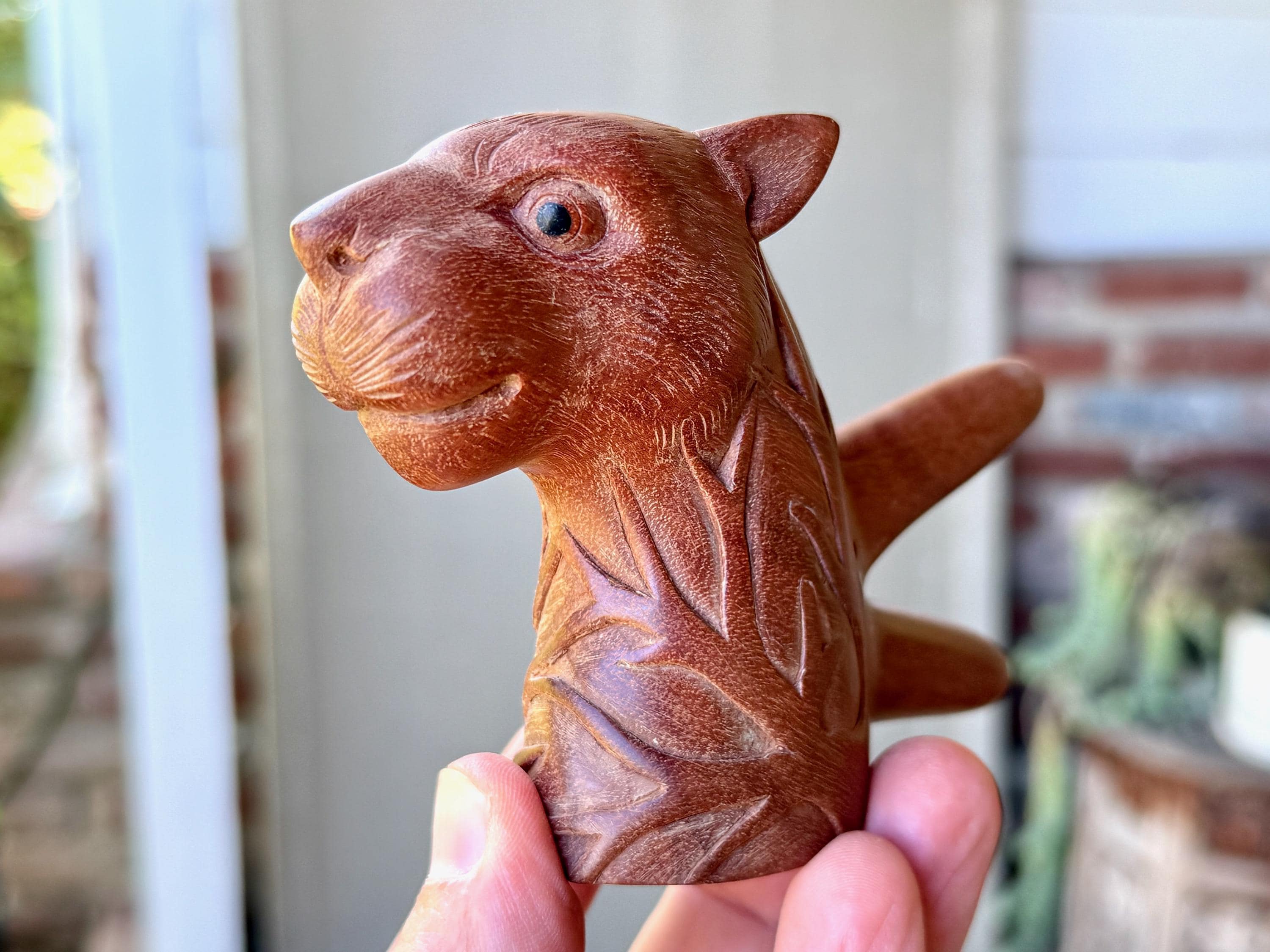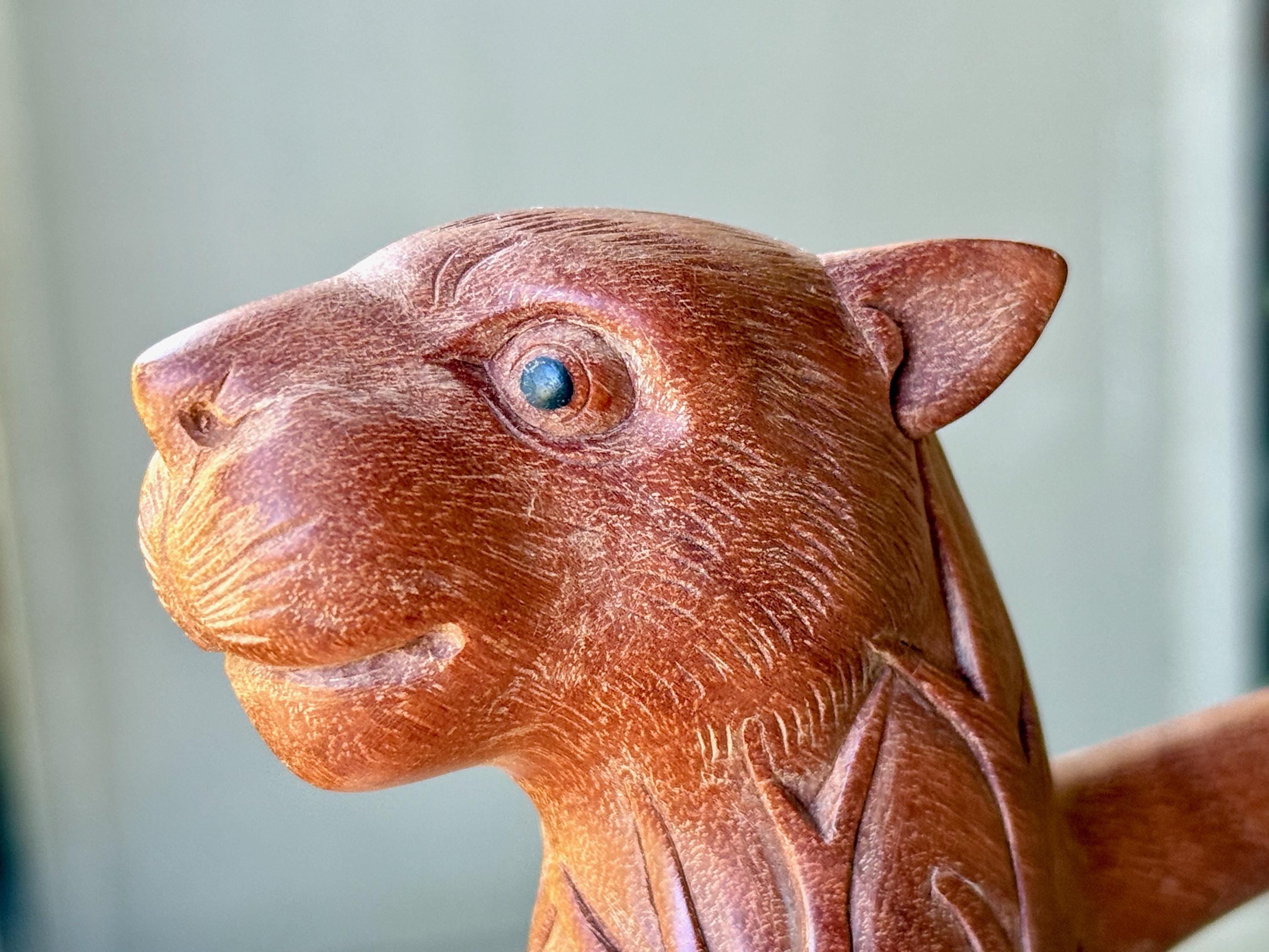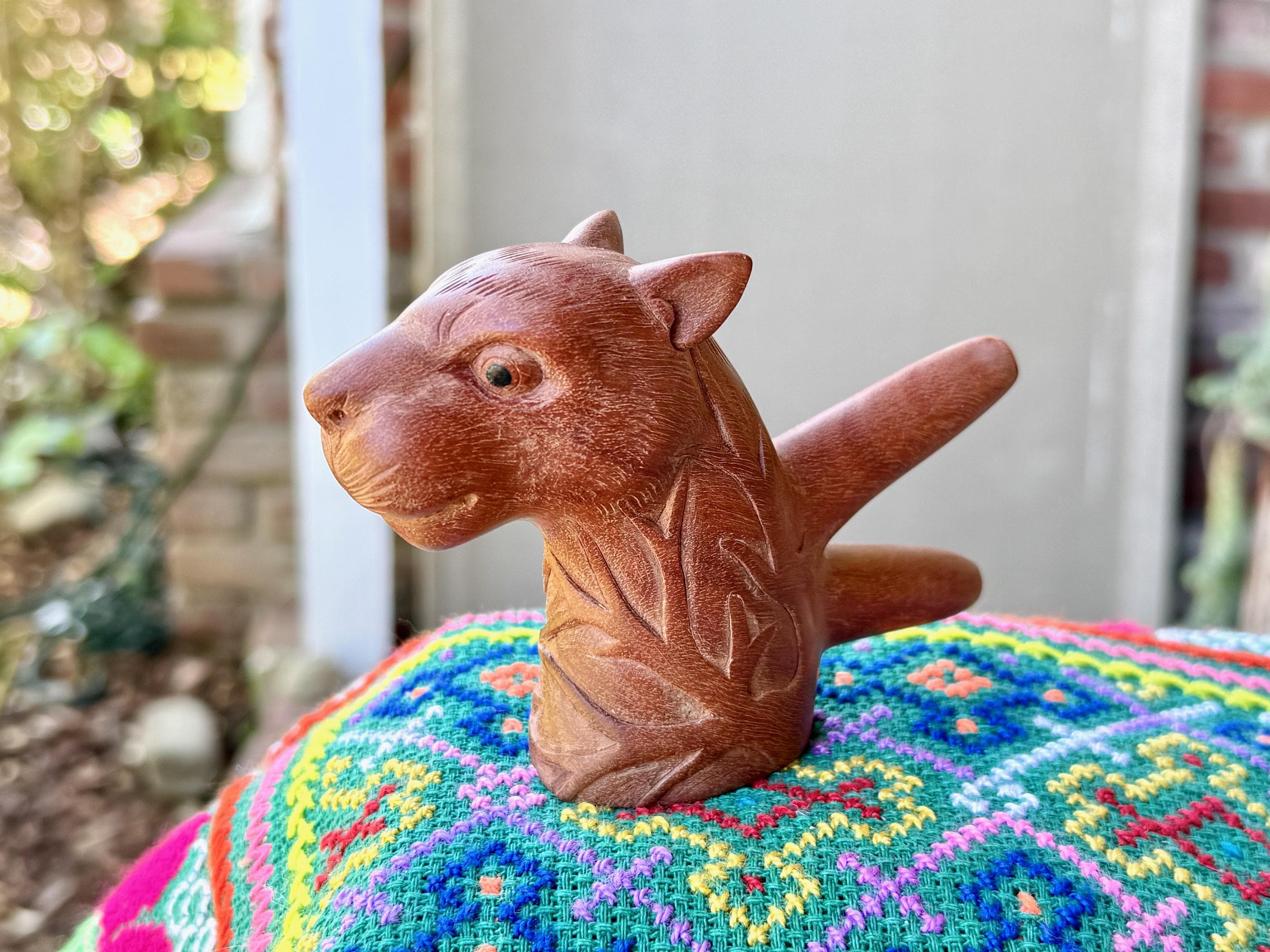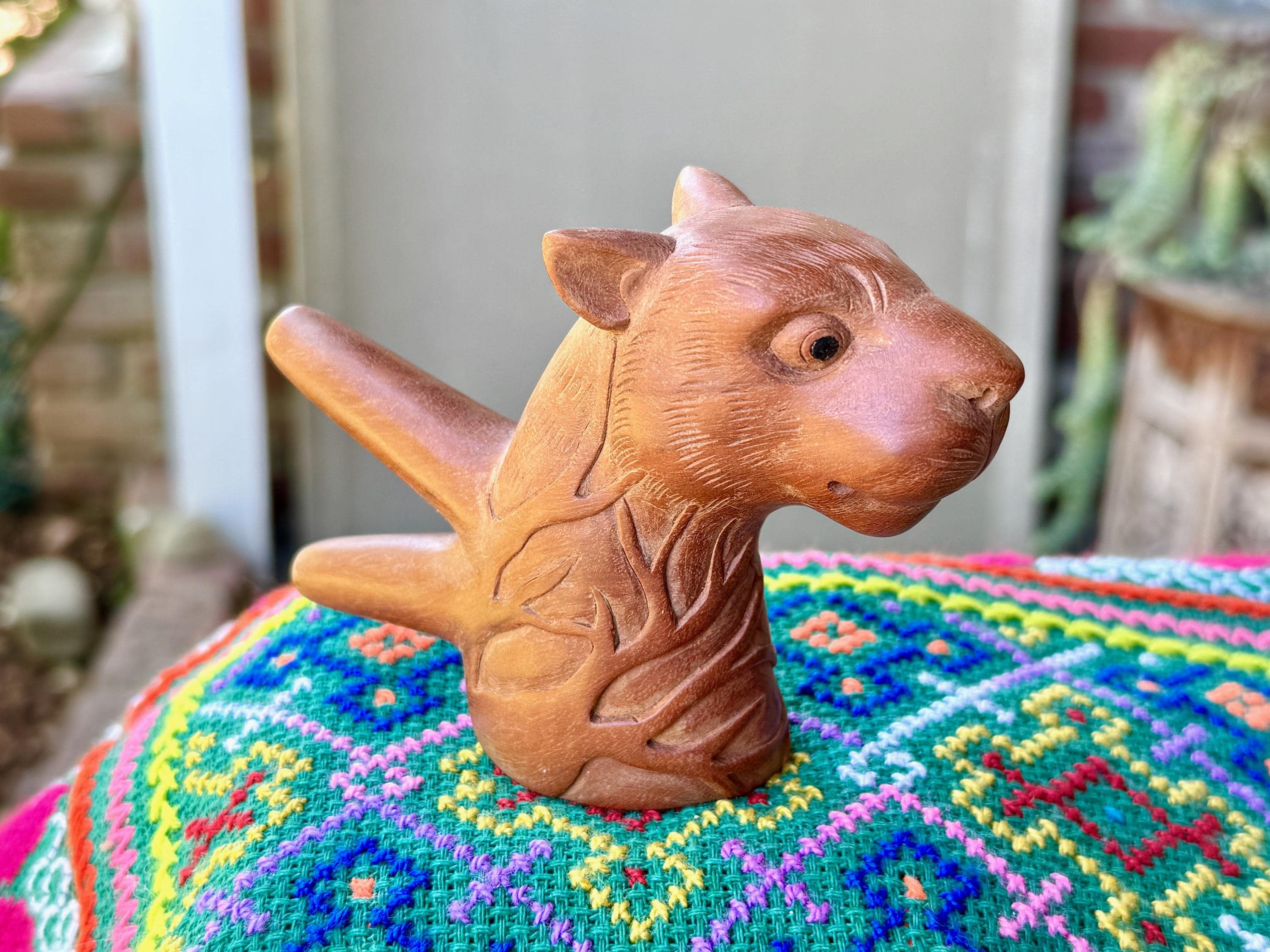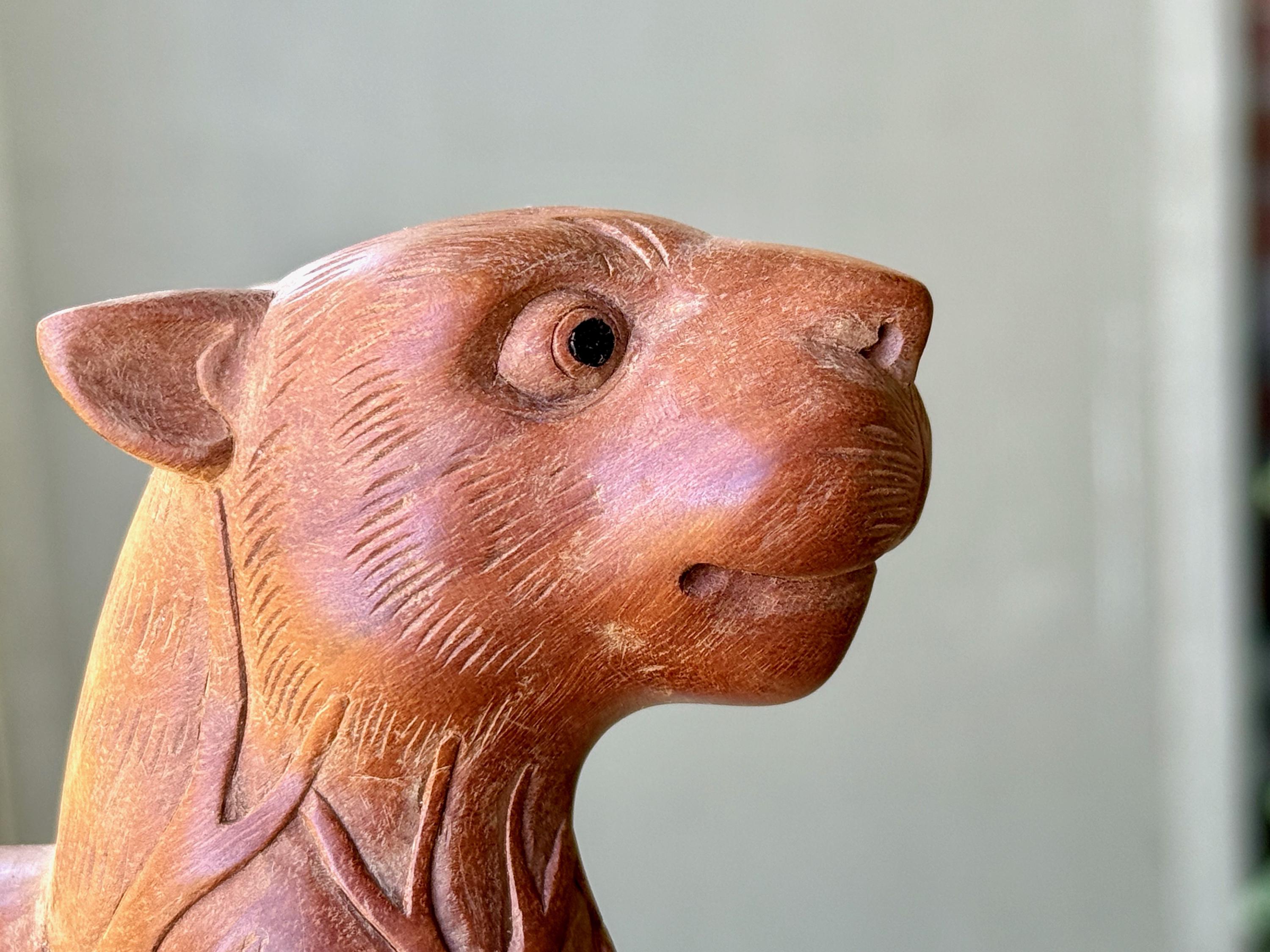 A masterful work of art, this powerful Jaguar (or Panther, Puma...) is beautifully carved from a single block of natural, reddish-brown Sawo Wood. Its features are so wonderfully articulated and expressive. The naturally flat base also allows this piece to sit nicely for display or on any manta/altar.