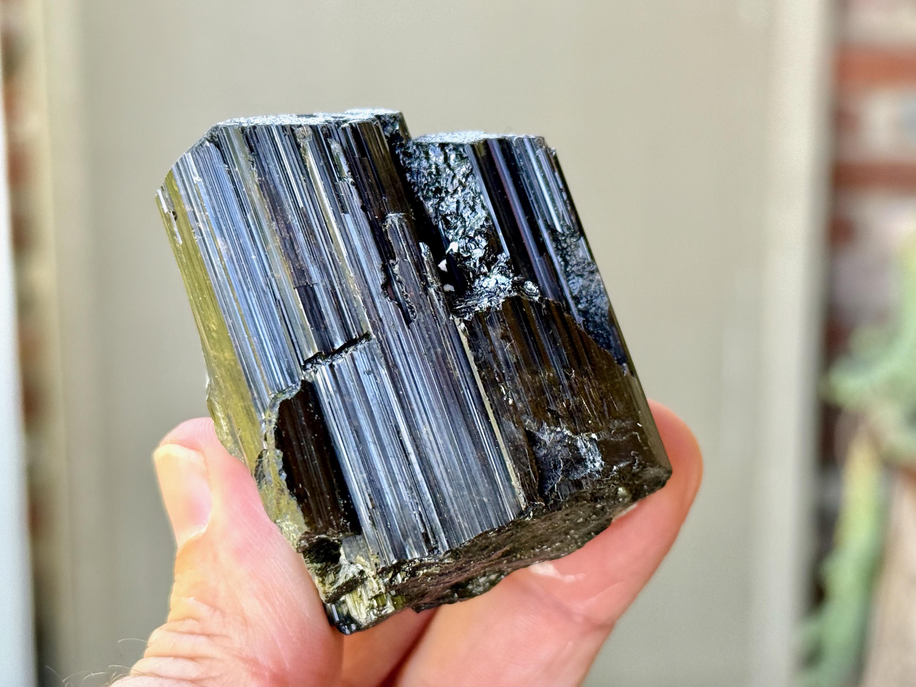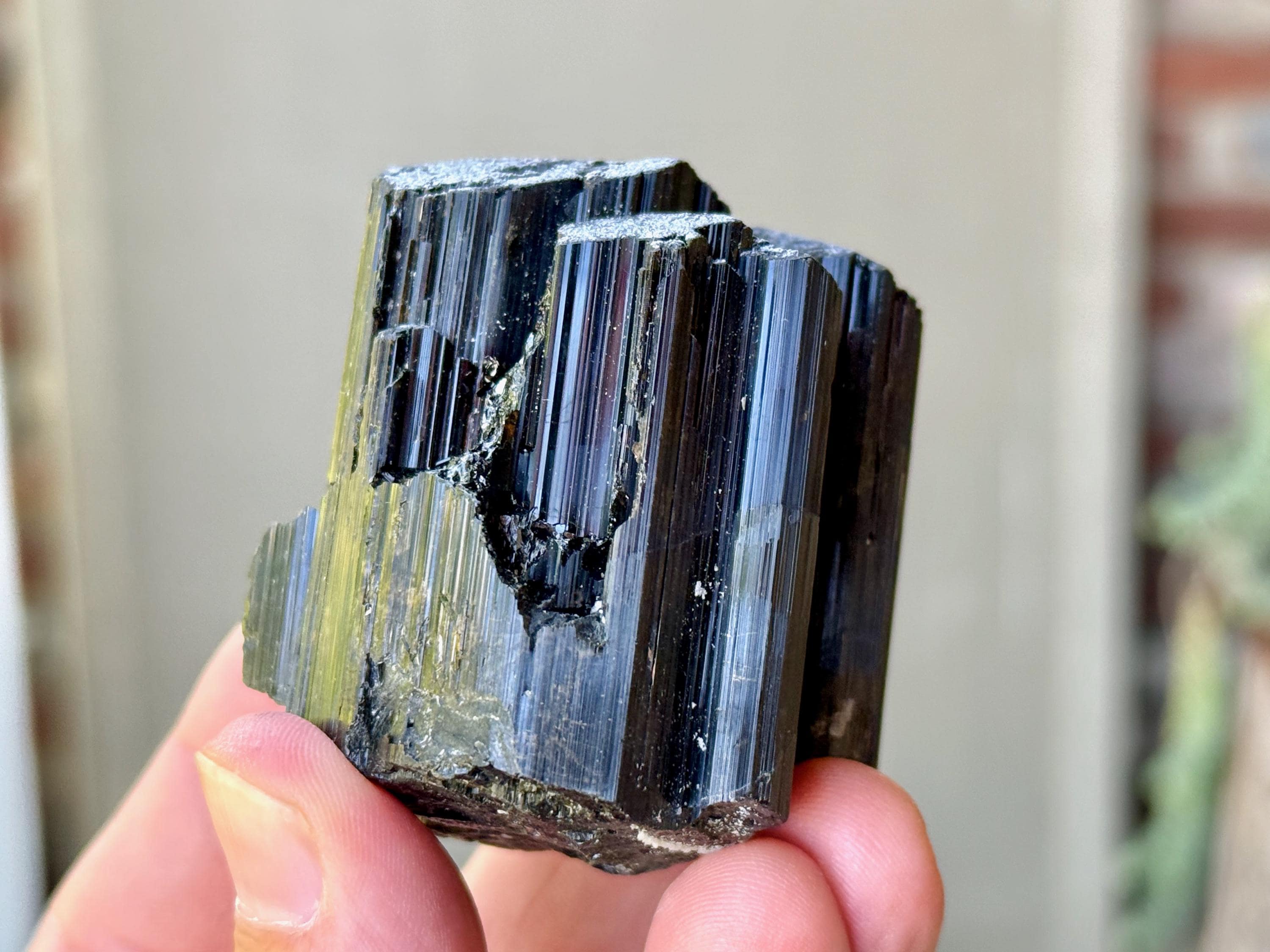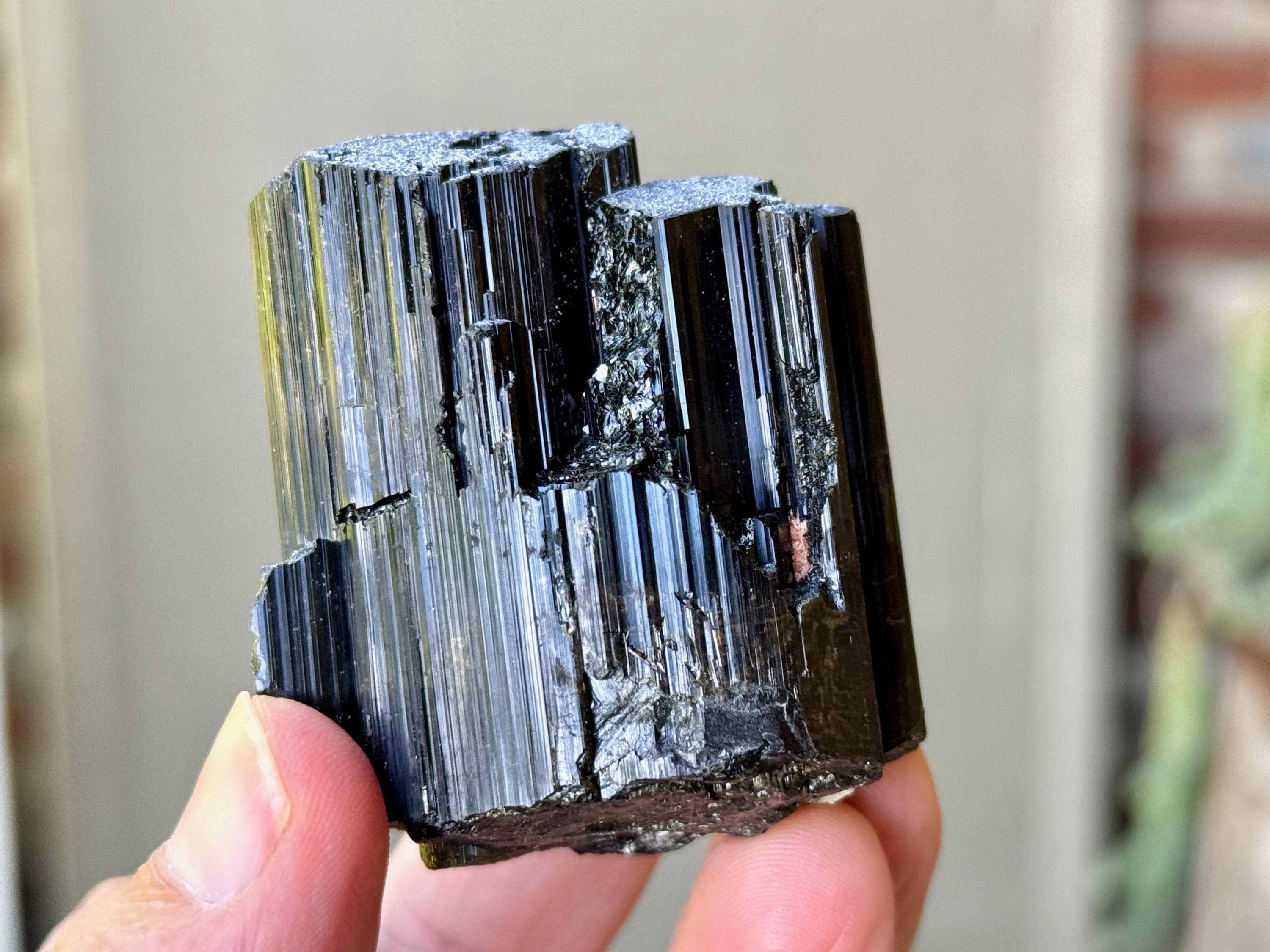 At first glance, it appears to simply be a very high-grade Black Tourmaline with beautifully formed vertical ridges and an excellent termination. But a closer look reveals that this crystal has an area of mildly iridescent Green Tourmaline at the base in back. And when light is applied at the right angle, you may even see some hints of root beer brown Dravite on the exterior as well (Photo 4). A wonderful and powerful piece from this rare find!