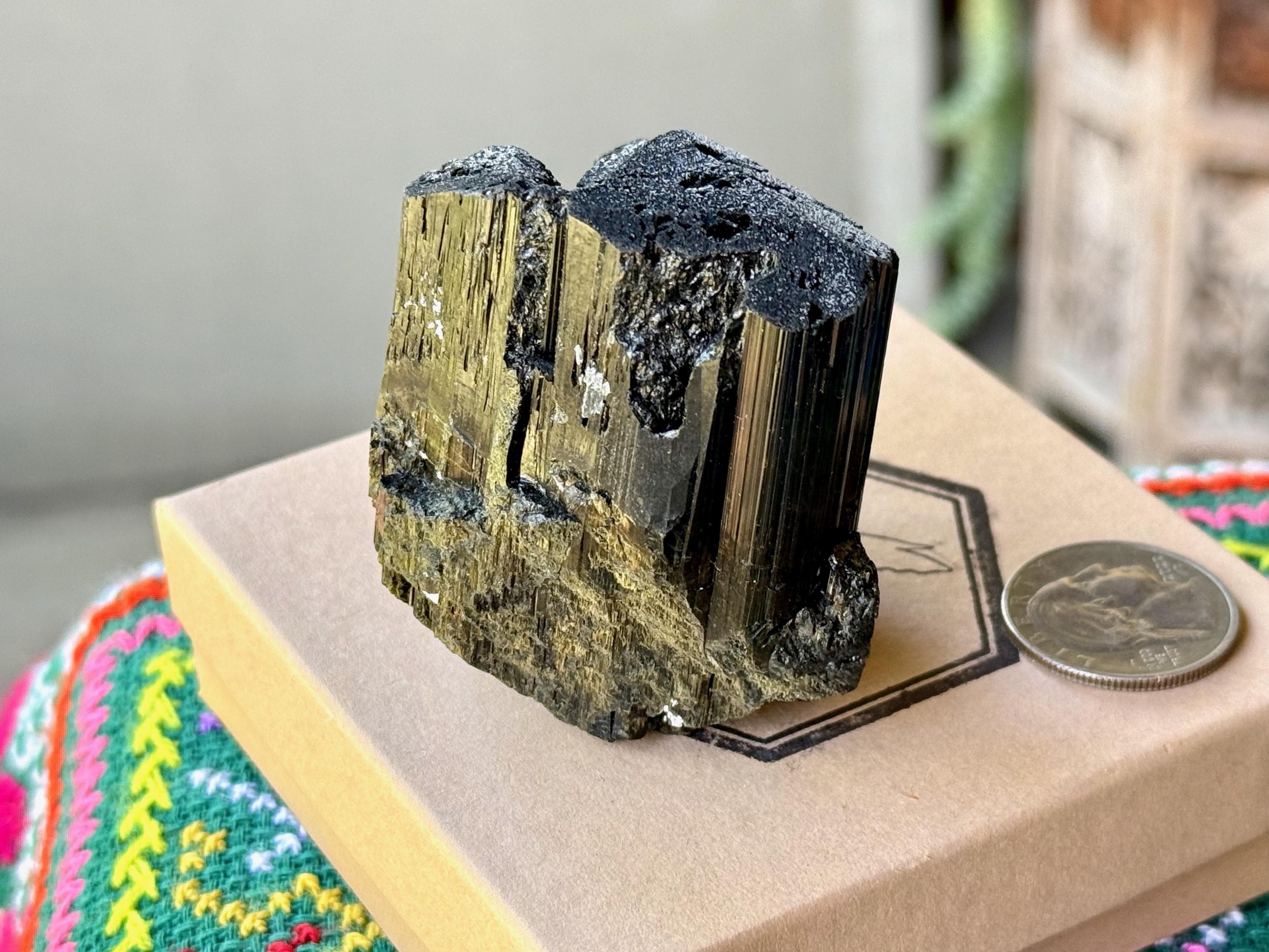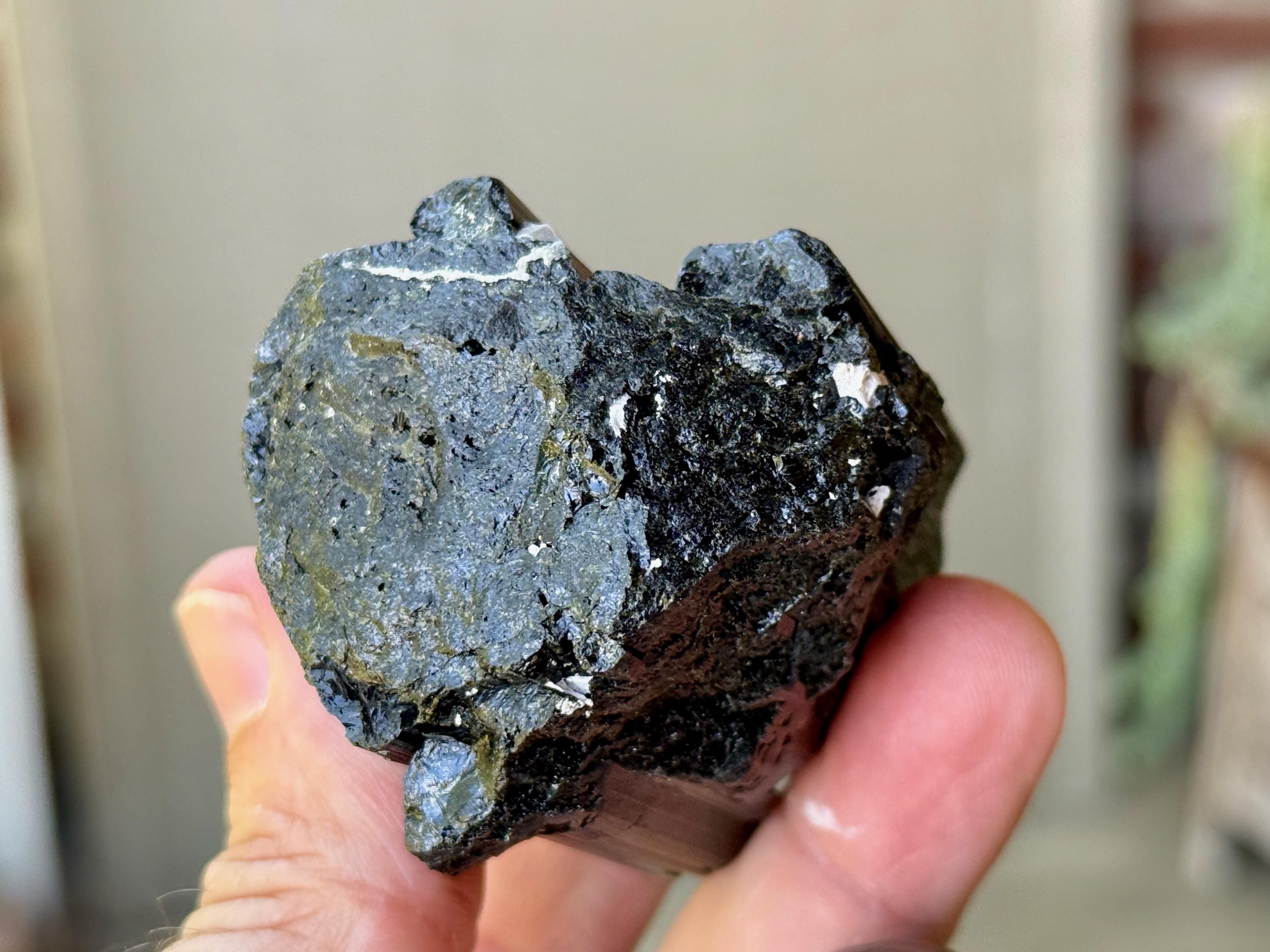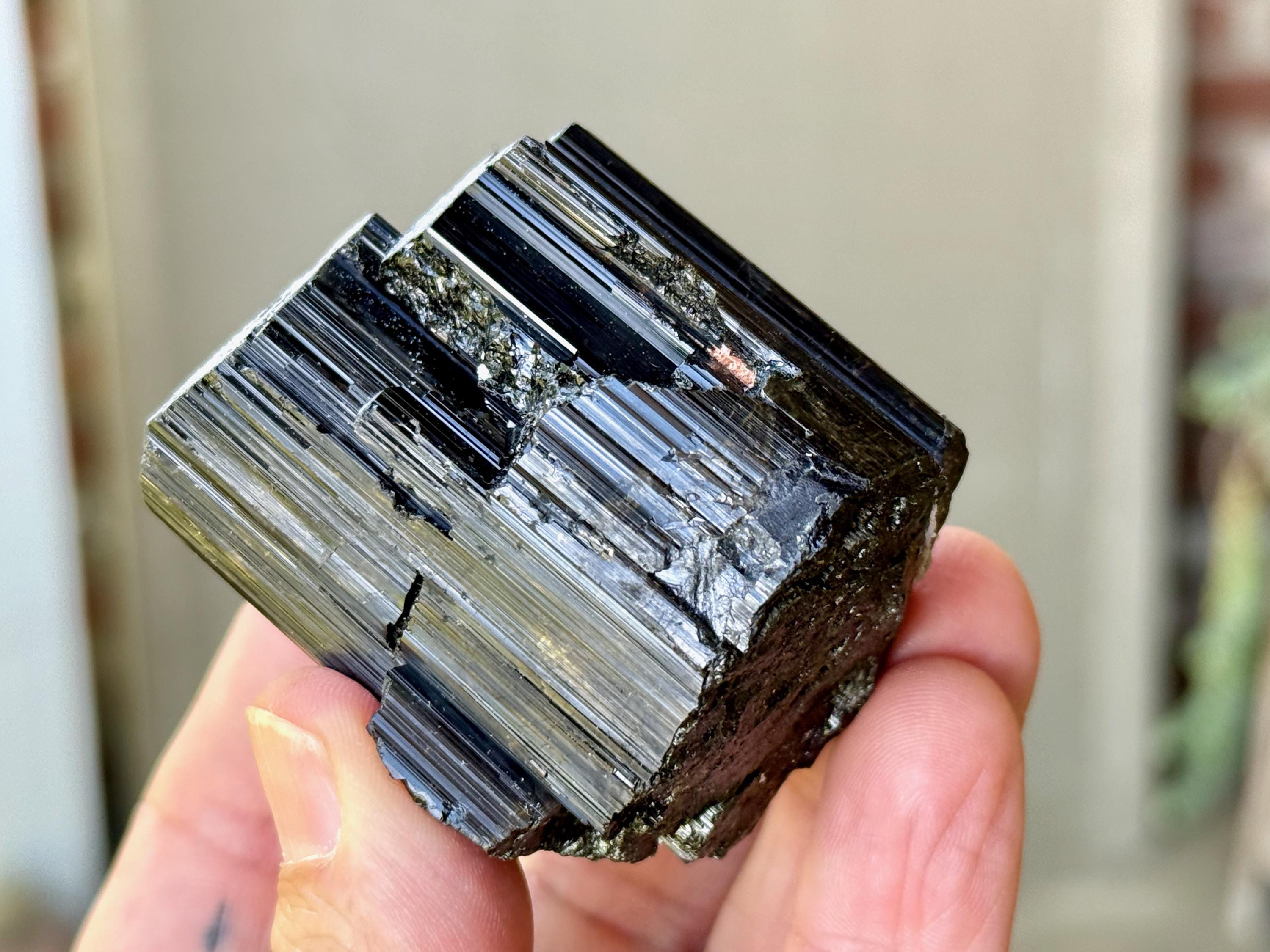 At first glance, it appears to simply be a very high-grade Black Tourmaline with beautifully formed vertical ridges and an excellent termination. But a closer look reveals that this crystal has an area of mildly iridescent Green Tourmaline at the base in back. And when light is applied at the right angle, you may even see some hints of root beer brown Dravite on the exterior as well (Photo 4). A wonderful and powerful piece from this rare find!