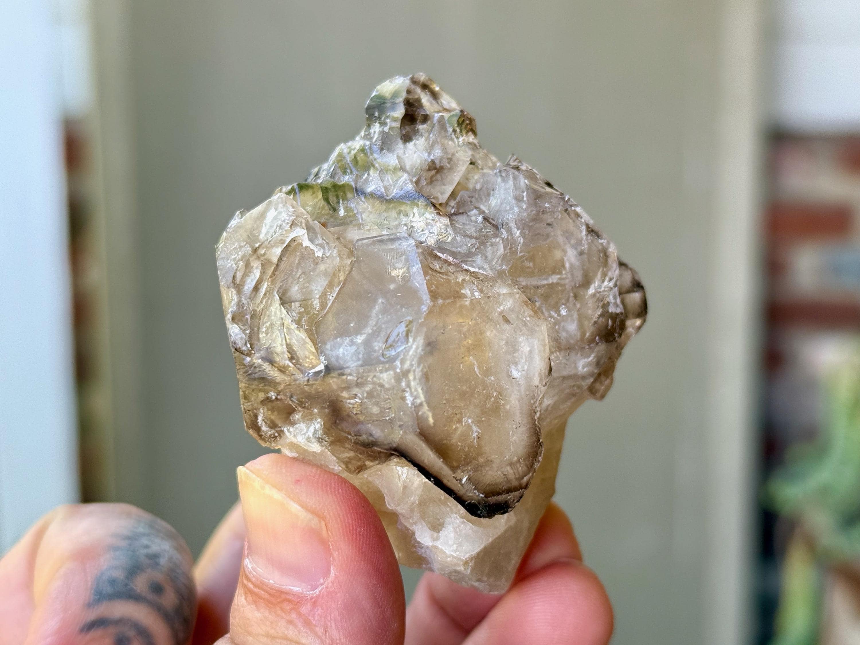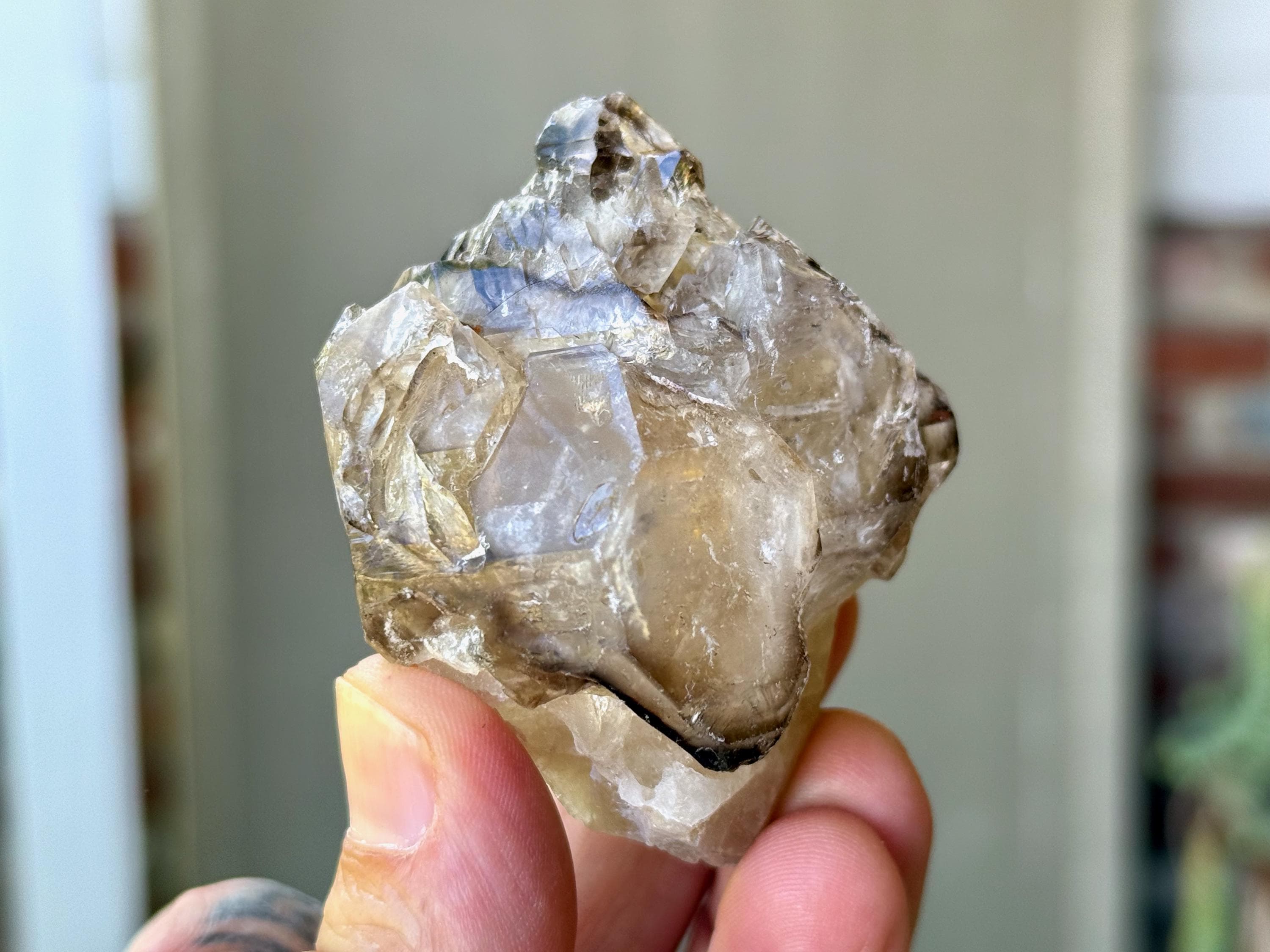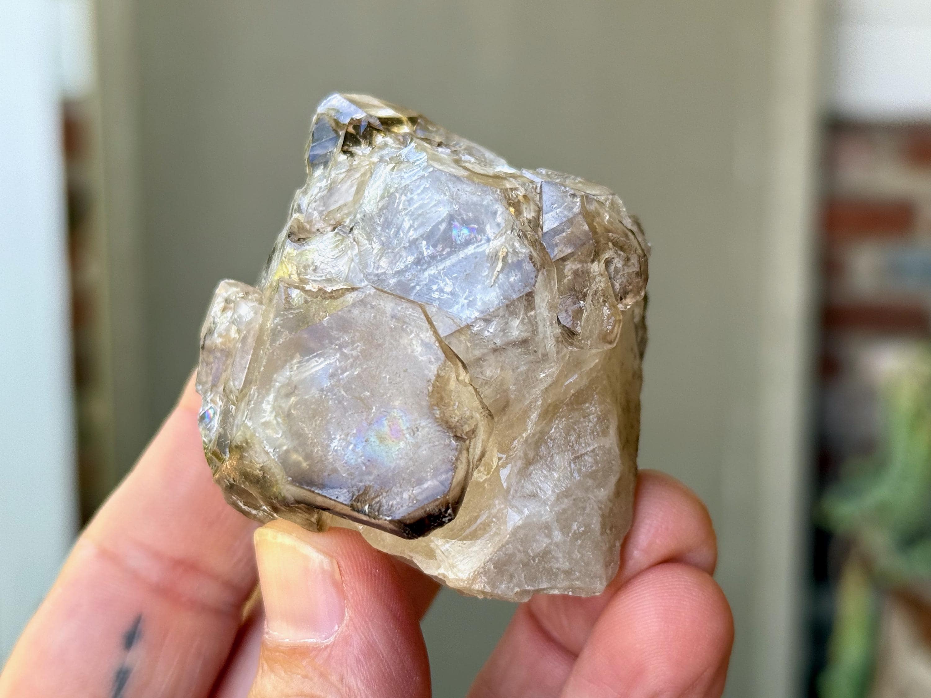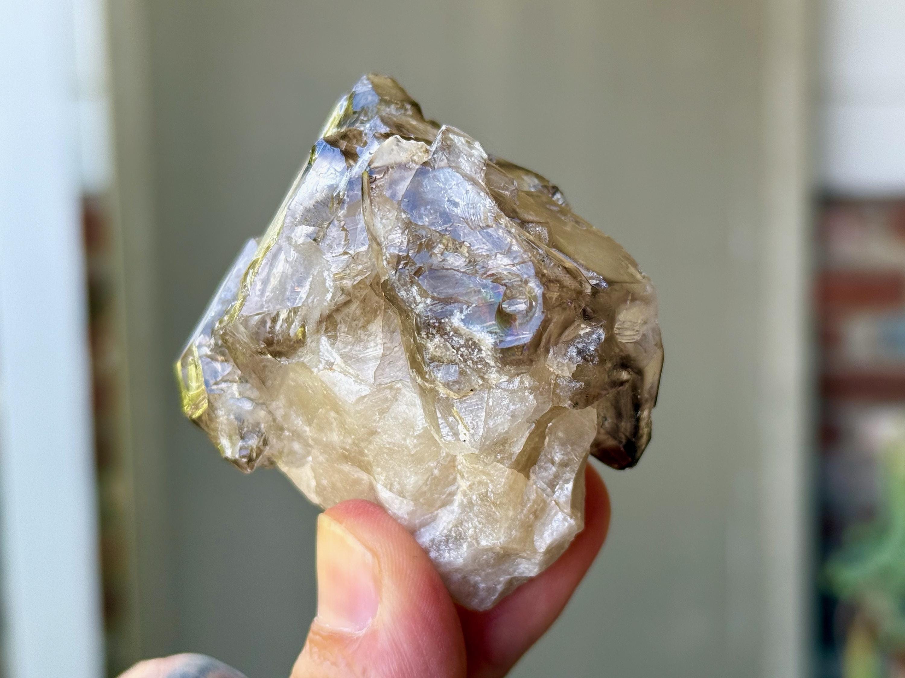 This crystal displays a beautiful marbling of smoky and clear hues, with lots of etched textures, and you may even catch a mild rainbow or two in here. There's a very minor chip to the back or side at the top that mildly abuts the termination. But the termination is otherwise intact and excellent. A really beautiful piece from this find!