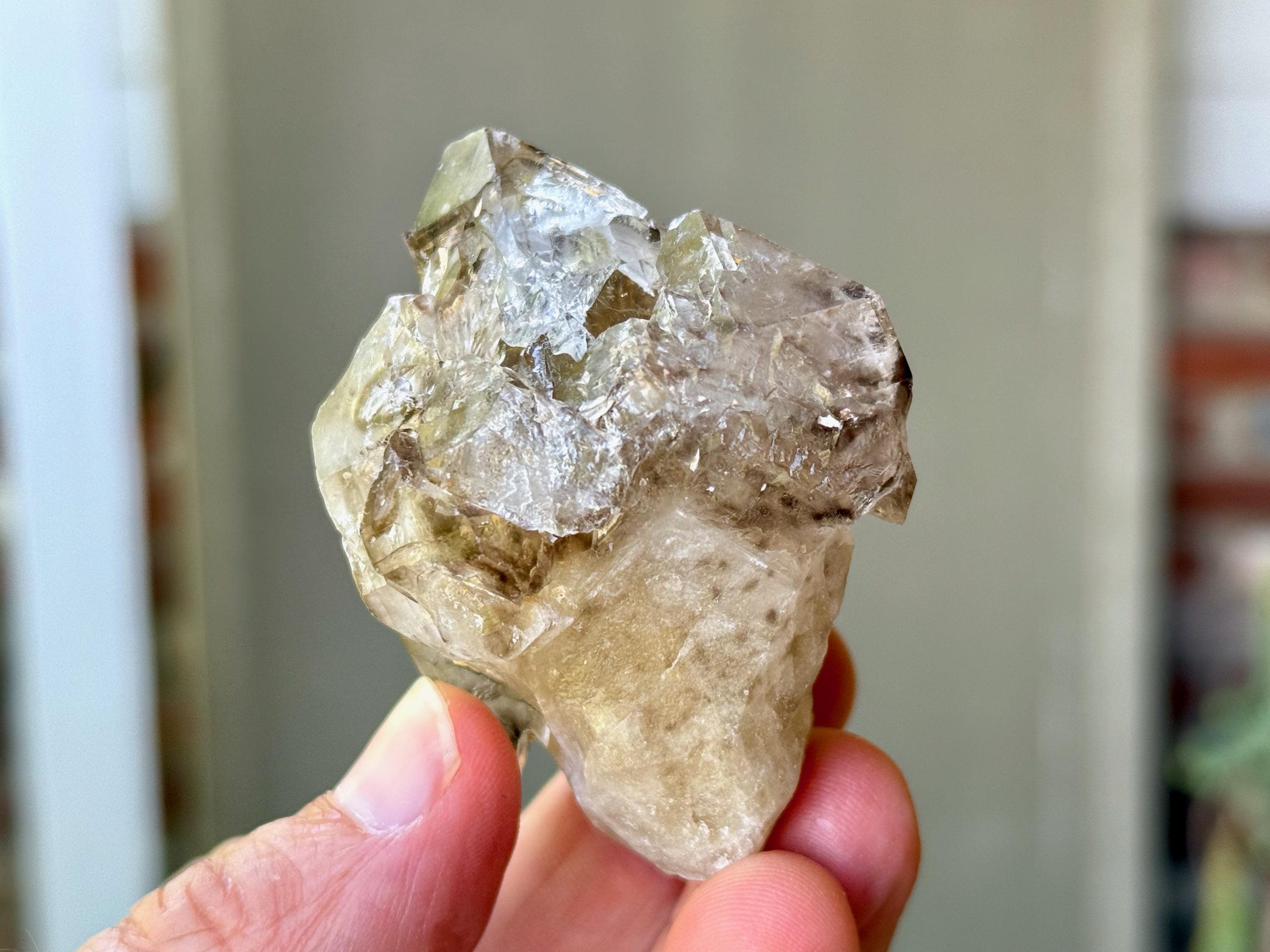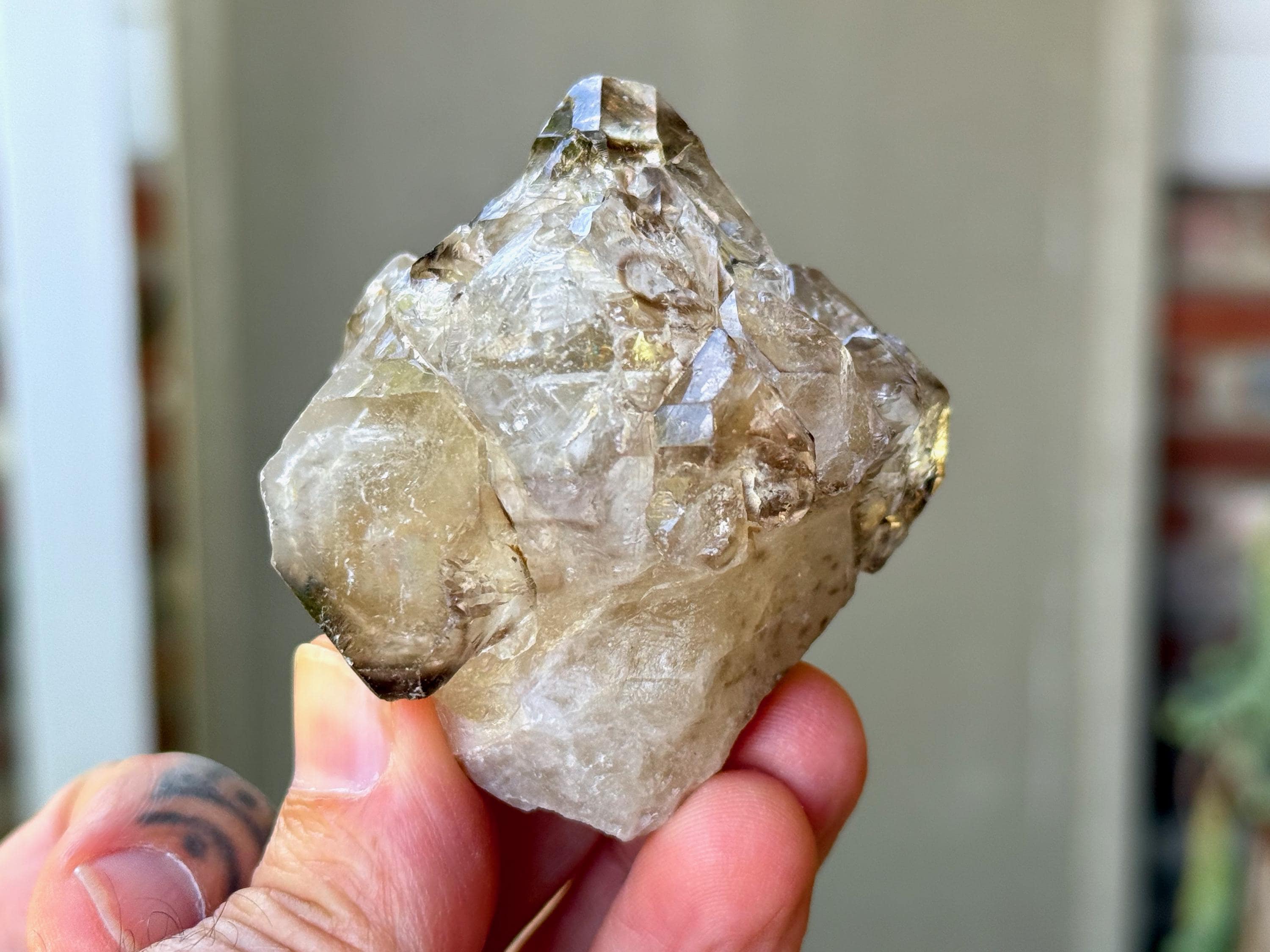 Tremendous luster to this exceptional quality Smoky Elestial Quartz with a unique sceptered growth formation. We can see the robust scepter "stem" protruding from the bottom, with the lustrous overgrowth on top surrounding it like a torch.