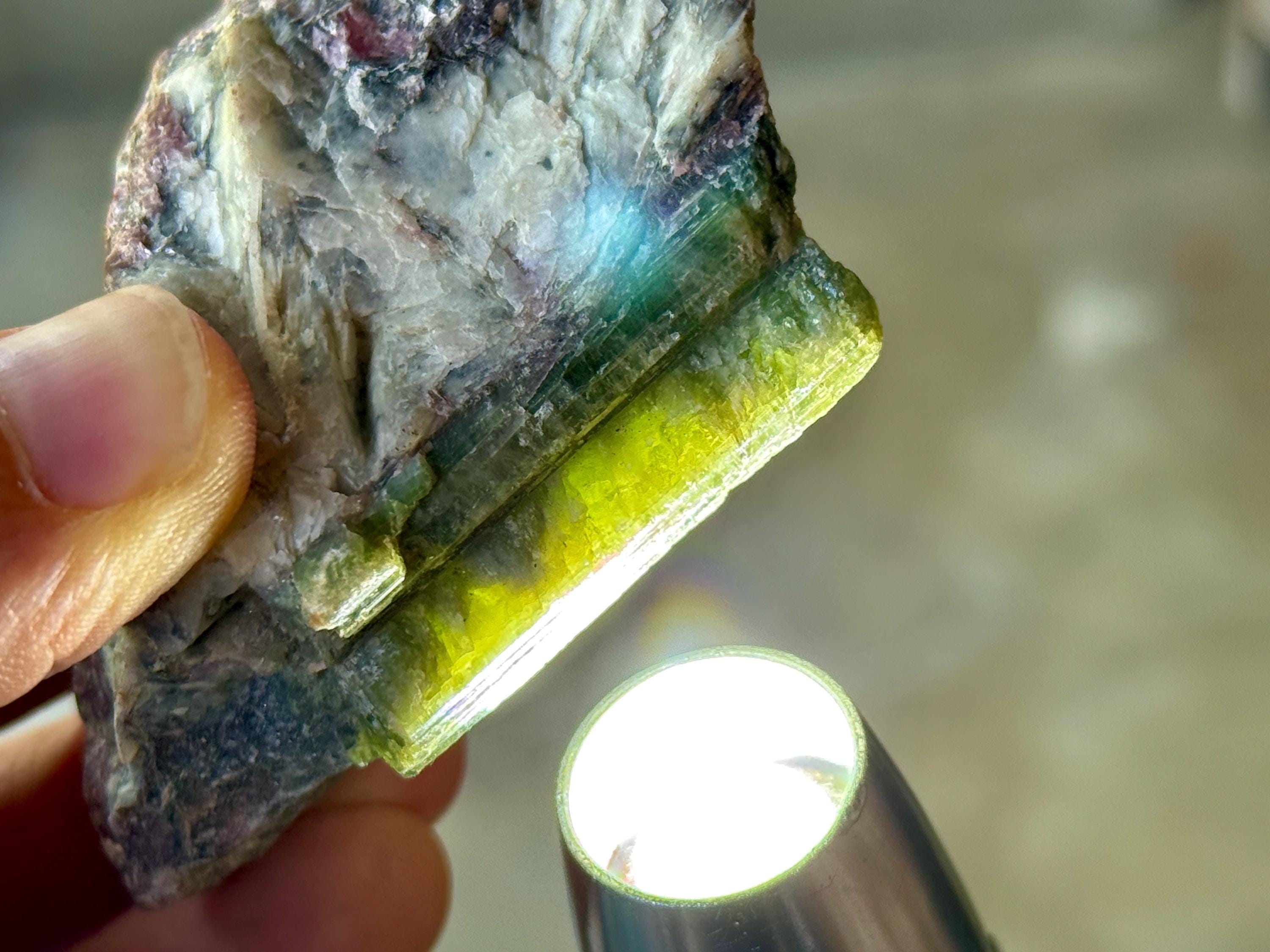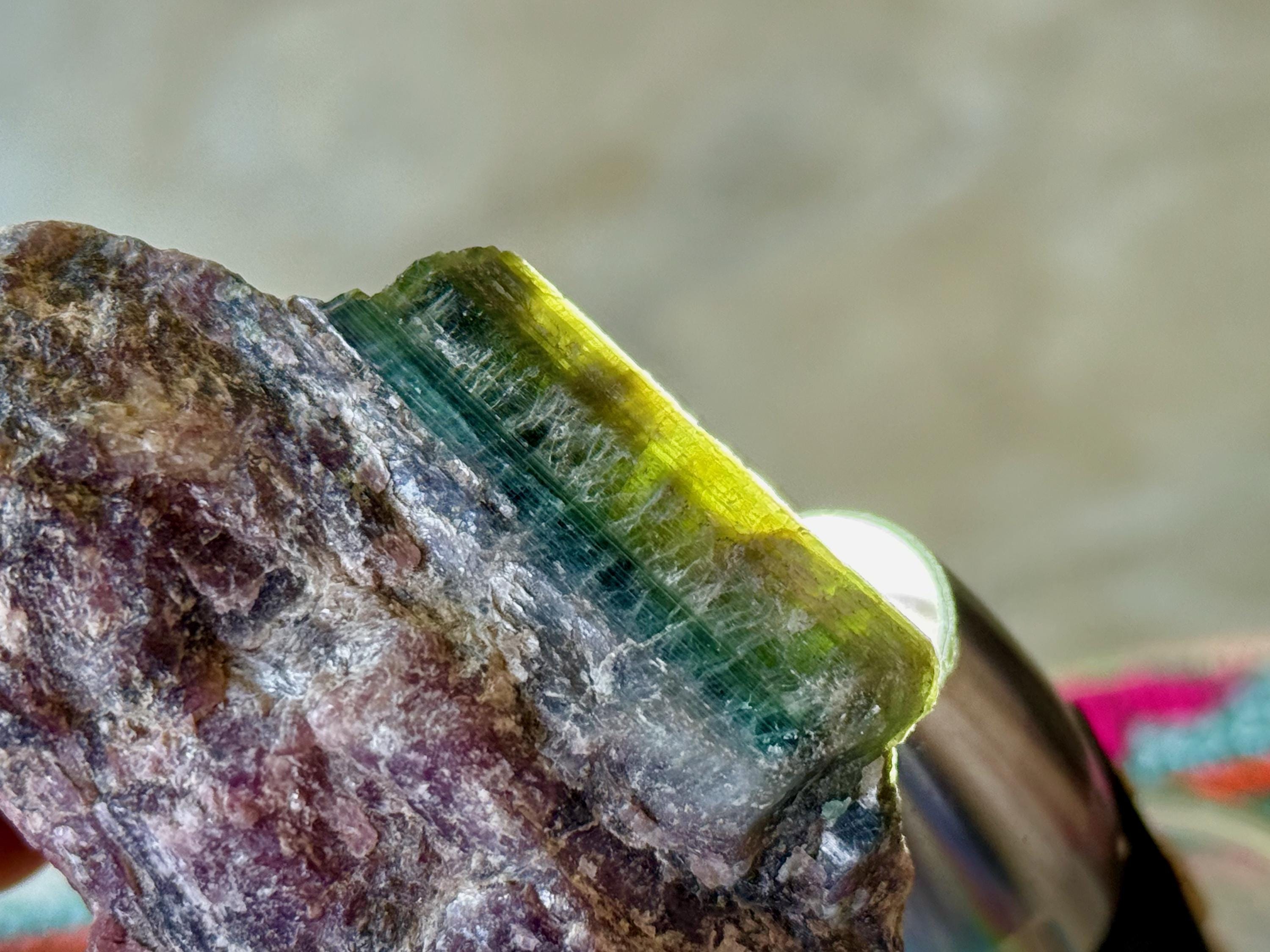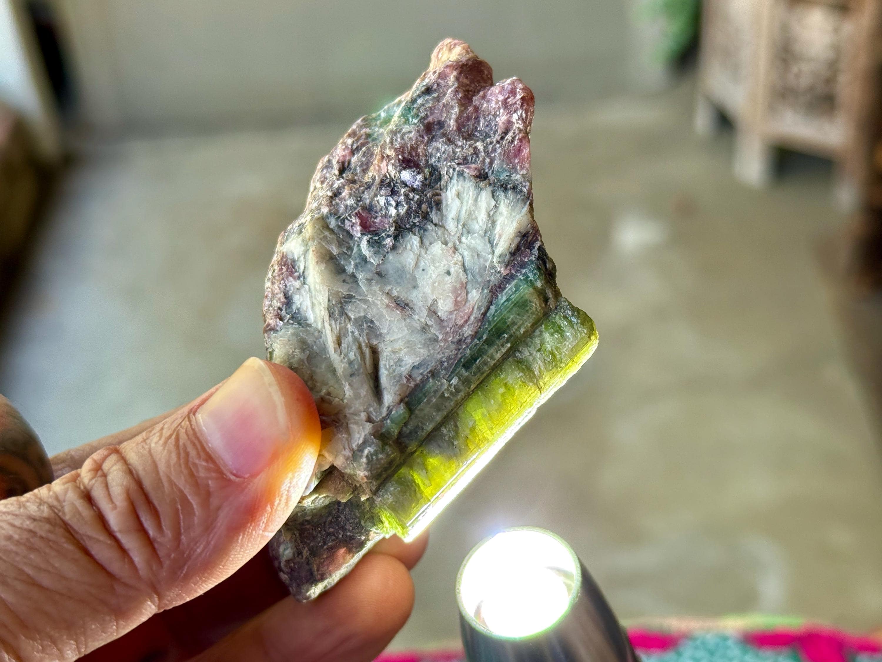 What surprised us most was that each element to this piece has nice translucency when backlit, as in Photos 2, 4-5, 8-10. The colors are extraordinary, with the Pink Tourmaline exhibiting a rich, almost purple hue, and the blue vertical stripe really accentuating the olive hue of the Green Tourmaline.