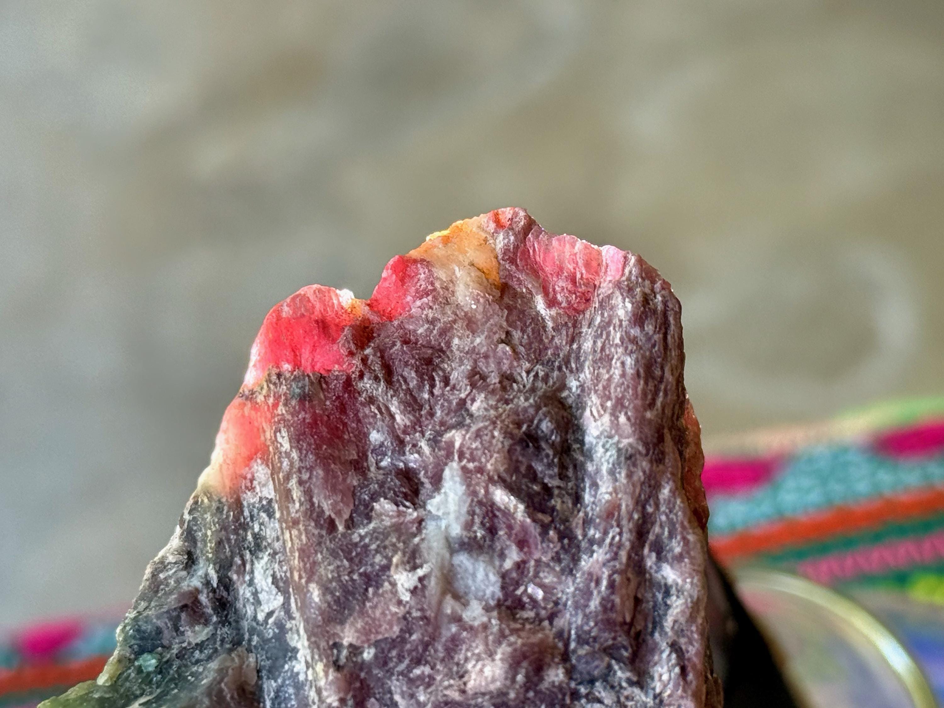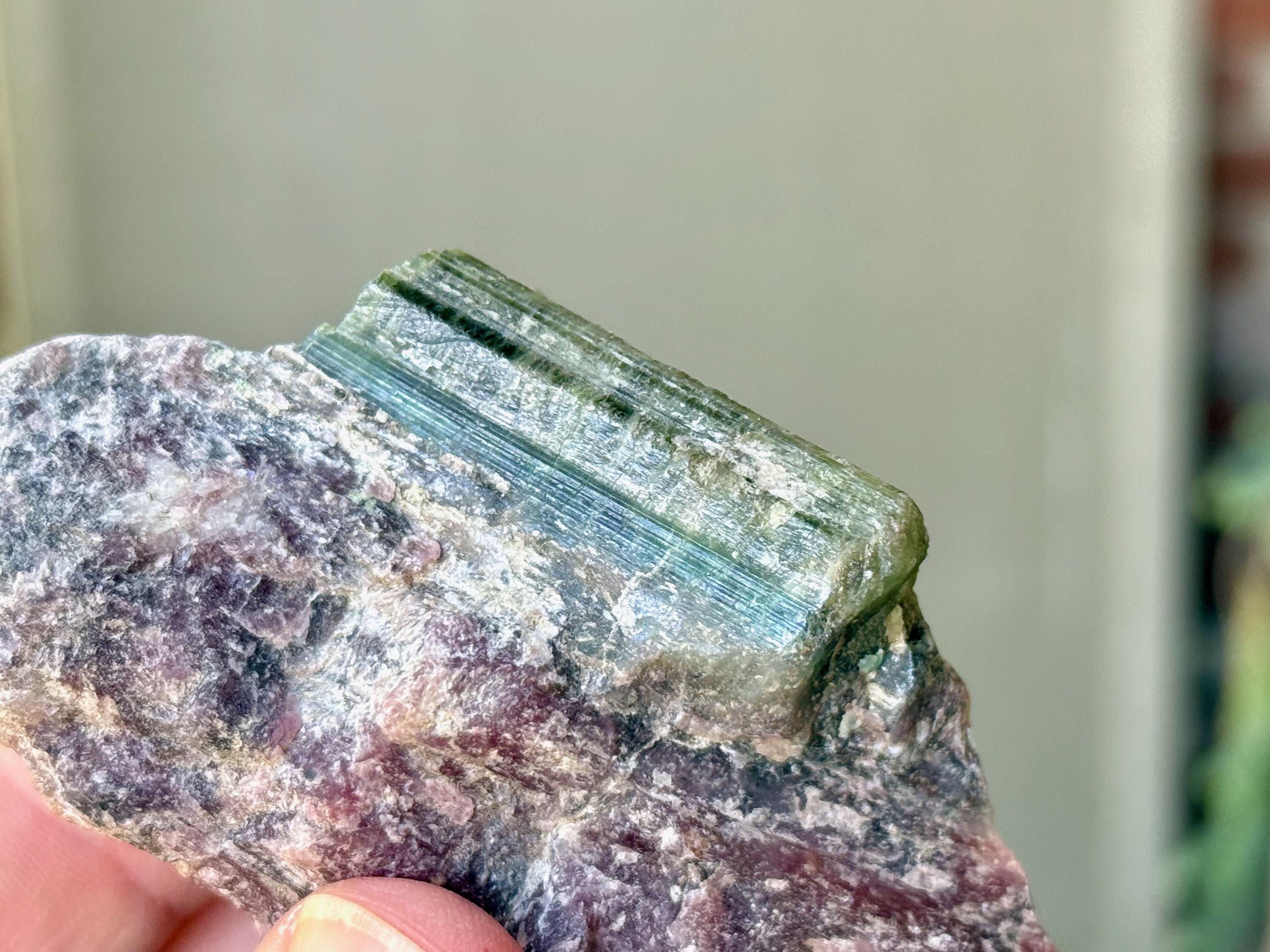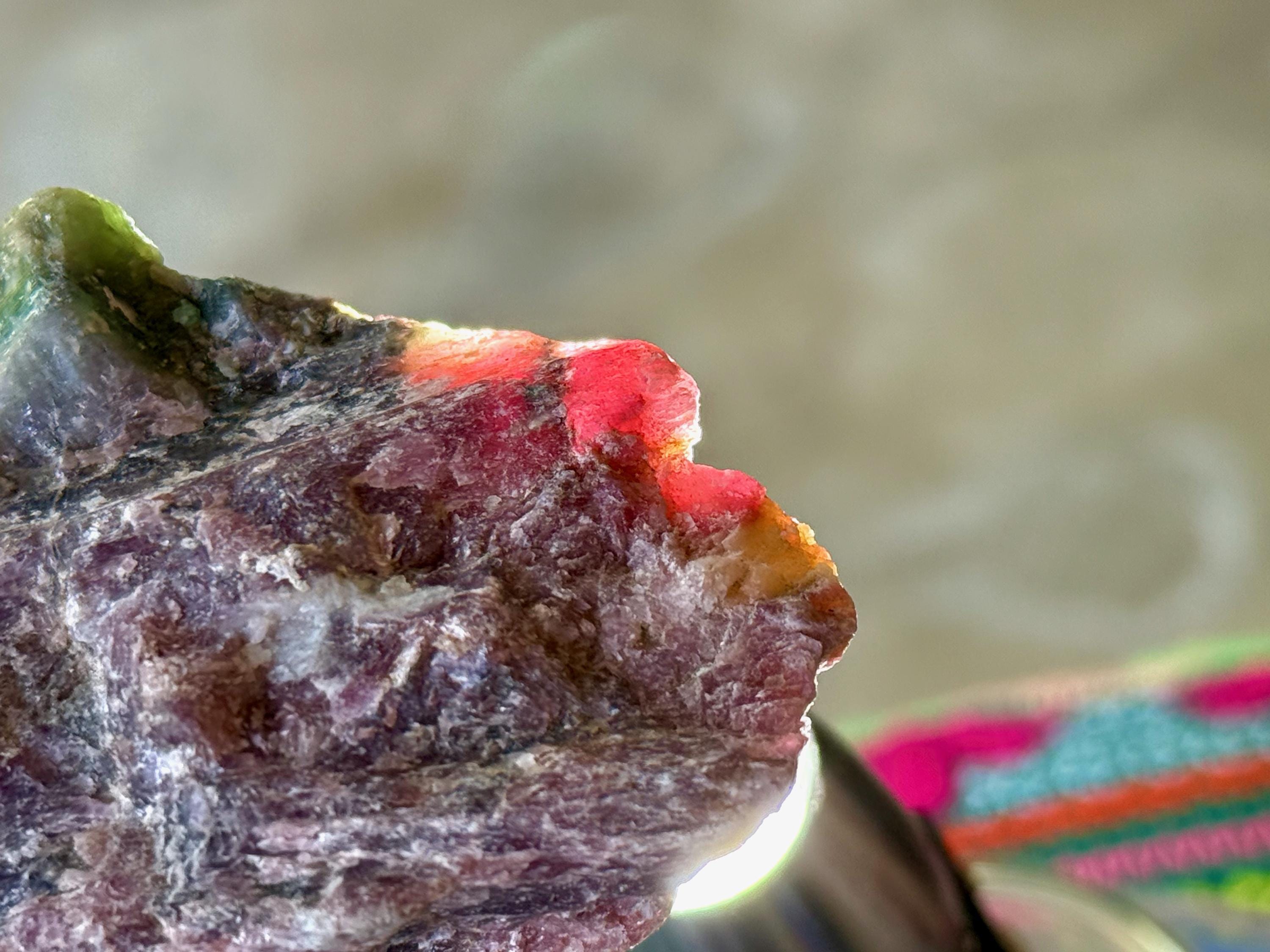 What surprised us most was that each element to this piece has nice translucency when backlit, as in Photos 2, 4-5, 8-10. The colors are extraordinary, with the Pink Tourmaline exhibiting a rich, almost purple hue, and the blue vertical stripe really accentuating the olive hue of the Green Tourmaline.