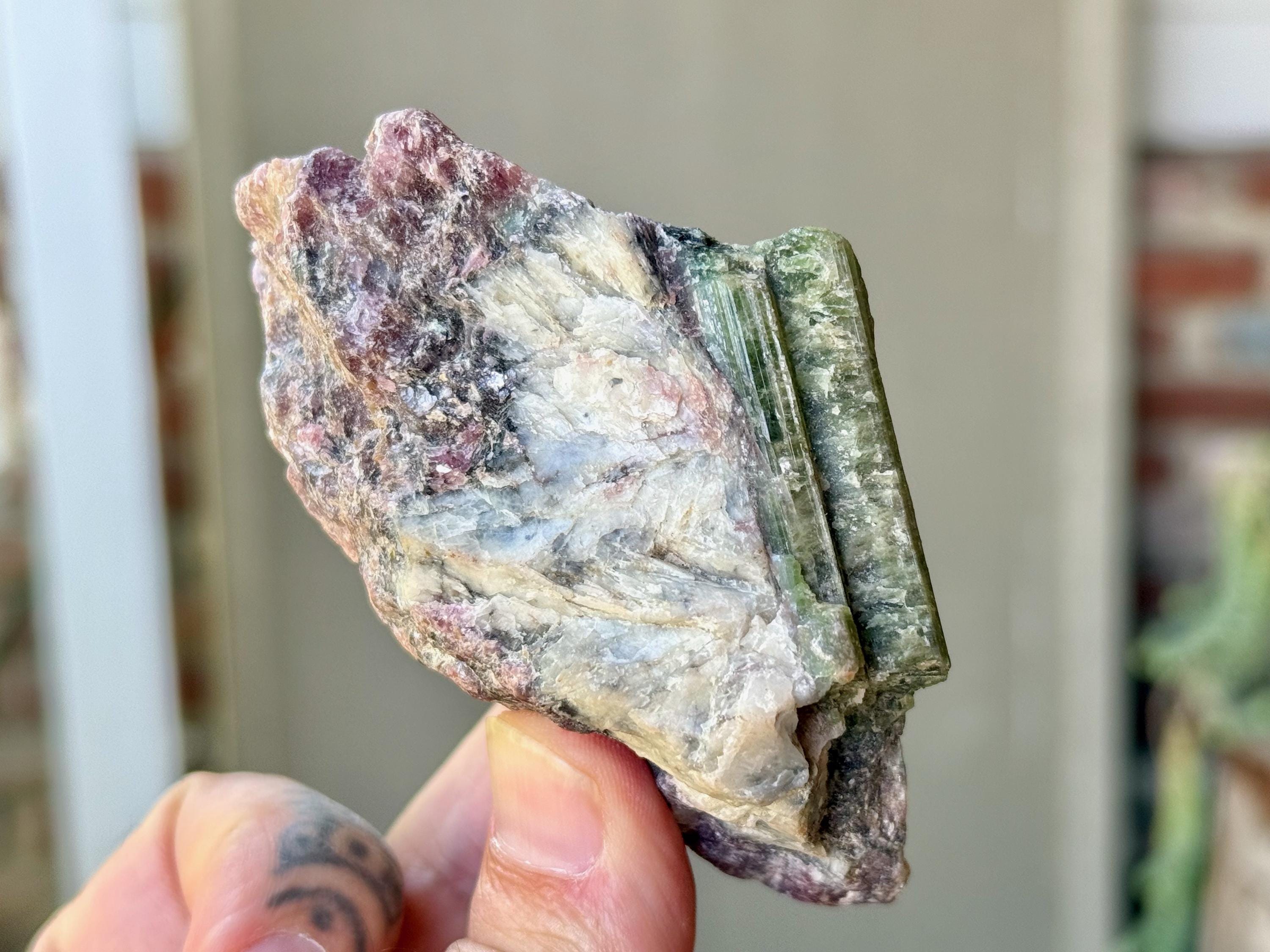 This crystal features a large, perfectly formed bicolor Green and Blue Tourmaline attached to a very large Pink Tourmaline and Quartz matrix.