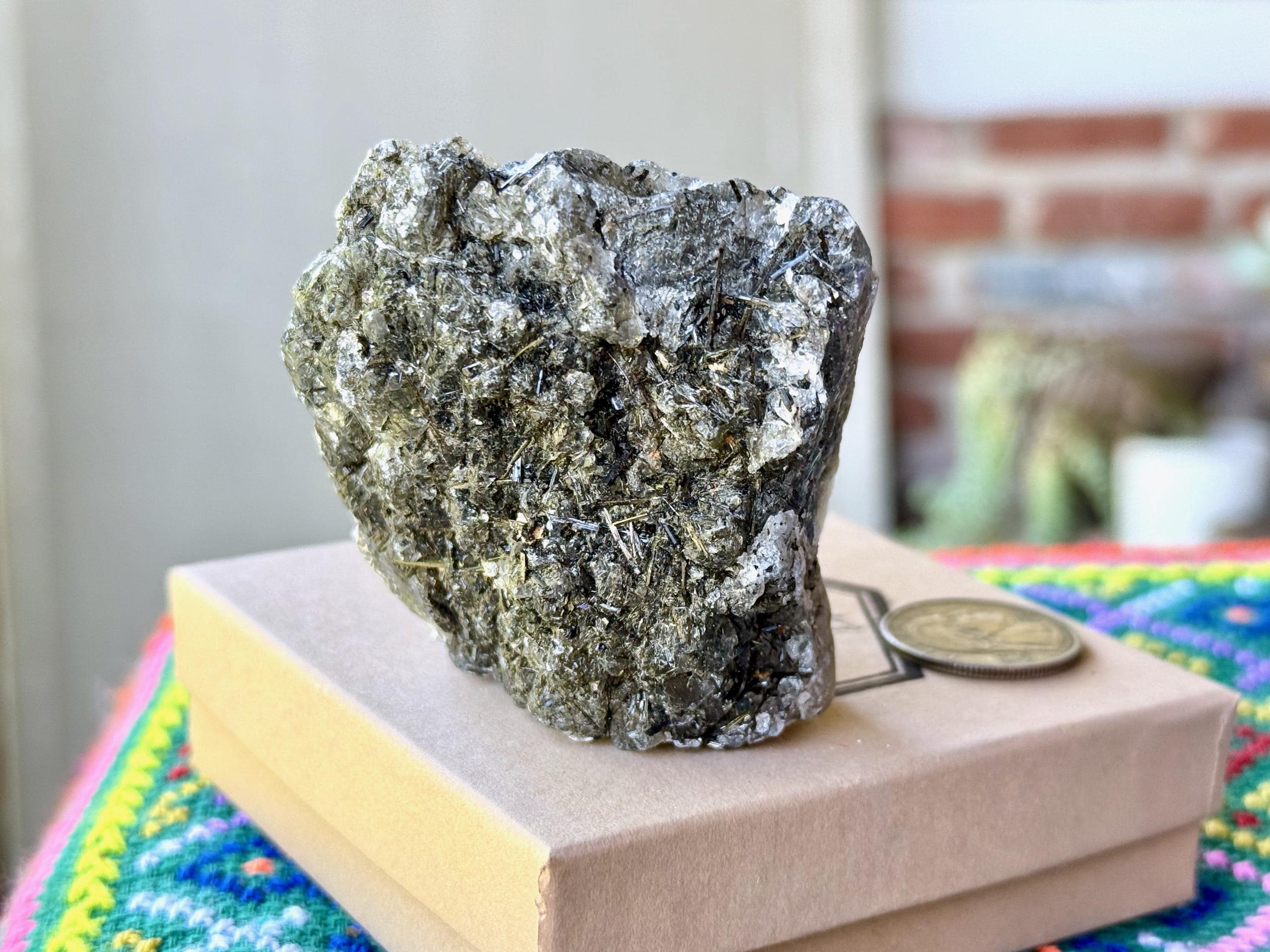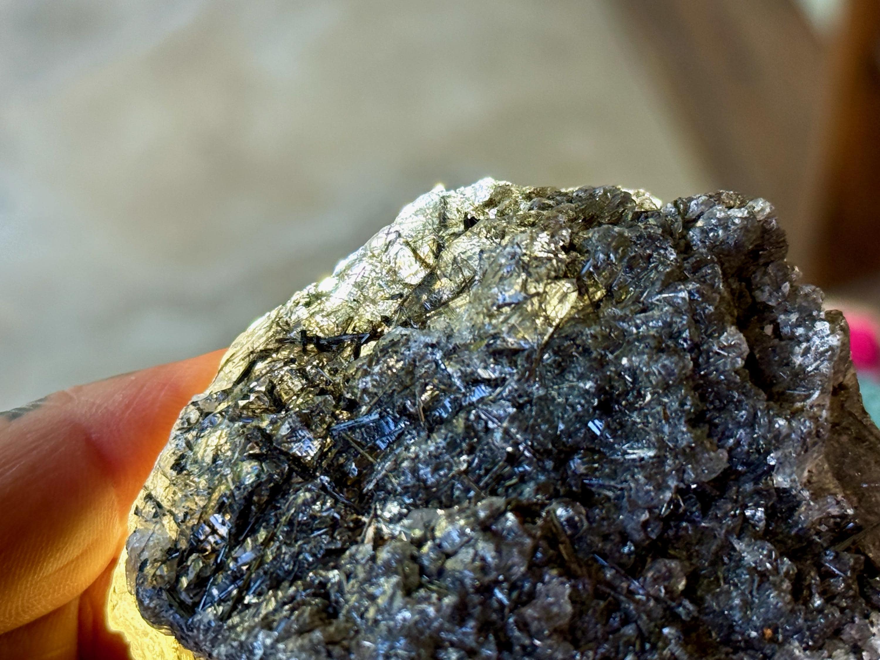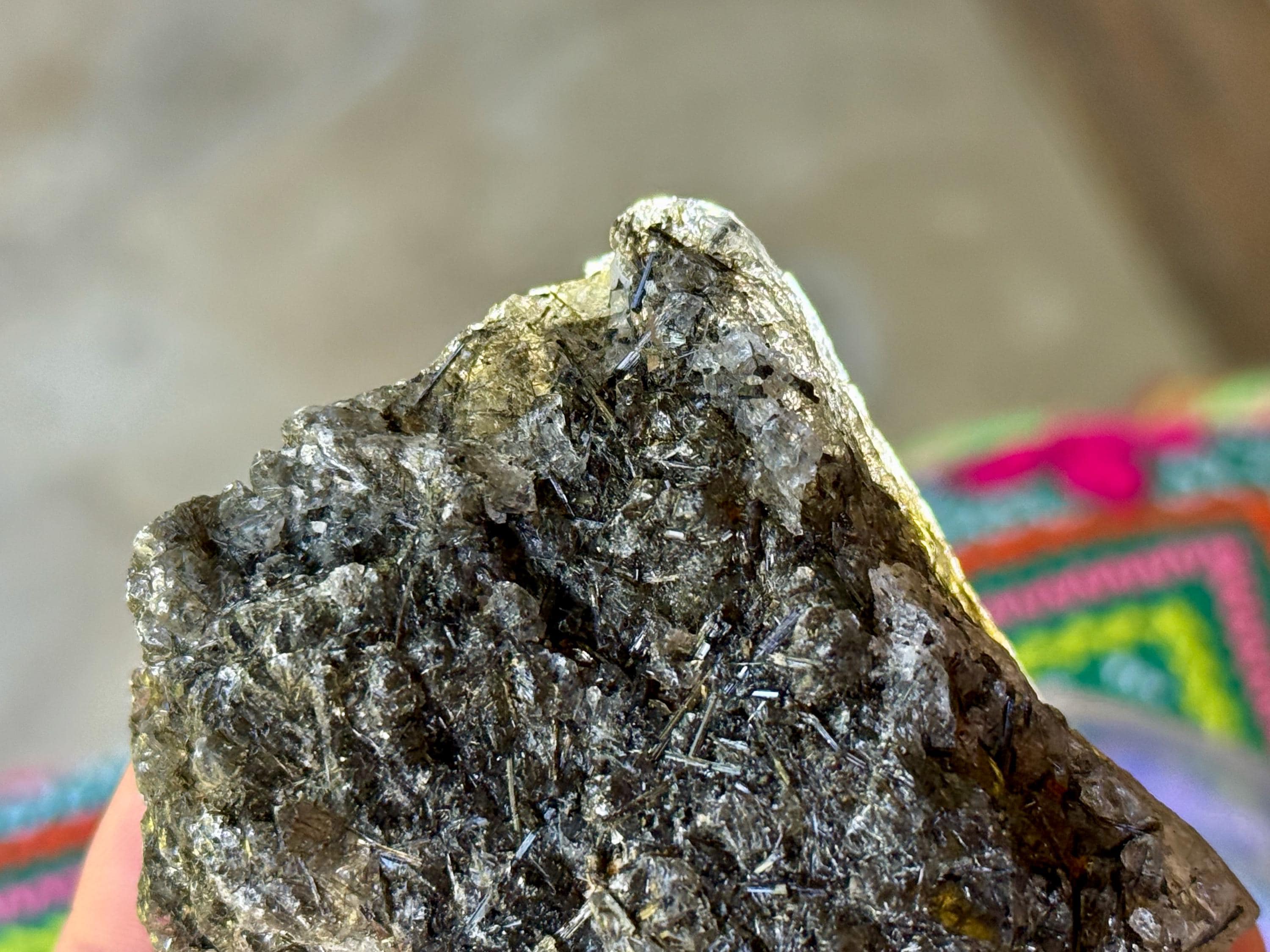 This crystal is embedded with hundreds upon hundreds of needle-like dark Tourmaline inclusions covering the front portion, creating a marvelous and lustrous textural display. While they appear black at first glance, a closer look reveals that many of these are actually Brown Tourmaline (Dravite), as well as black, with some dark Green Tourmalines as well.