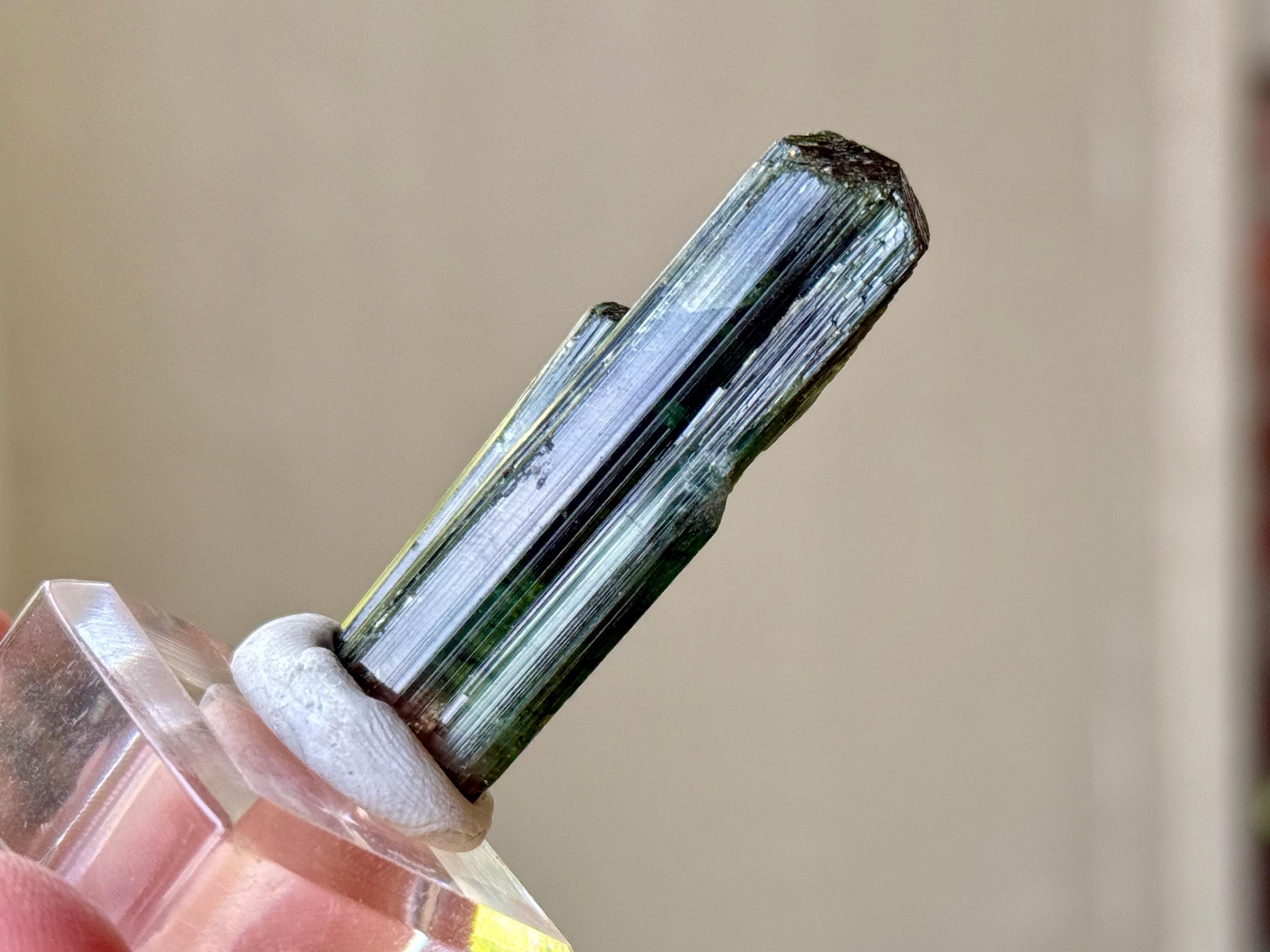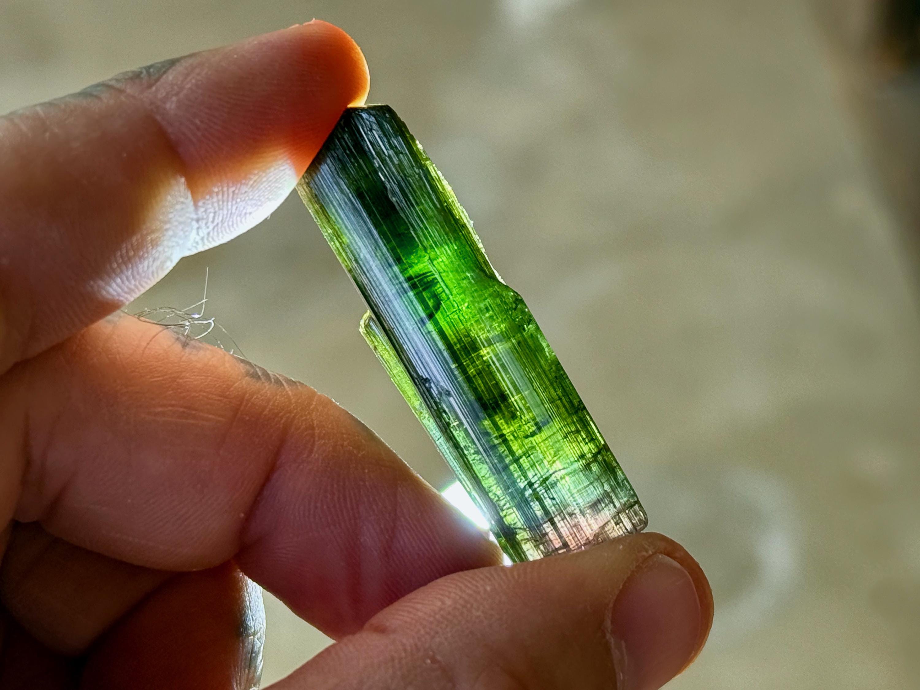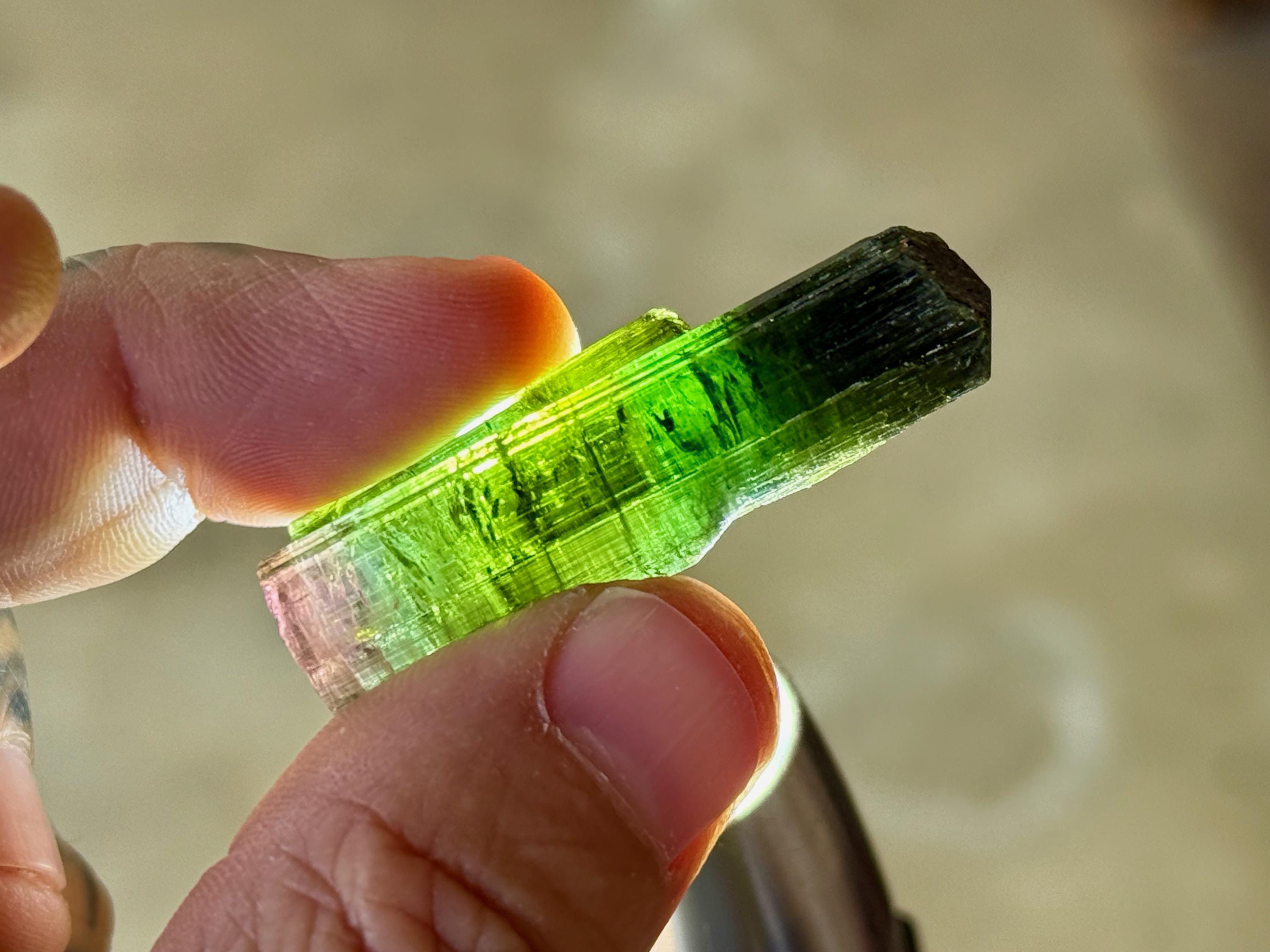 This Tourmaline is beautifully terminated with a "trinity" or "trigonal" termination, featuring three facets that terminate to a point (Photo 10). Outstanding quality!