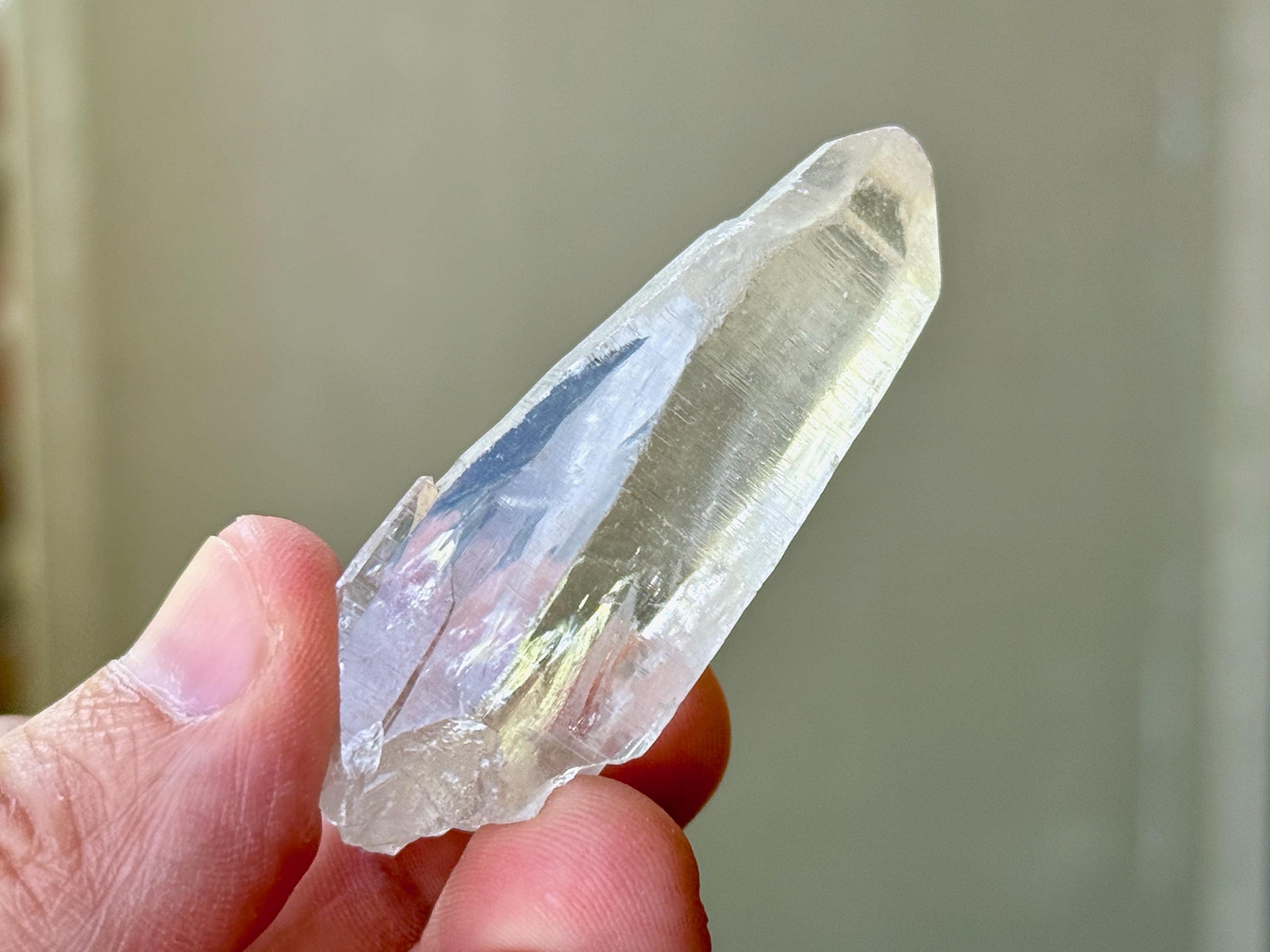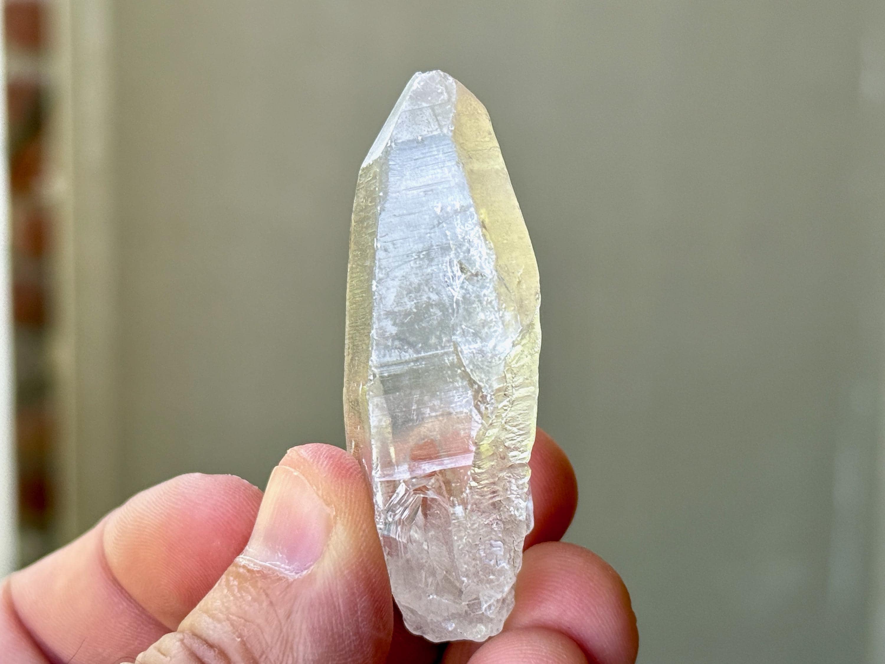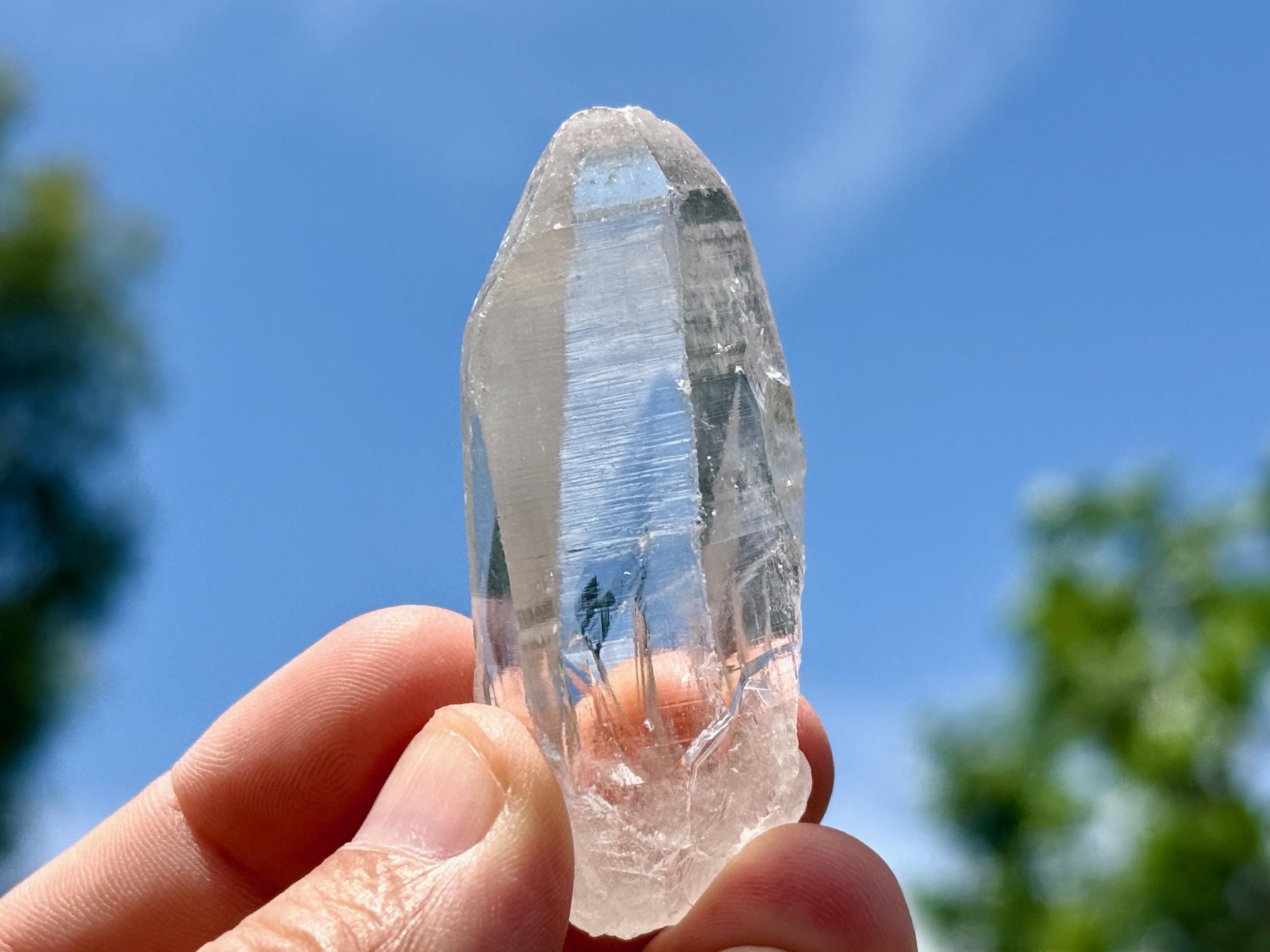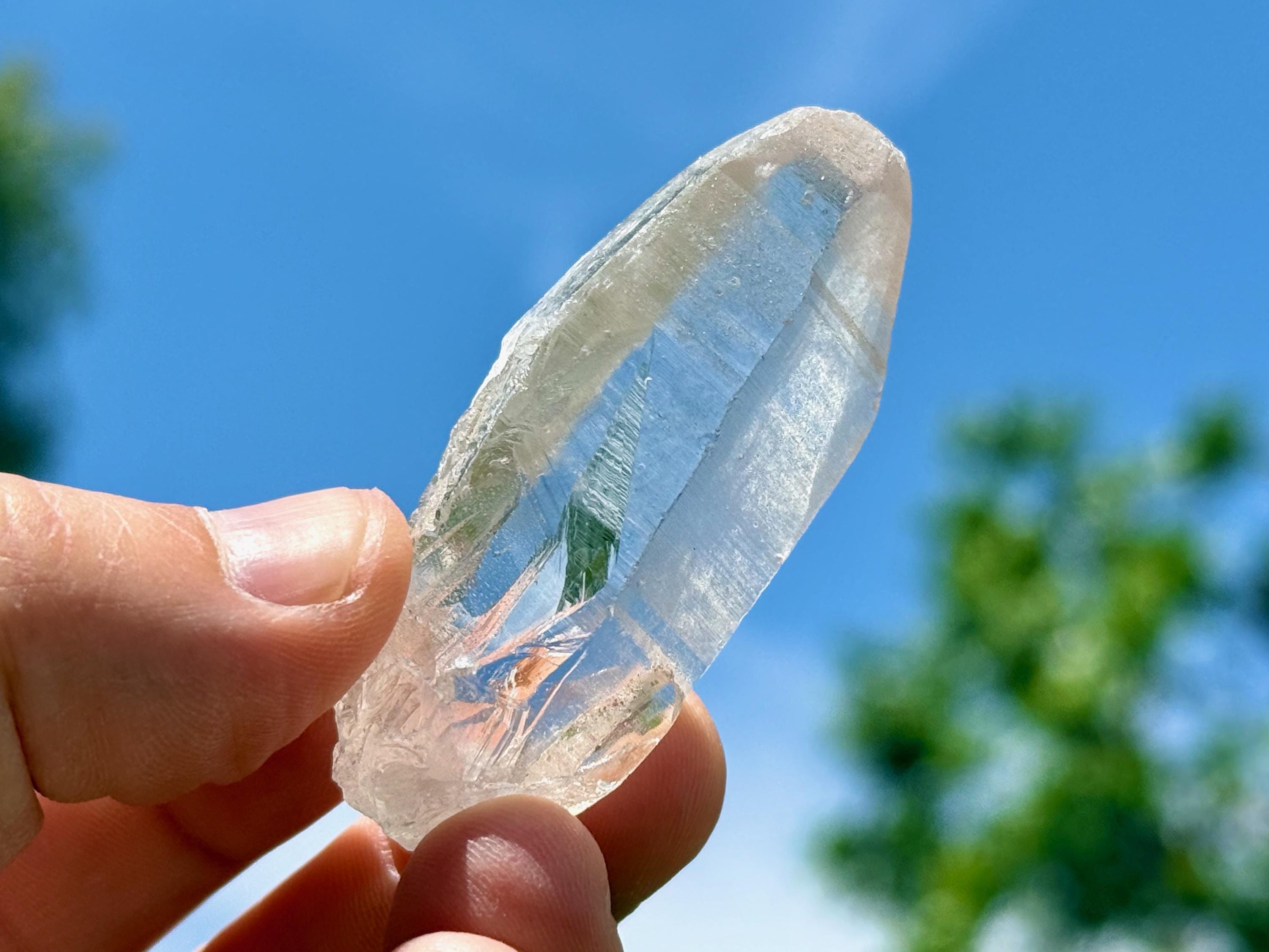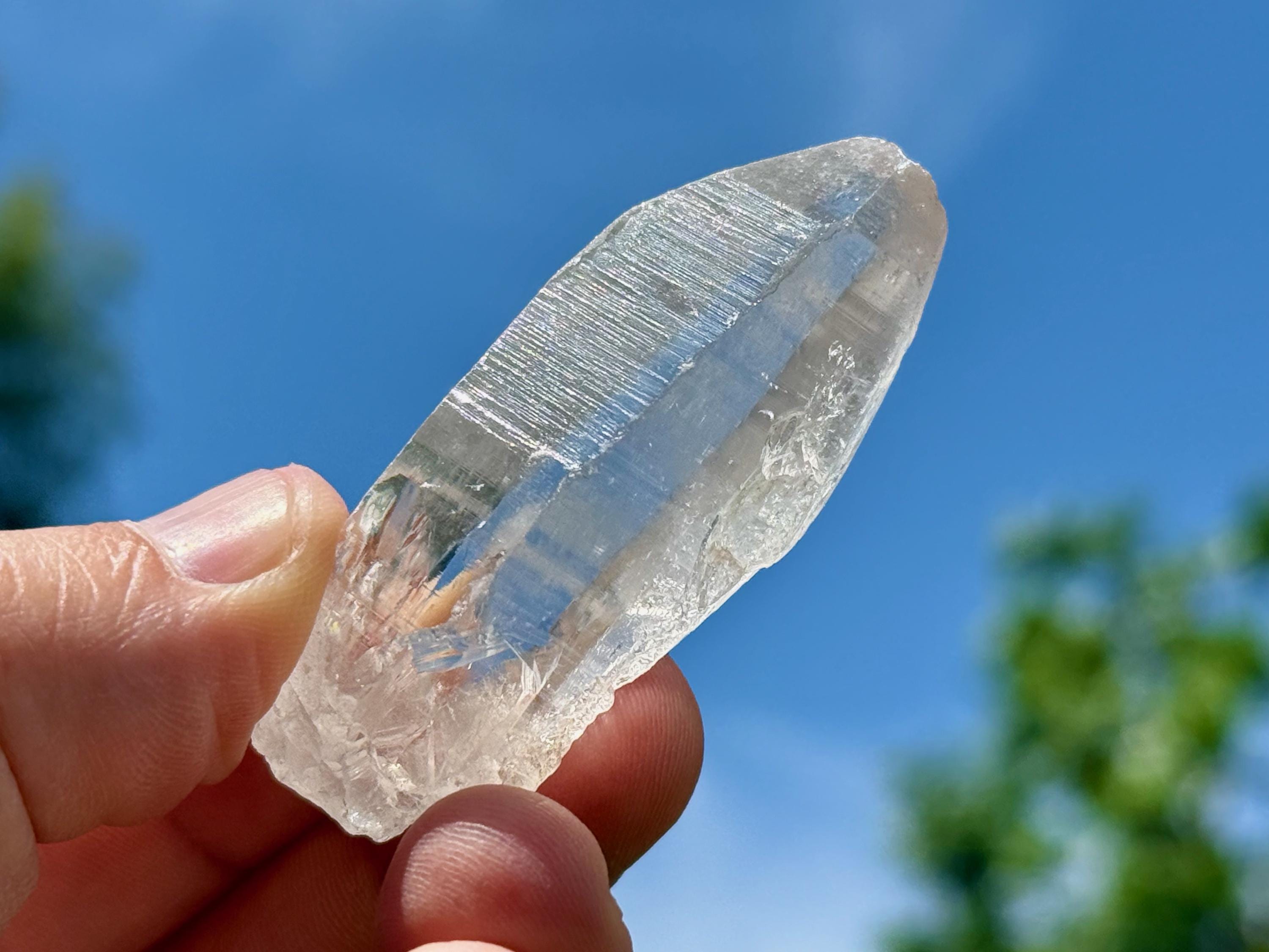 Water-clear clarity and brilliant luster to this sweet Sacred Scribe Lemurian! This crystal possesses a traditional "point" formation with a narrow sloping main facet and finely etched striations on its sides.