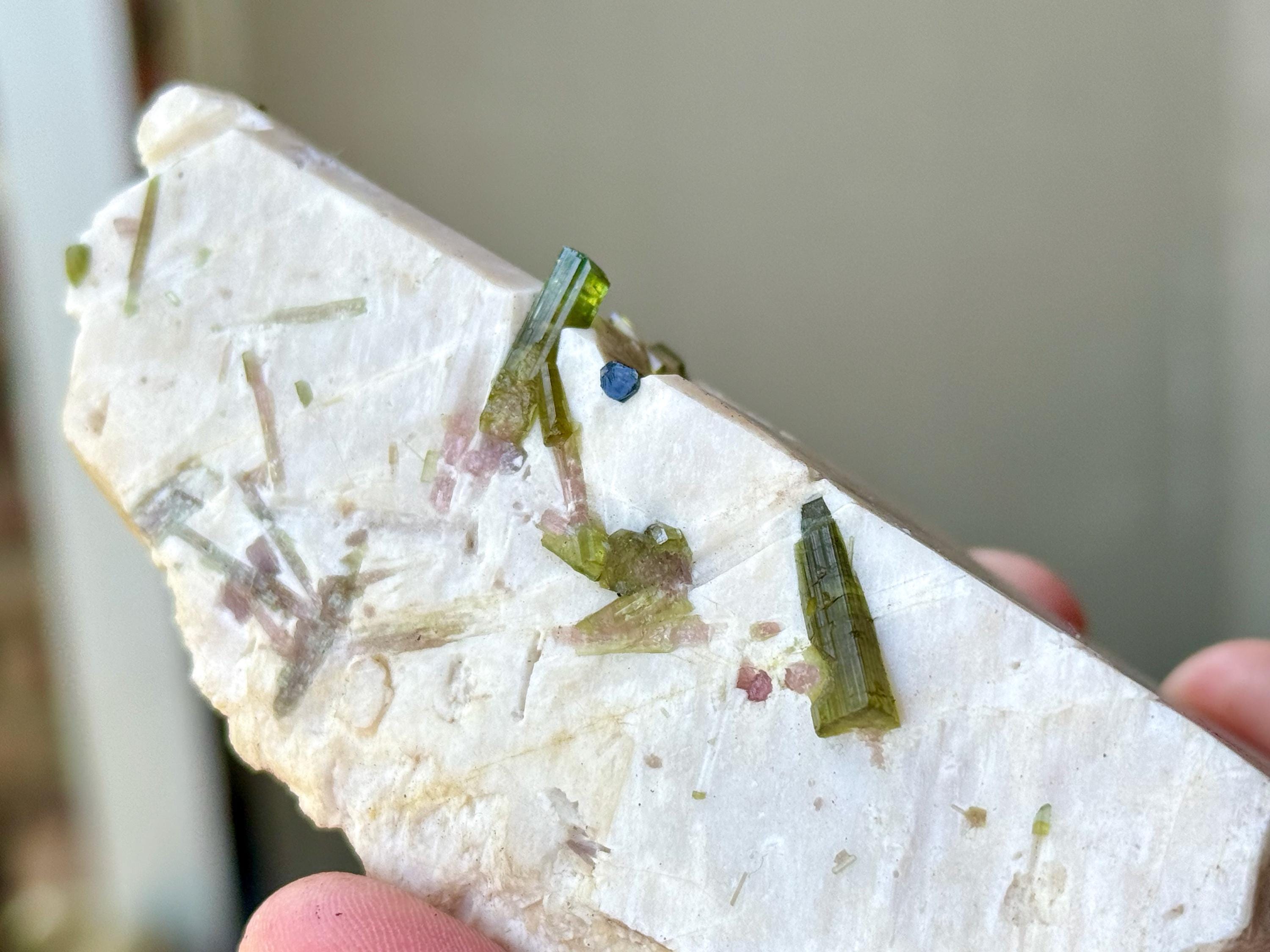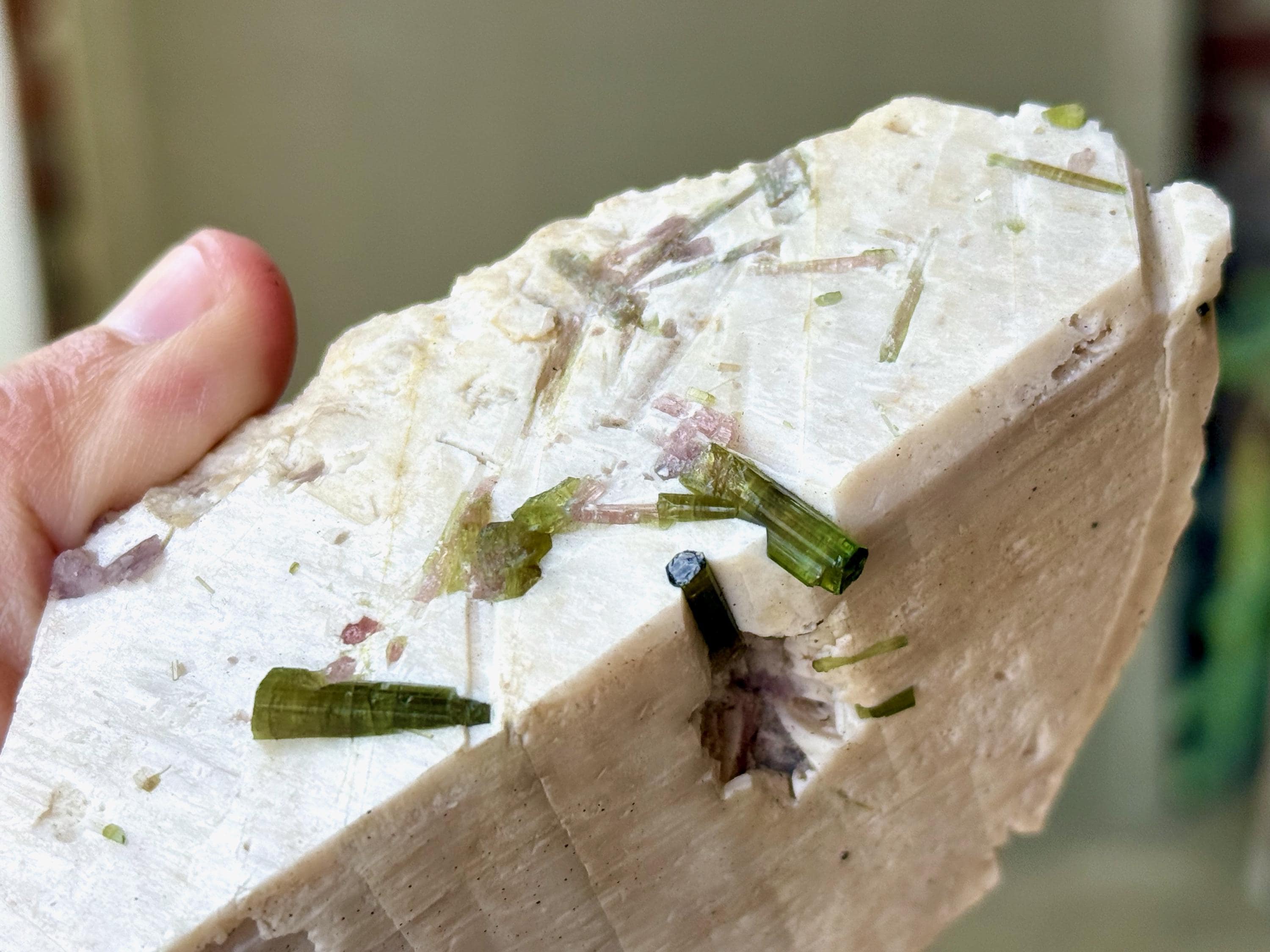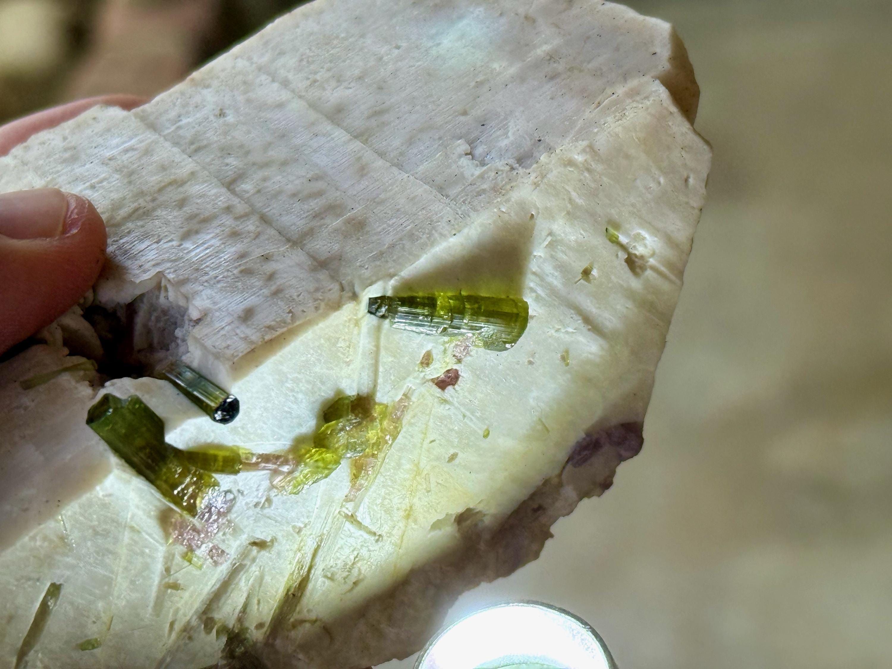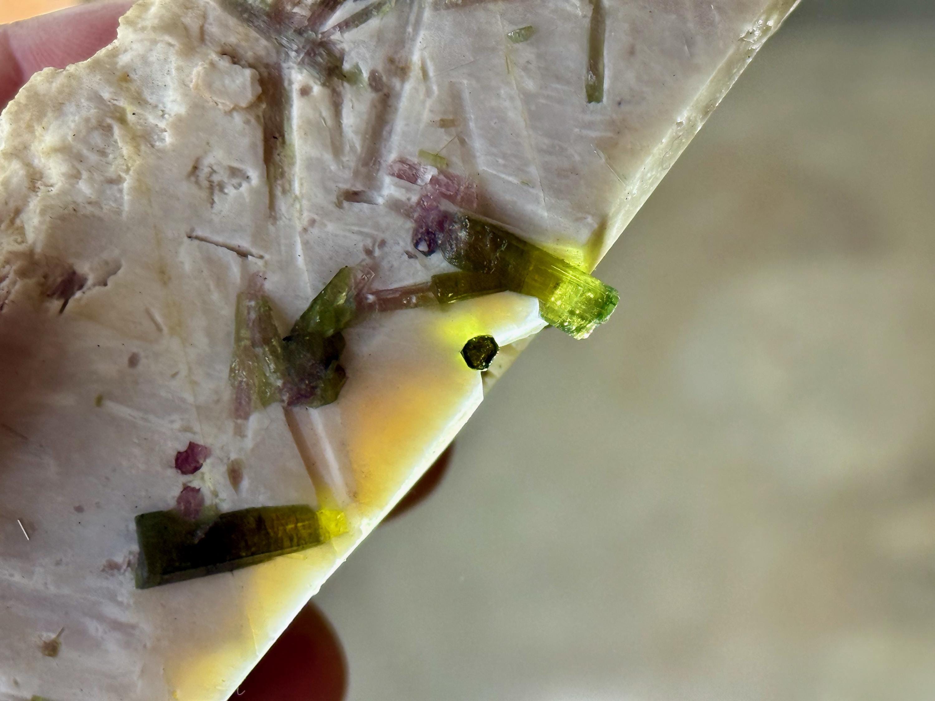 Embedded at the top, we see an array of tiny, crystalline Green Tourmalines embedded within, as well as some pale Pink Tourmalines. While it's a little tricky to backlight them, when we do shine some light here, we can see just how vibrant and clear they are (Photos 3-4).