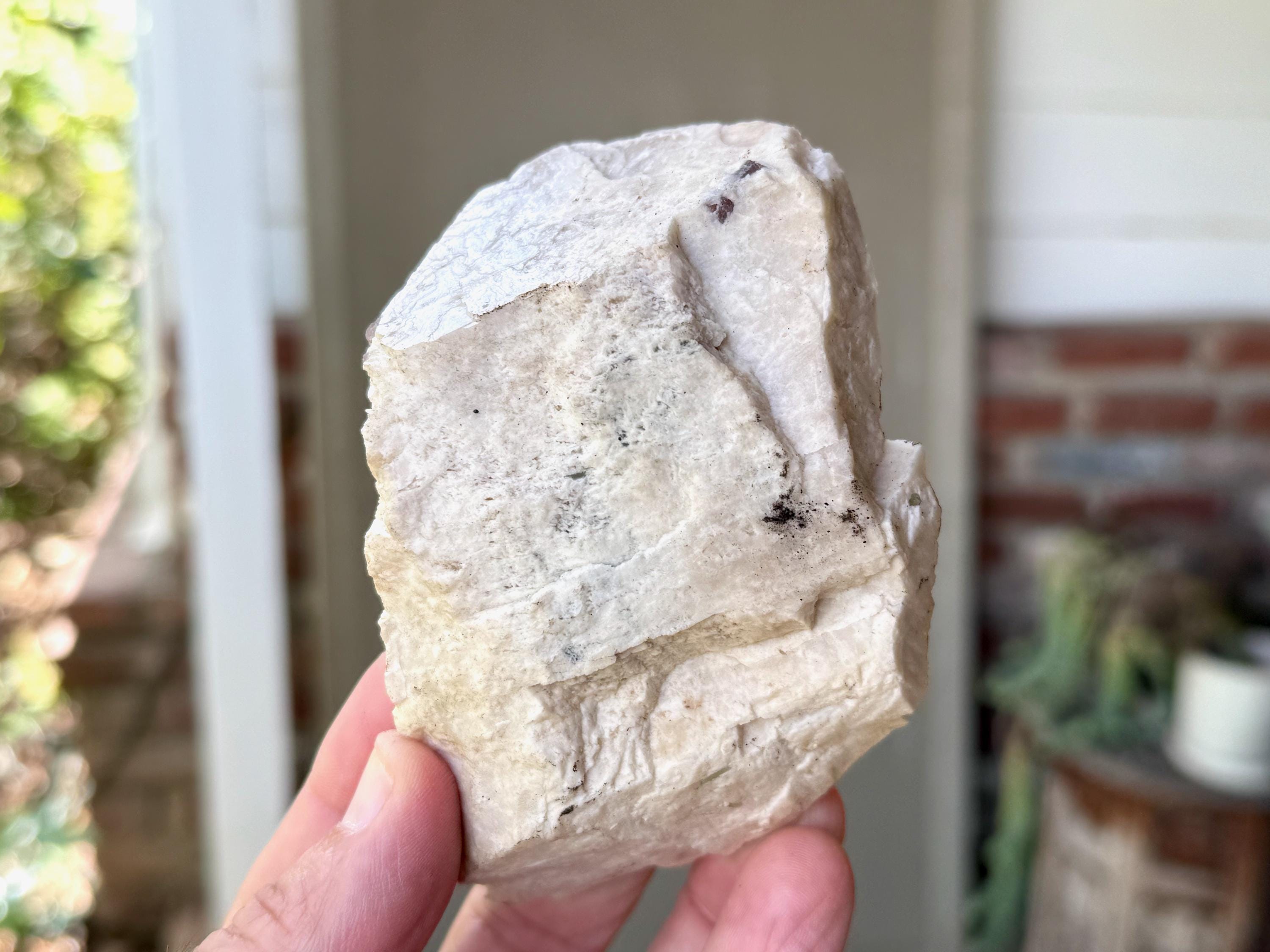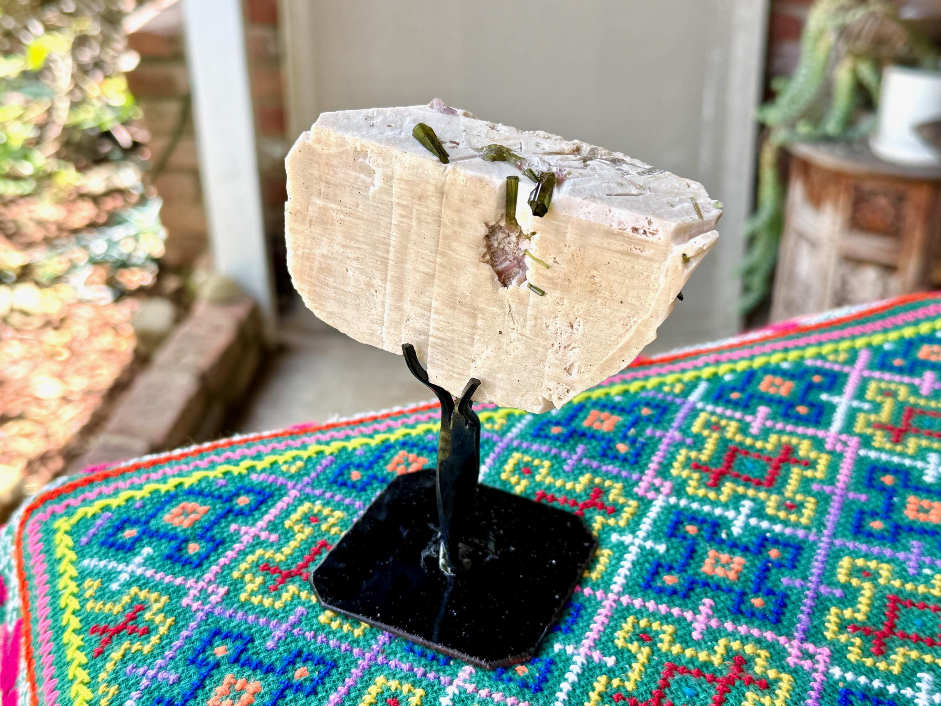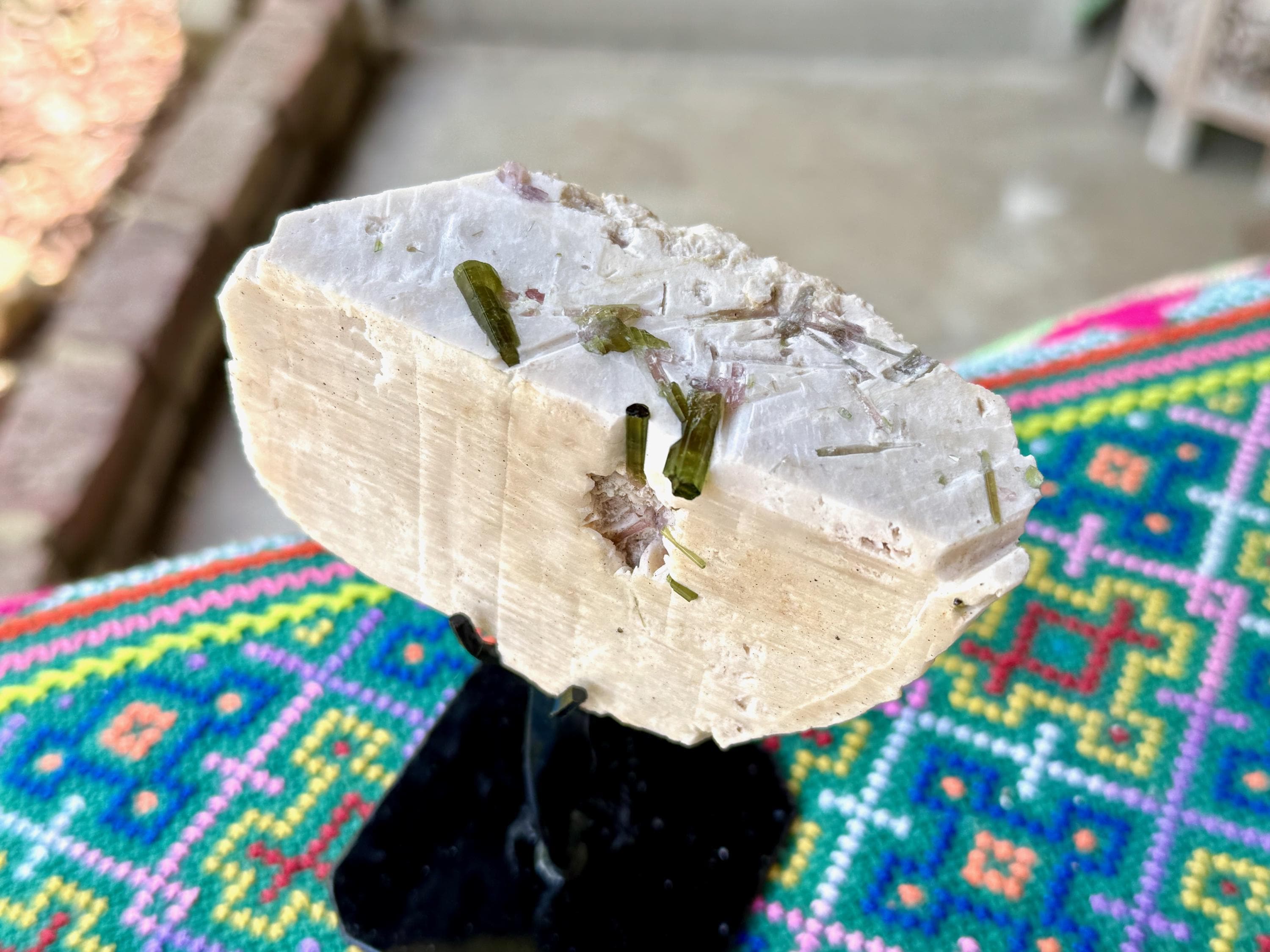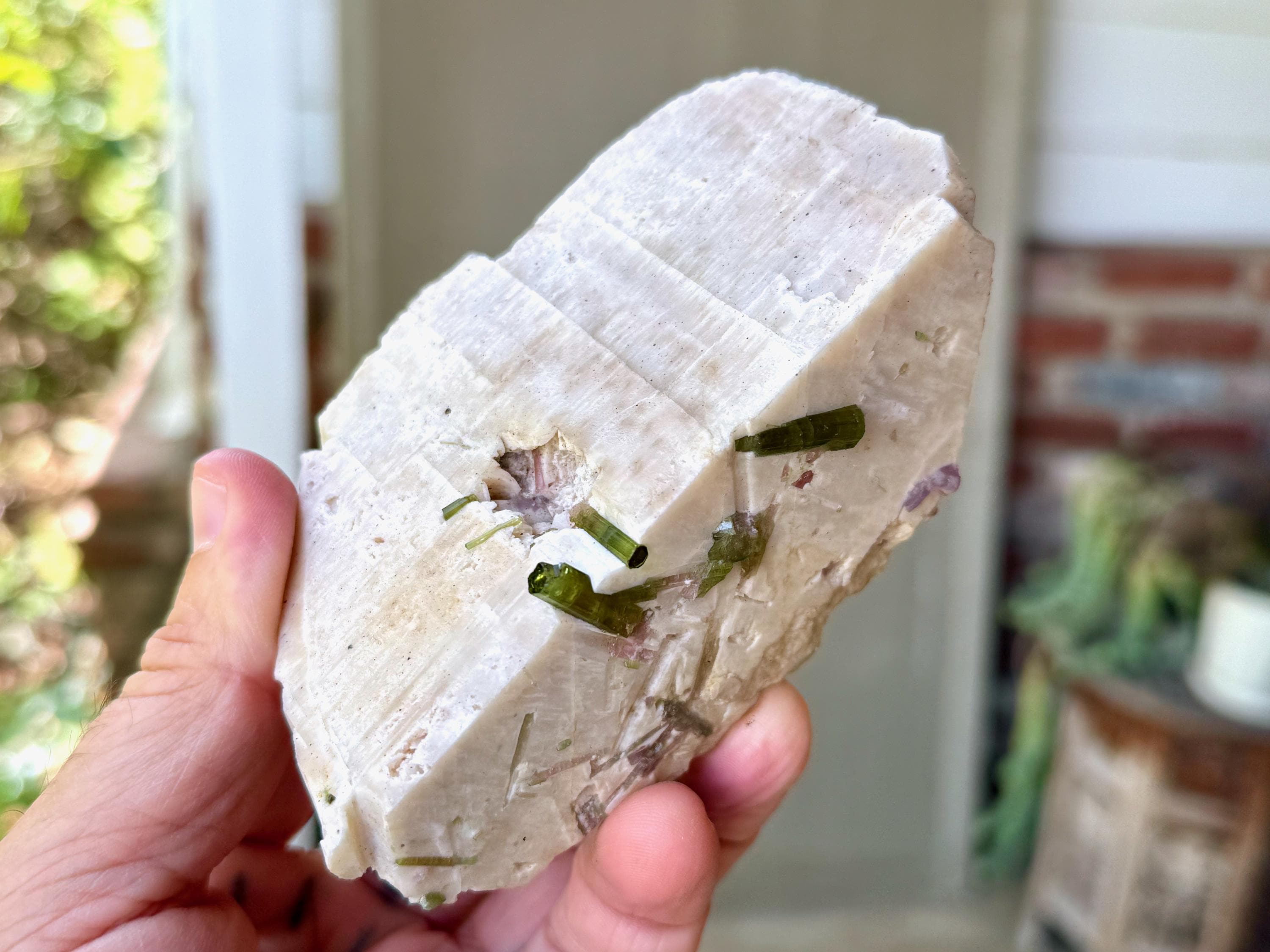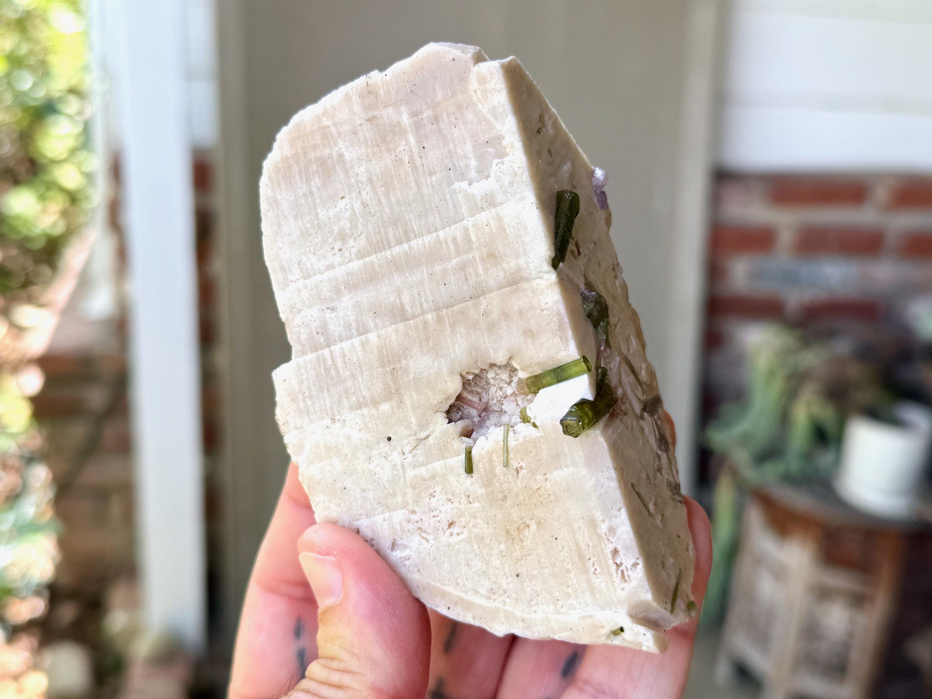 A very unique, natural formation to this bone-white Feldspar crystal, embedded with an array of gemmy Green Tourmaline crystals!