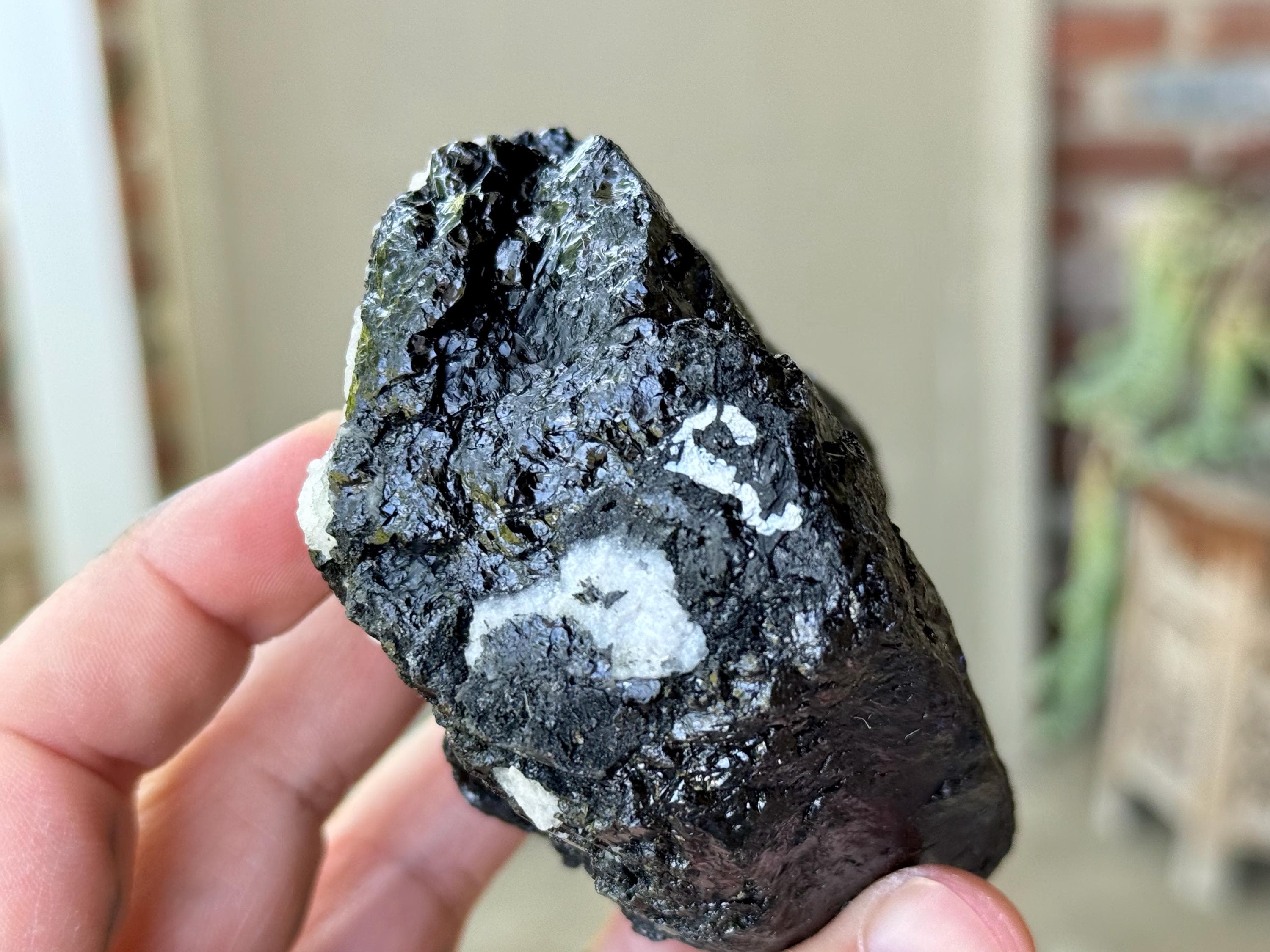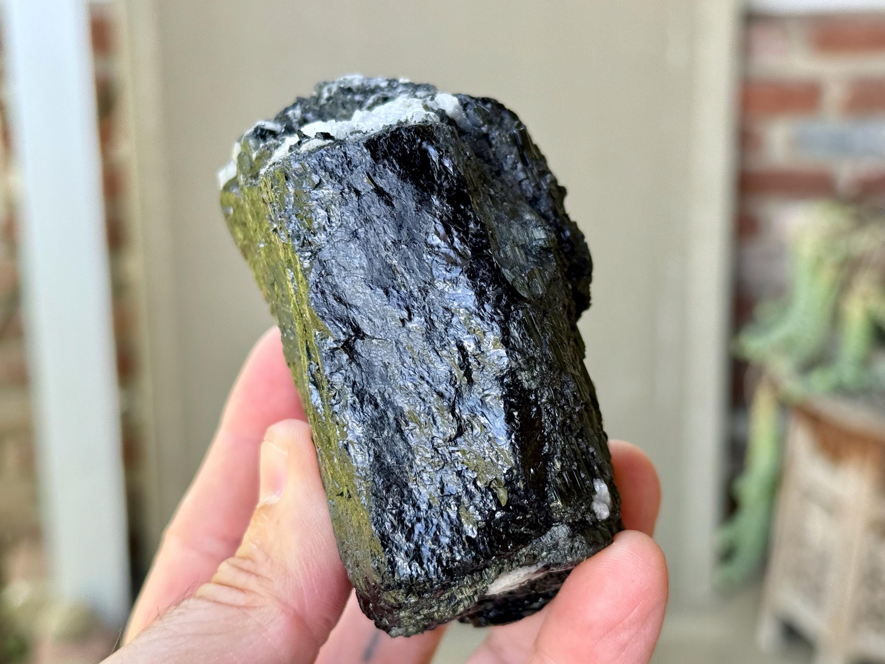Dark and elegant luster to this large Black Tourmaline crystal with beautifully defined vertical ridges and snowy inclusions of white Albite embedded on the exterior. The contrast between the dark and light here is striking!