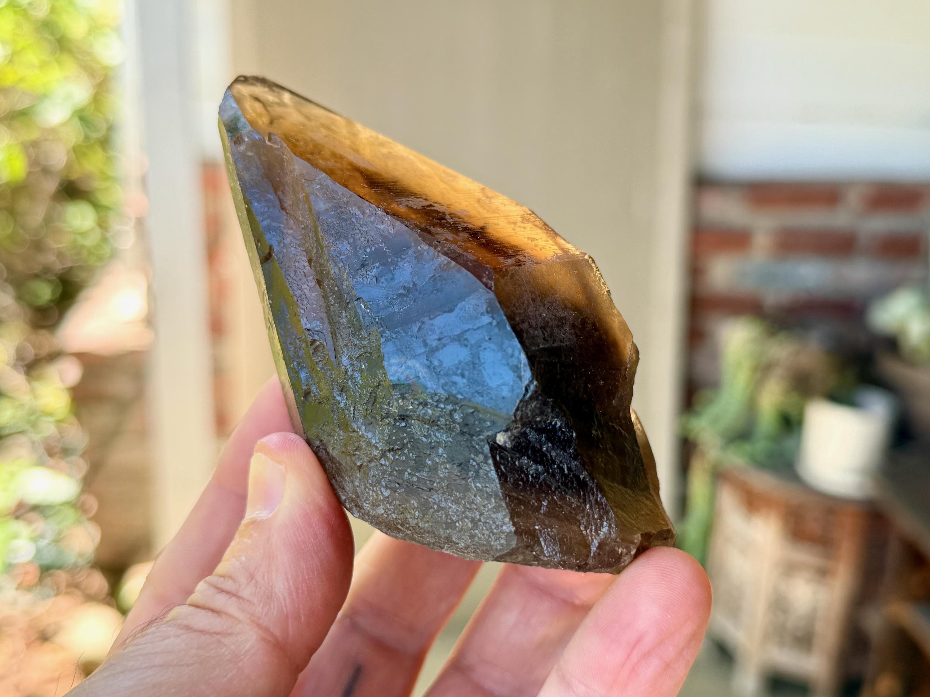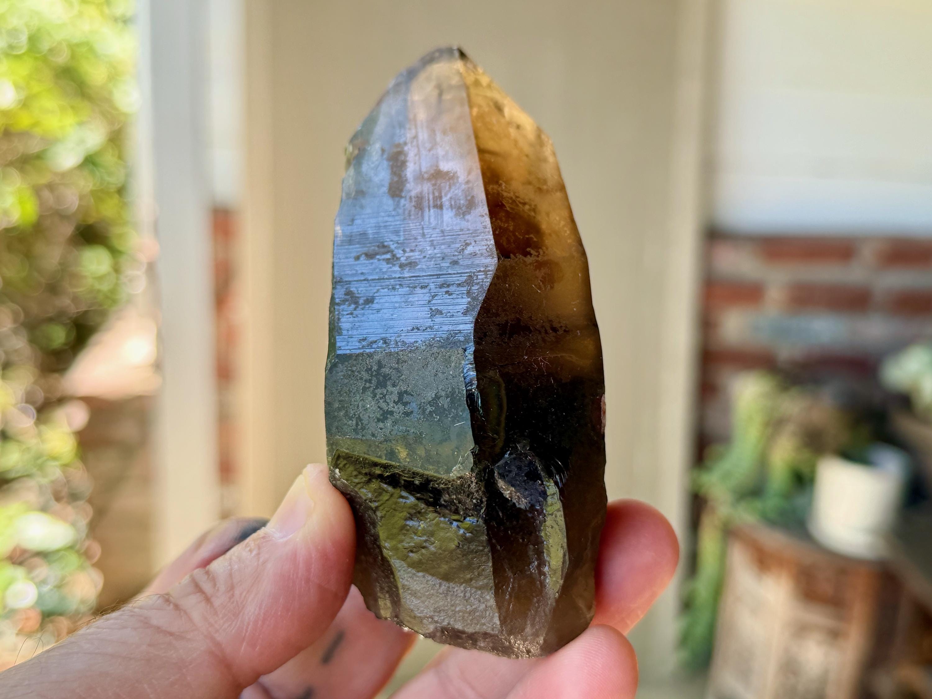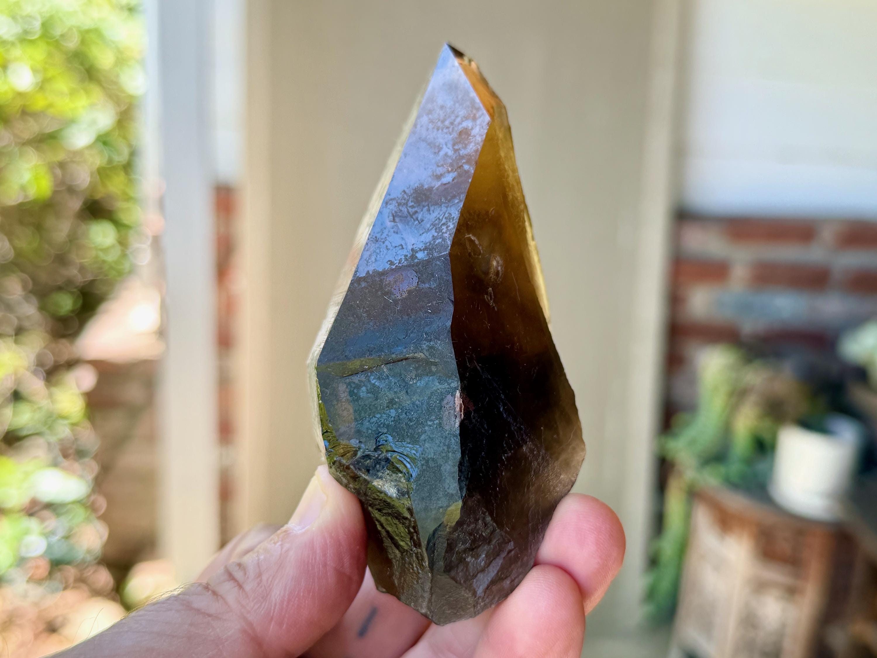 Gorgeous luster and a rich smoky-golden color to this outstanding Pele's Dream Lemurian. This crystal exhibits the gradient color zoning we love to see on these crystals, with a darker smoky base that blends into a clearer and more golden top portion. When backlit, as in Photos 4-6, we can see just how brilliantly it lights up.