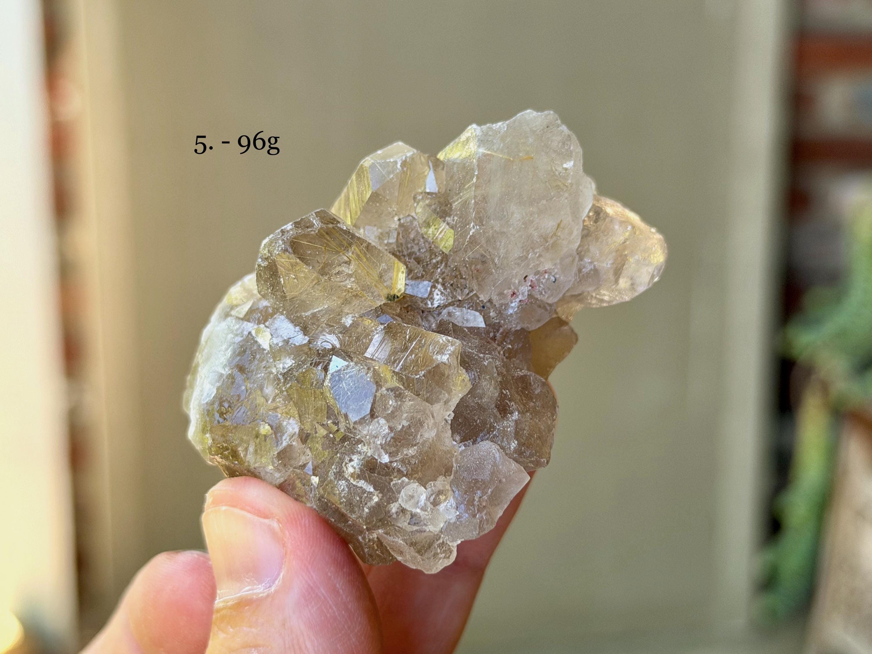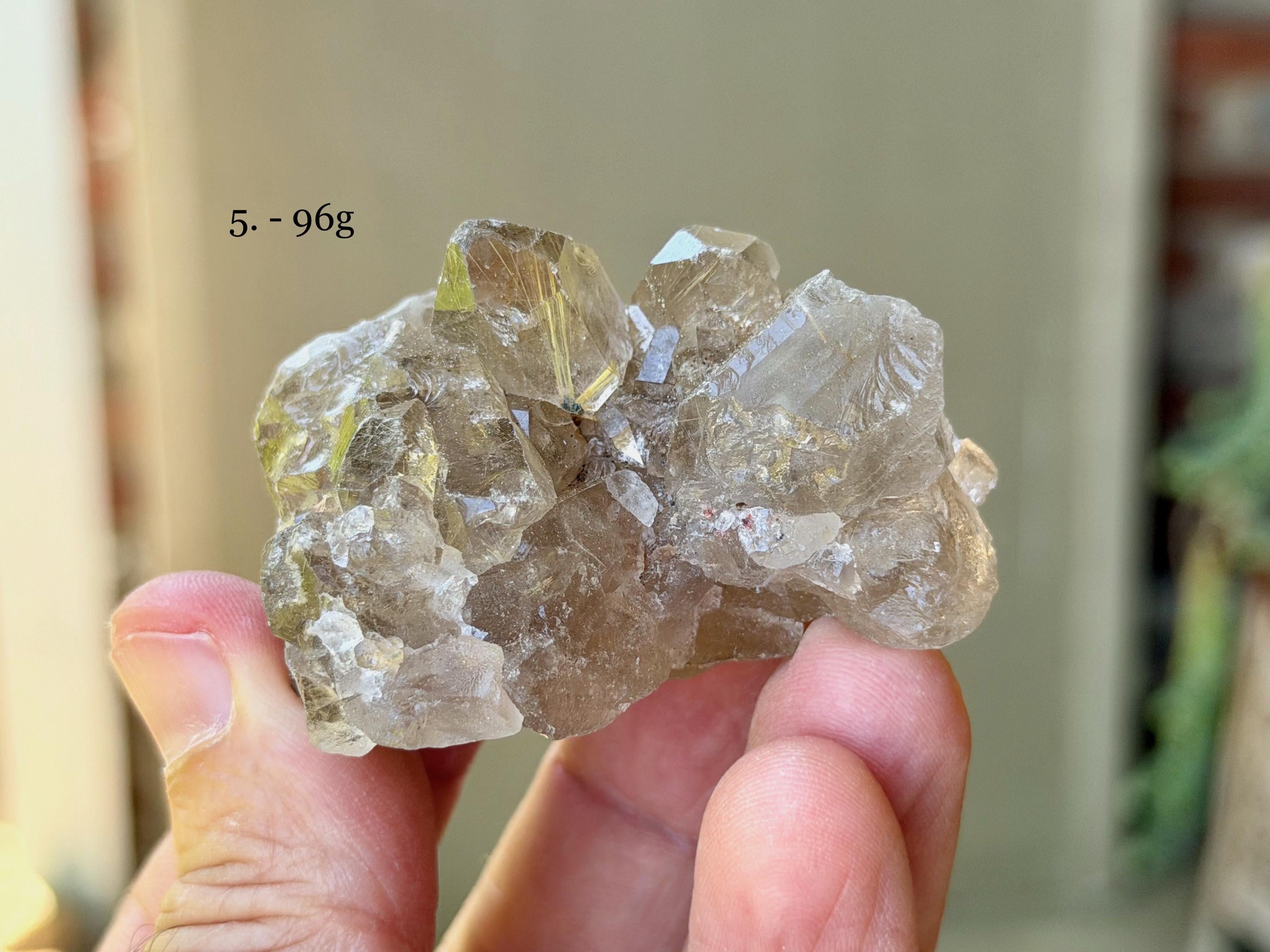 Brilliant luster and beautiful cluster formations to each of these Golden Rutile Quartz crystals. Most of these are Smoky Quartz (one is clear) and all have at least some inclusion of Golden Rutile within. Most of these inclusions are mild, but certainly visible. We've included photos of each in both natural light and direct sunlight.