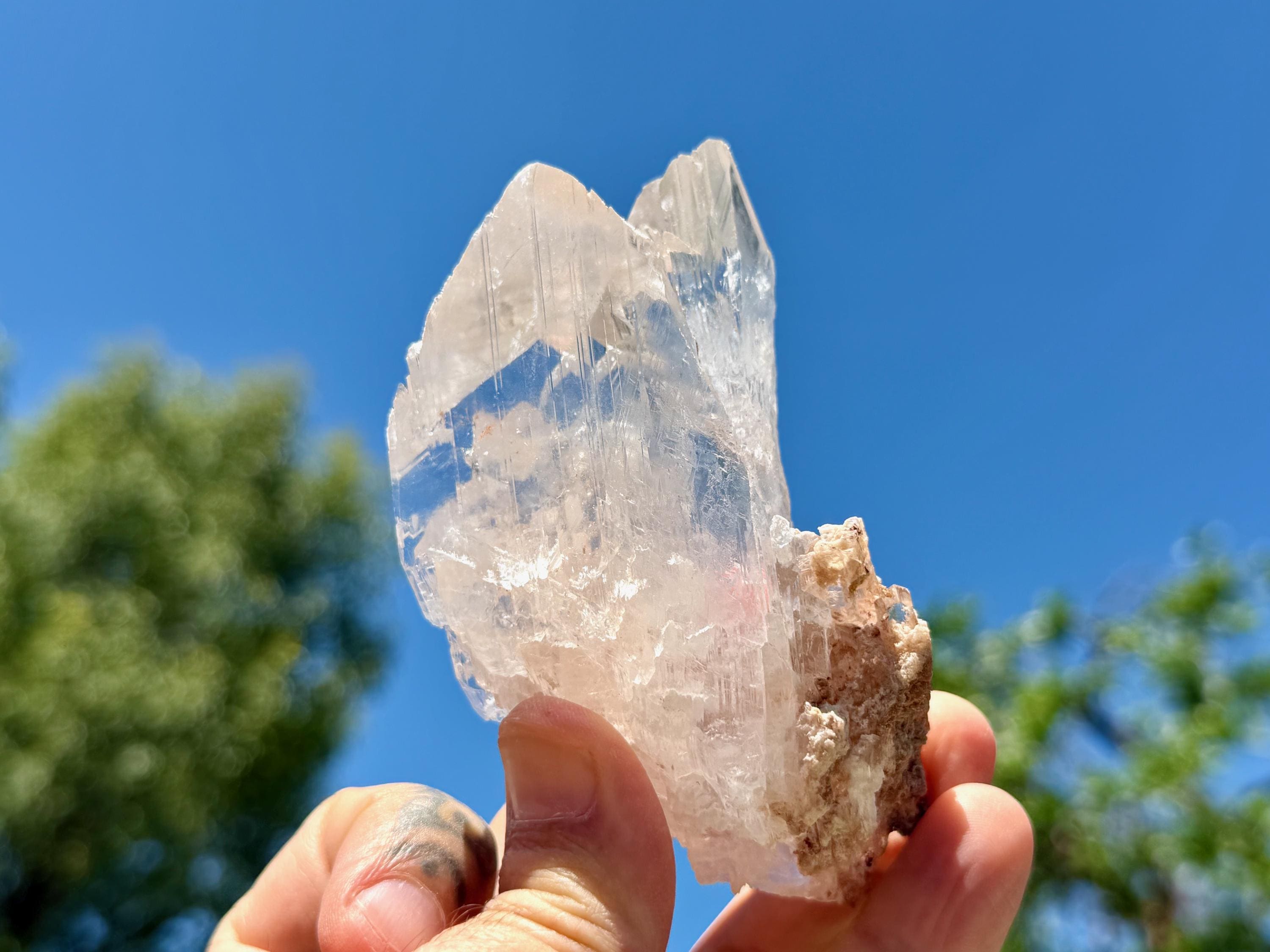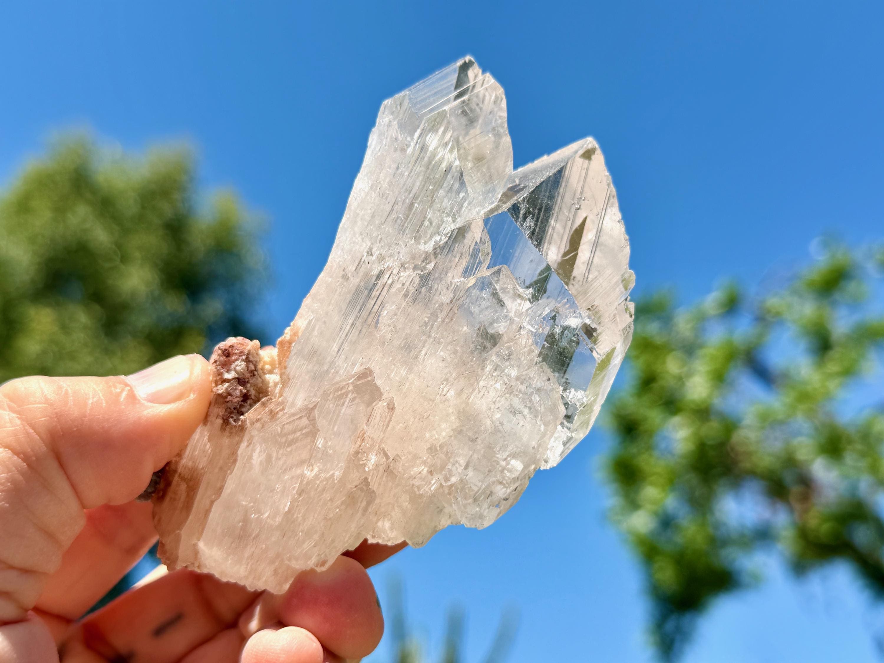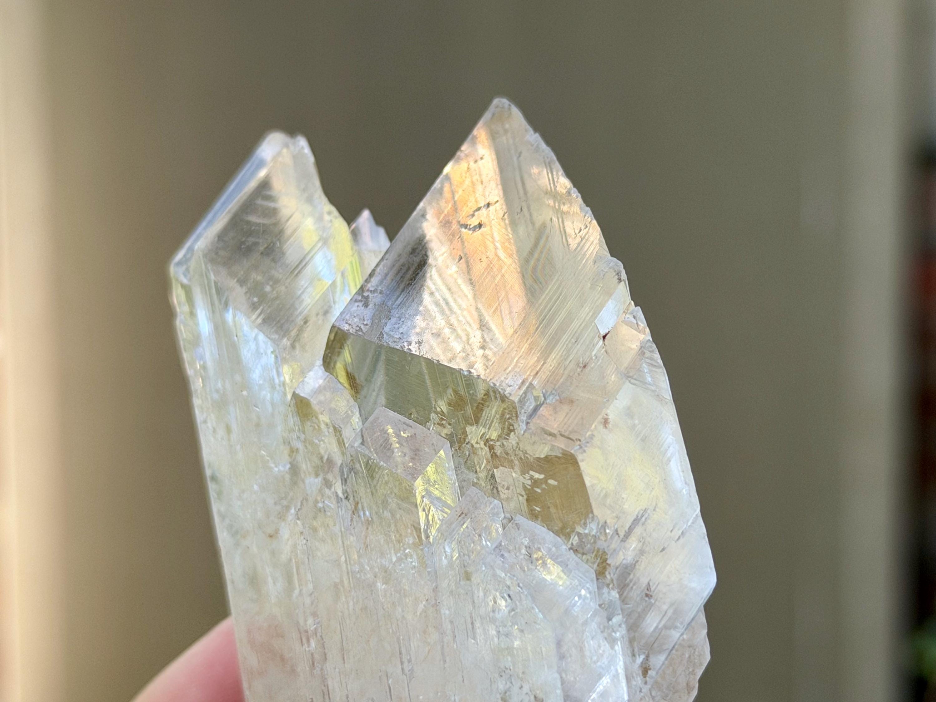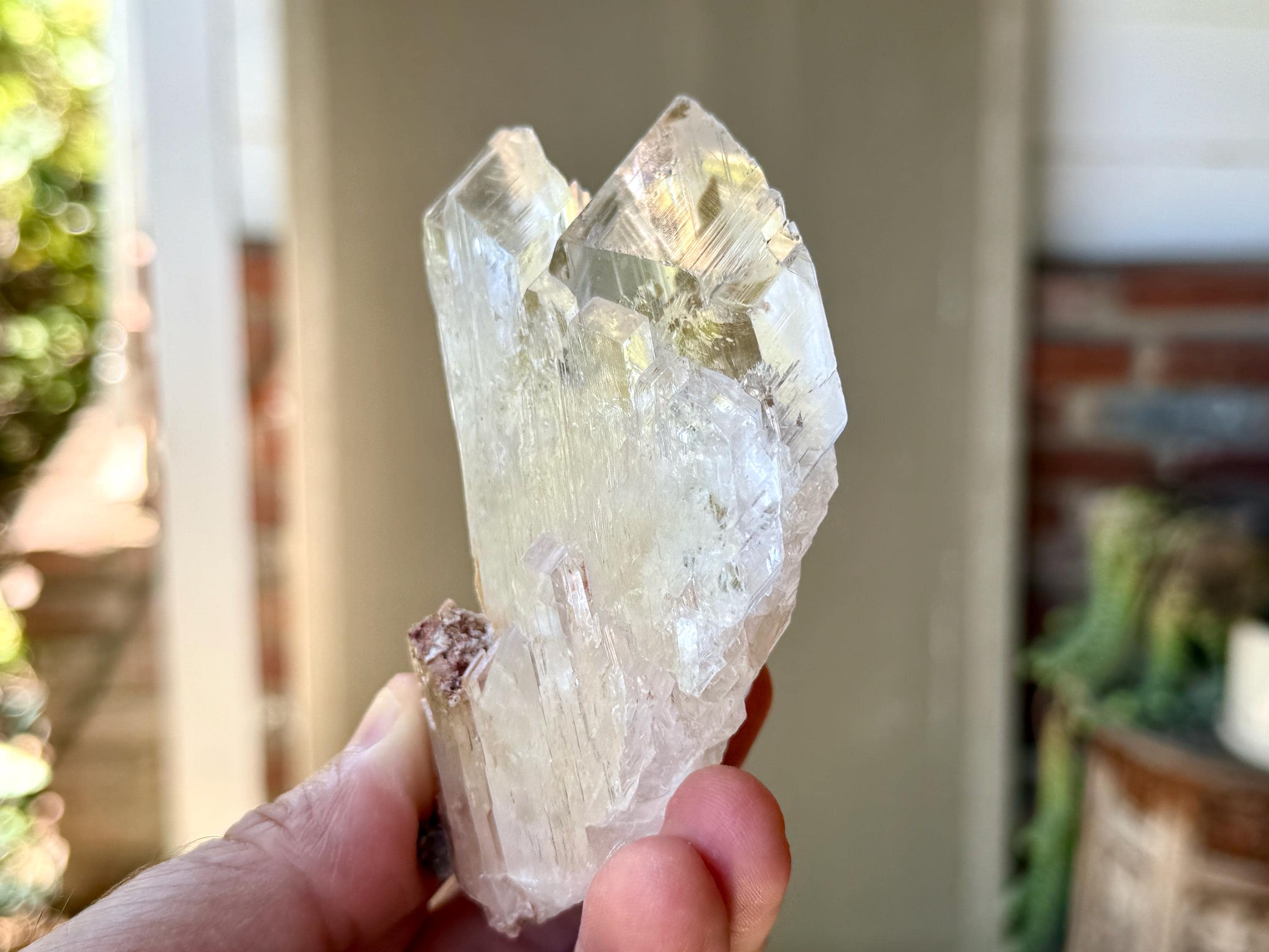 *Please note this crystal is clear and colorless. Any yellow hues in the photos are from the natural sunlight and surrounding greenery reflecting off the crystal.