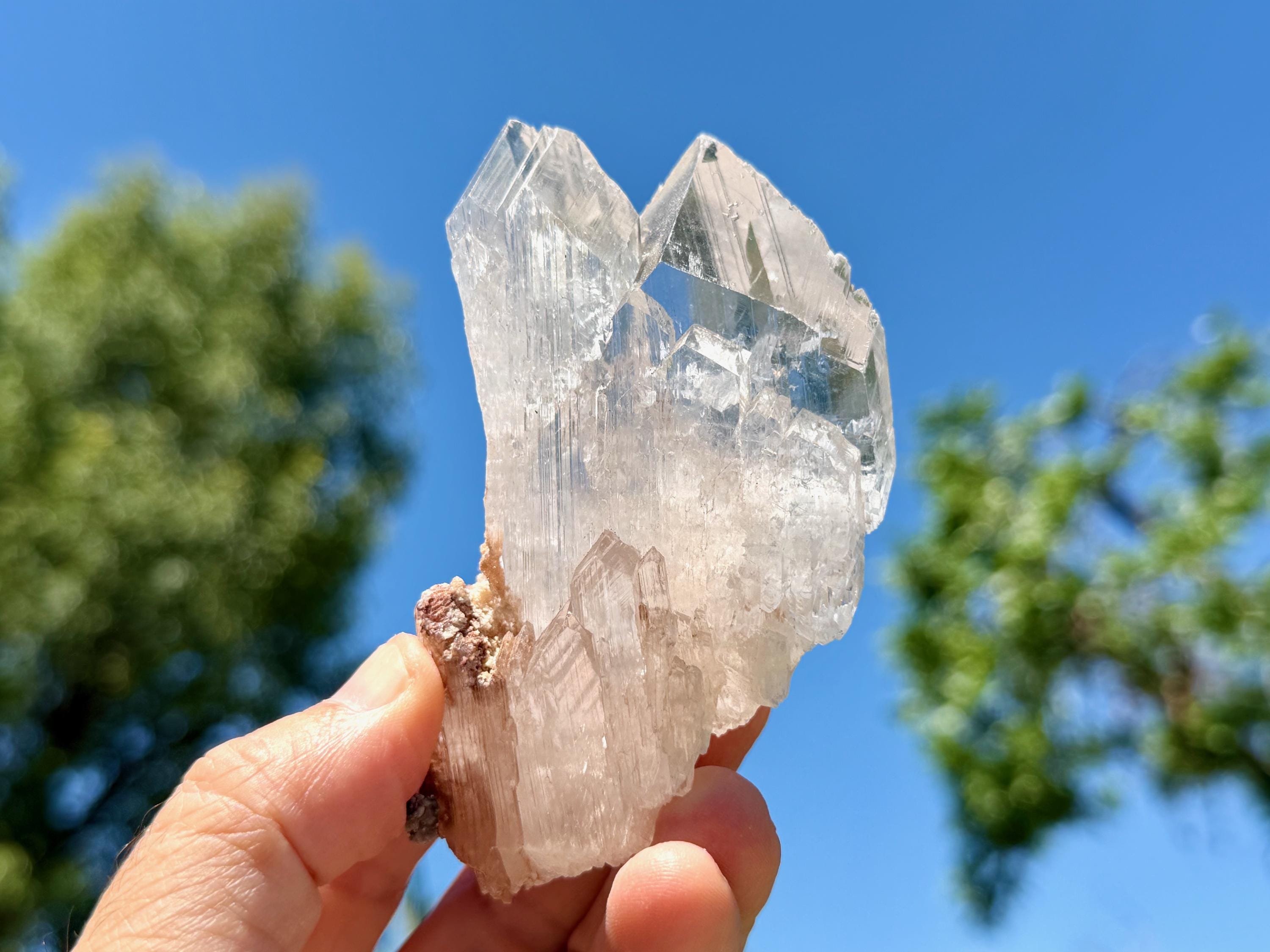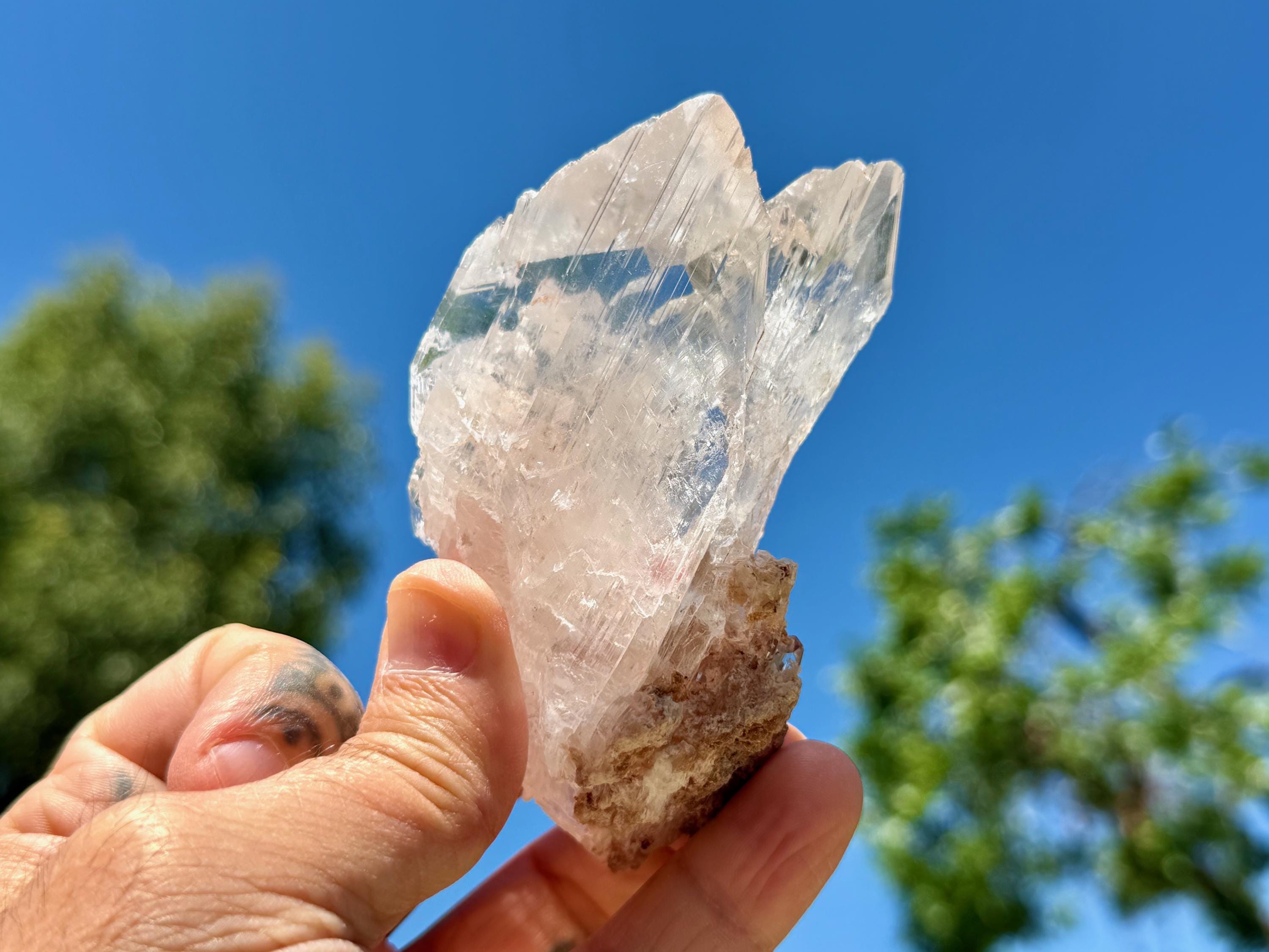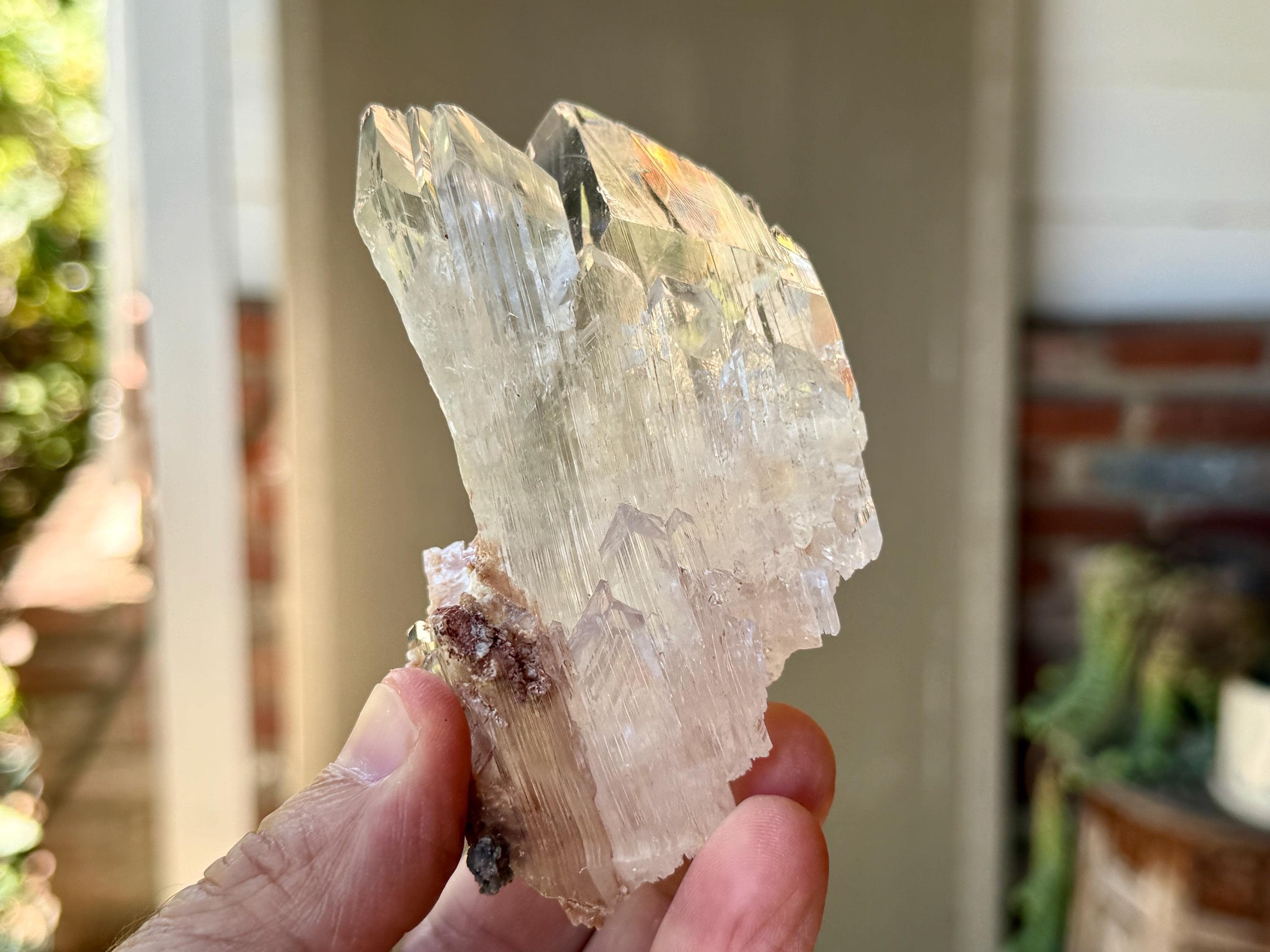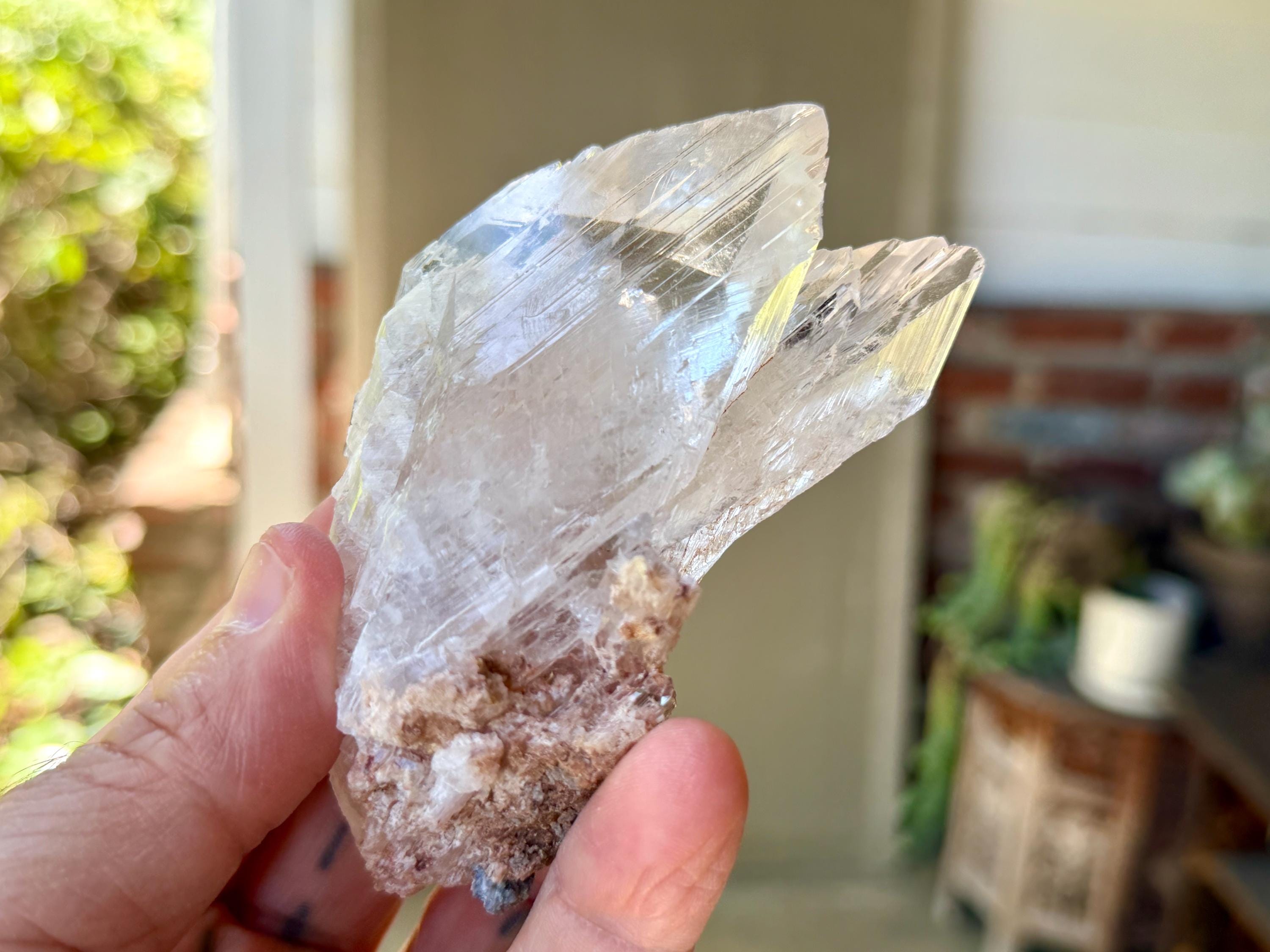*Please note this crystal is clear and colorless. Any yellow hues in the photos are from the natural sunlight and surrounding greenery reflecting off the crystal.