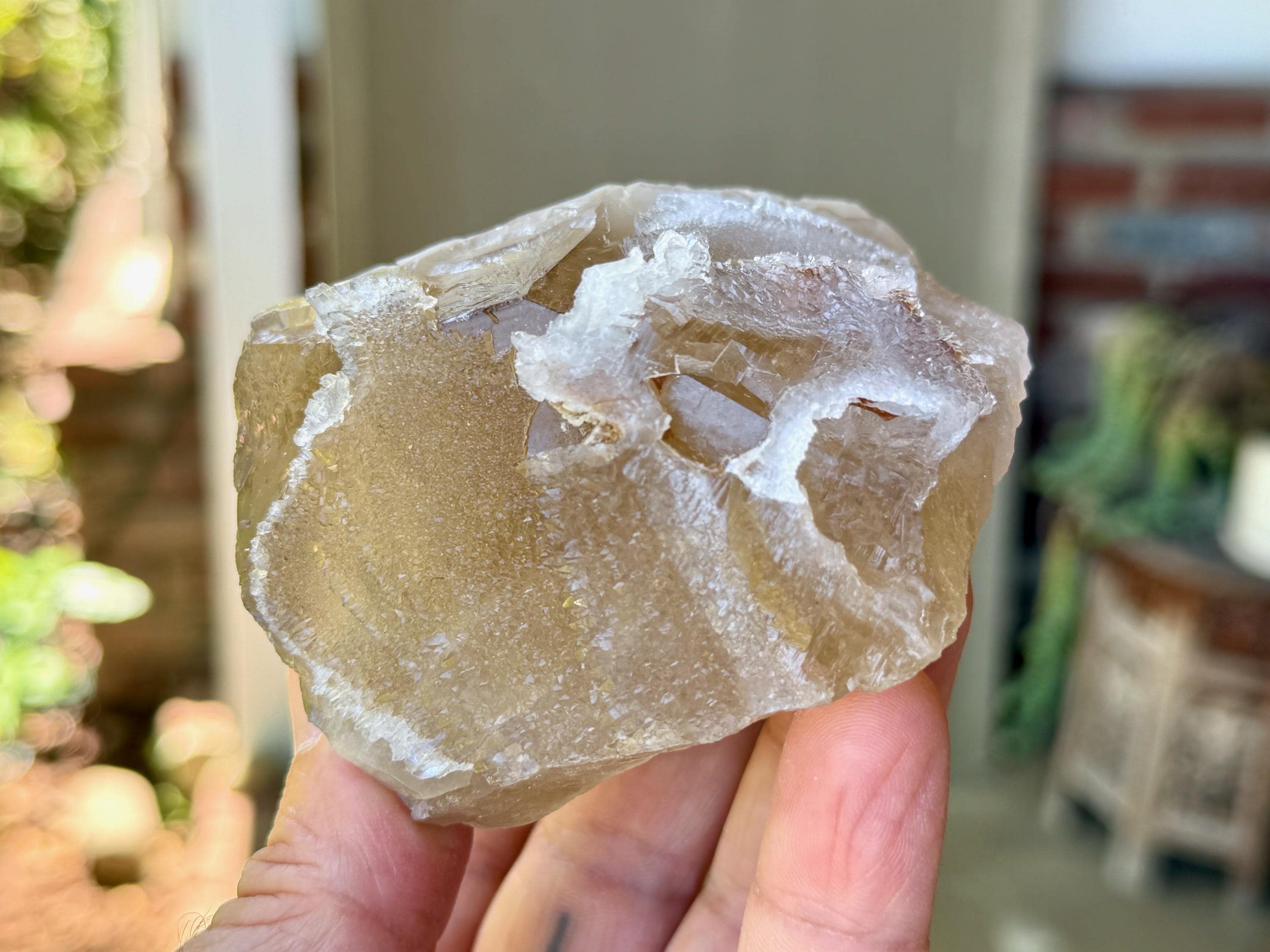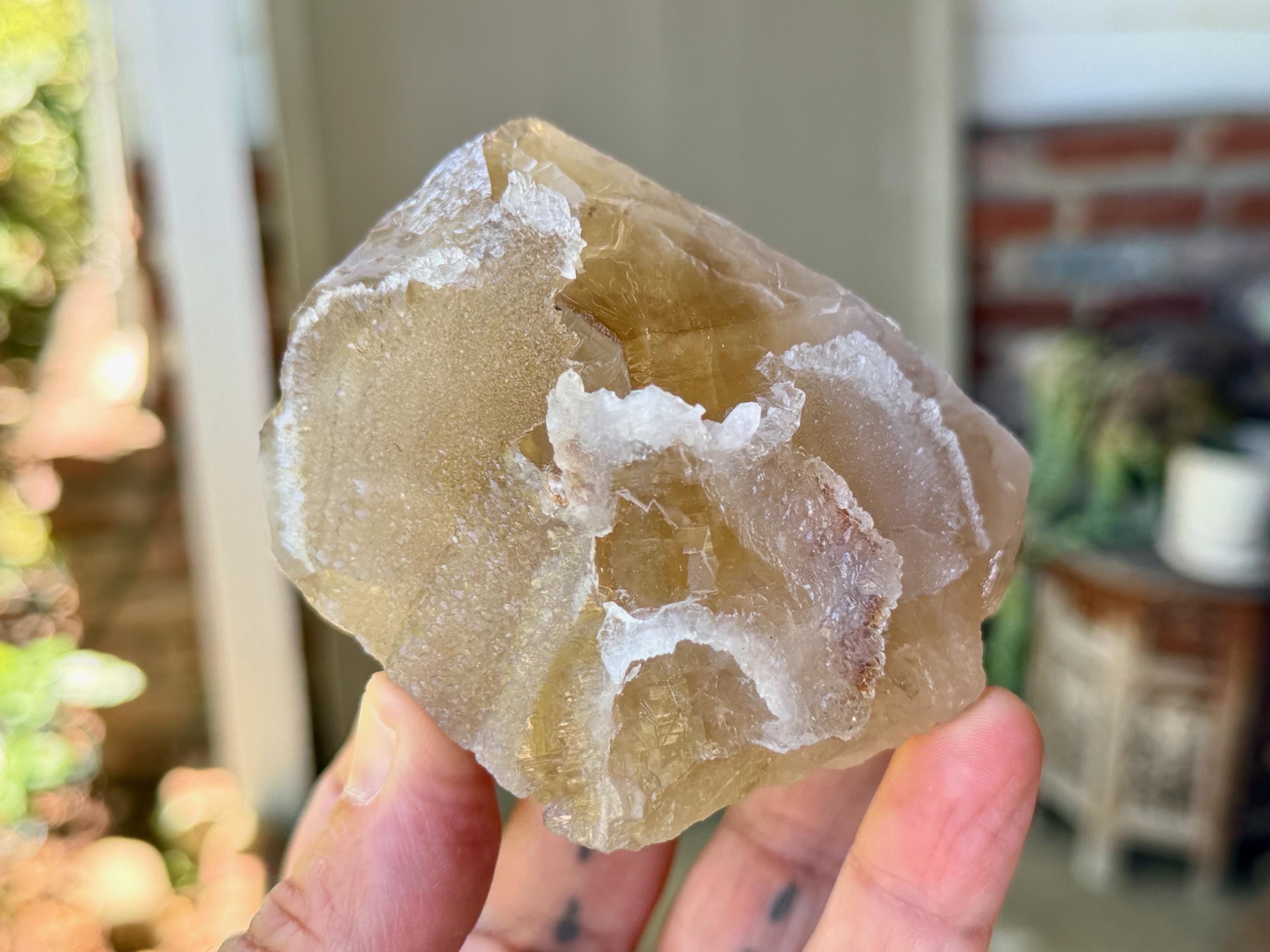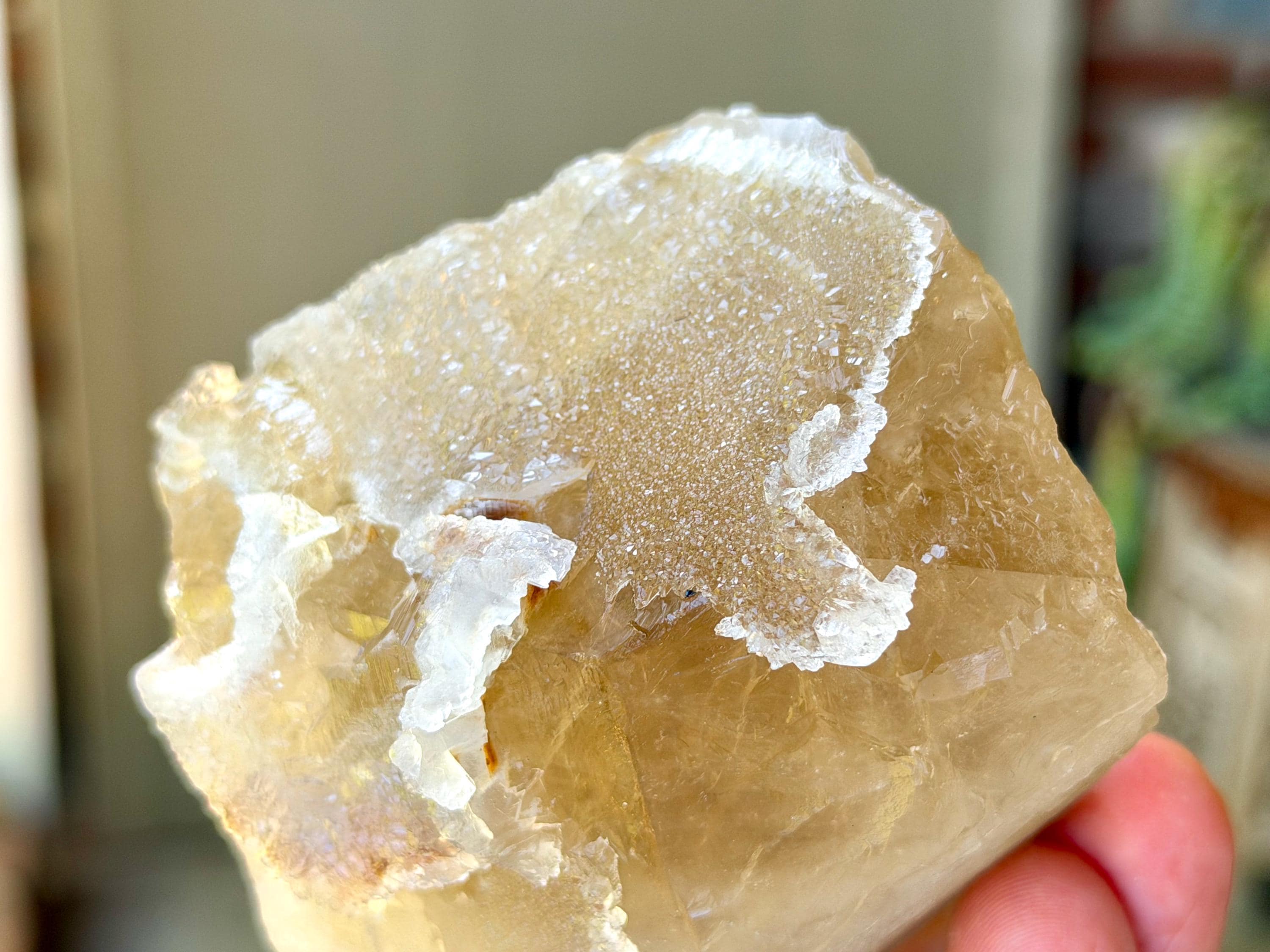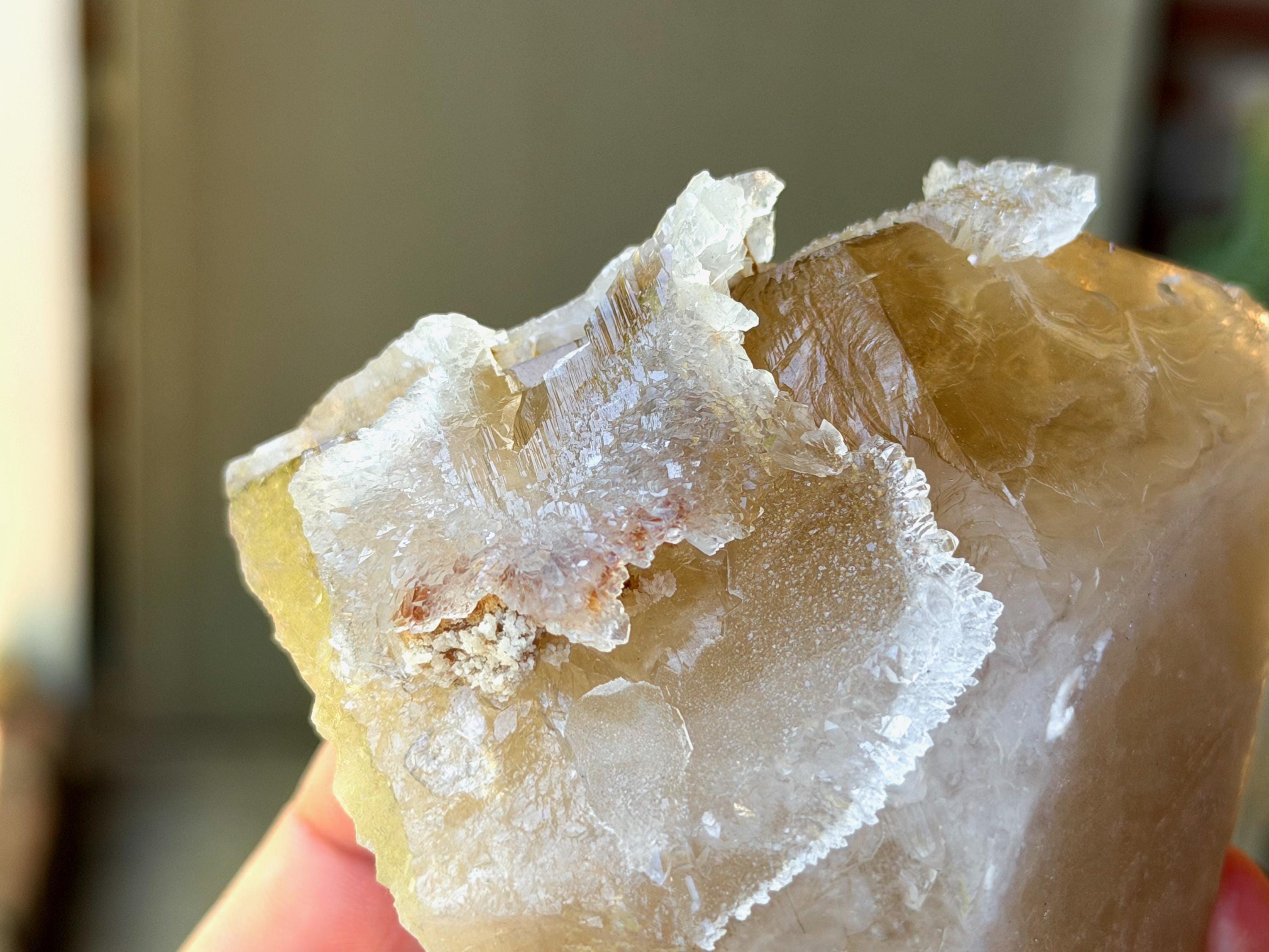 This crystal exhibits a rich, golden color and marvelous luster. It features a crystalline reef of sparkling Canga Rose Quartz that has grown on the exterior. Please note, this Rose Quartz is *very* mild in color, it does not have very much of a pink color, only the slightest tinge. But it *is* Canga Rose Quartz, and it presents here with a sugary complexion that is absolutely gorgeous!