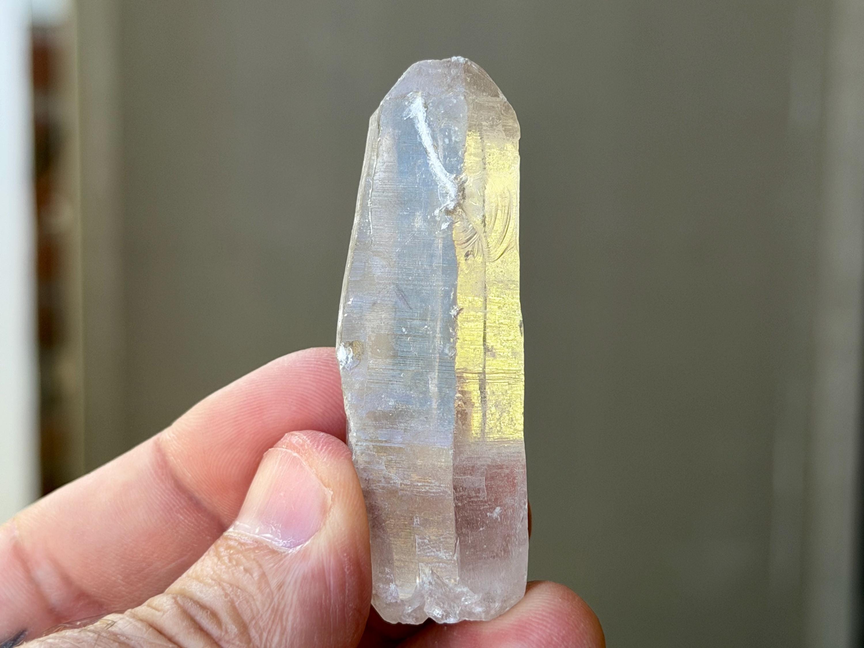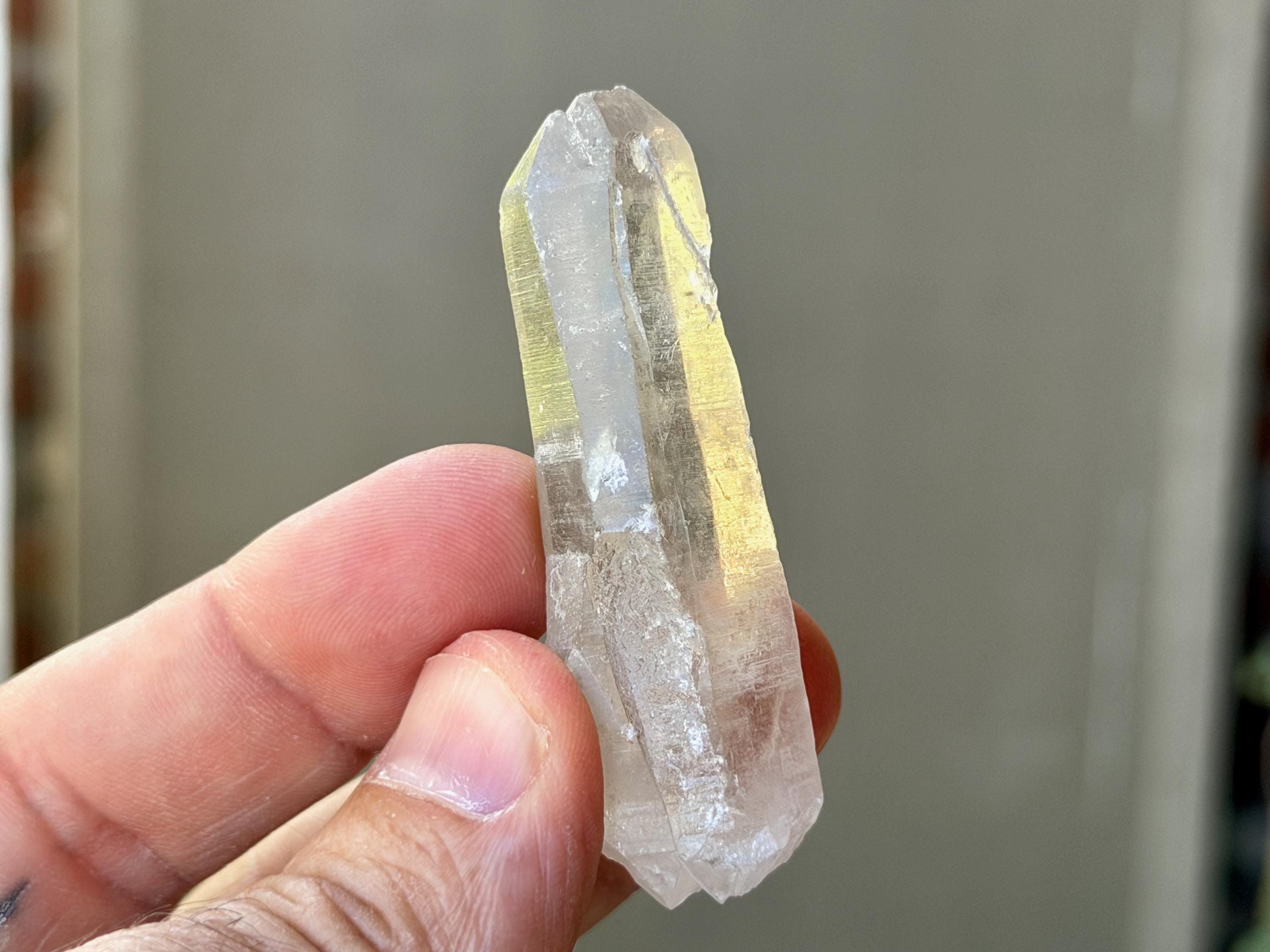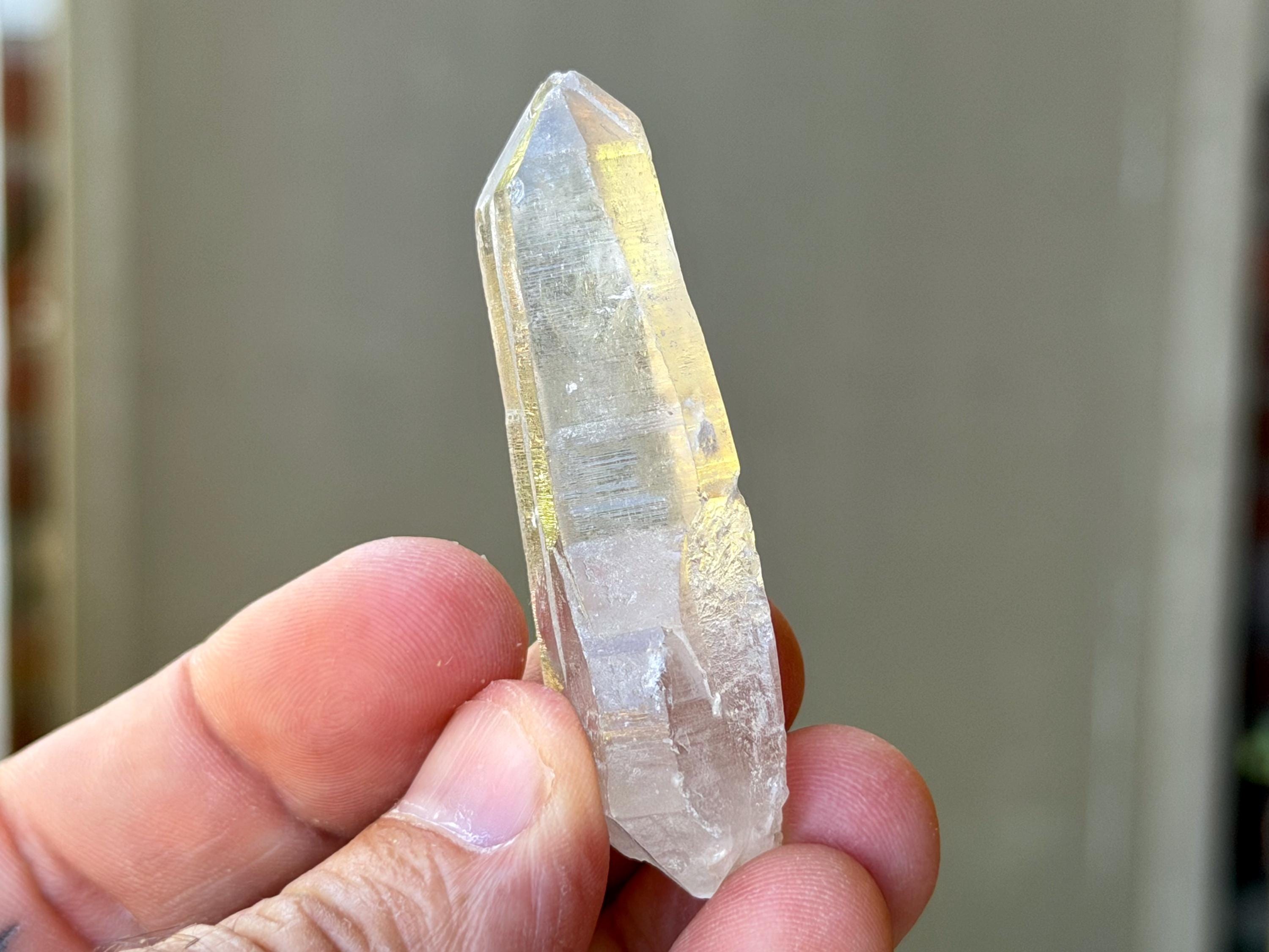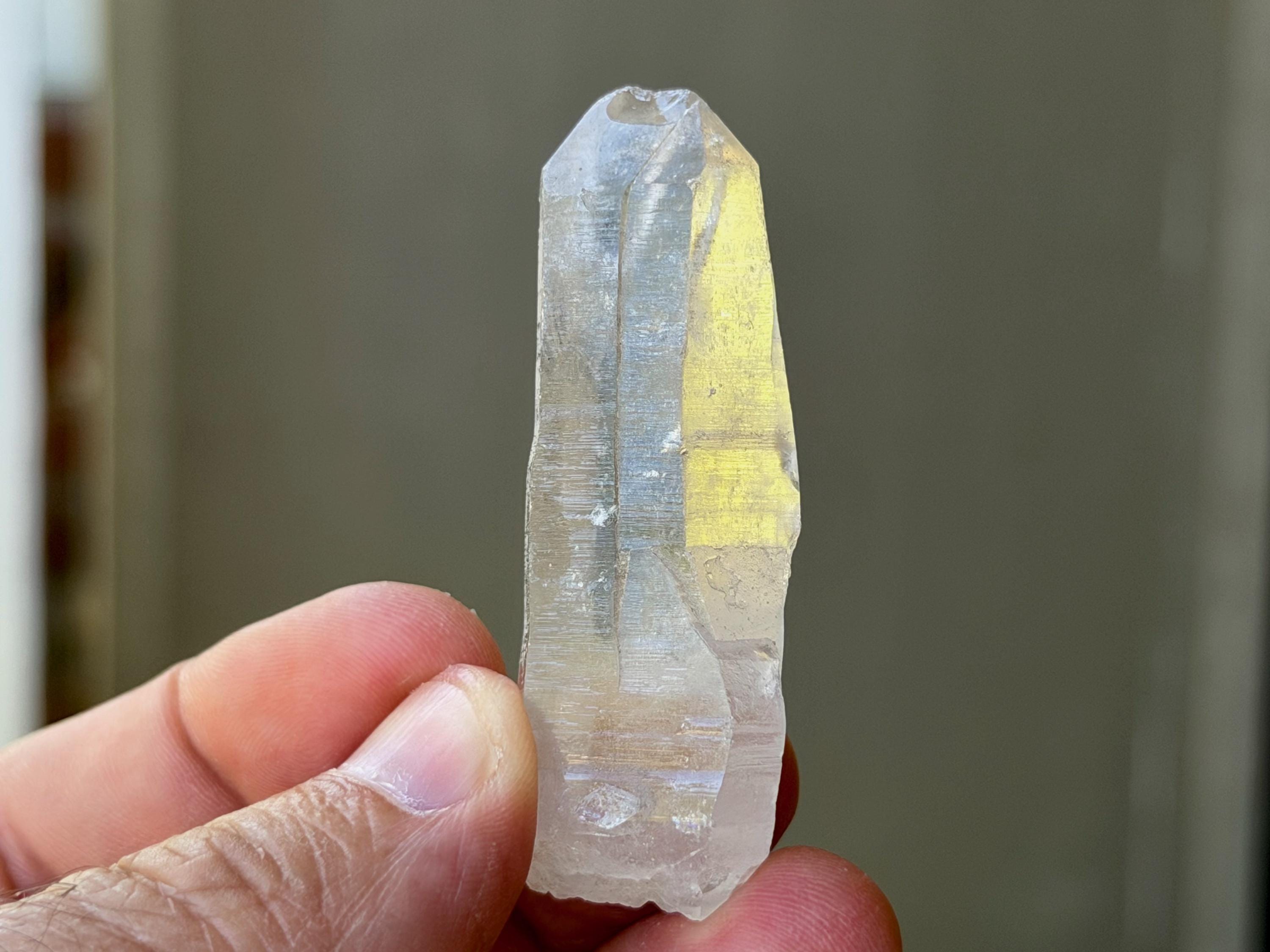 *Please note this crystal is clear and colorless. Any yellow hues in the photos are from the natural sunlight and surrounding environment reflecting off the crystal.