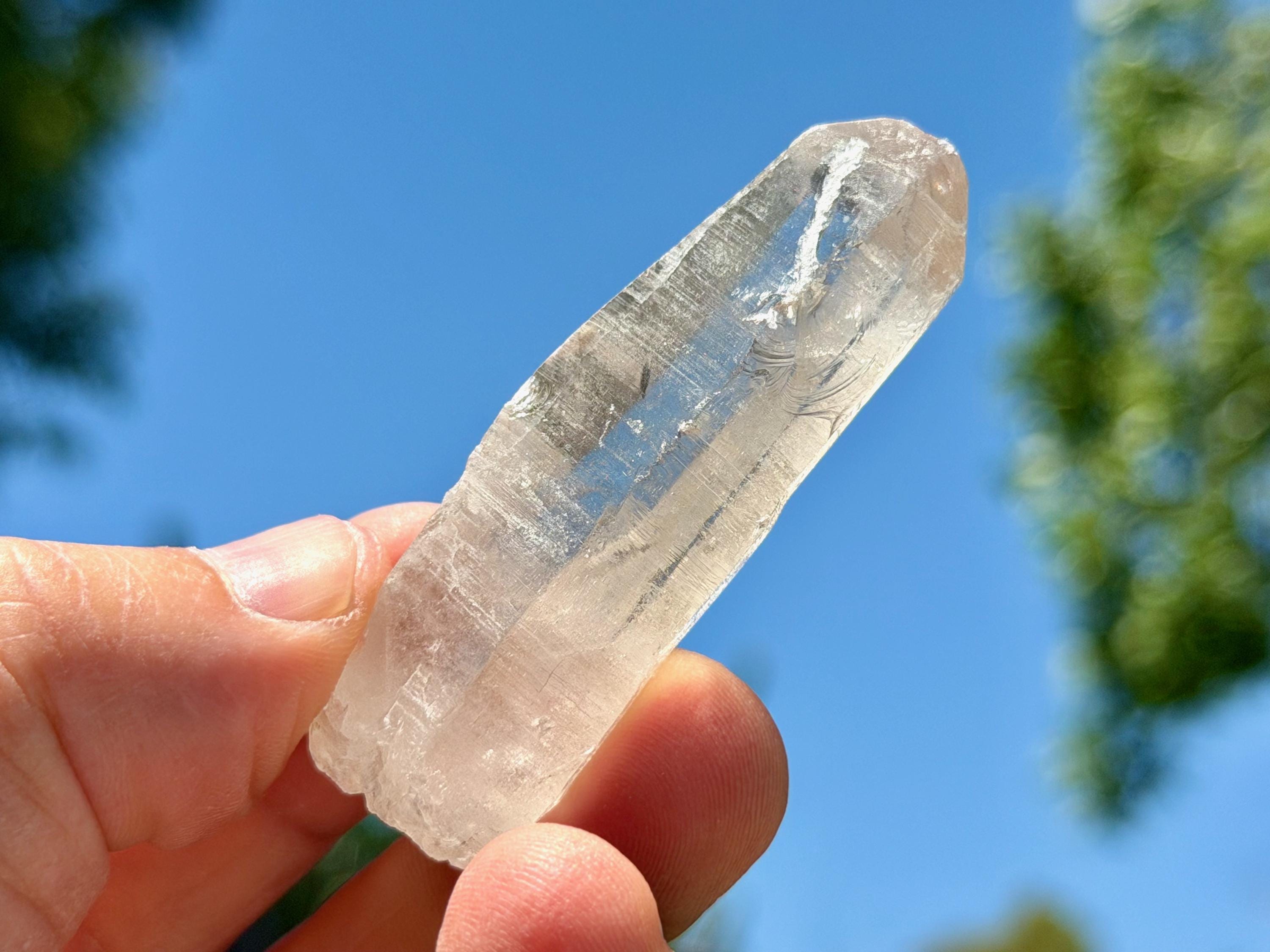 Superb clarity and wonderful luster to this sweet Sacred Scribe Lemurian Quartz crystal. This crystal features finely etched striations on its sides and an elongated formation.