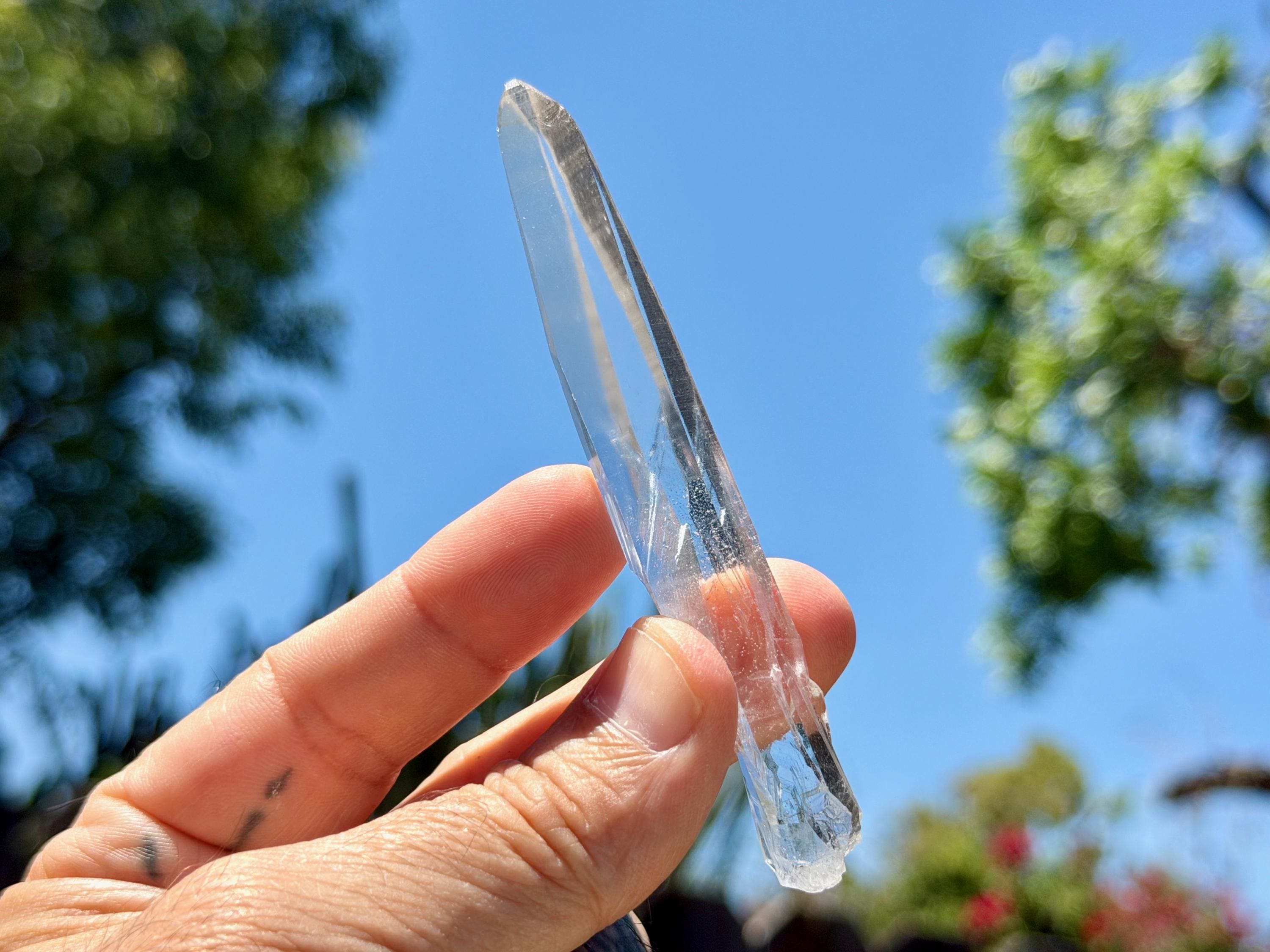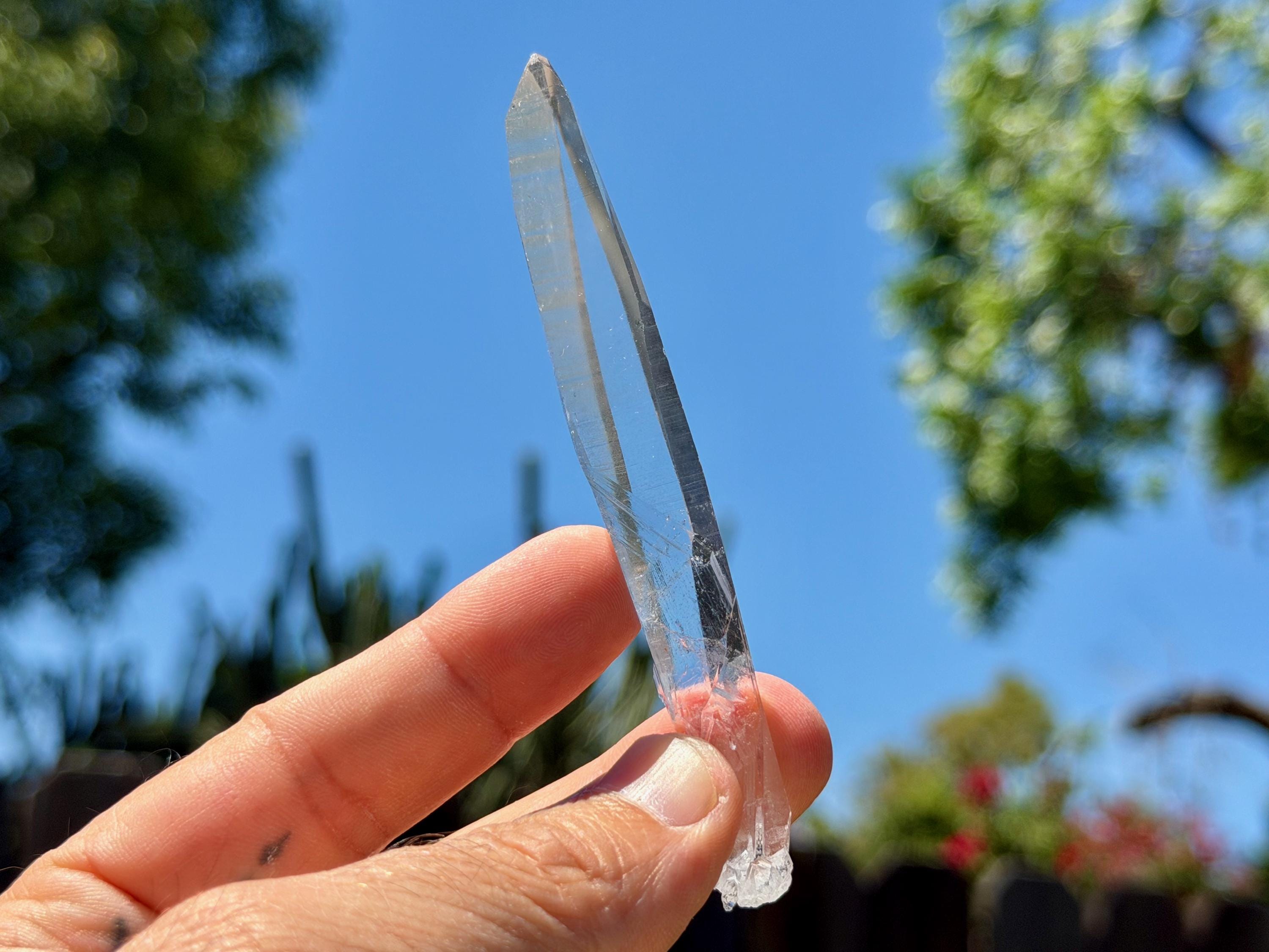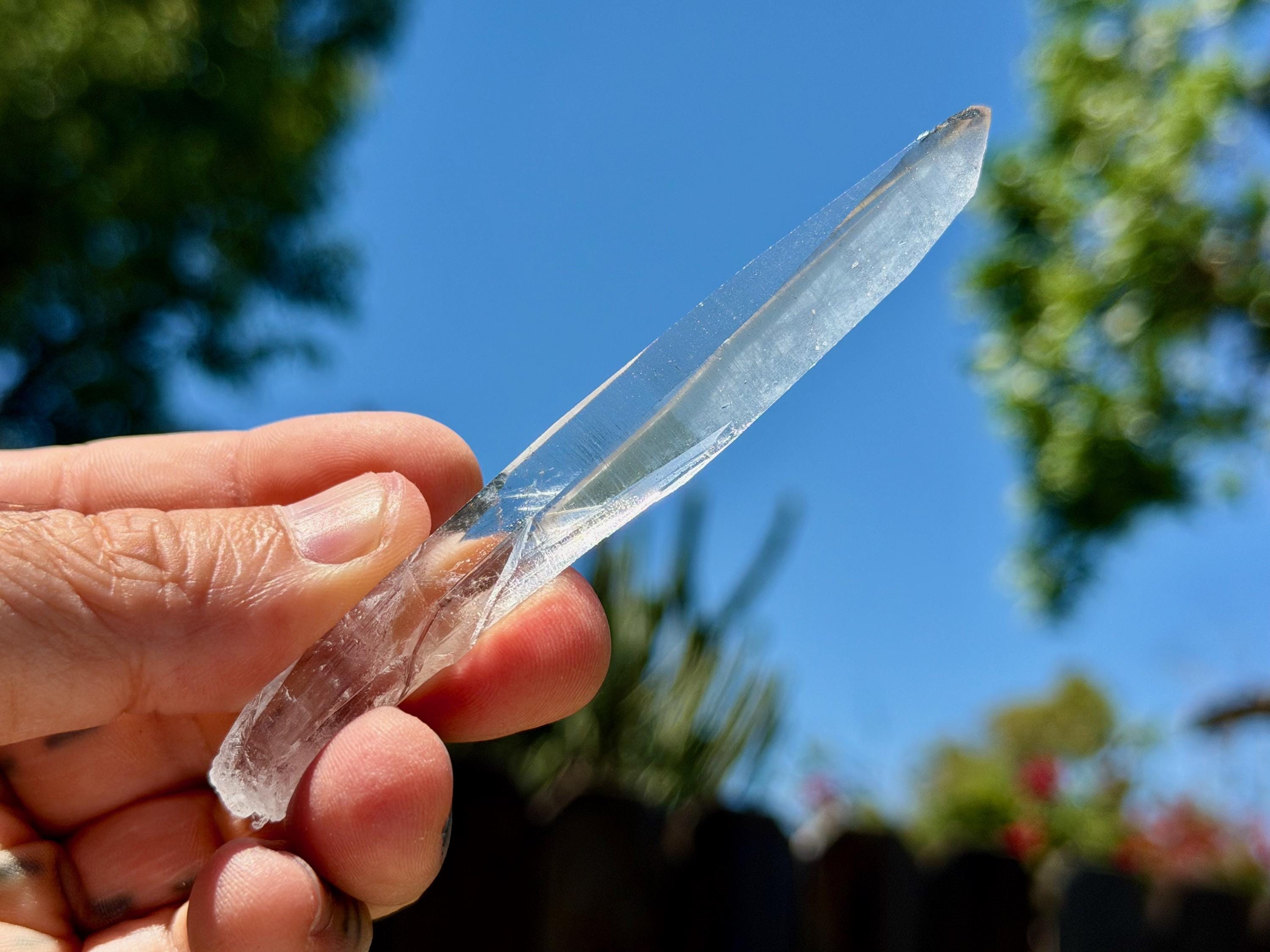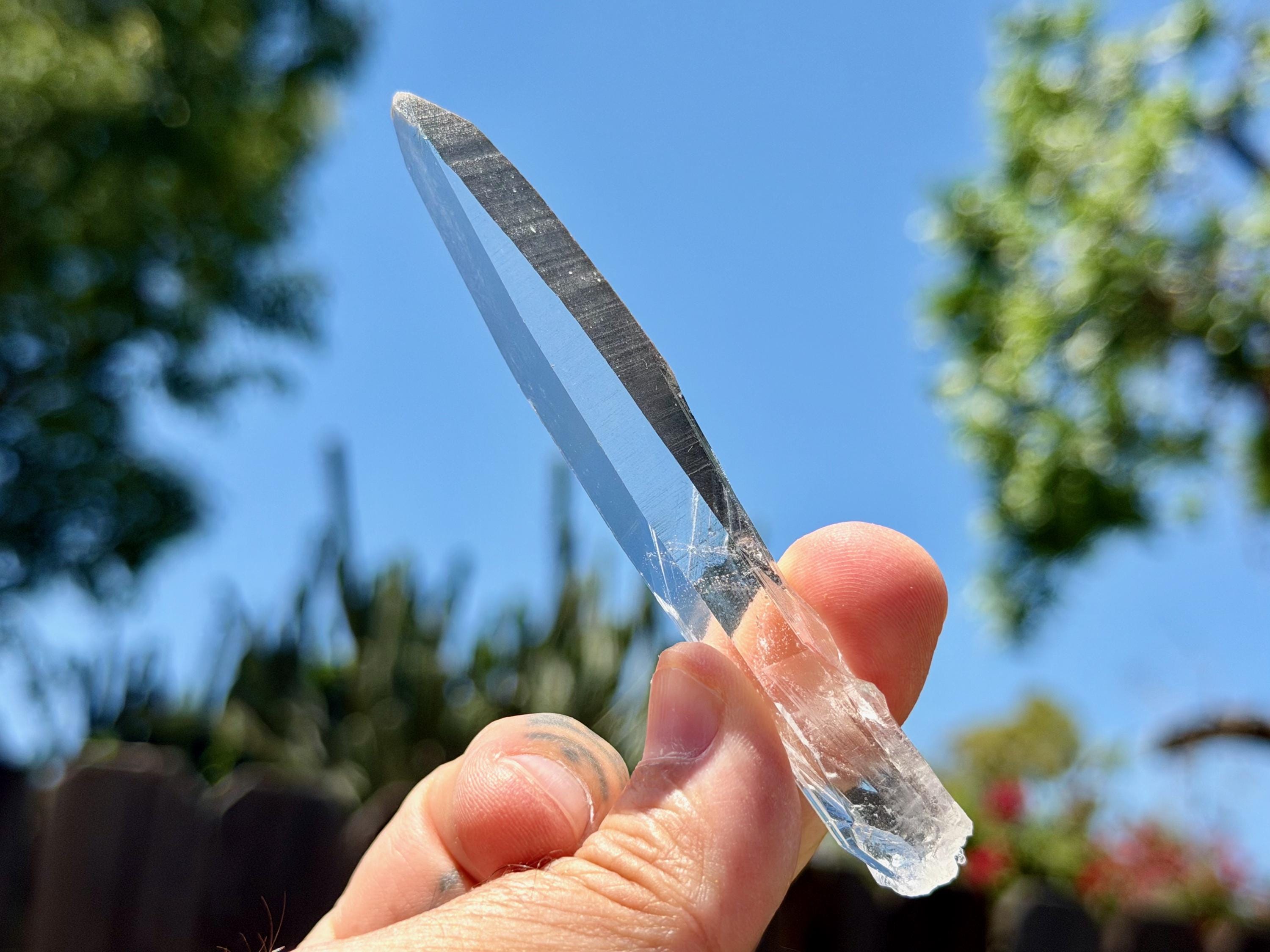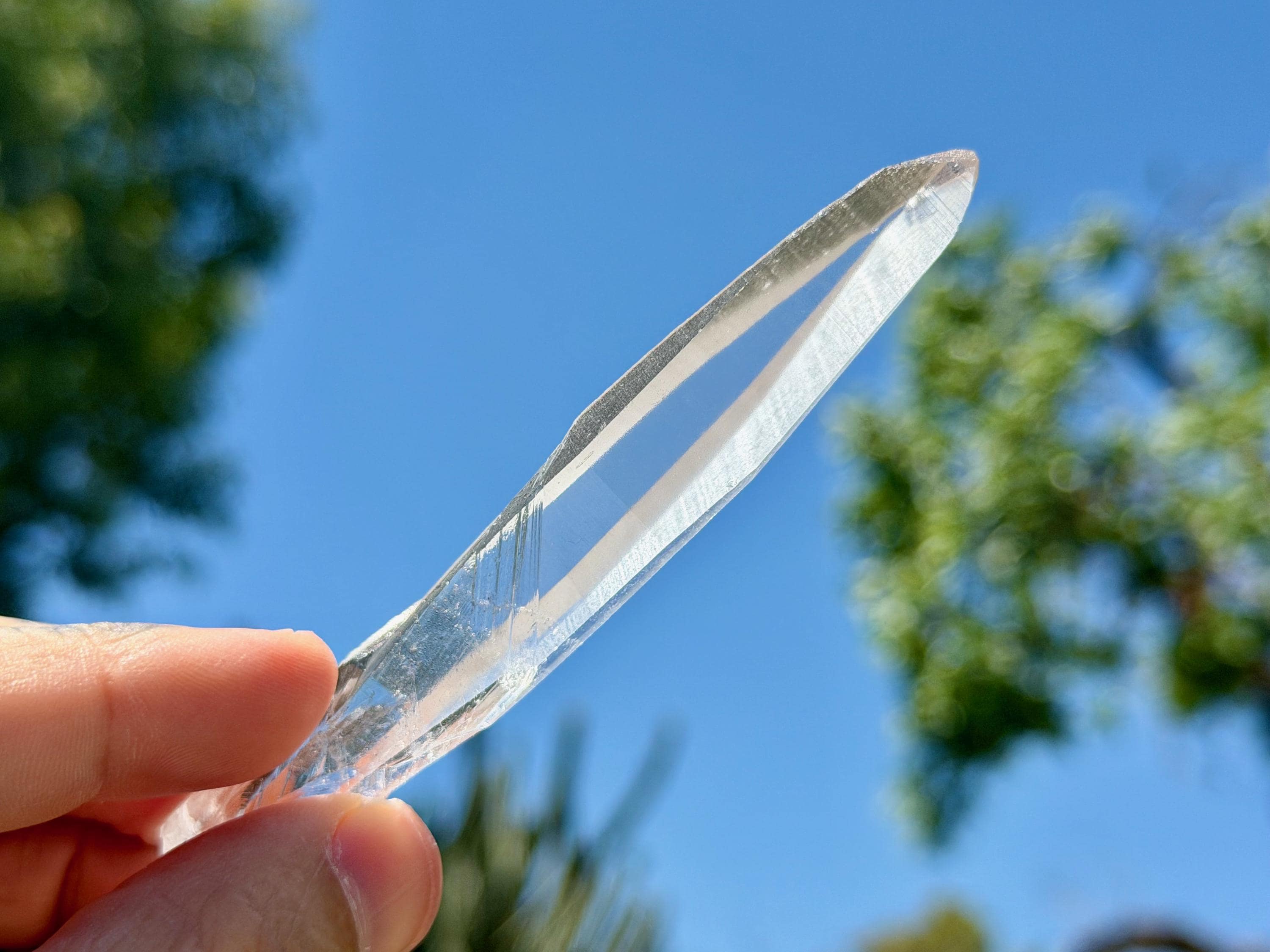 Exquisite, glassy luster and water-clear clarity to this brilliant Lemurian Quartz crystal in an elongated "laser wand" formation. This crystal simply disappears against the blue sky when you hold it up, it's like glass!