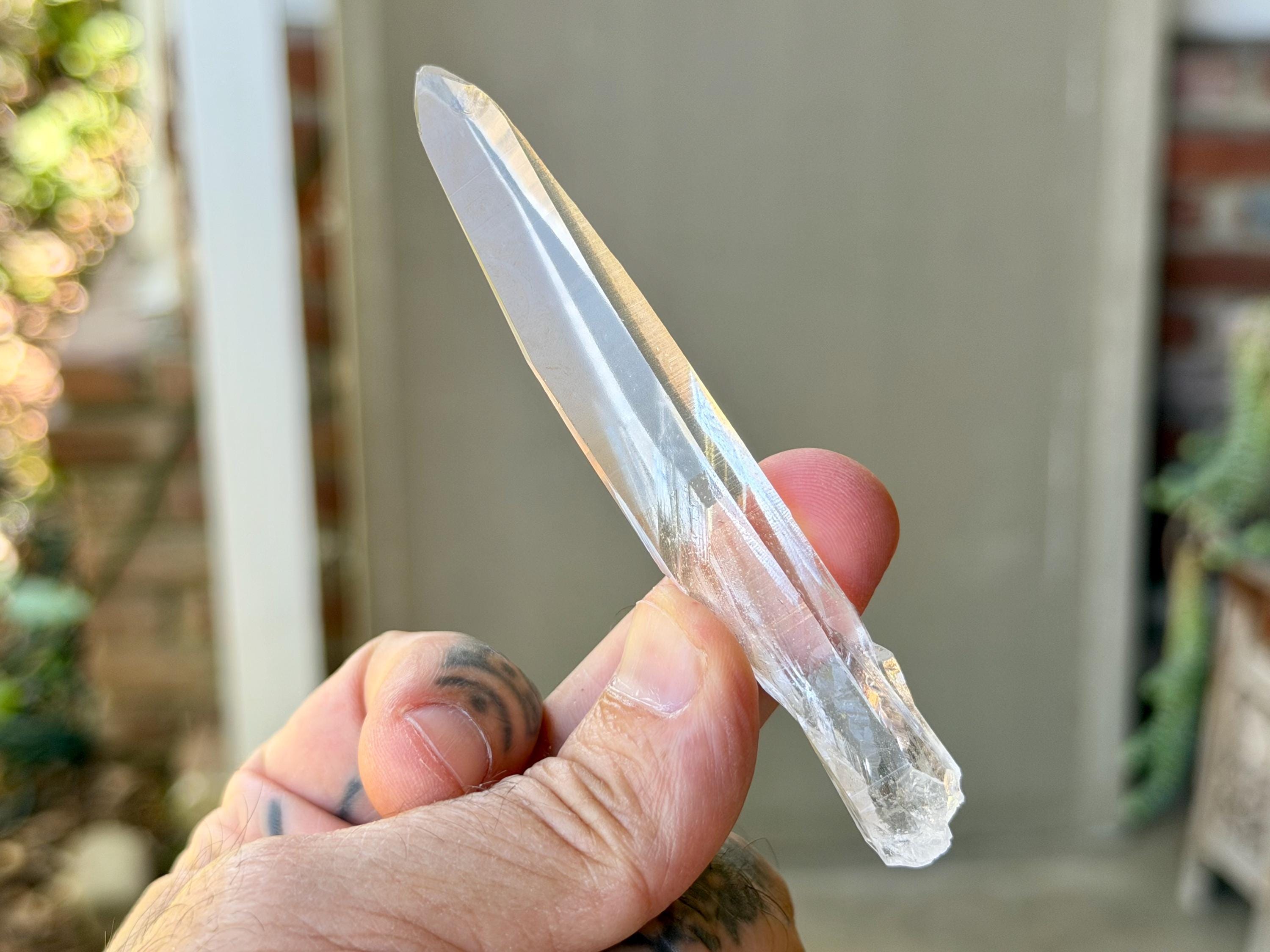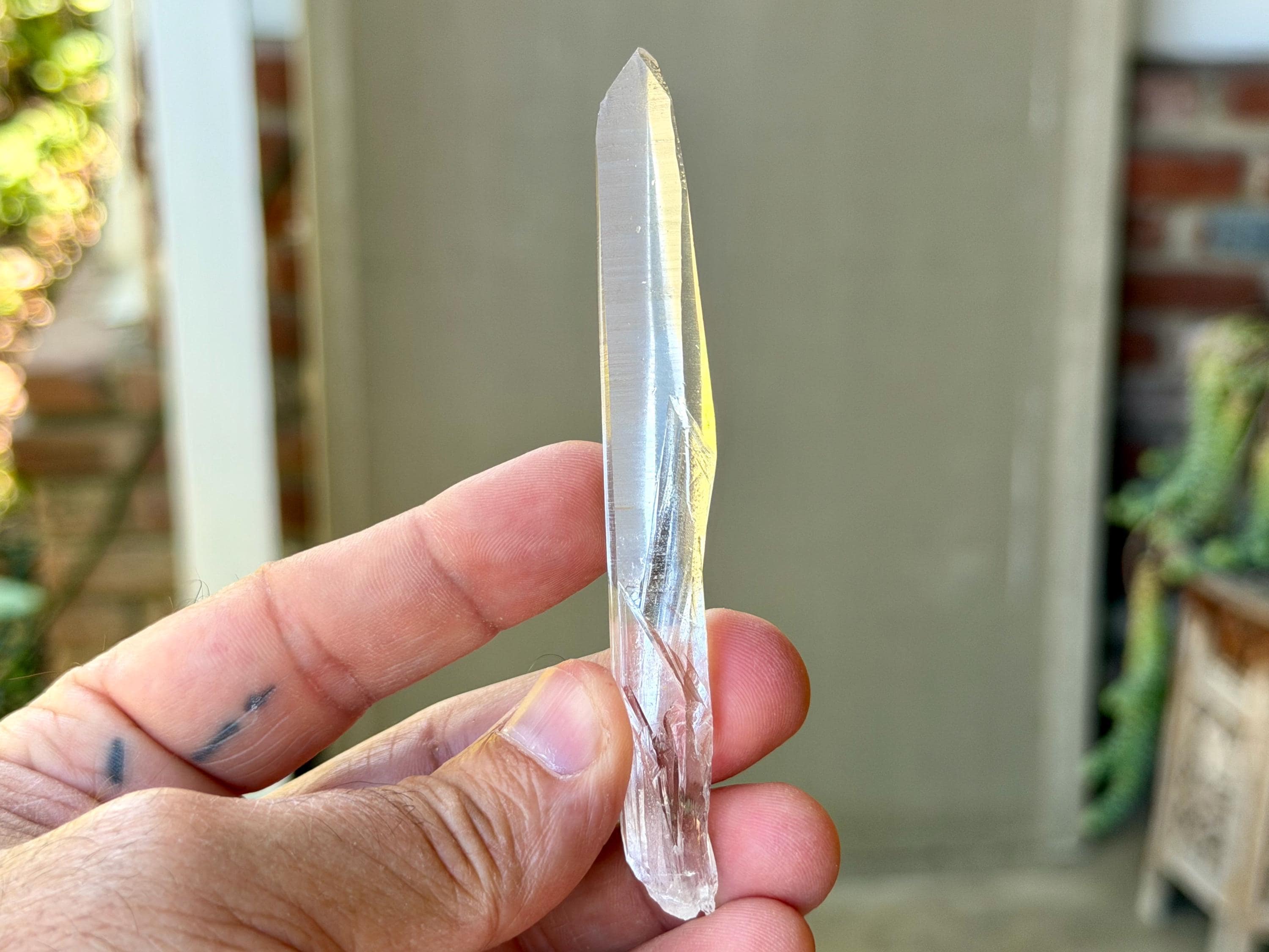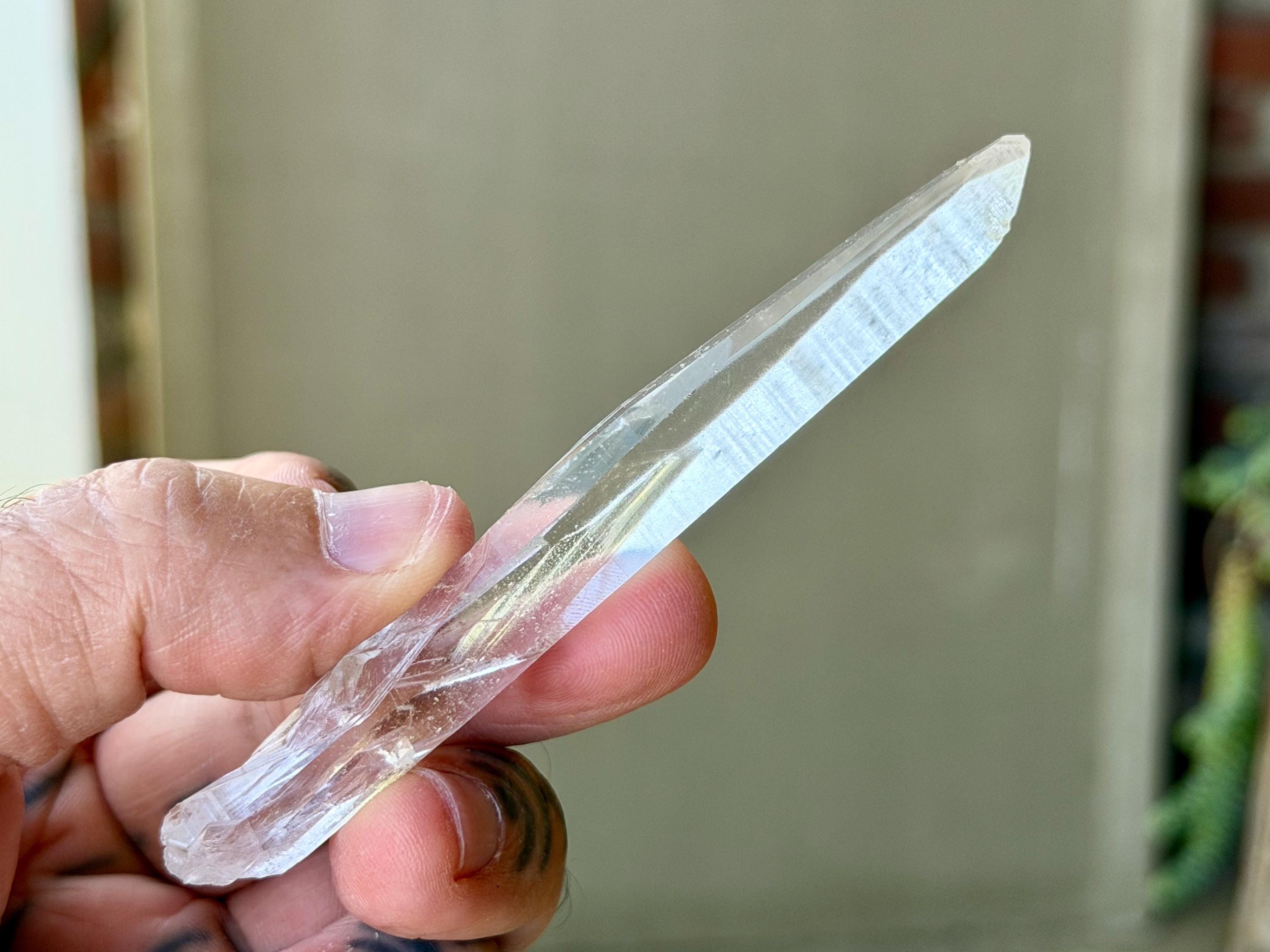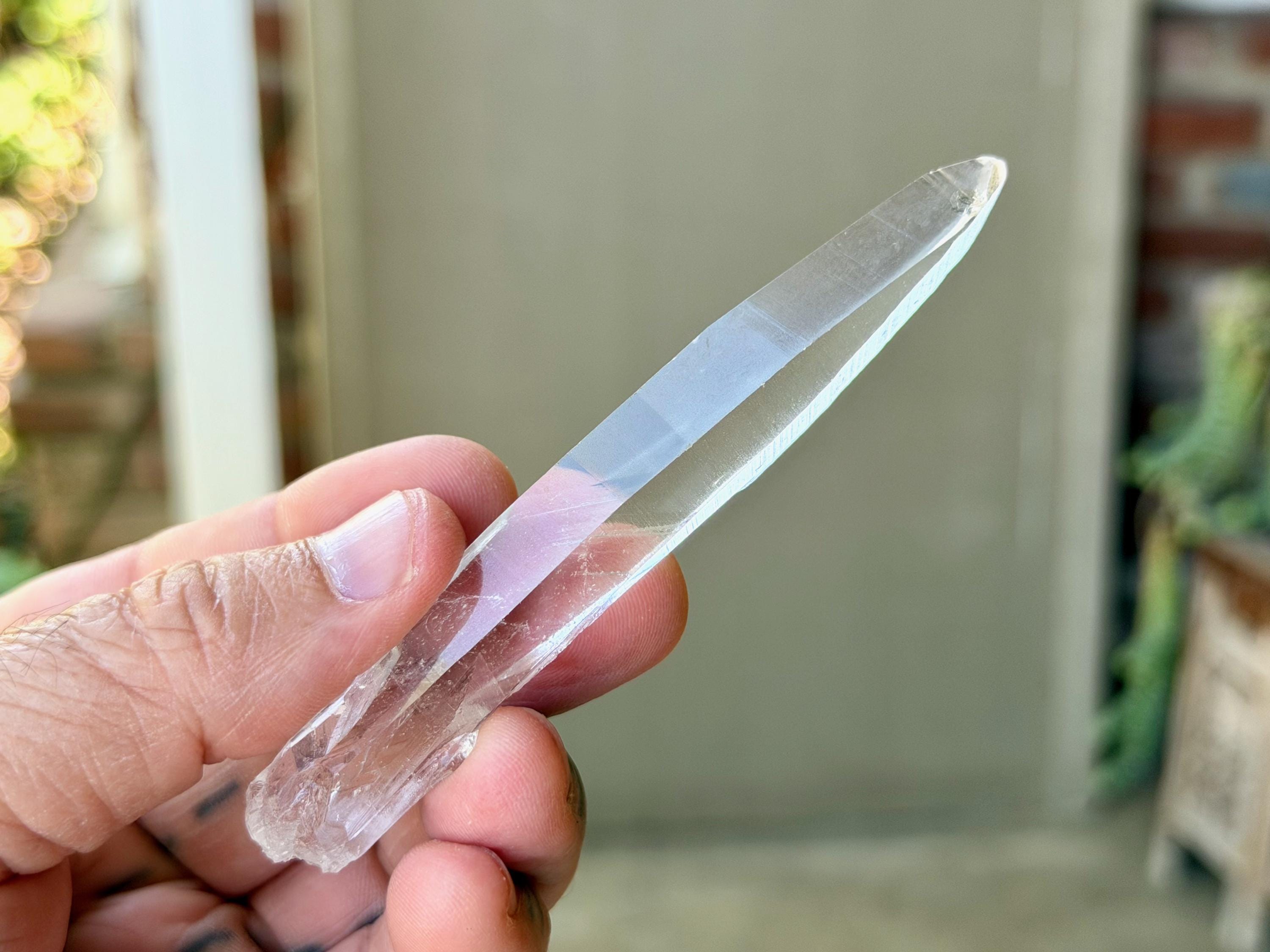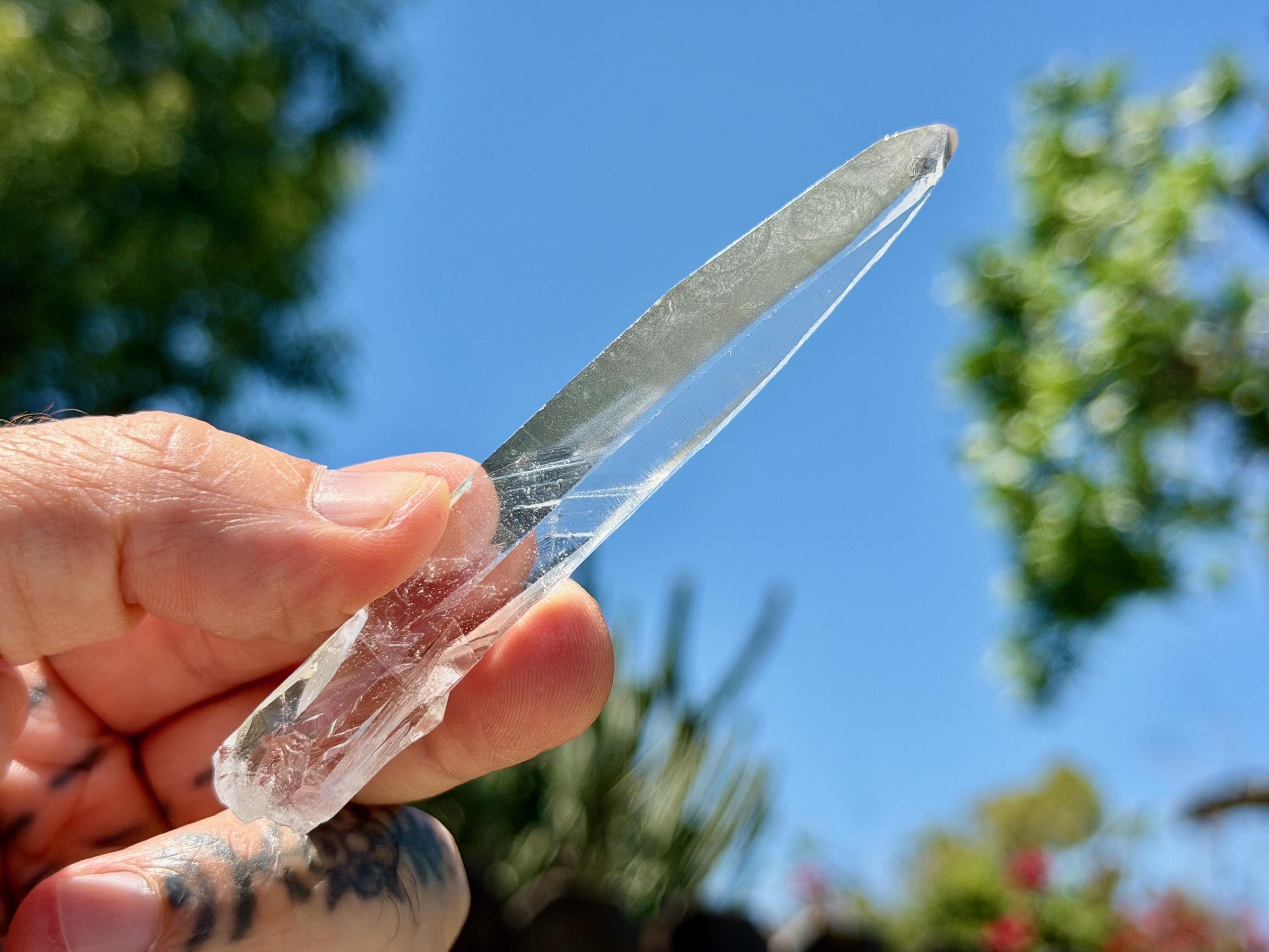 Exquisite, glassy luster and water-clear clarity to this brilliant Lemurian Quartz crystal in an elongated "laser wand" formation. This crystal simply disappears against the blue sky when you hold it up, it's like glass!